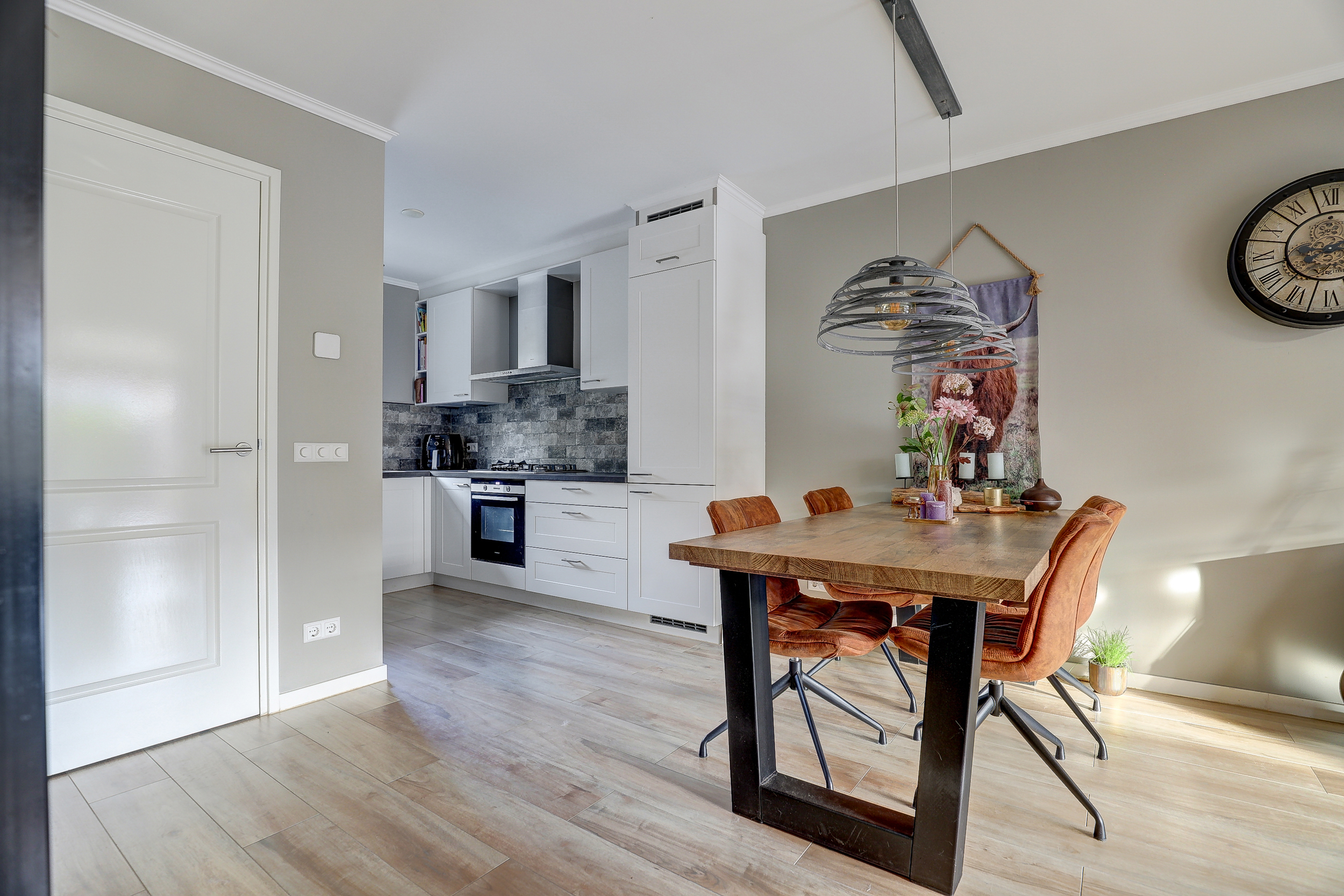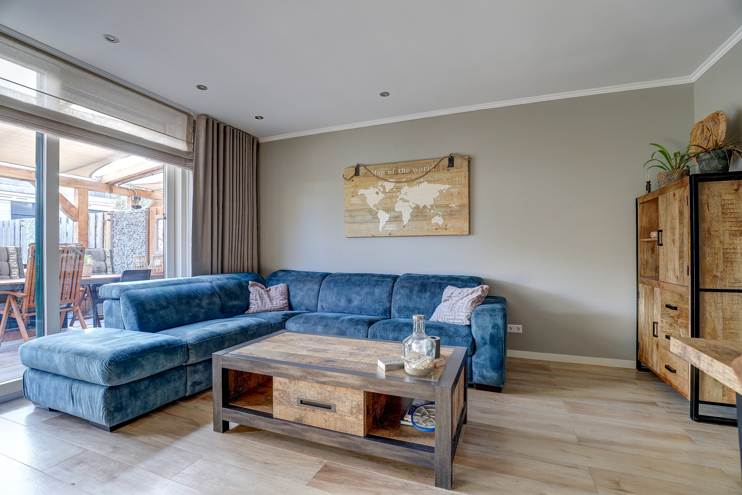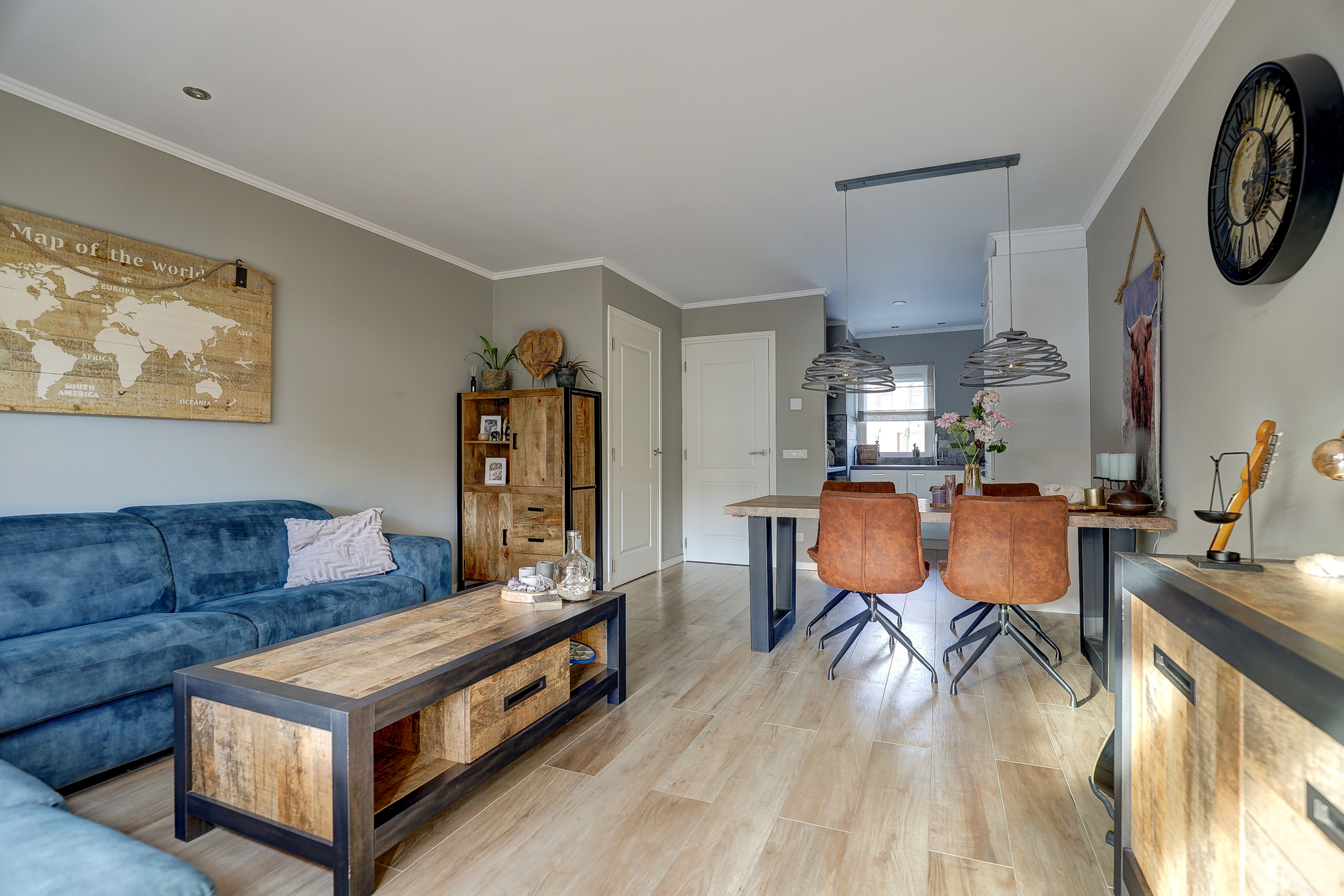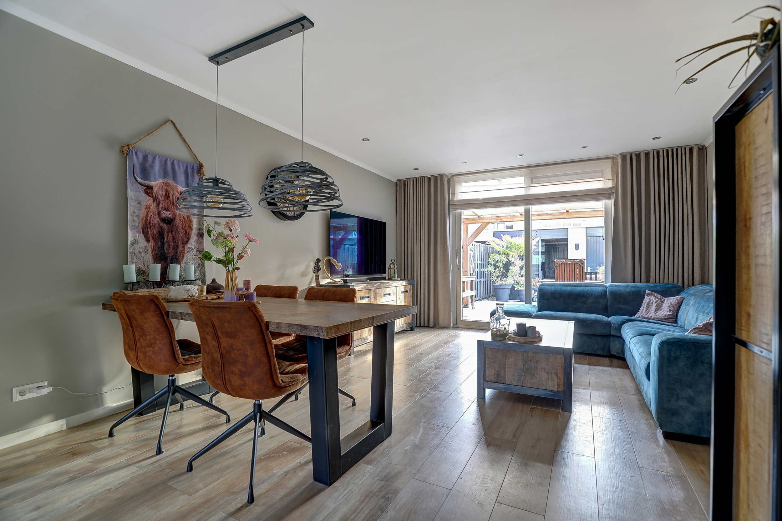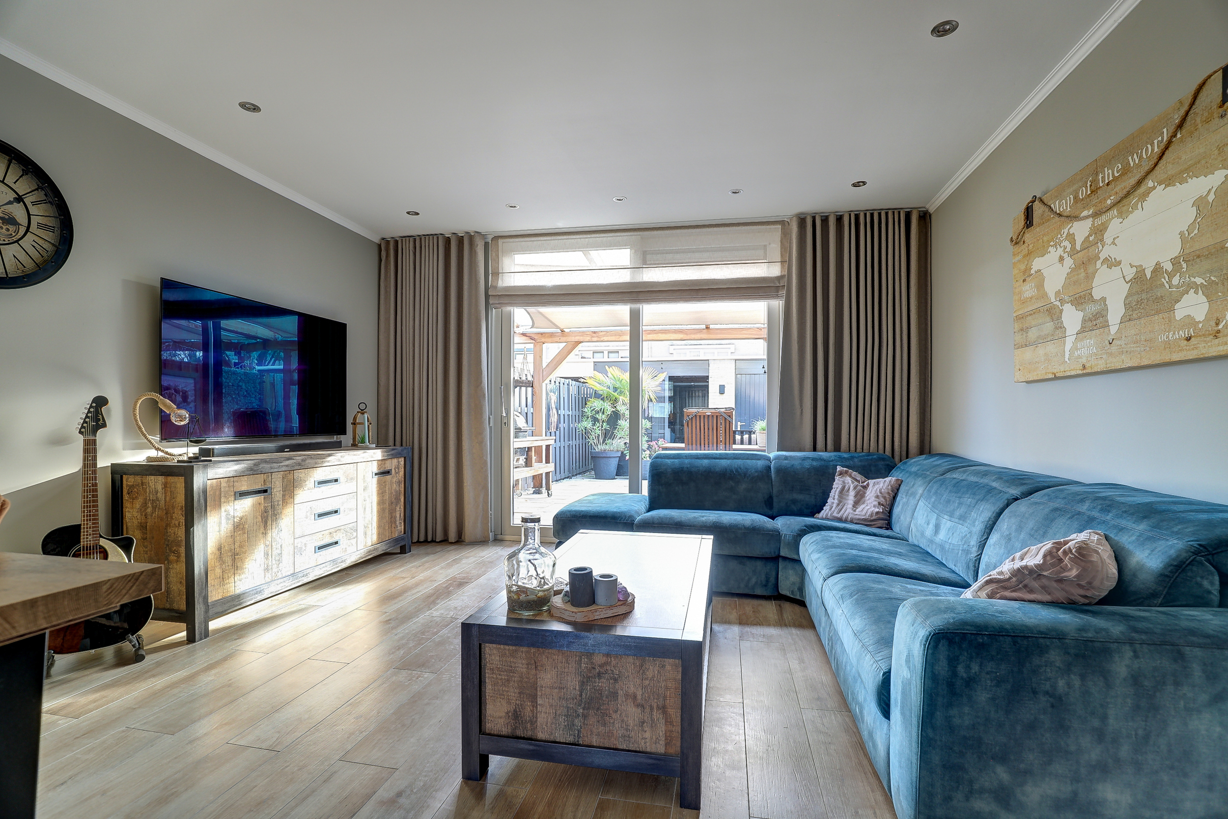 Stap de woonkamer binnen en laat je verrassen door de hoeveelheid licht die via de brede glazen pui naar binnen stroomt. Deze pui verbindt de woonkamer naadloos met de overkapping in de fraai aangelegde achtertuin. Dankzij de vloerverwarming voelt de ruimte het hele jaar door comfortabel aan. Of je nu binnen of buiten zit, de ruimte voelt altijd als één geheel — perfect om te ontspannen en te genieten van het uitzicht.