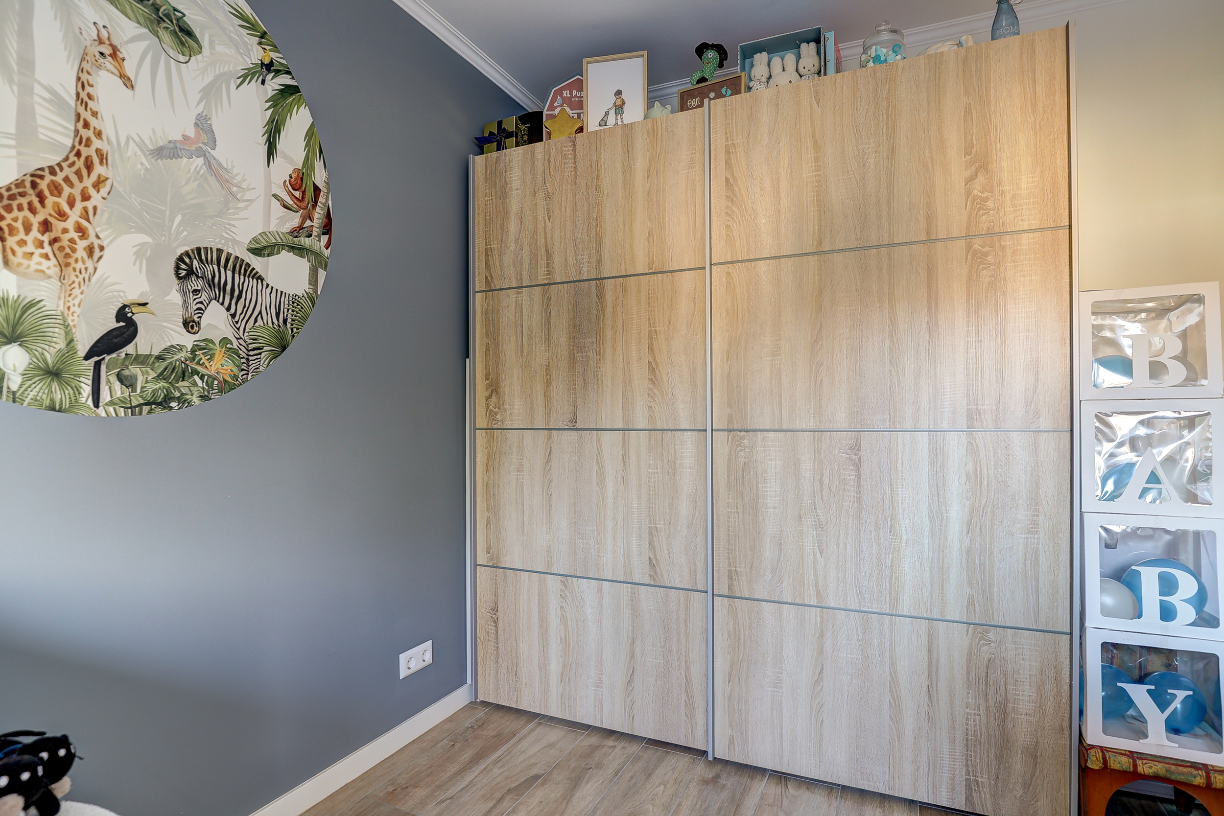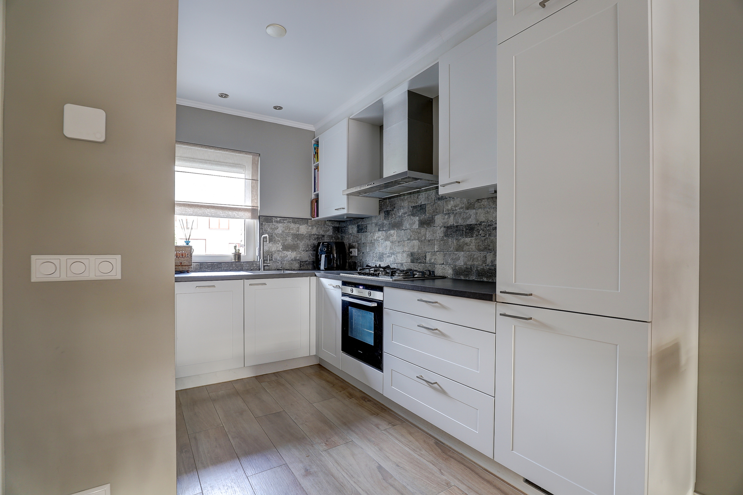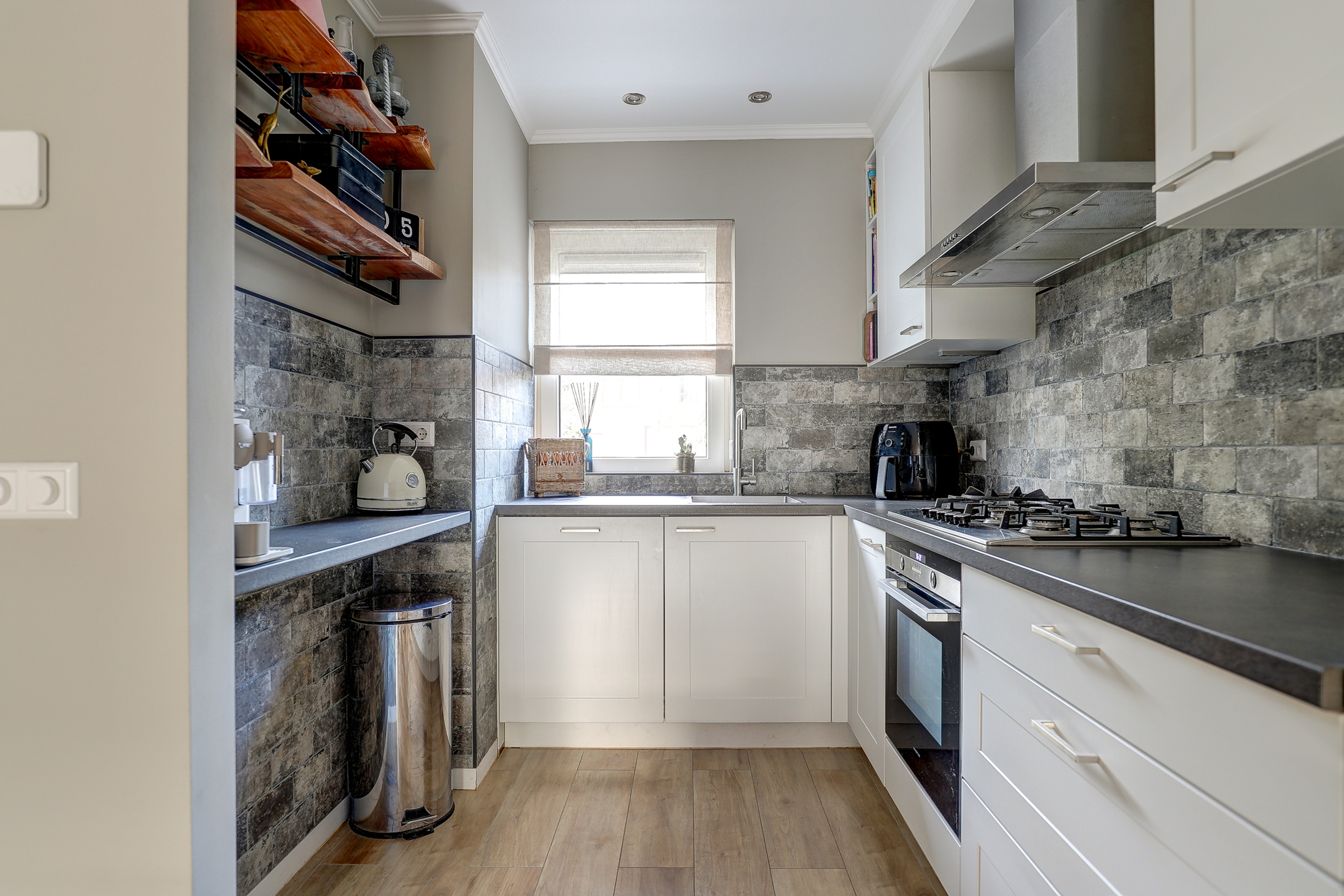 De halfopen keuken is uitgevoerd met matwitte kaderfronten en een donker werkblad. De antracietgrijze, gemêleerde wandtegels geven de ruimte een eigentijdse, robuuste look. Hier kook je als een professional op de gaskookplaat, terwijl de vaatwasser en oven het je lekker gemakkelijk maken. En de praktische werk- en koffienis? Ideaal voor je ochtendritueel!