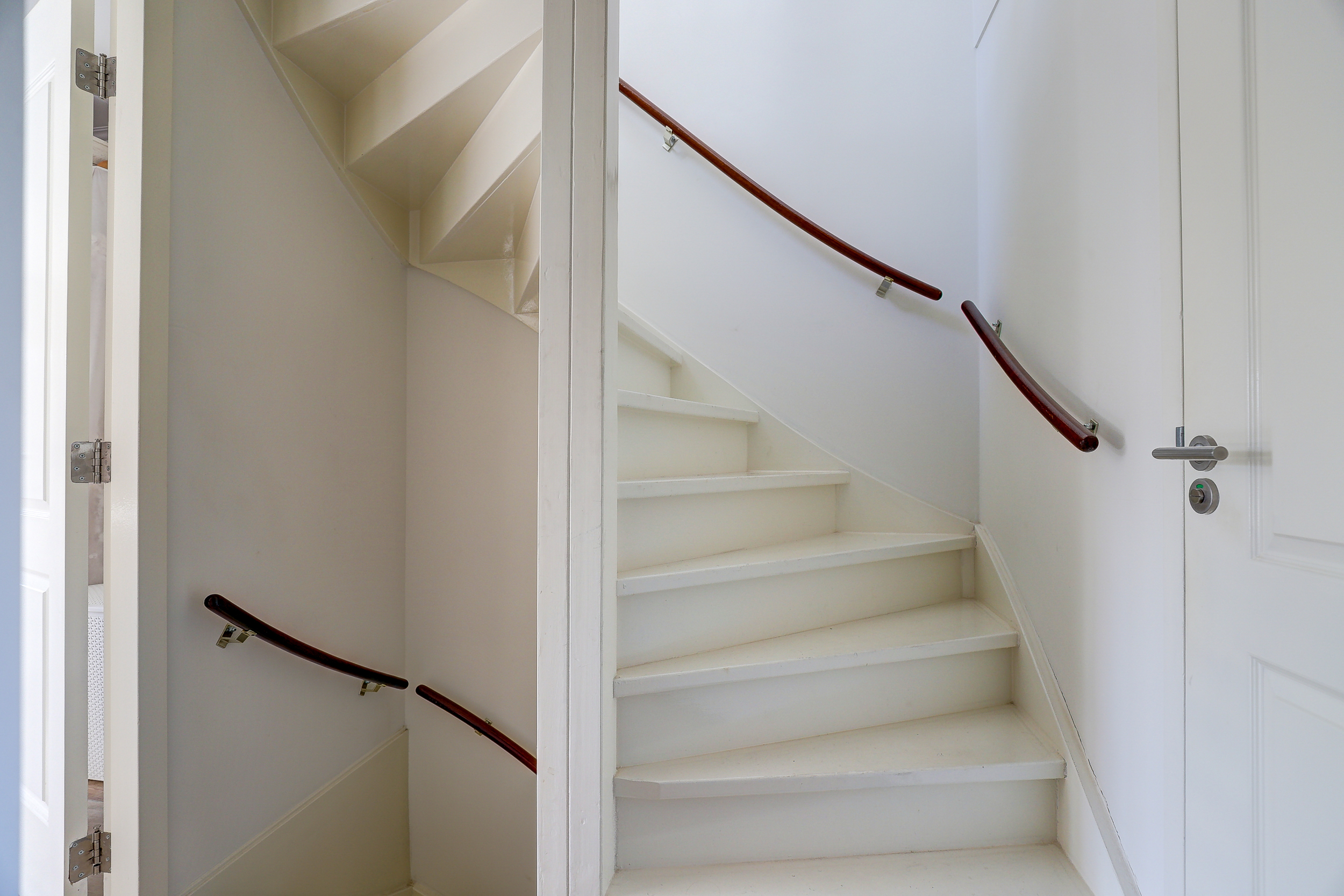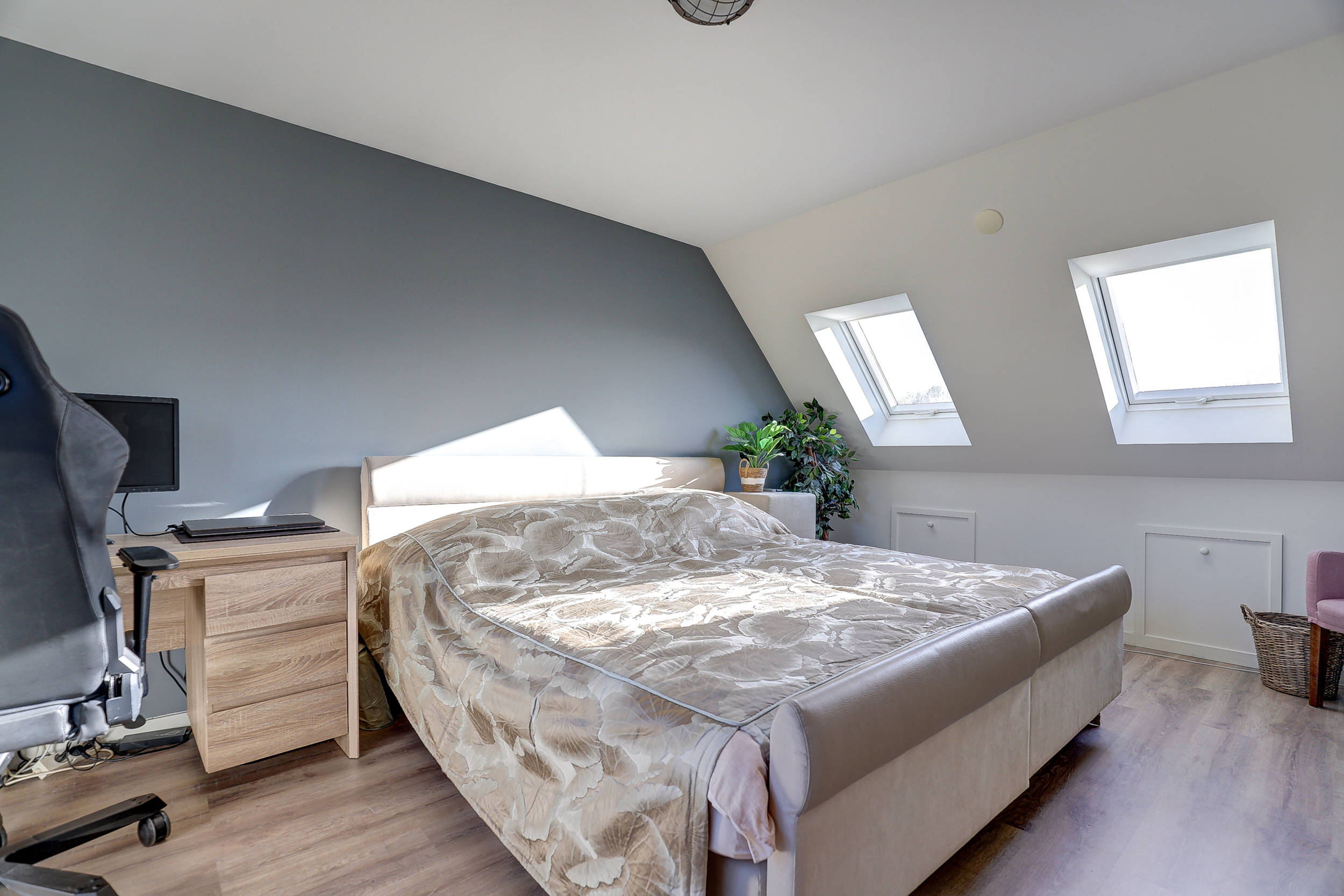 Via de vaste trap bereik je de zolderverdieping: een royale open ruimte met twee dakramen die zorgen voor veel licht en ventilatie. Deze ruimte biedt volop mogelijkheden — van extra slaapkamer tot werk- of hobbyruimte. Achter de knieschotten is extra bergruimte aanwezig. De cv-installatie en aansluitingen voor wasmachine en droger bevinden zich hier ook. De keramische laminaattegels zorgen hier eveneens voor een stijlvolle en duurzame afwerking.
