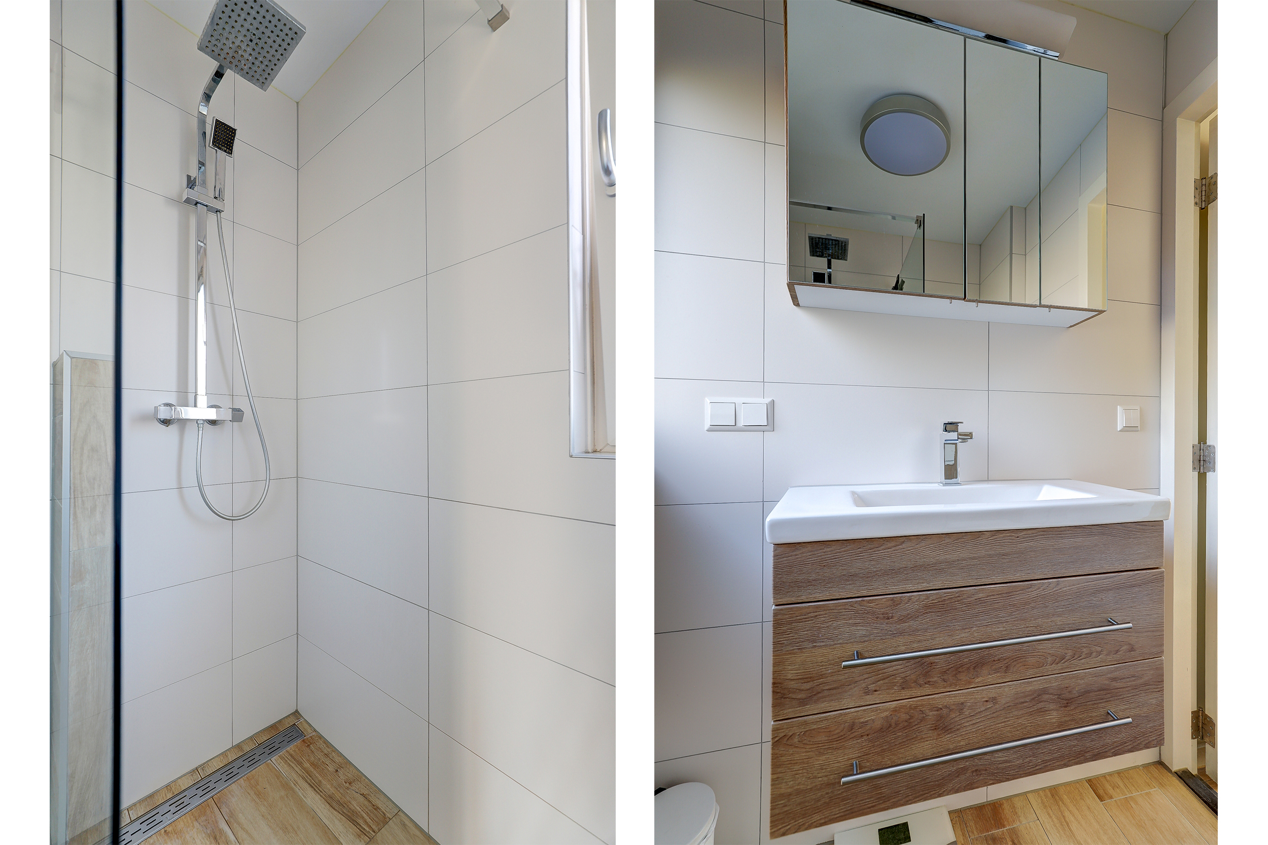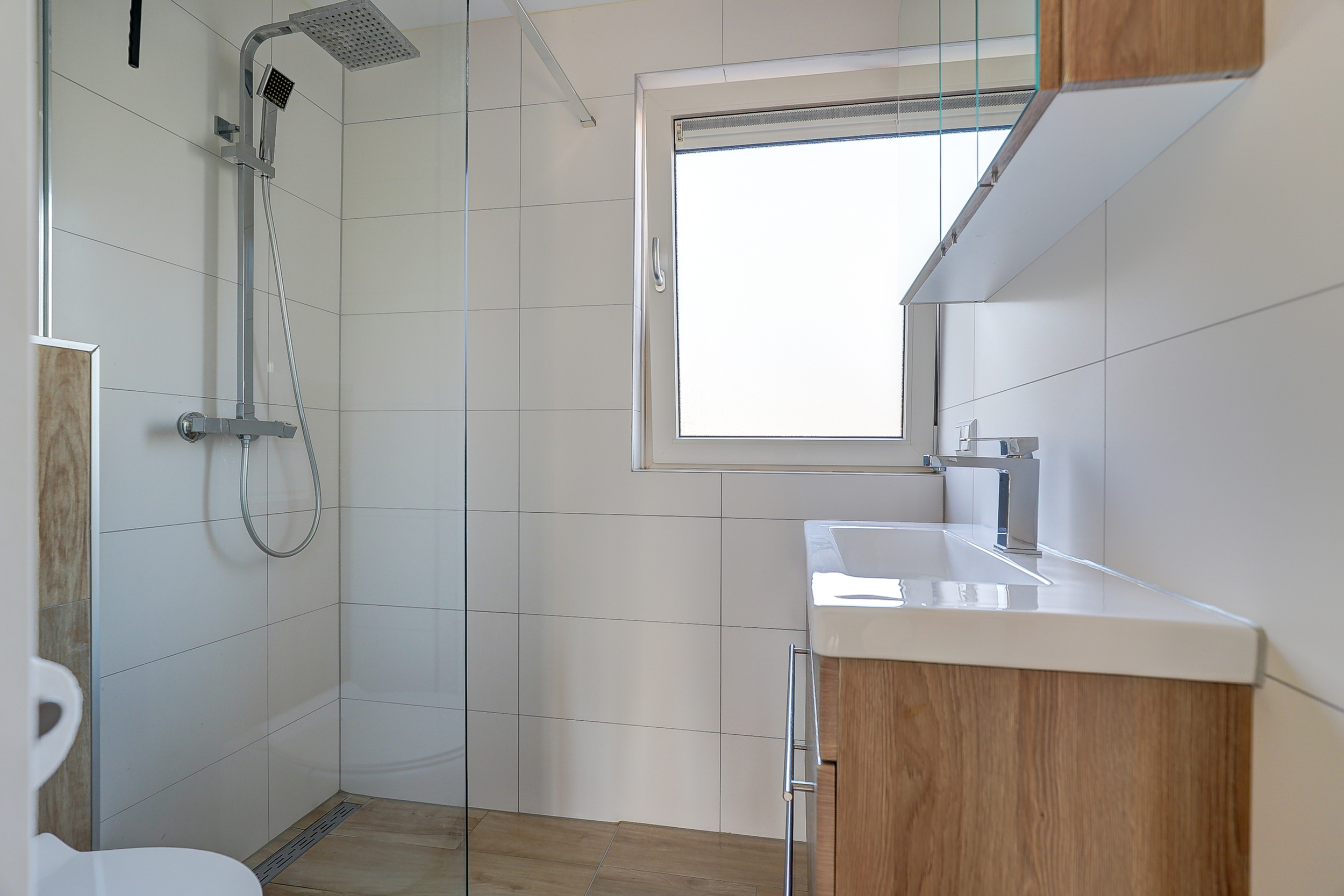 De badkamer is een oase van rust en luxe. Grote witte wandtegels en een doorlopende houtlook vloer zorgen voor een spa-achtige sfeer. De inloopdouche met regendouche en glazen scherm biedt een verfrissende start van je dag. Het houten wastafelmeubel met wit blad en spiegelkast maakt het geheel compleet. Dankzij het raam voor natuurlijke ventilatie blijft de ruimte heerlijk fris.