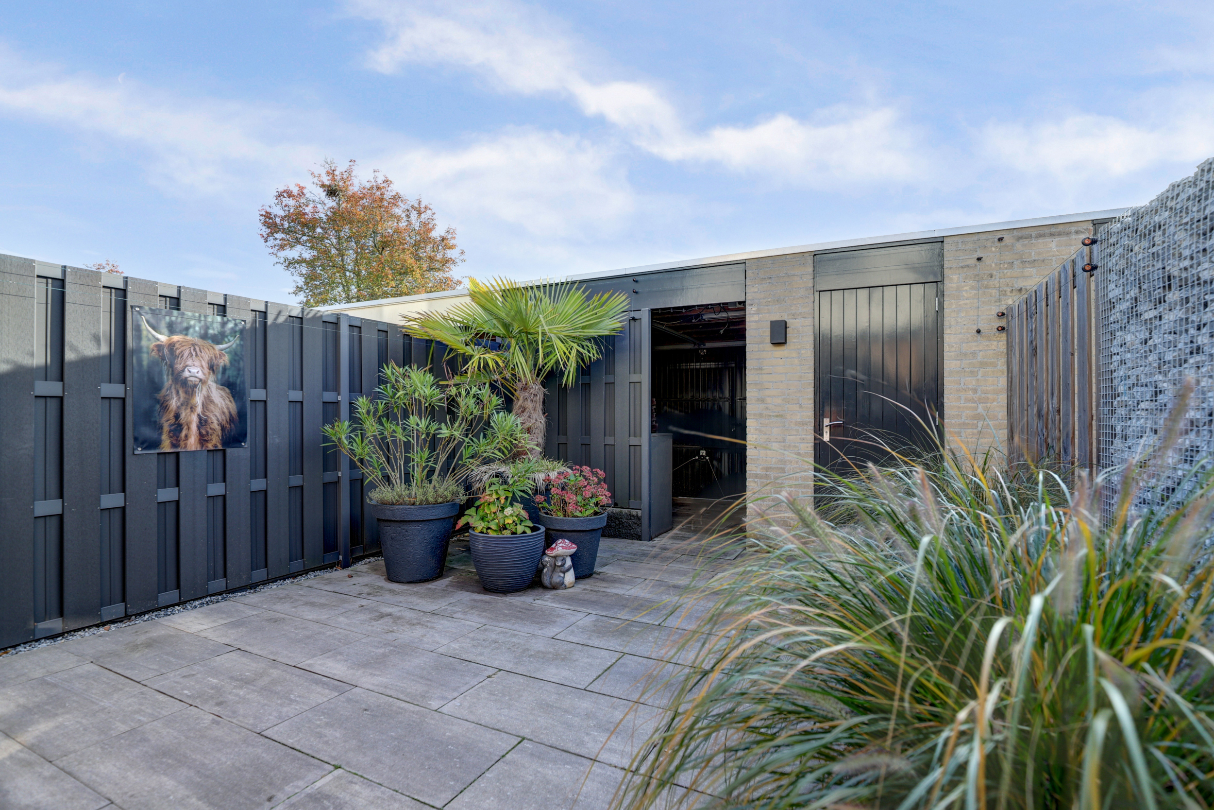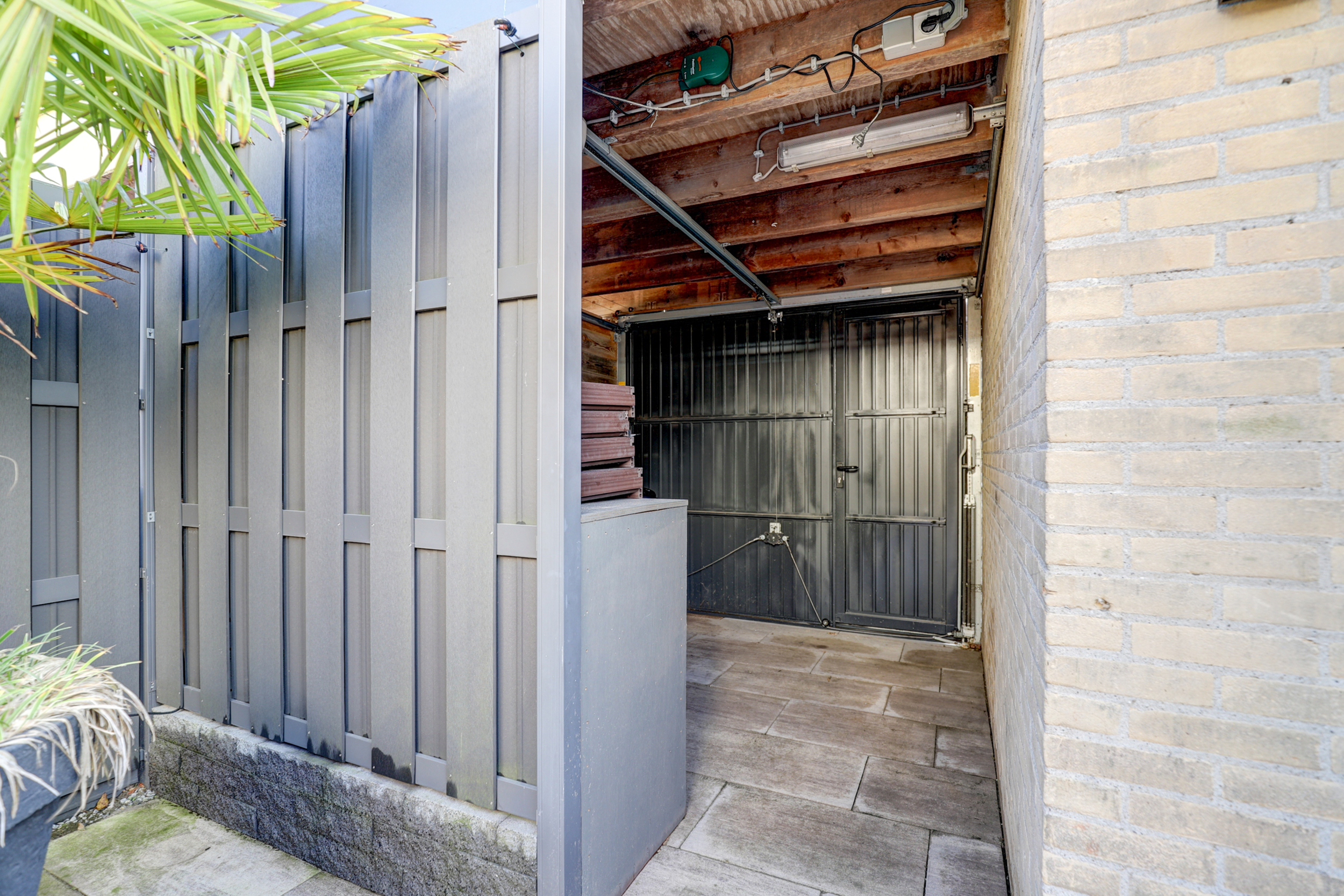 Afgesloten carport en vrijstaande stenen berging met achterom