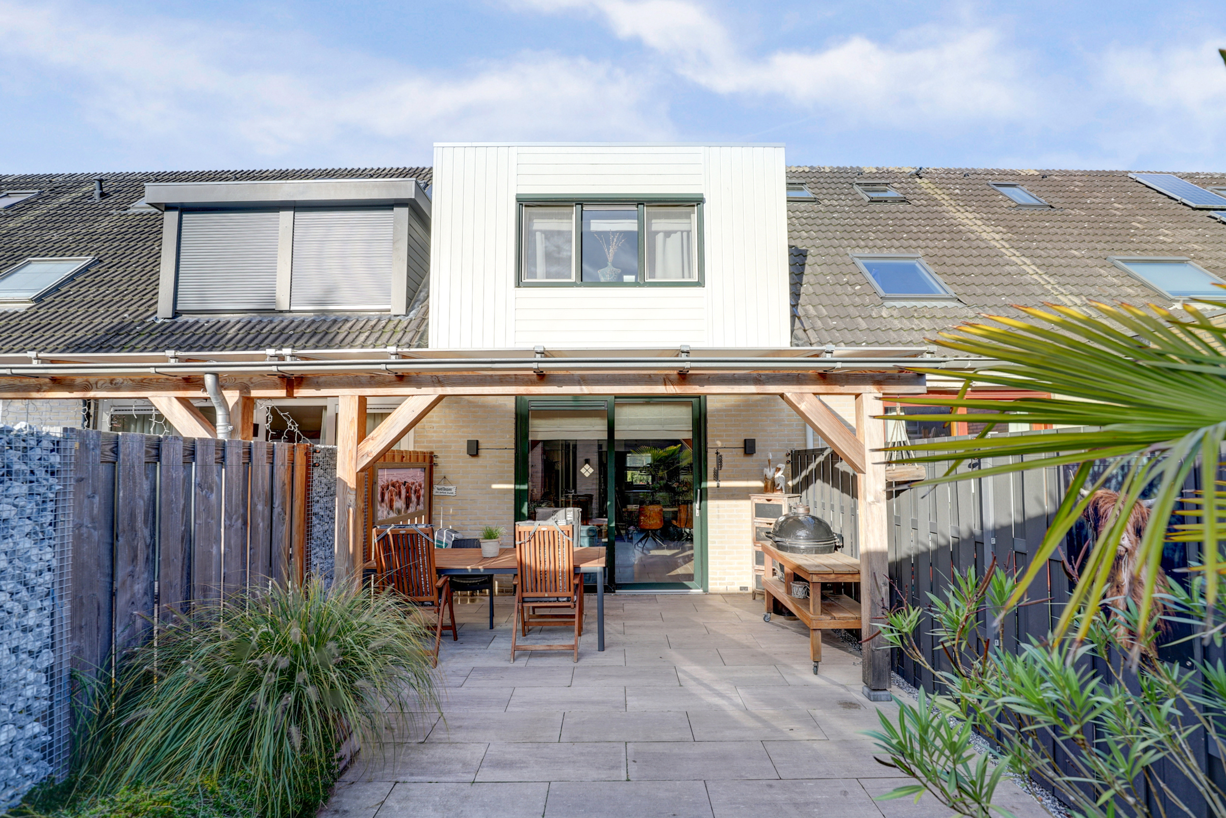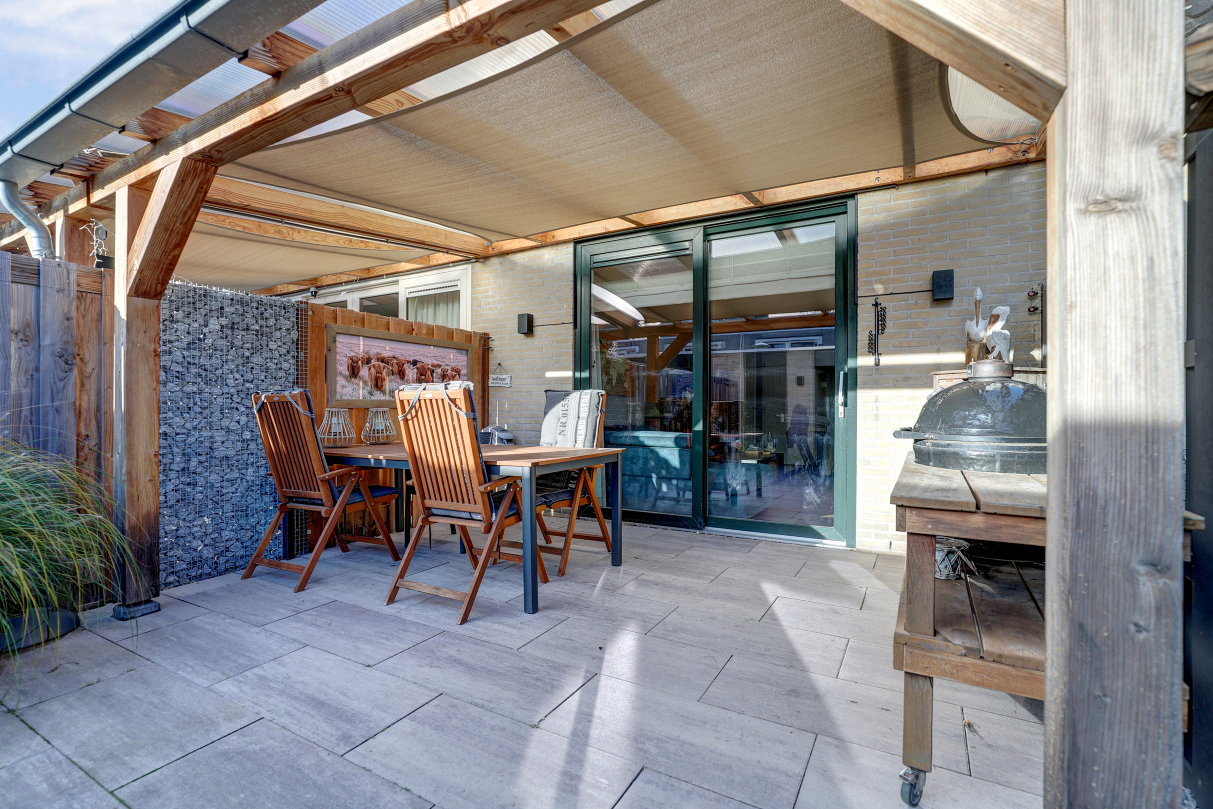 Zonnige achtertuin op het zuiden met overkapping direct aan de woning