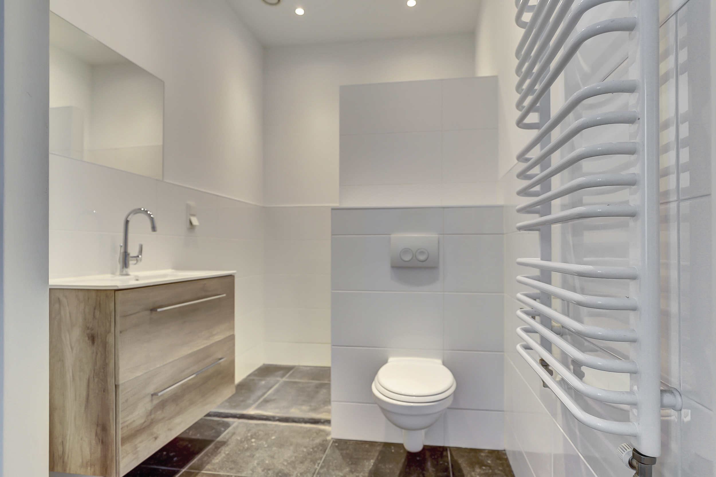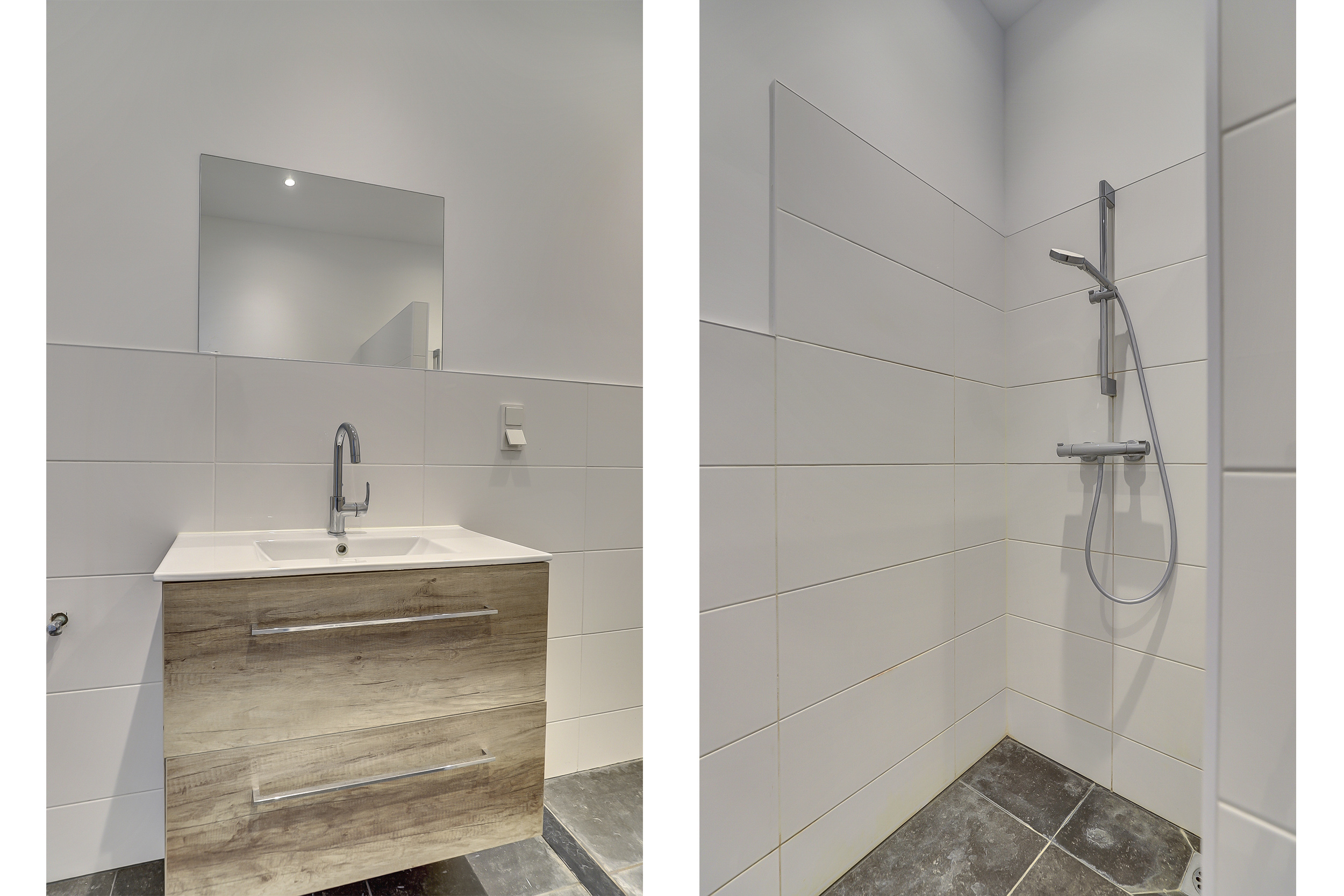 De badkamer is modern en fris, met een douche, hangtoilet en wastafelmeubel met opbergruimte. Strakke tegels en inbouwspots zorgen voor een eigentijdse uitstraling.