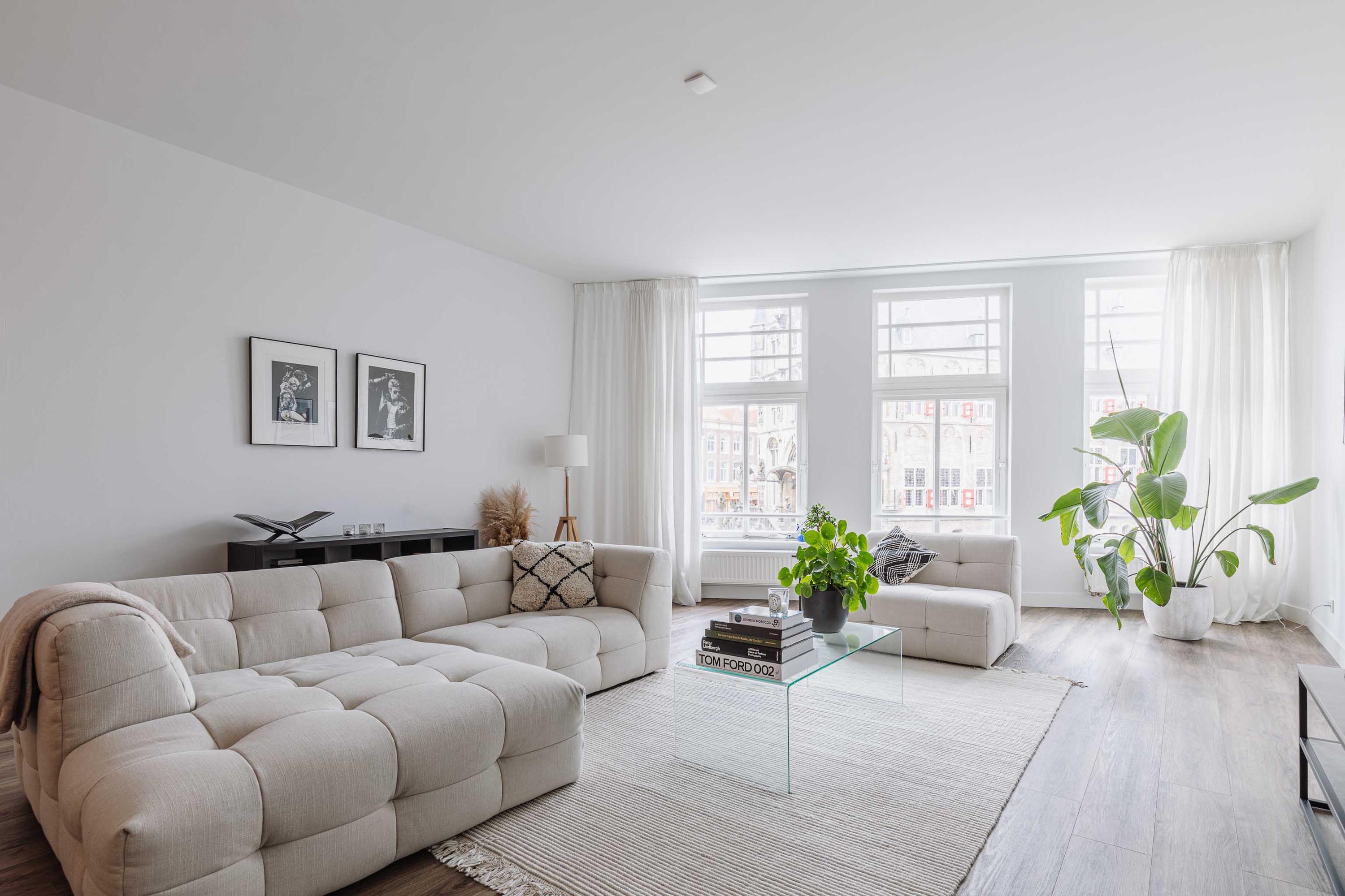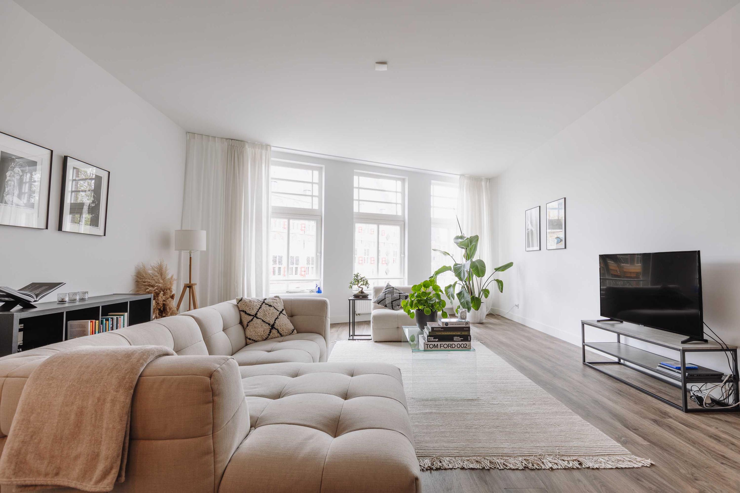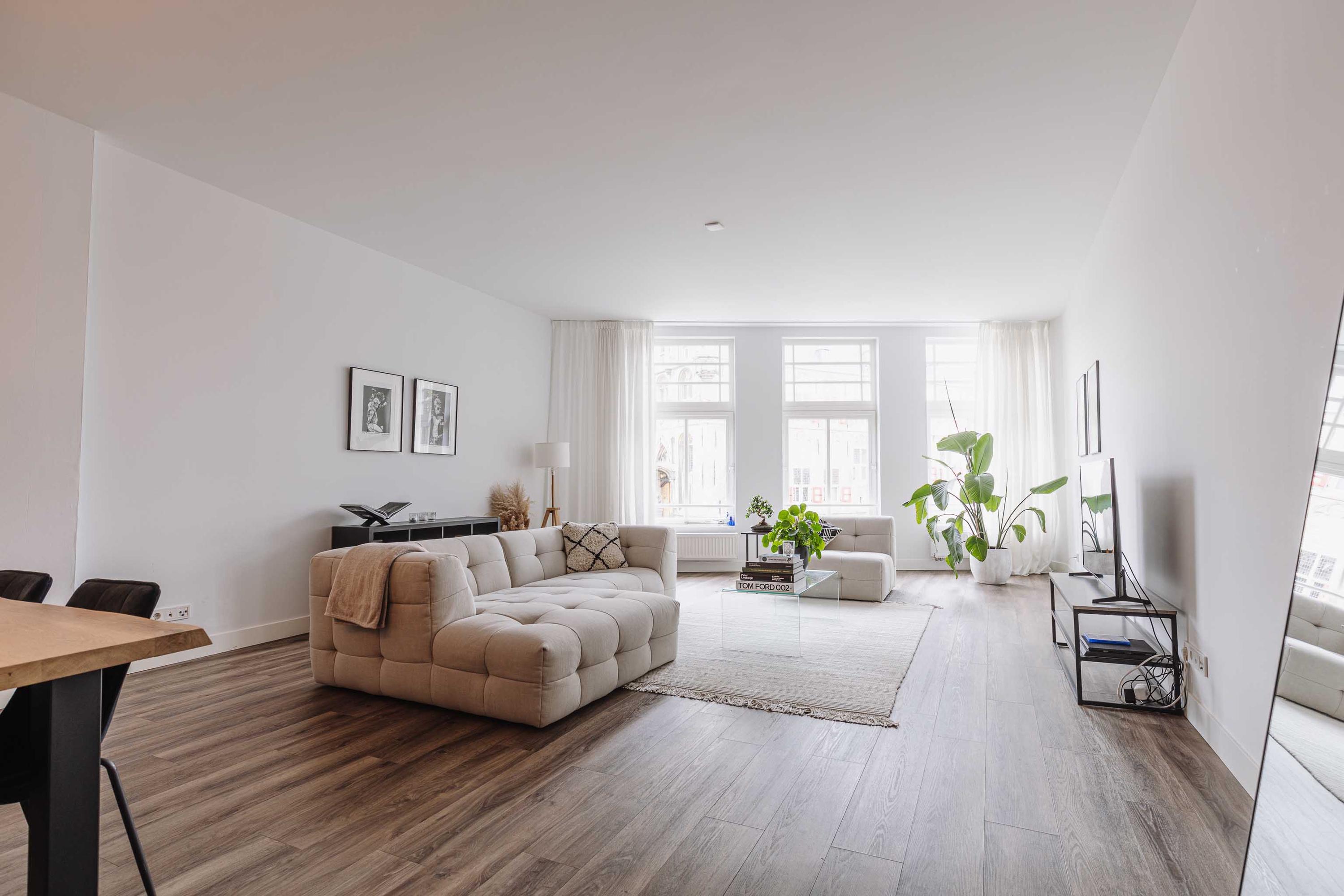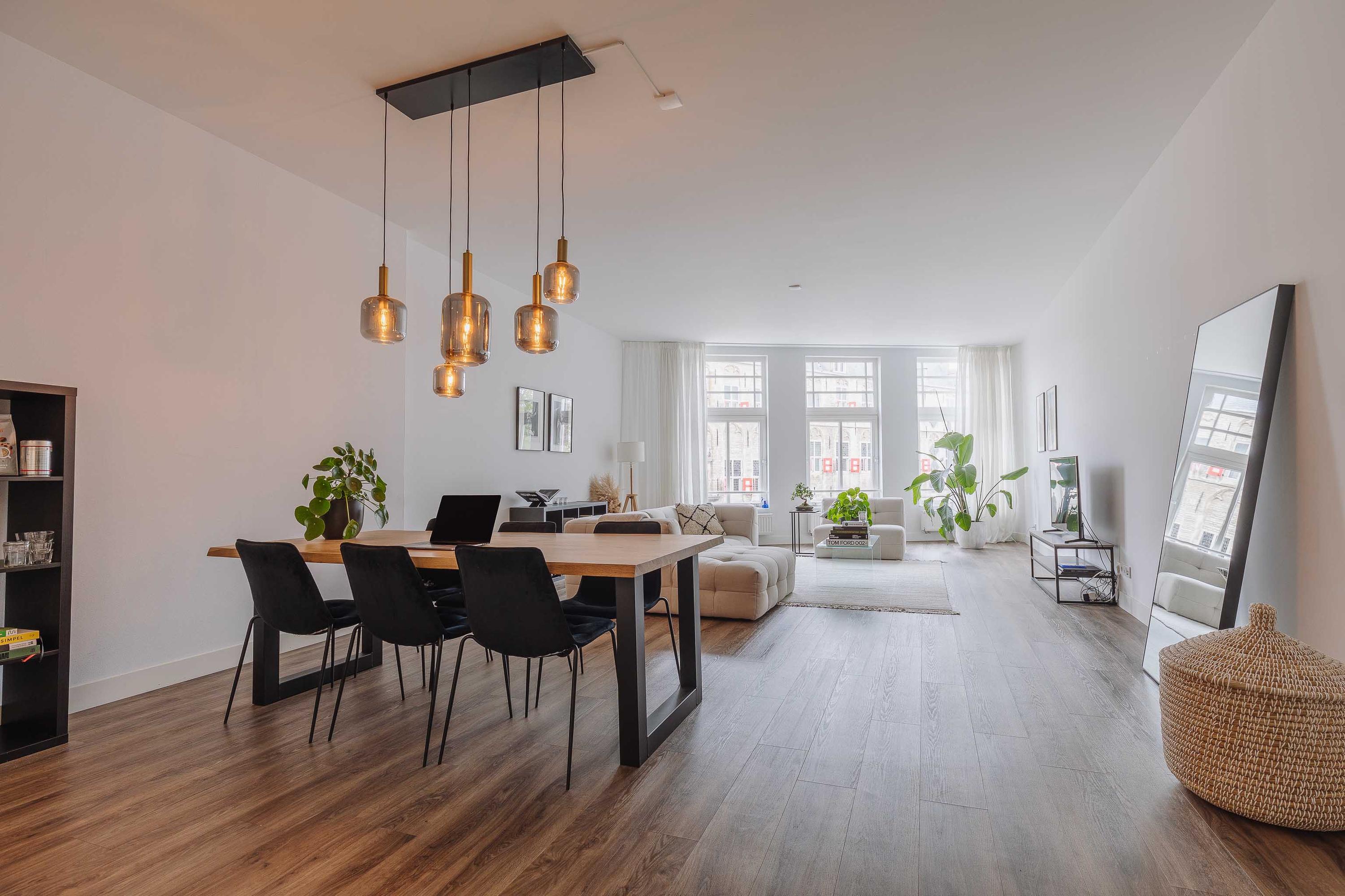 Via de hal stap je binnen in de lichte woonkamer van 39 m², met grote ramen en een prachtig uitzicht over de levendige Markt.