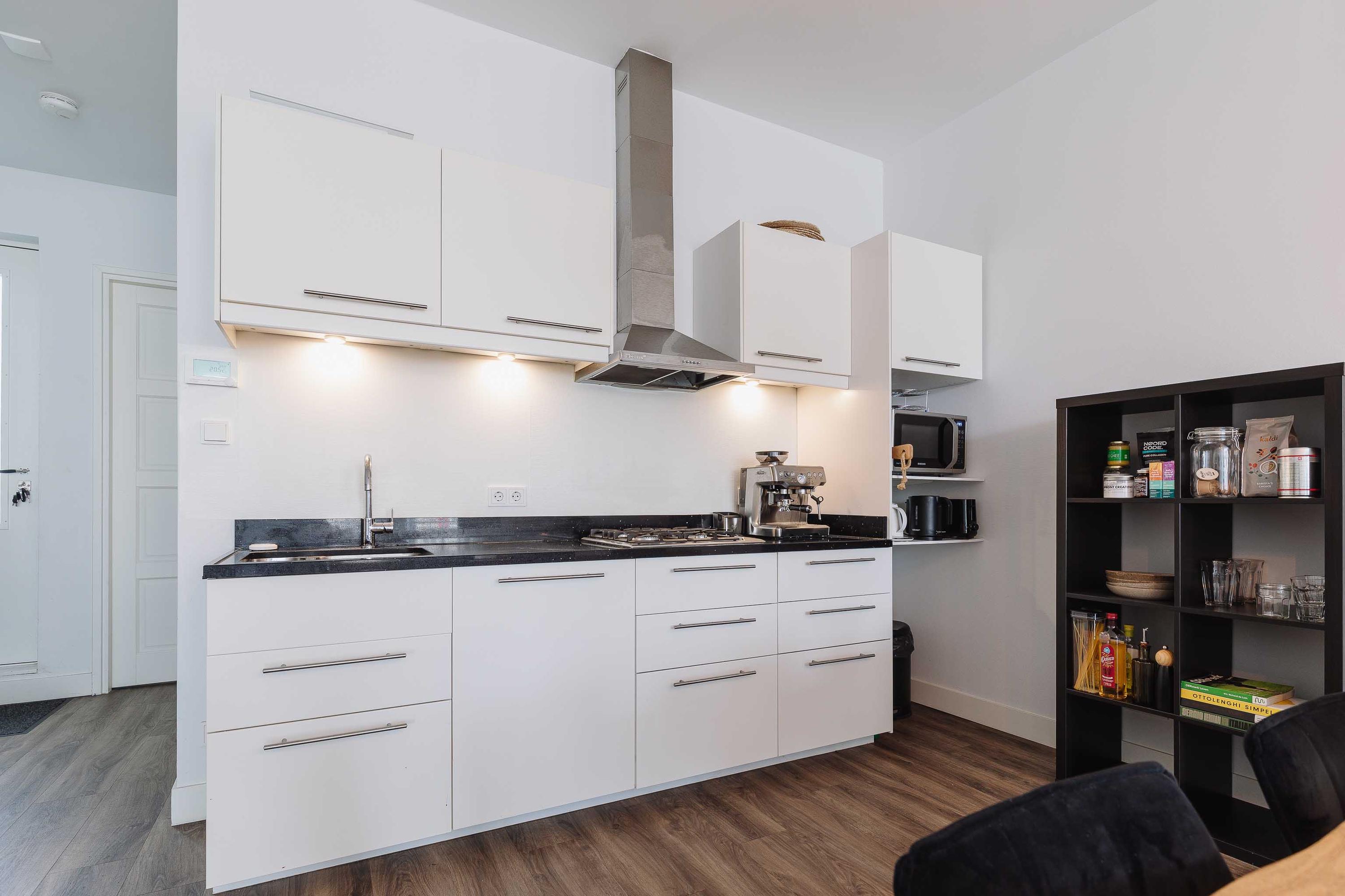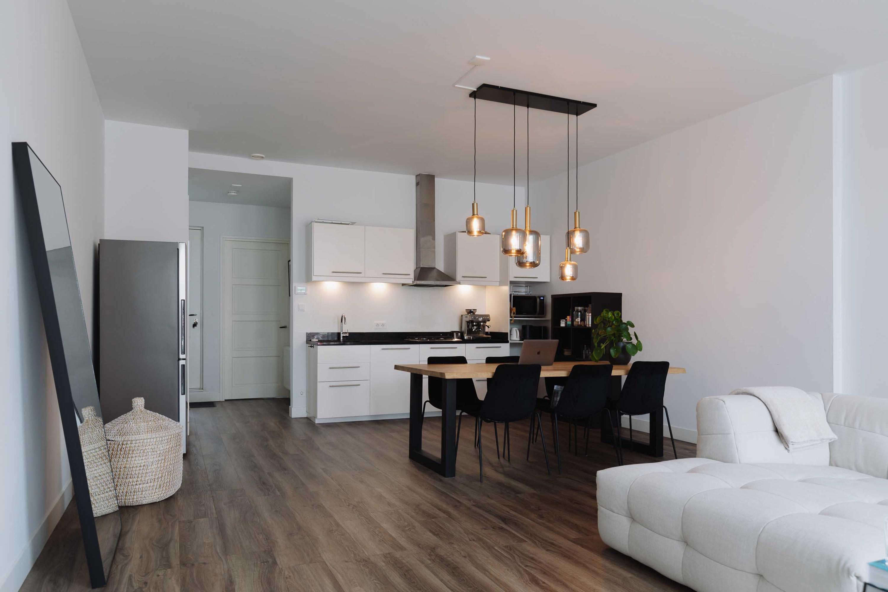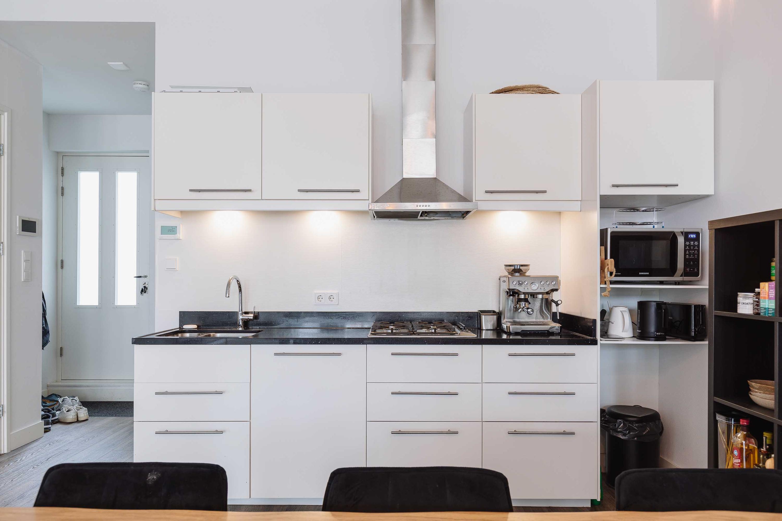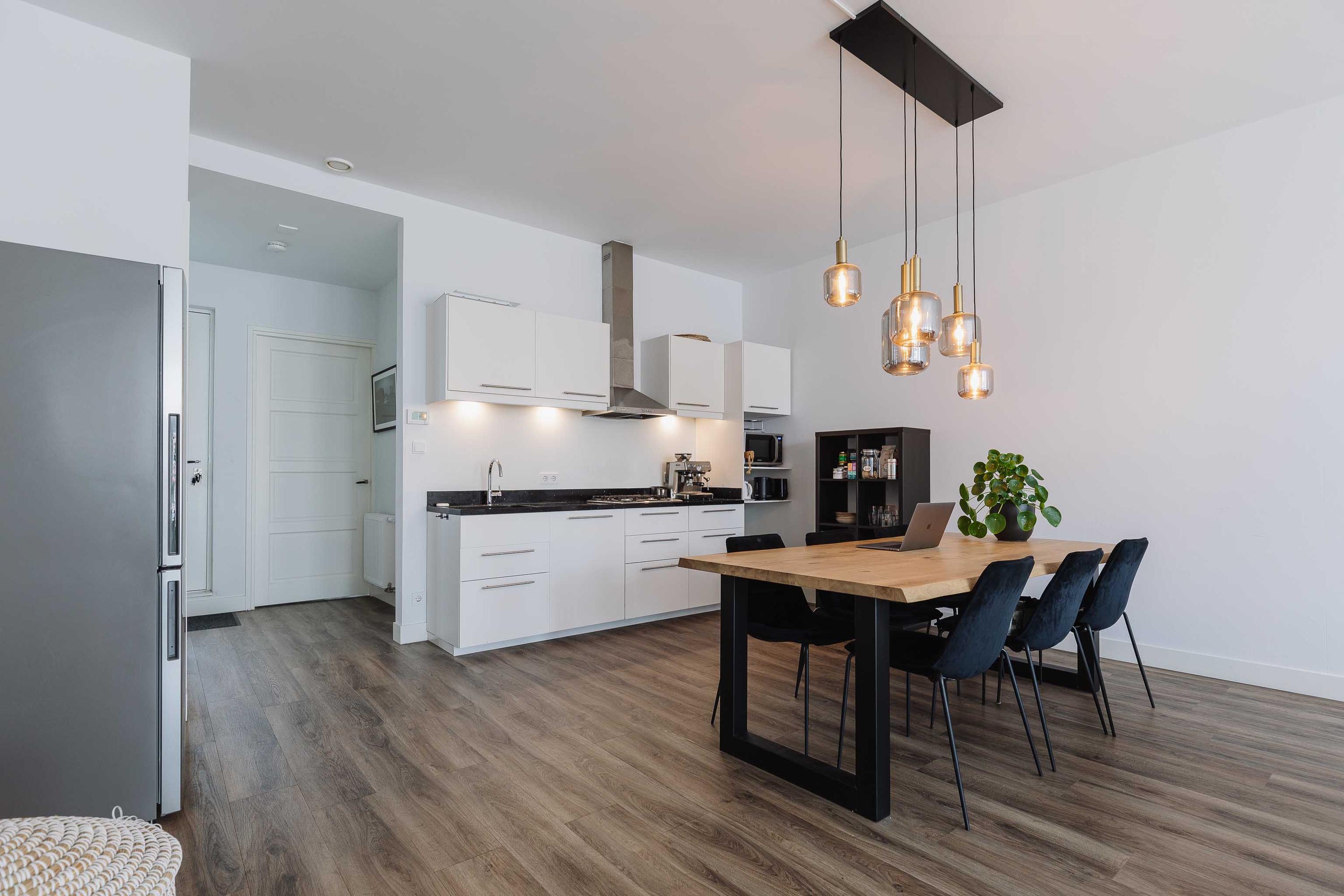 De open keuken is modern uitgevoerd, voorzien van inbouwapparatuur en biedt volop ruimte om te koken en te dineren.
