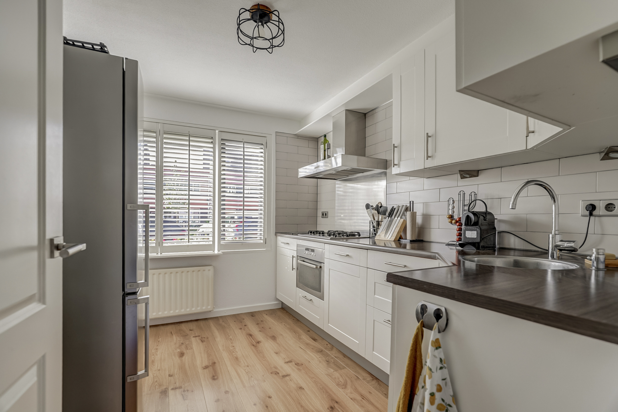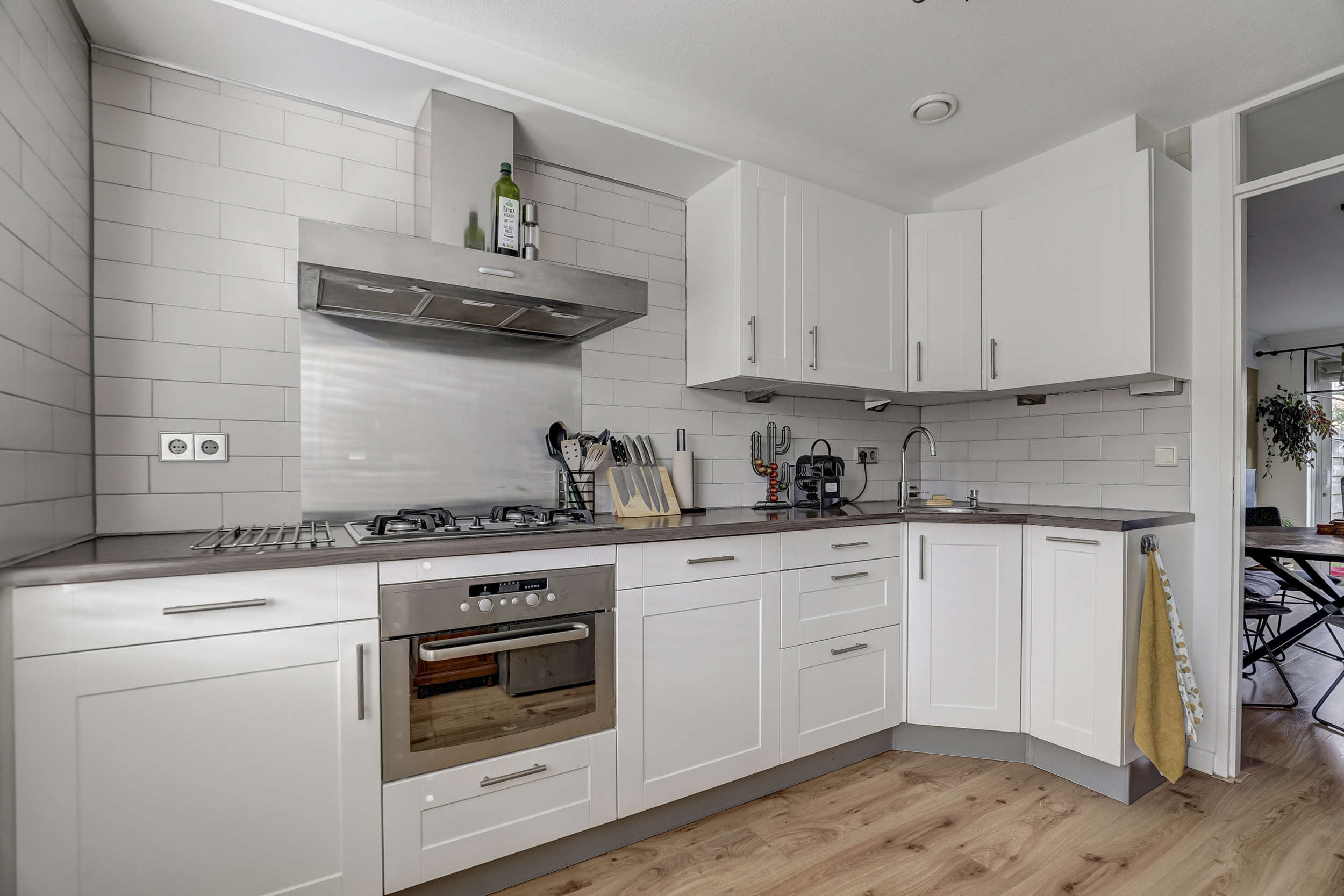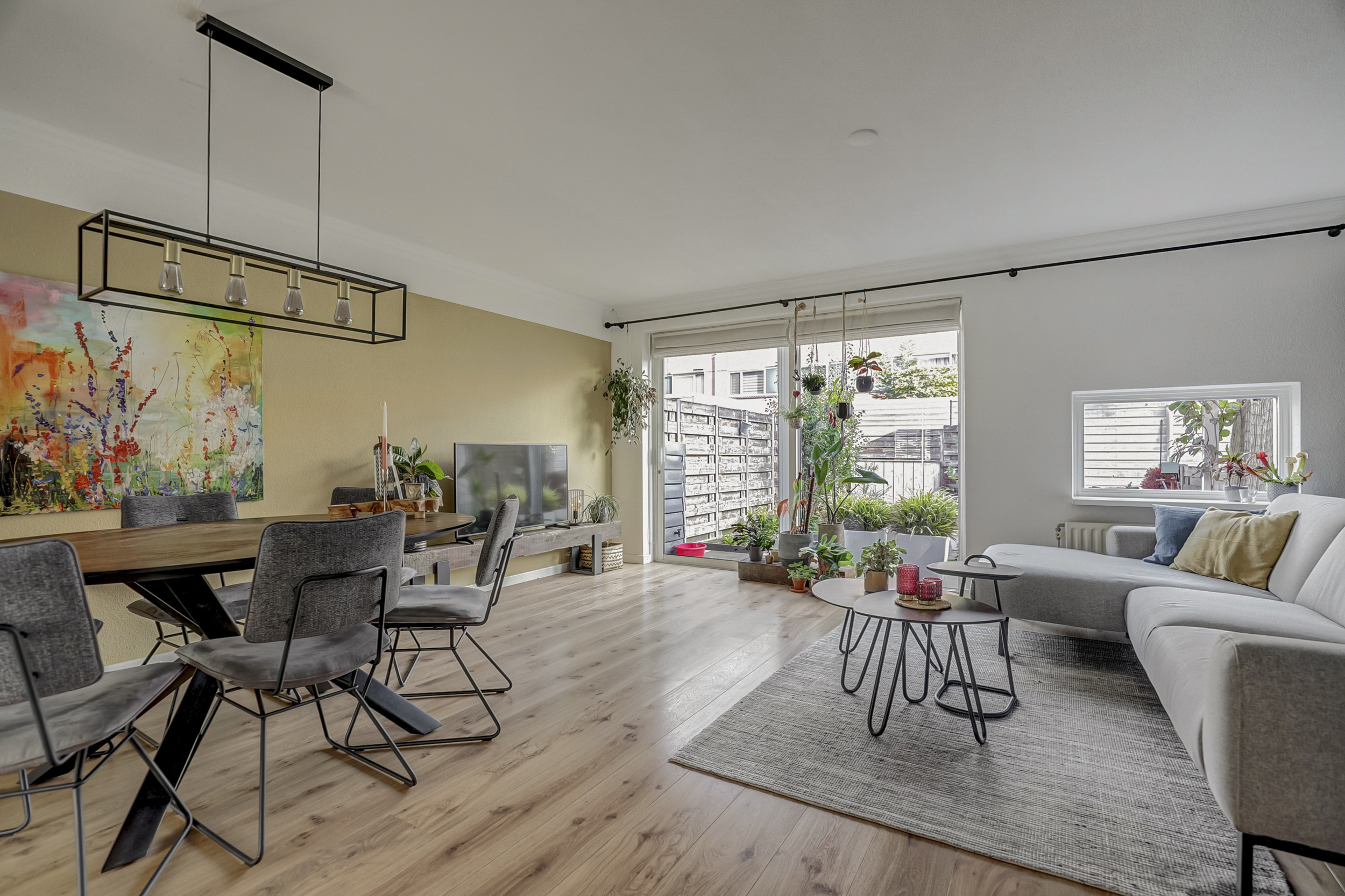 Entree, hal met meterkast en trapopgang naar de eerste verdieping, met toegang tot de woonkamer. De lichte, ruime woonkamer is strak afgewerkt met een lichte laminaatvloer. De grote schuifpui naar de achtertuin zorgt voor veel licht en een prettige verbinding met buiten. Aan de tuinzijde is ruimte voor een gezellige zithoek, terwijl de eethoek centraal in het midden is gesitueerd. De praktische trapkast biedt extra bergruimte voor proviand en andere benodigdheden. Aan de voorzijde is de keuken uitgevoerd in lichte tinten, voorzien van diverse inbouwapparatuur en afgewerkt met charmante paneeldeuren.