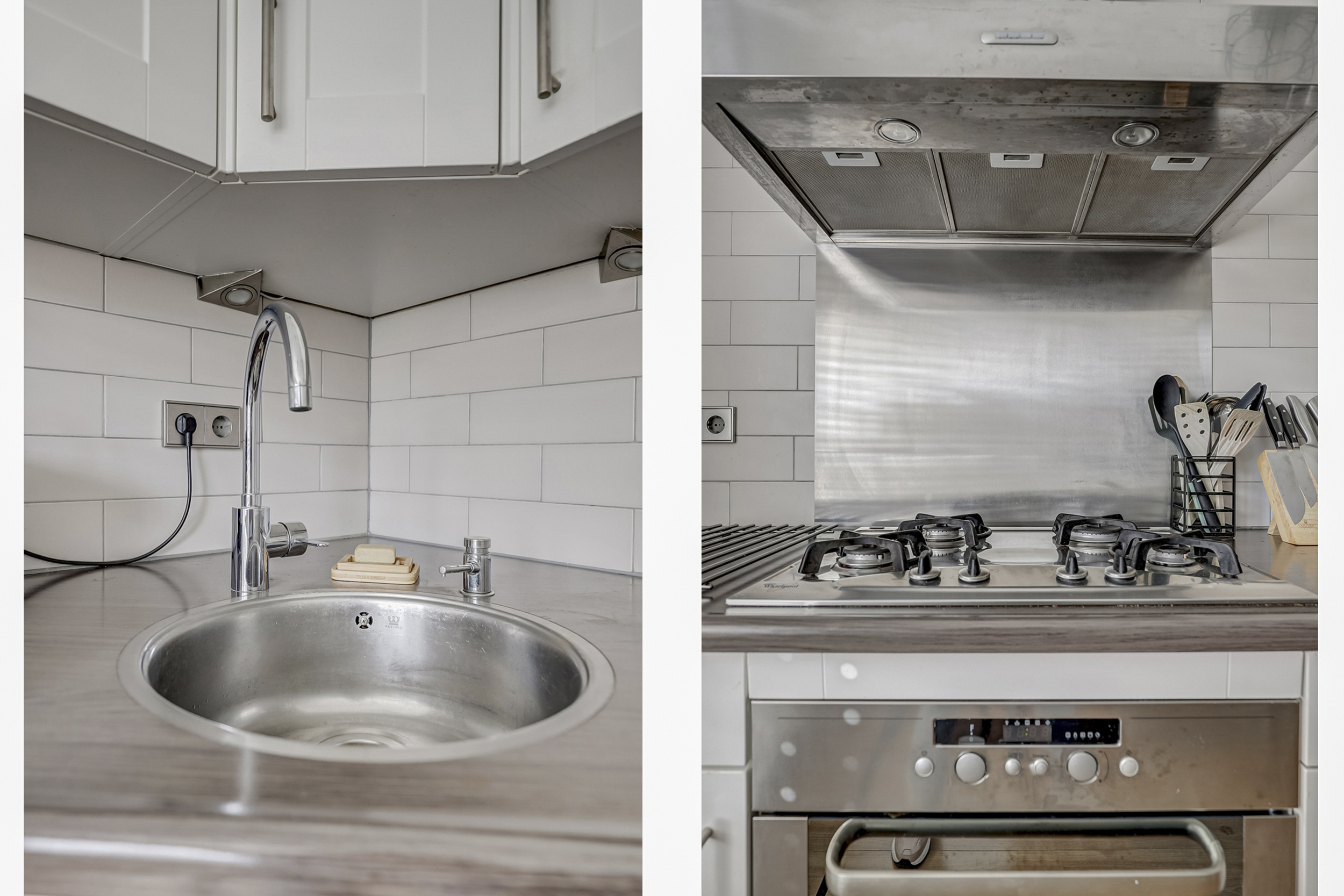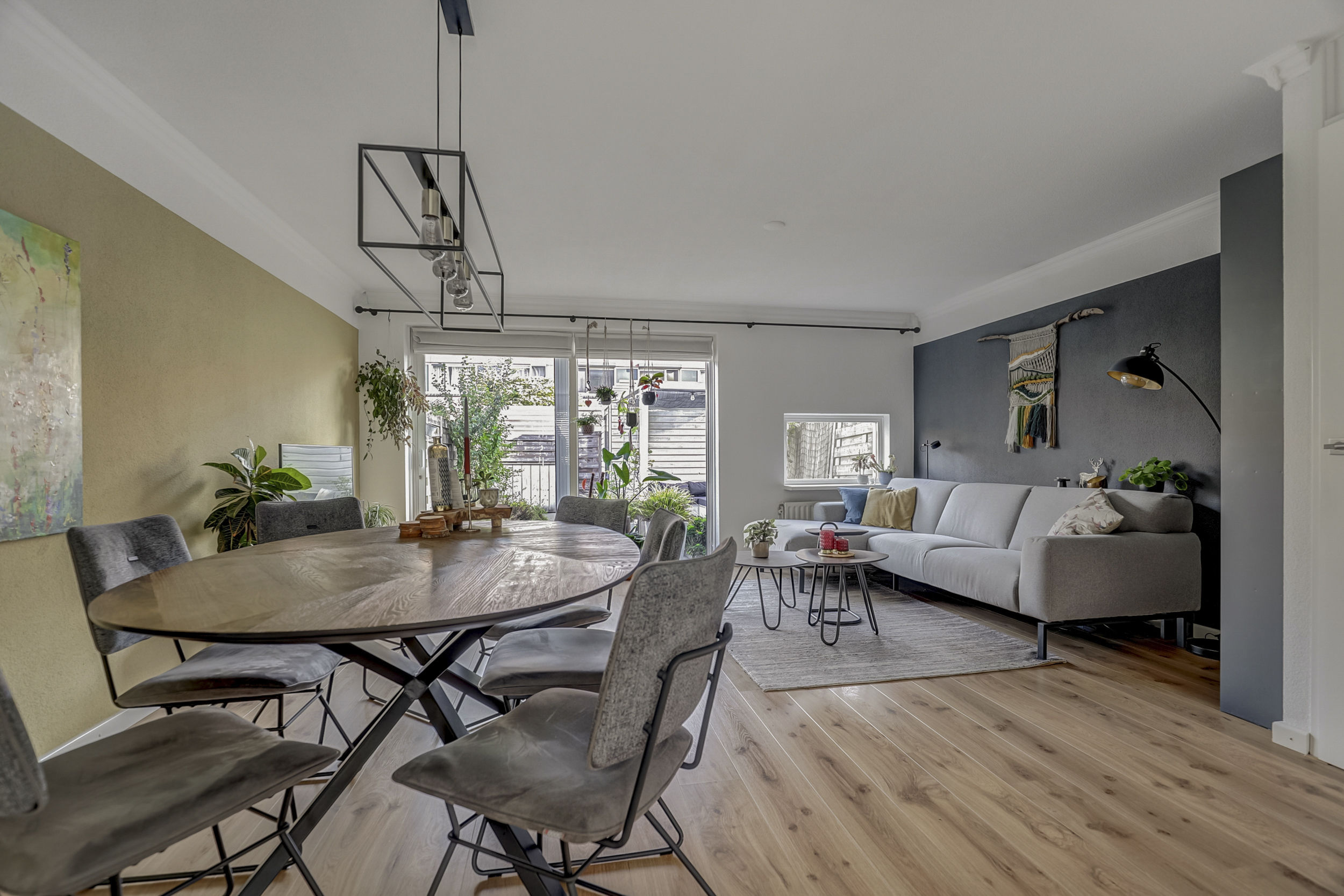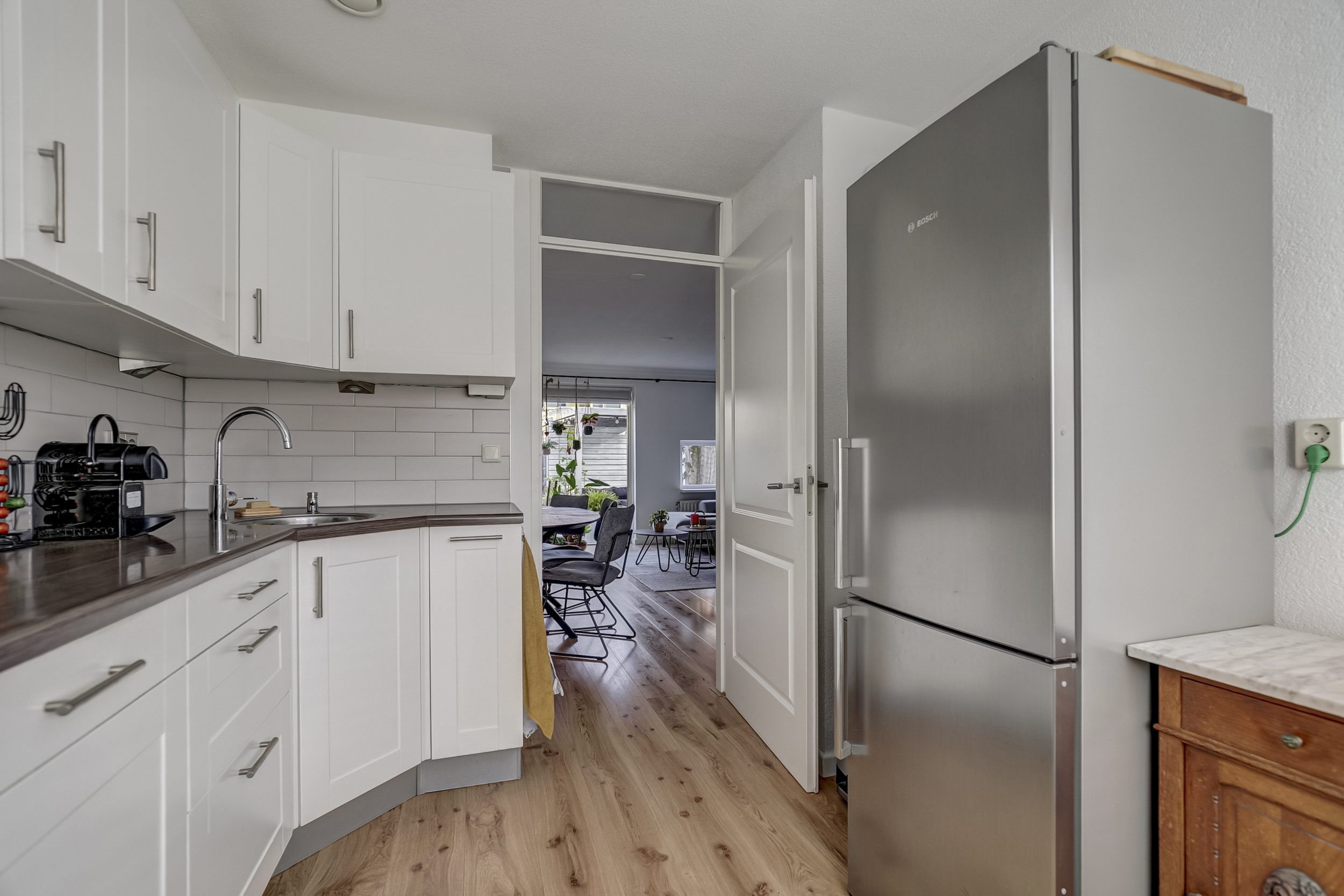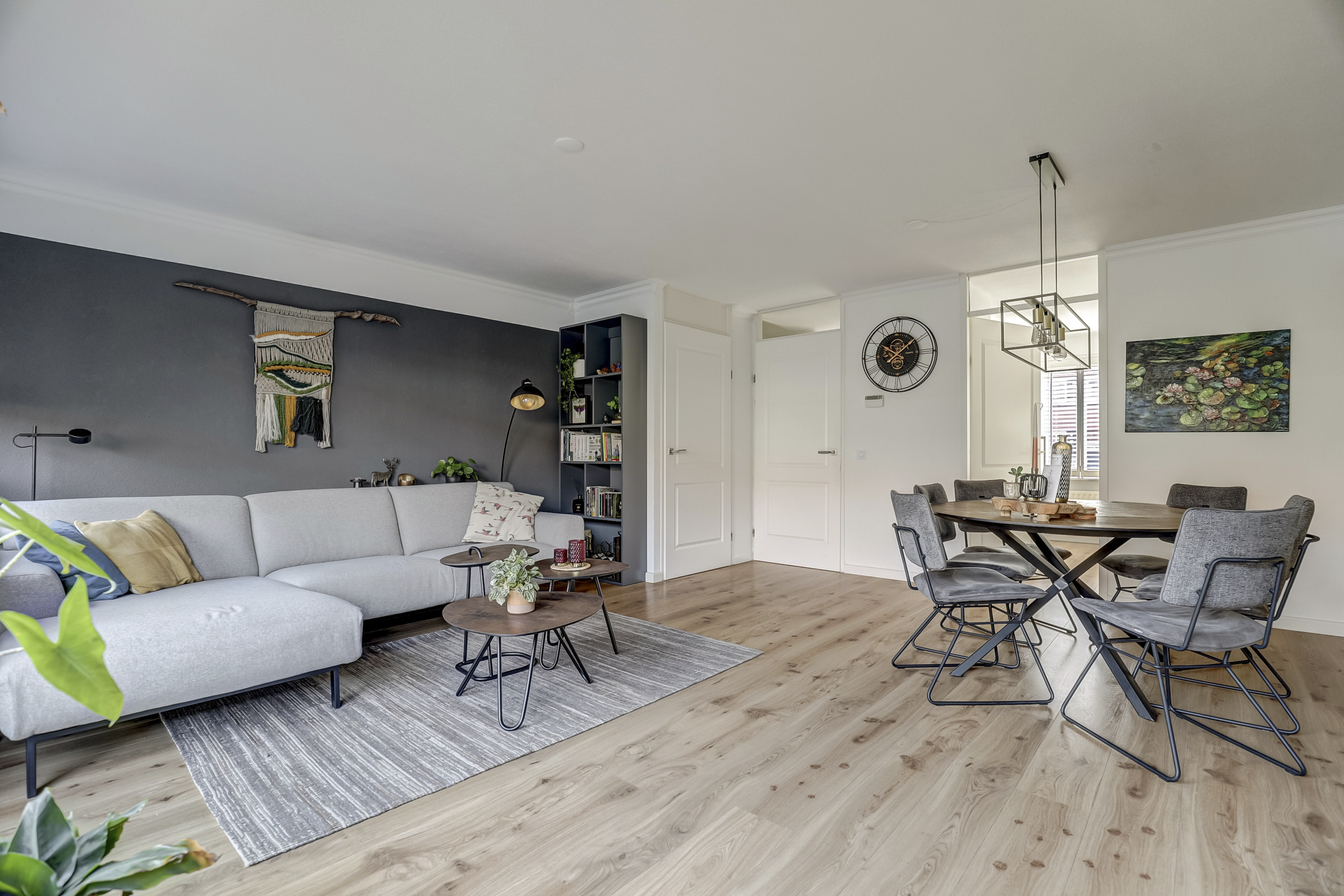 Entree, hal met meterkast en trapopgang naar de eerste verdieping, met toegang tot de woonkamer. De lichte, ruime woonkamer is strak afgewerkt met een lichte laminaatvloer. De grote schuifpui naar de achtertuin zorgt voor veel licht en een prettige verbinding met buiten. Aan de tuinzijde is ruimte voor een gezellige zithoek, terwijl de eethoek centraal in het midden is gesitueerd. De praktische trapkast biedt extra bergruimte voor proviand en andere benodigdheden. Aan de voorzijde is de keuken uitgevoerd in lichte tinten, voorzien van diverse inbouwapparatuur en afgewerkt met charmante paneeldeuren.