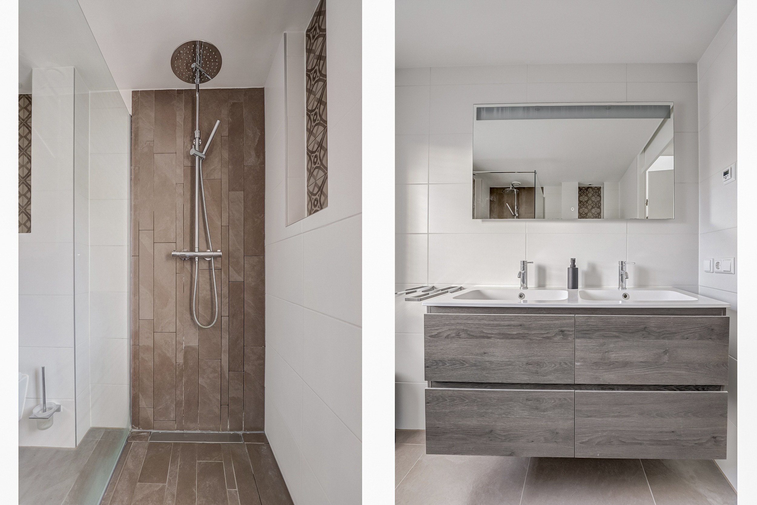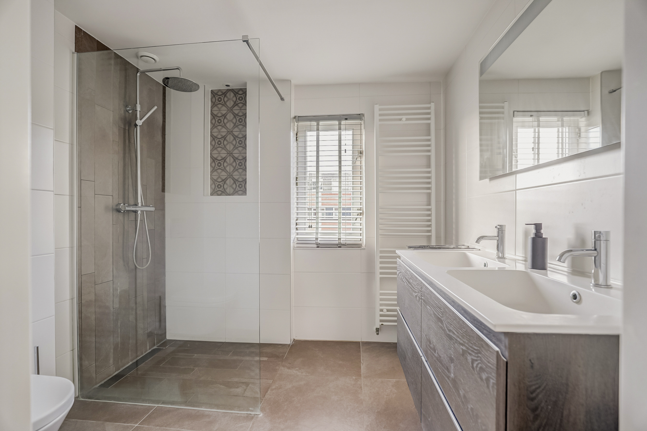 Op de eerste verdieping bevinden zich drie ruime slaapkamers en een moderne badkamer. De badkamer is uitgerust met een inloopdouche, dubbele wastafel en een toilet. Grote ramen zorgen voor veel lichtinval en een aangename sfeer.