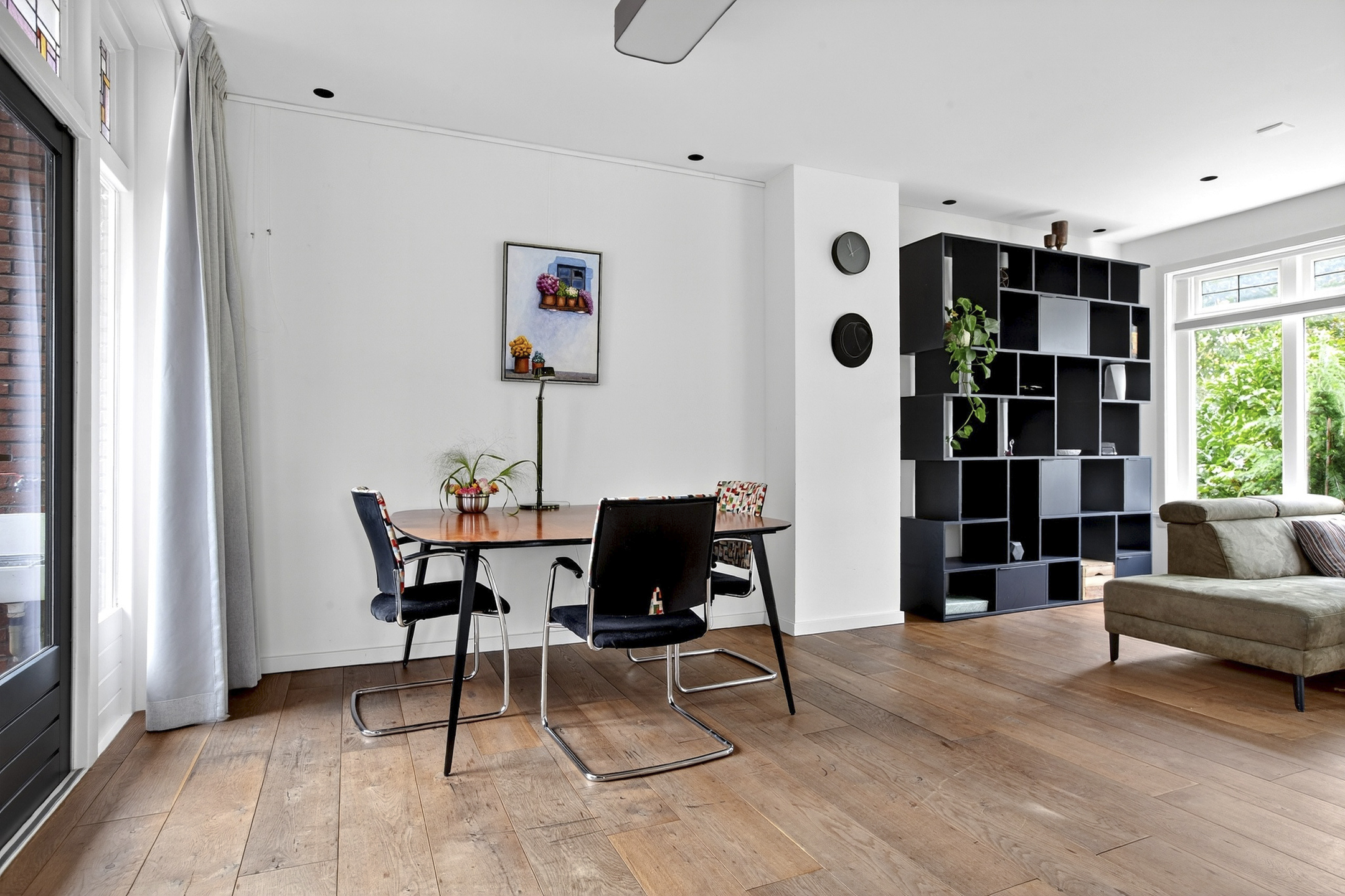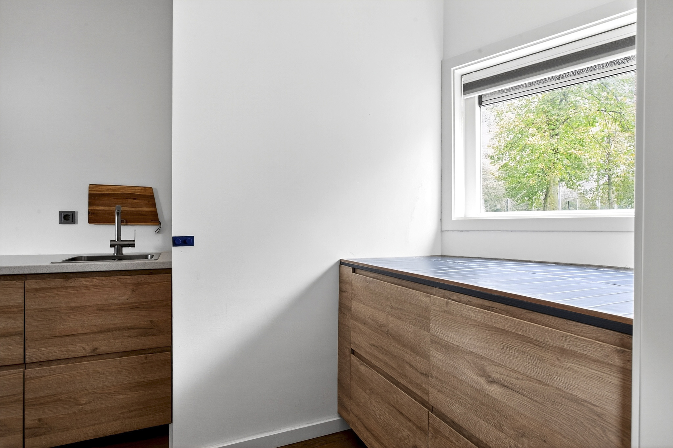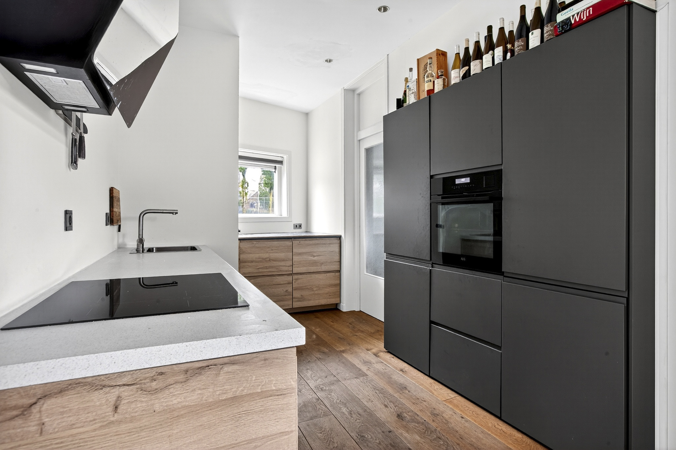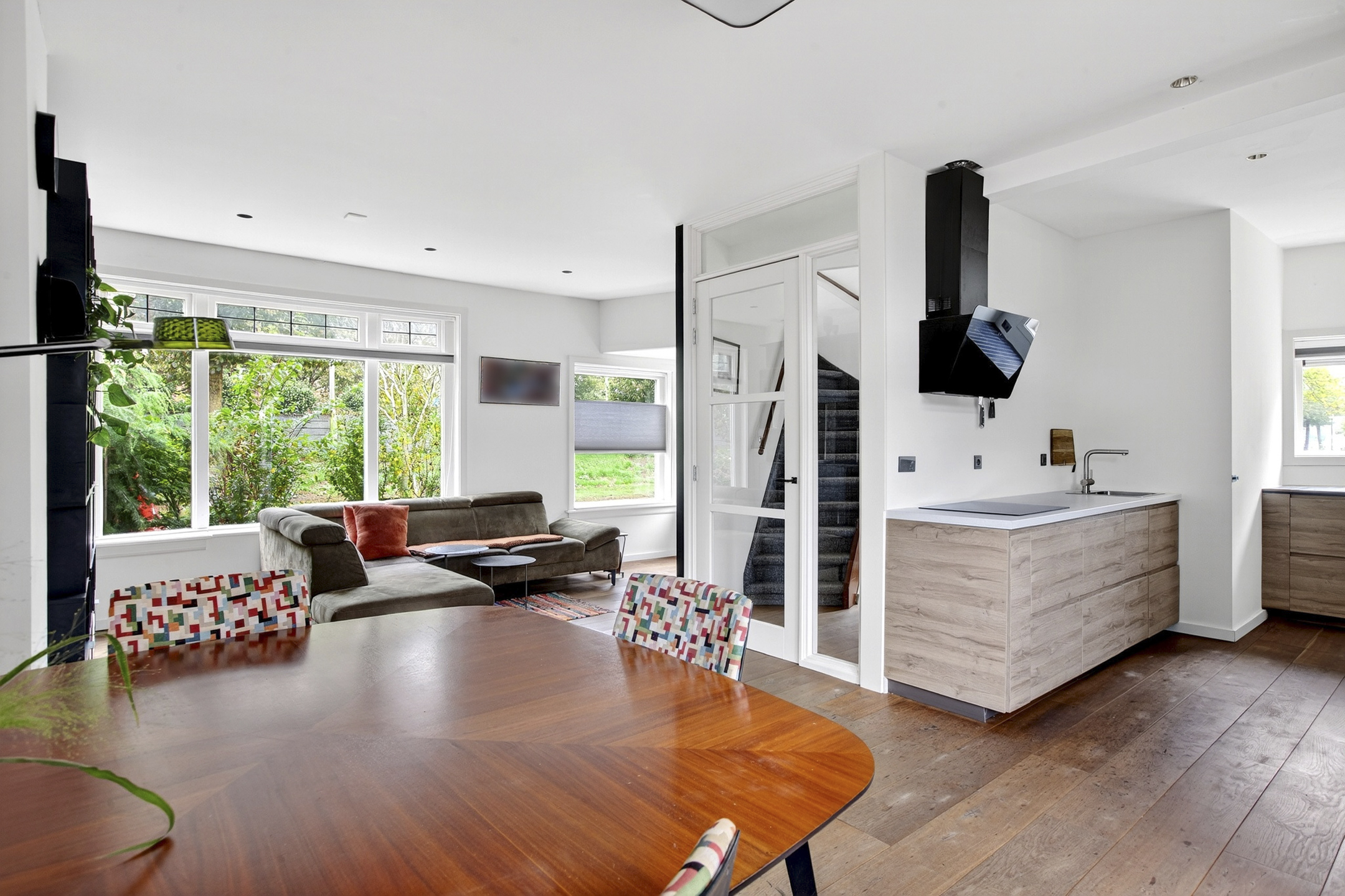 De woning beschikt over een ruime entree die toegang biedt tot de eerste verdieping, het toilet en via een loopdeur naar de woonkamer, in het toilet bevindt zich tevens de meterkast. De woonkamer is royaal van opzet, met voldoende ruimte voor een grote eettafel en een comfortabel zitgedeelte. Dankzij de ramen in alle gevels geniet de ruimte van veel natuurlijk licht. Via openslaande deuren is de zonnige achtertuin bereikbaar, gelegen op het zuidwesten, waar u tot in de late uurtjes van de zon kunt genieten—perfect na een werkdag of een project in de garage. De moderne open keuken, direct bereikbaar vanuit de woonkamer, is van alle gemakken voorzien. De keuken beschikt over een inductiekookplaat, afzuigkap, stoomoven, vaatwasser, koel-/vriescombinatie en een spoelbak. De keuken beschikt over veel bergruimte en is afgewerkt met een kunststof werkblad. Vanuit de keuken is er toegang tot de royale garage.