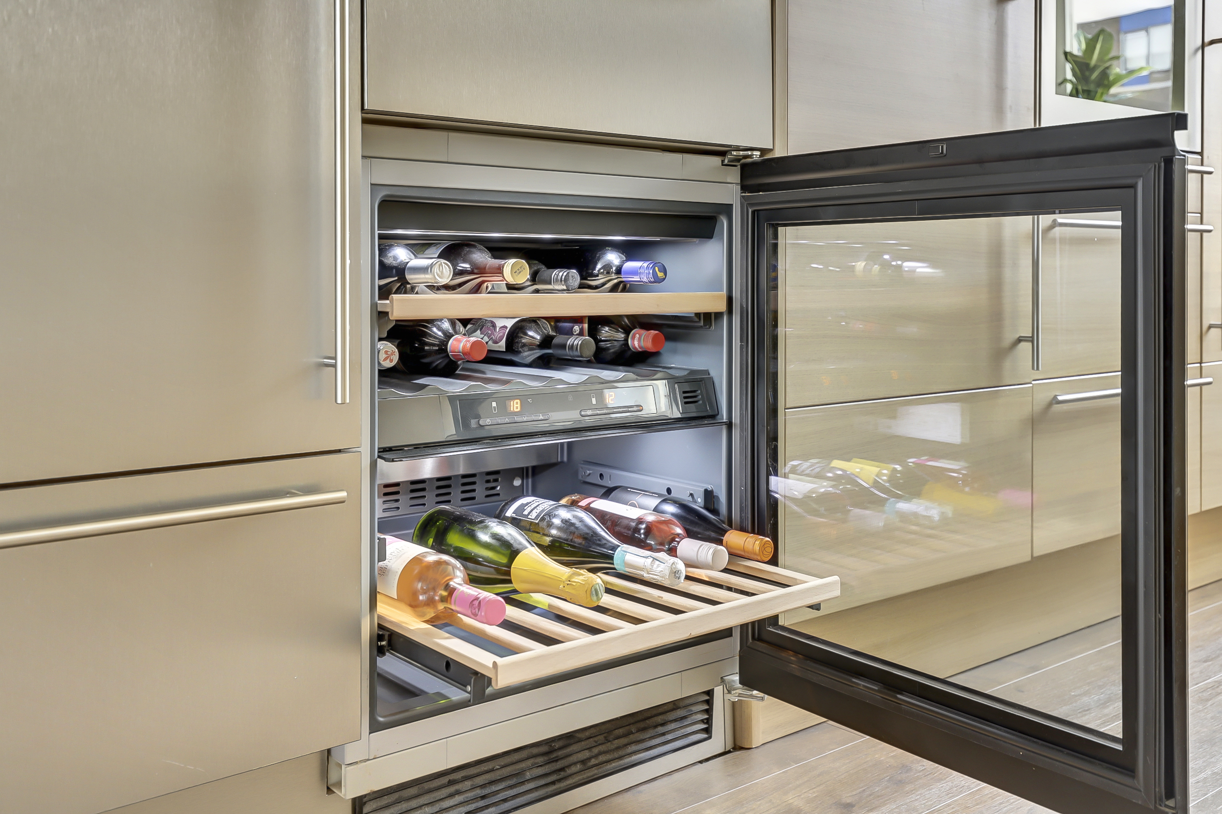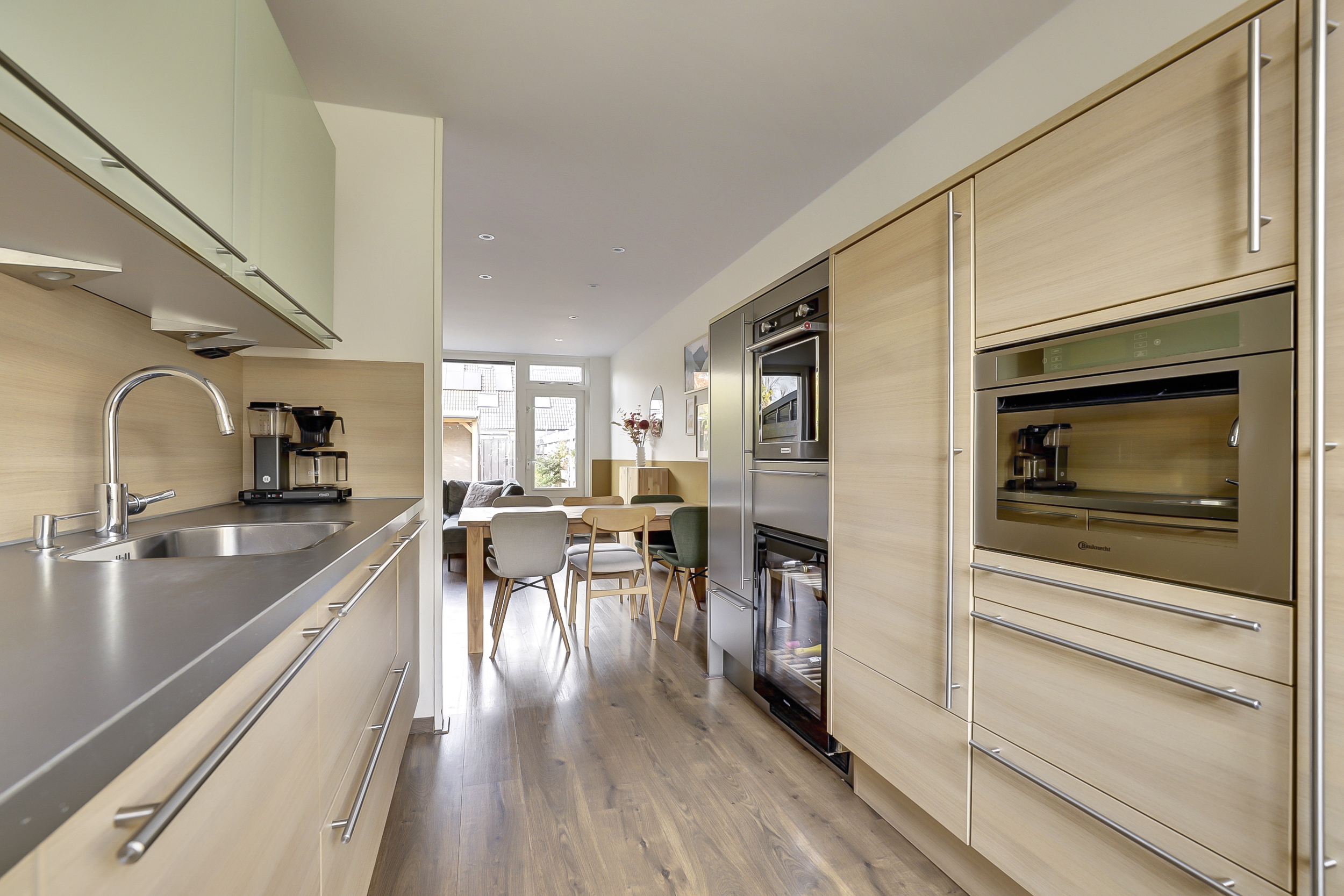 Stap binnen in de lichte en ruime woonkamer, waar de grote ramen zorgen voor een zee van daglicht. De moderne keuken uit 2019 is voorzien van hoogwaardige inbouwapparatuur, waaronder een gaskookplaat, afzuigkap, oven, magnetron, stoomoven, vaatwasser, koelkast, vriezer met 5 lades en zelfs een ingebouwde wijnklimaatkast. Dankzij de praktische indeling is er volop kastruimte en werkcomfort, perfect voor wie graag kookt