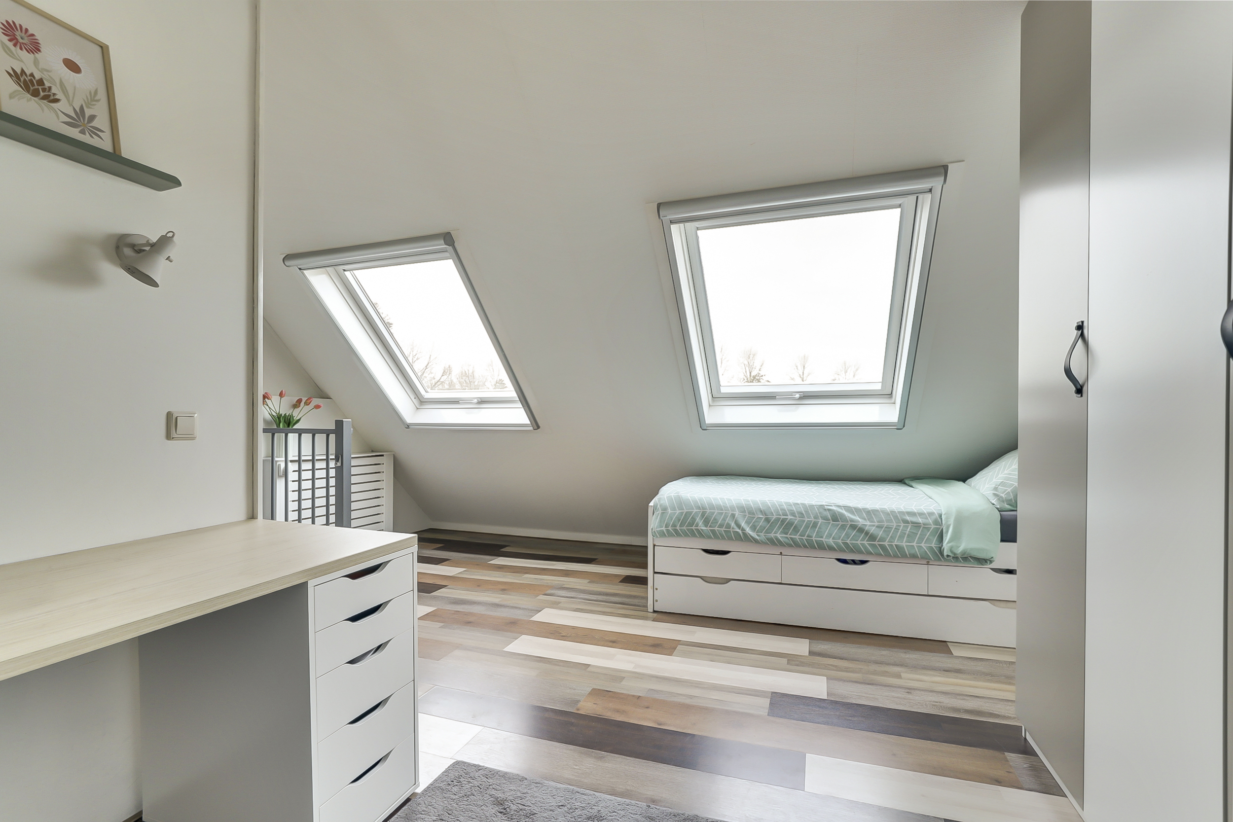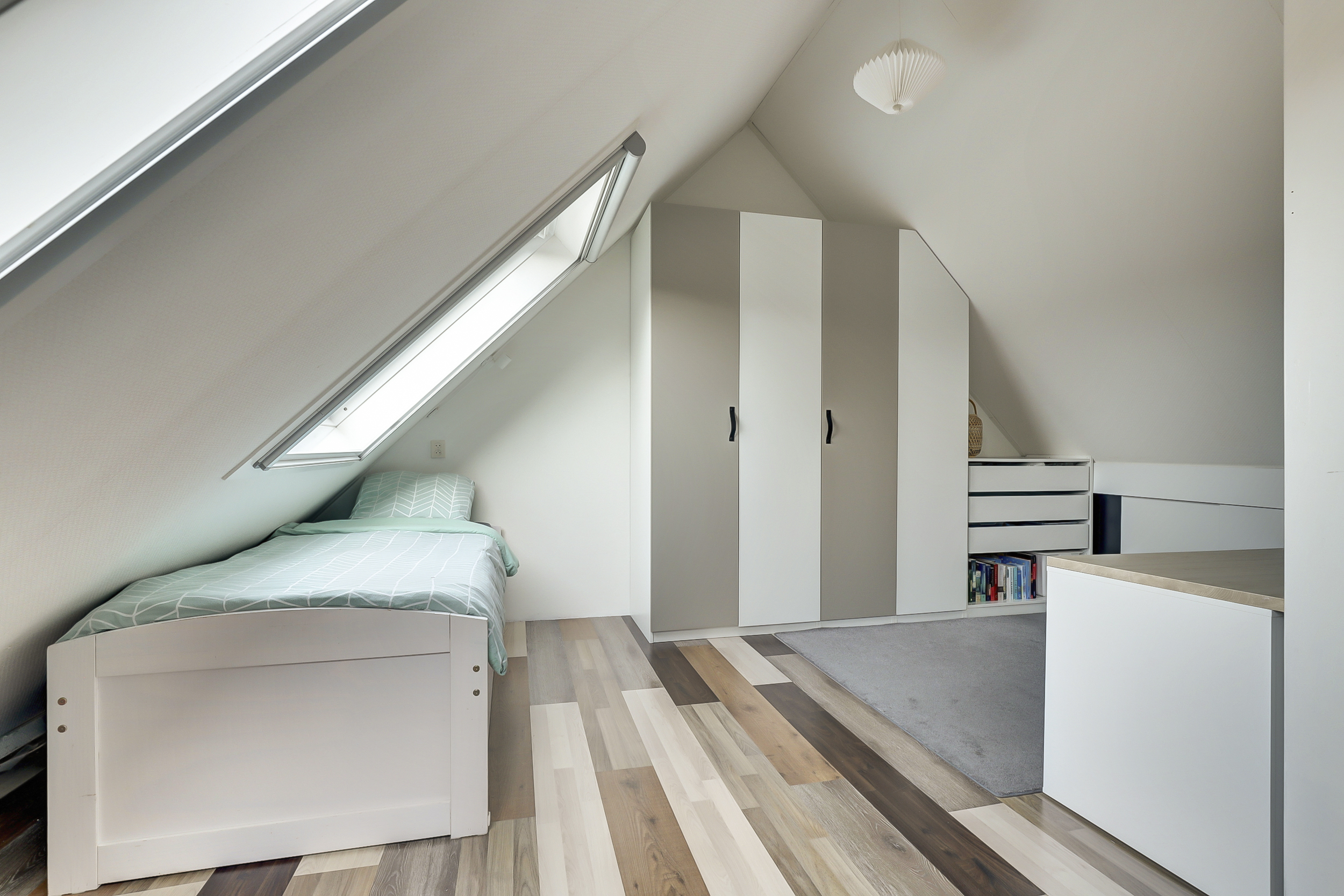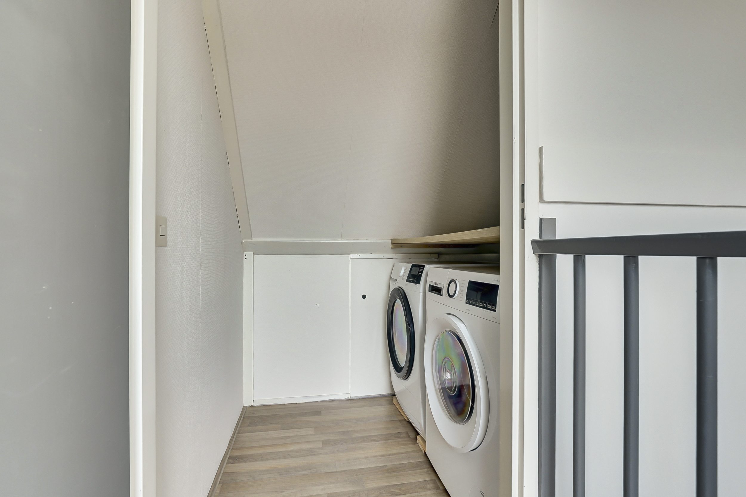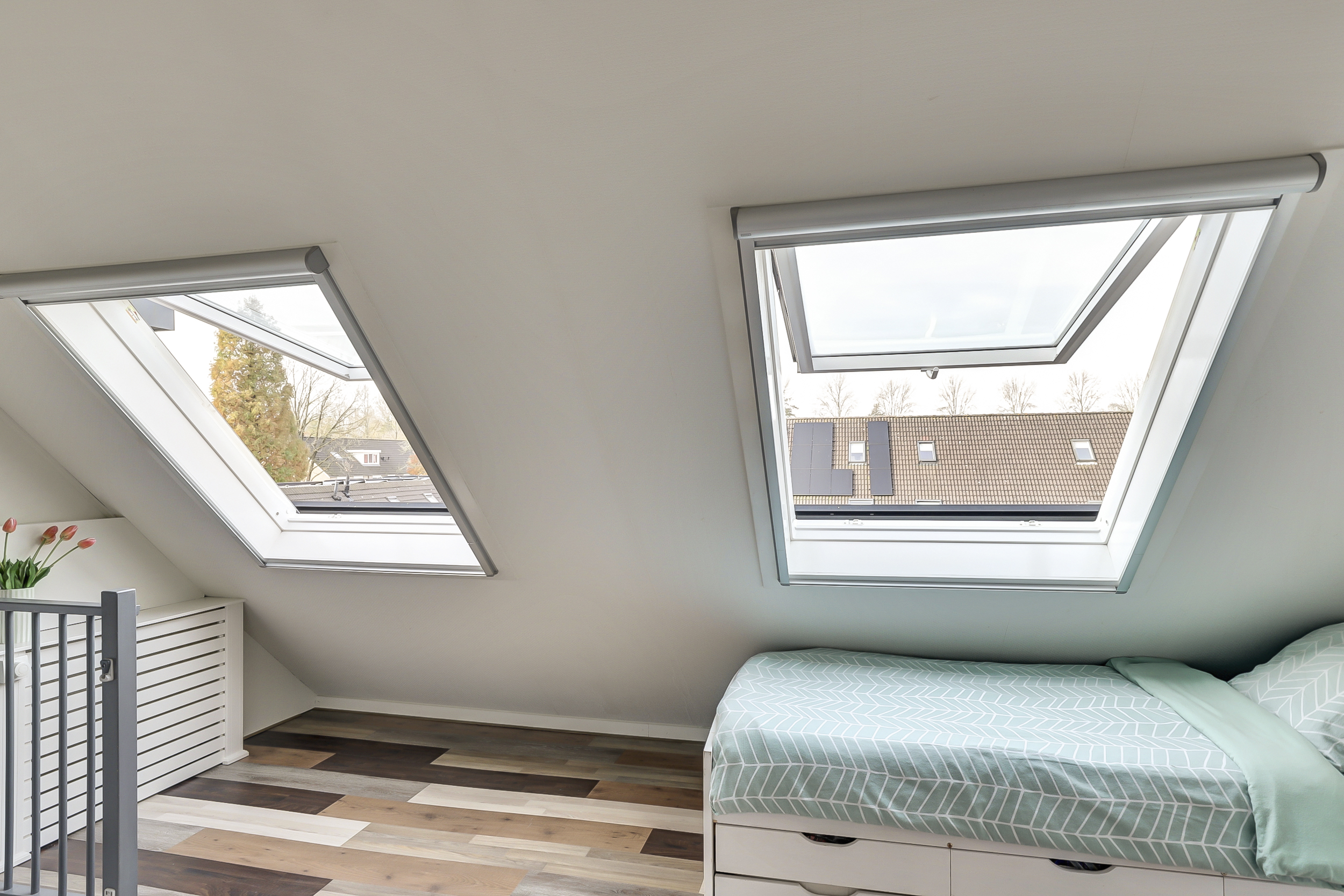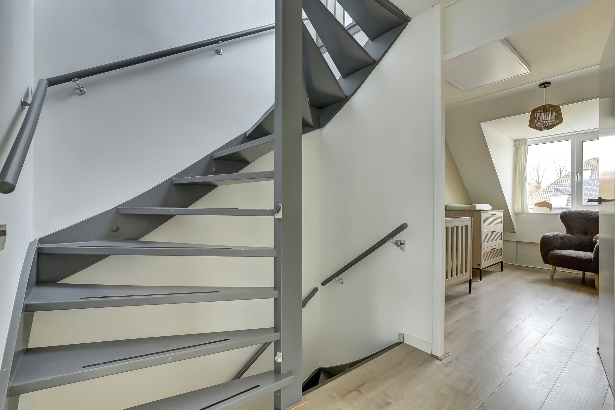De vaste trap leidt naar de overloop met toegang tot drie ruime slaapkamers en de badkamer. De slaapkamers zijn stuk voor stuk licht en verzorgd, voorzien van laminaatvloeren en strak afgewerkte wanden. Twee kamers aan de achterzijde beschikken over een dakkapel, wat zorgt voor extra licht en ruimte — ideaal voor een gezin of om een fijne thuiswerkplek te creëren.