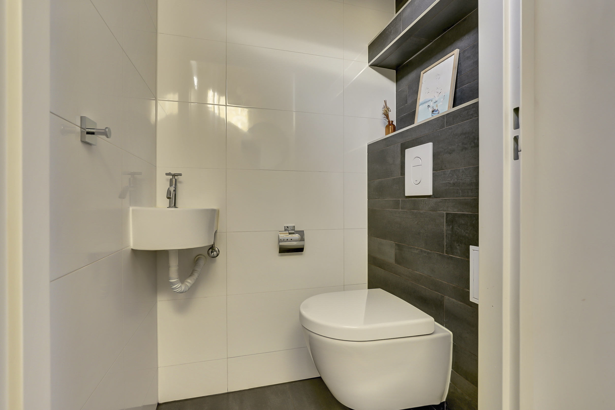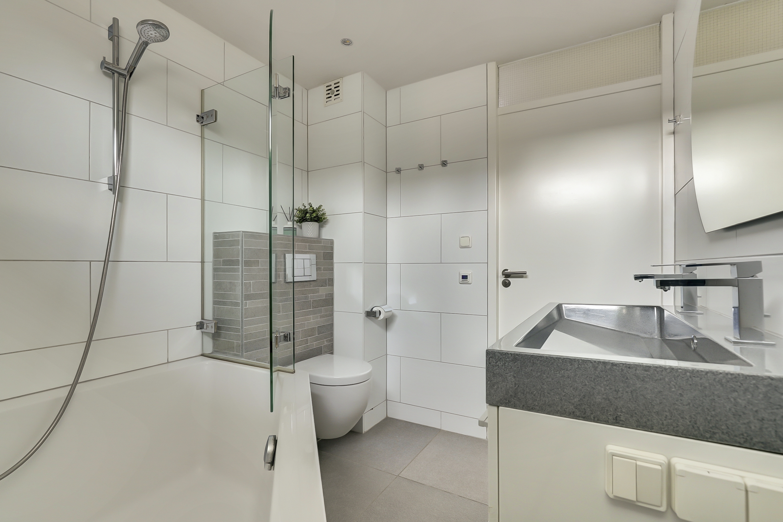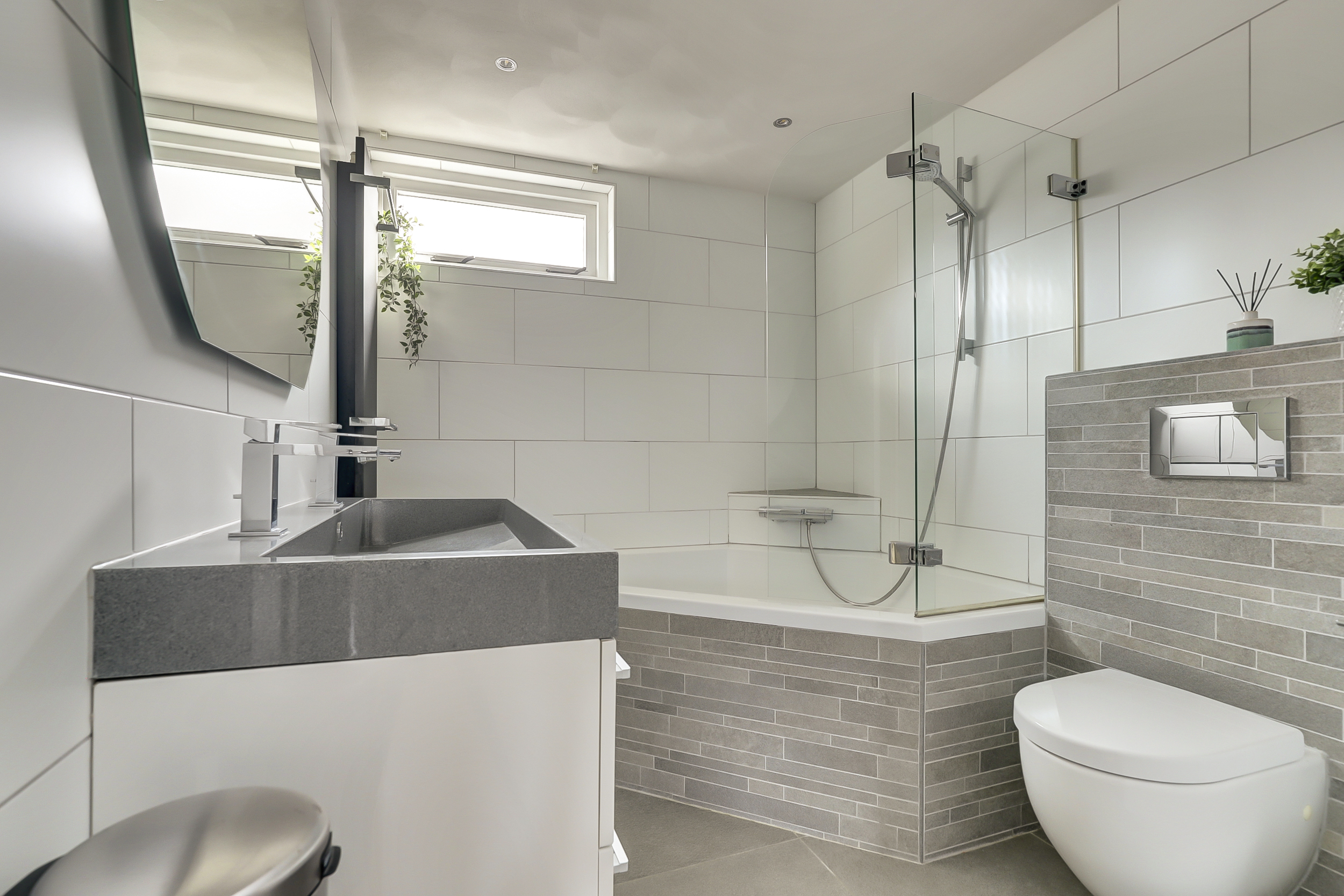 De badkamer (bouwjaar 2019) is modern en luxe uitgevoerd in neutrale tinten en voorzien van vloerverwarming, een ligbad met douchecombinatie, wastafelmeubel met spiegel en een tweede toilet. Een aangename, frisse ruimte met een eigentijdse uitstraling waar je helemaal tot rust komt na een drukke dag.