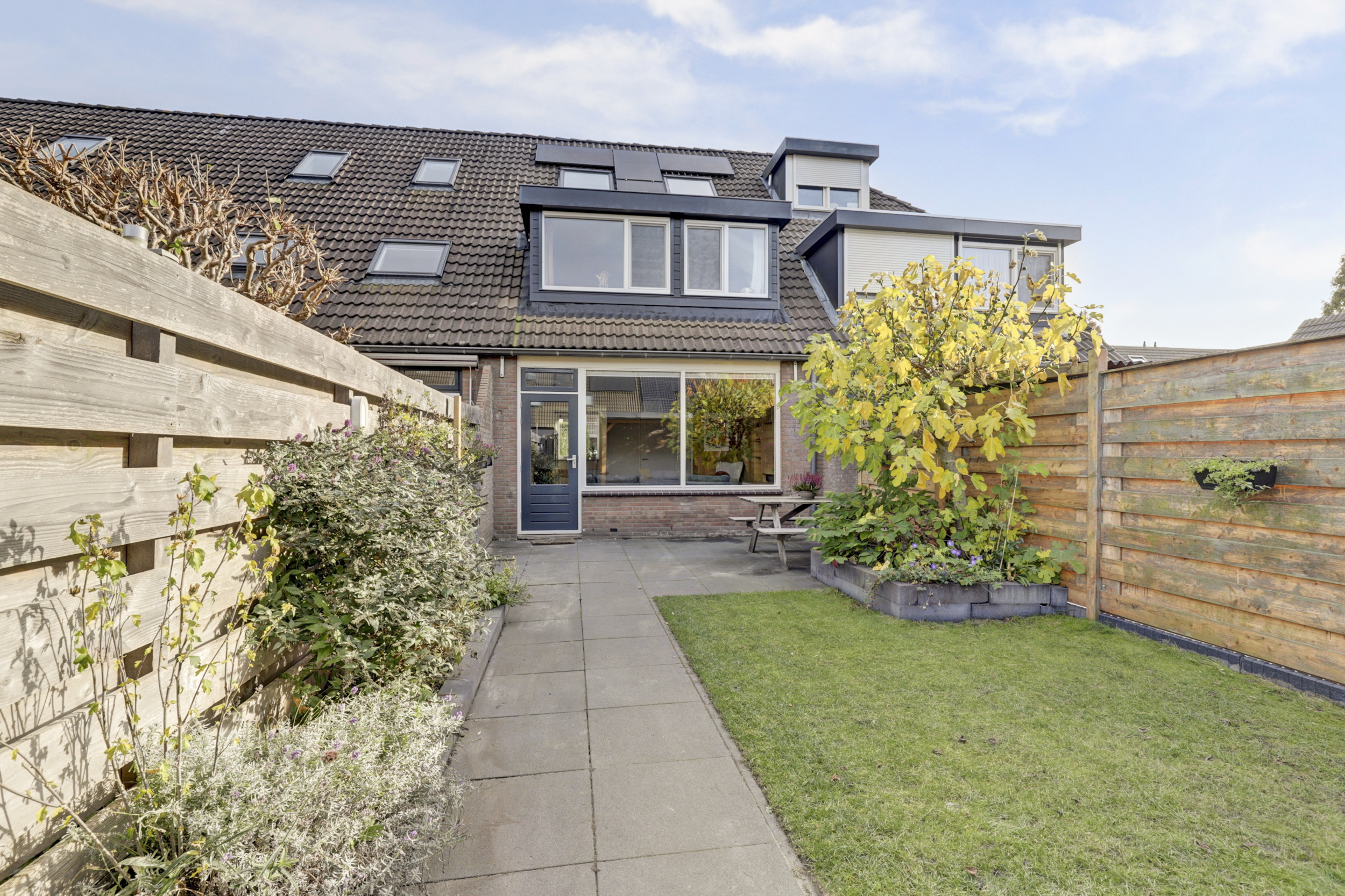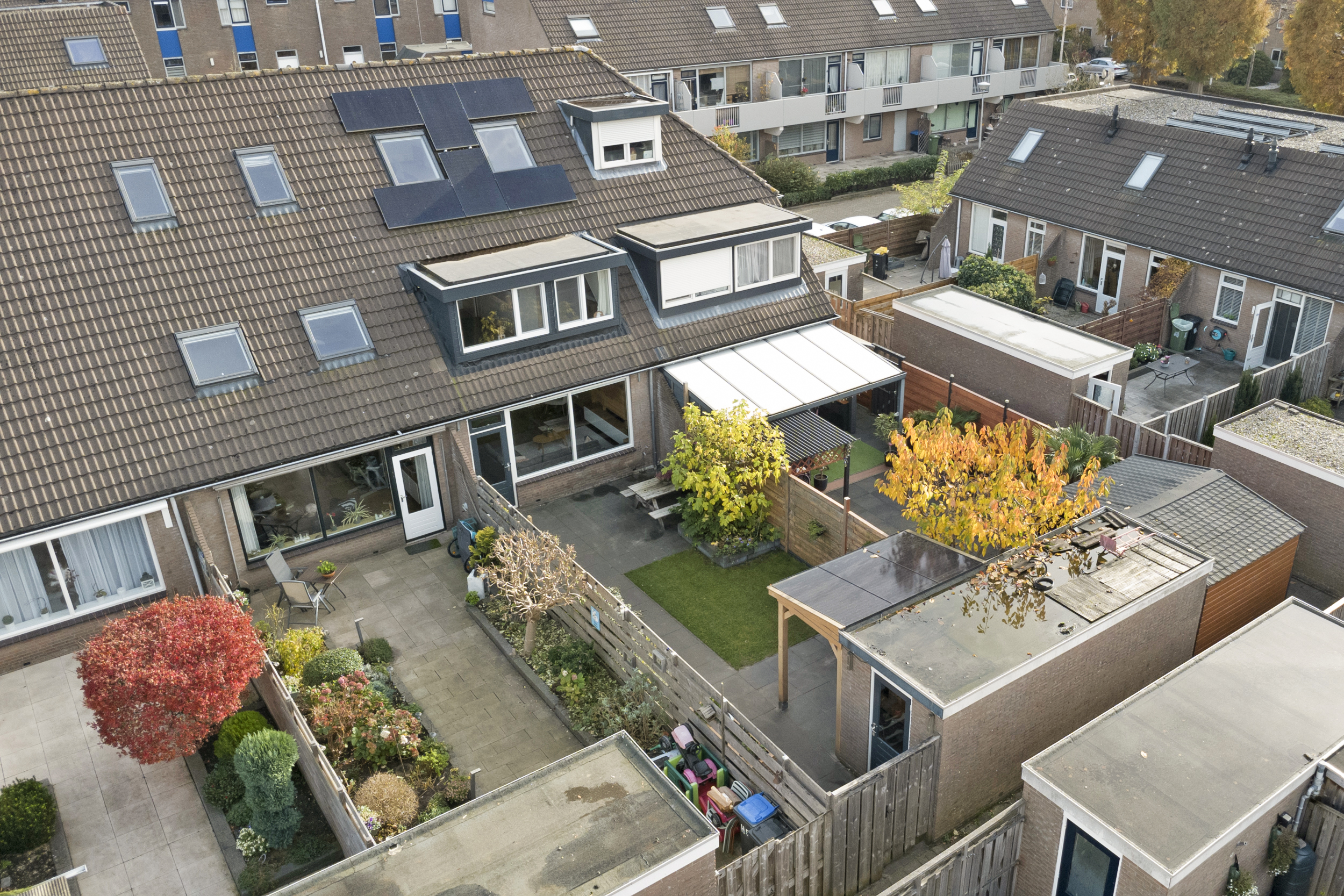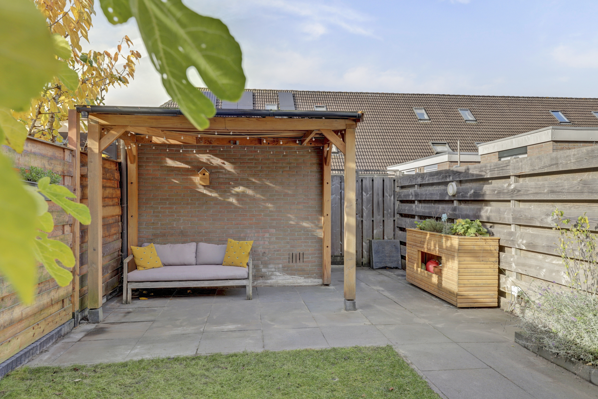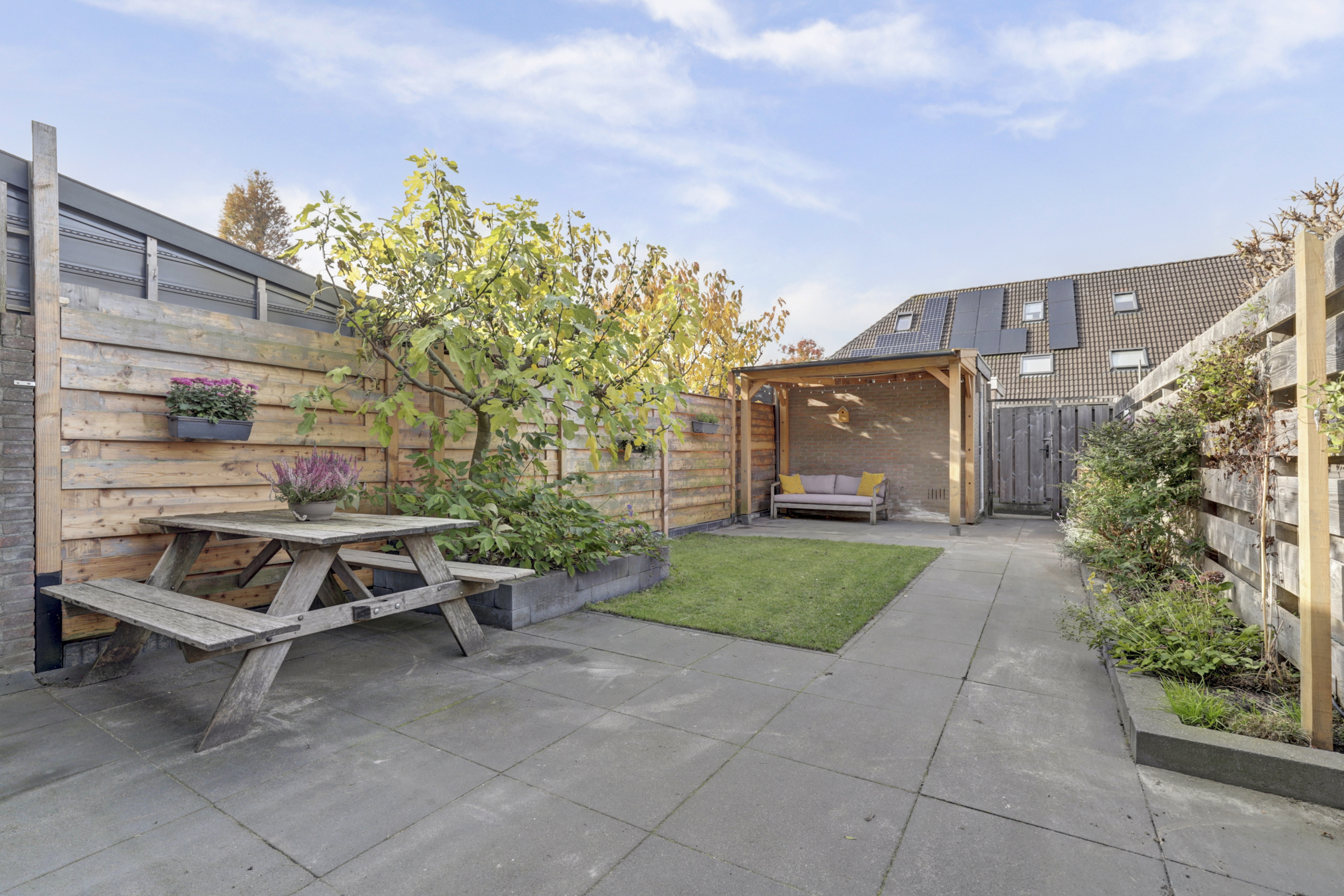 De achtertuin is een heerlijke plek om te ontspannen, met een mix van groen en terras. De overkapping en berging zorgen voor praktische opslagmogelijkheden, en de ligging op het westen betekent dat je hier tot in de late uurtjes van de zon kunt genieten. Voeg daar de beschutte ligging en privacy aan toe, en je hebt de ideale plek voor buitenleven.