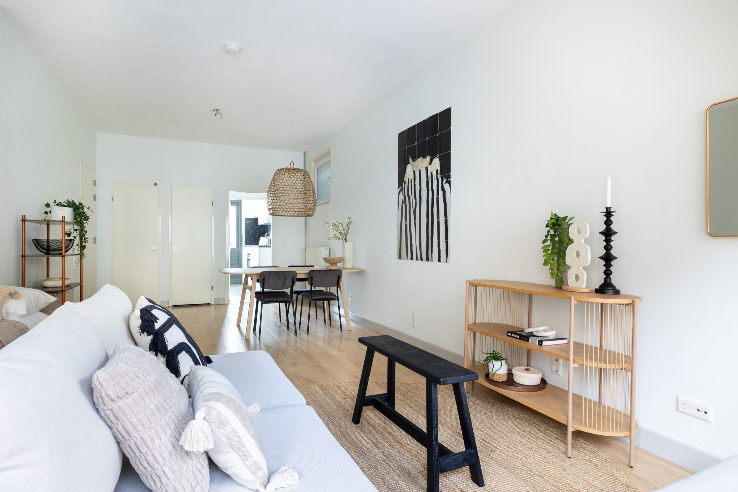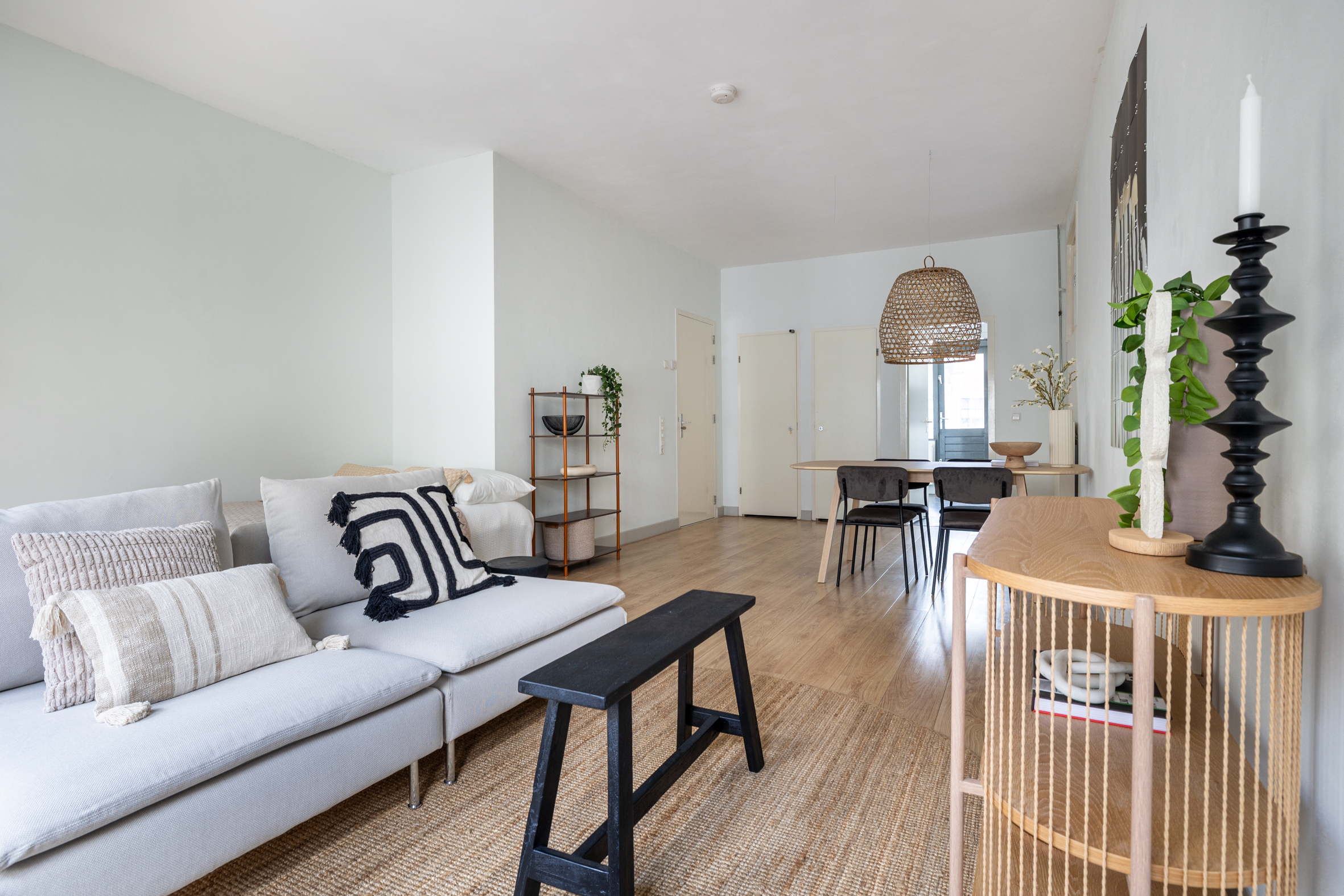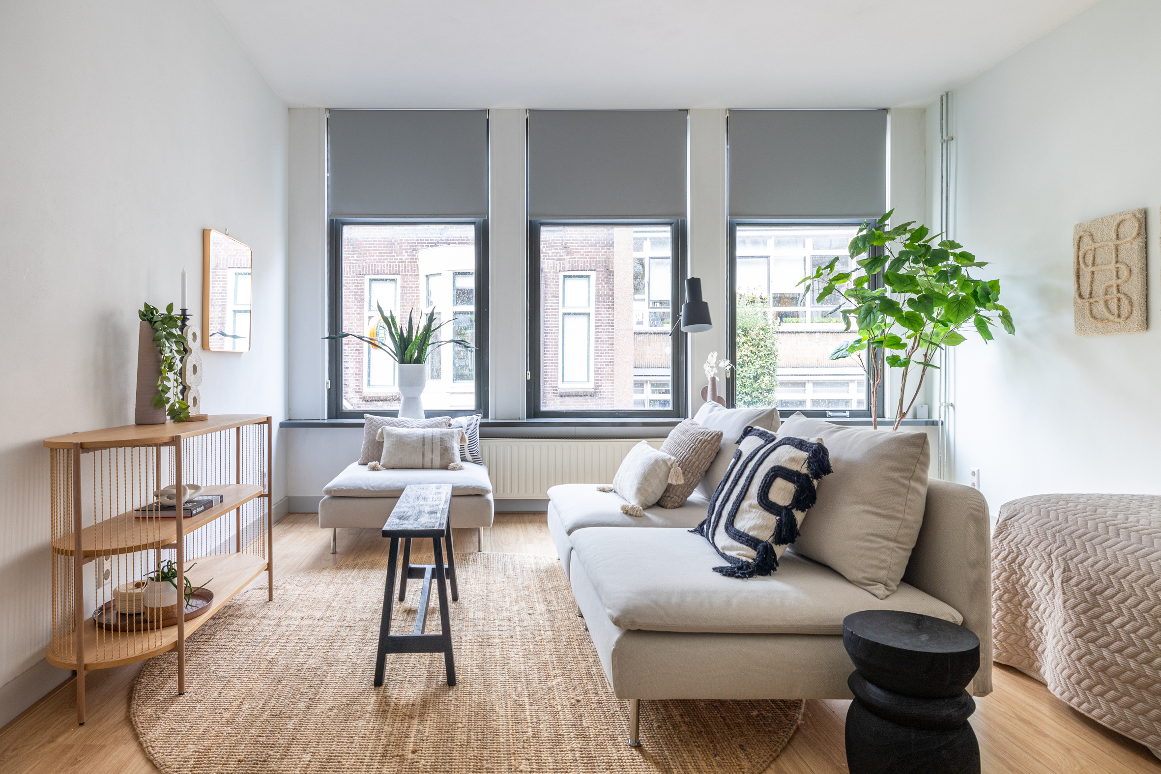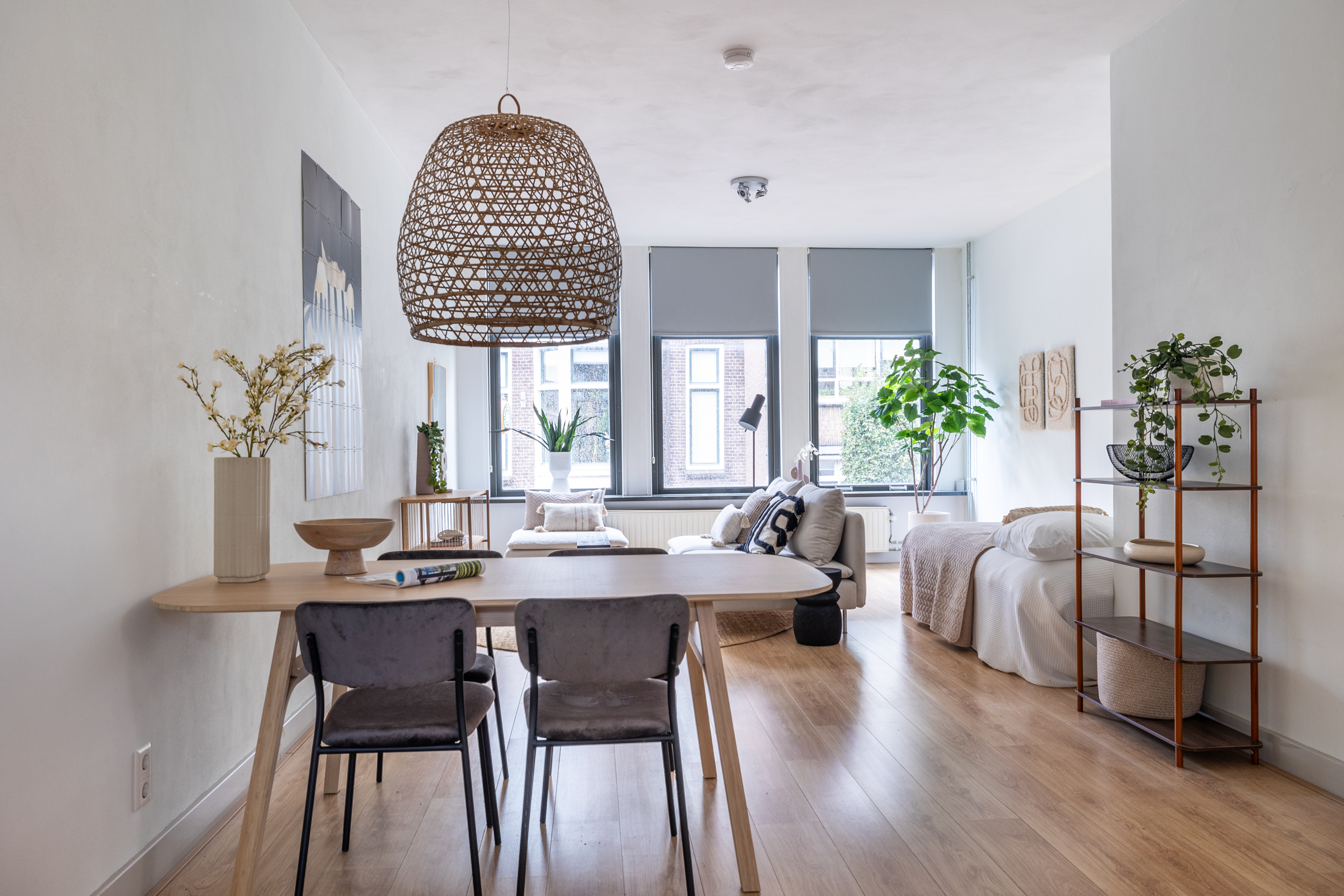 Bij binnenkomst op de eerste verdieping valt meteen de ruime woonkamer op, gelegen aan de voorzijde van de woning. De vele ramen zorgen voor een aangename lichtinval en bieden een leuk uitzicht op de levendige straat. De indeling van de woonkamer is flexibel; op de foto’s is ervoor gekozen het bed achter de bank te plaatsen, maar er zijn ook mogelijkheden om met roomdividers te werken. De lichte wanden en de houten vloer geven de ruimte een frisse en moderne uitstraling.