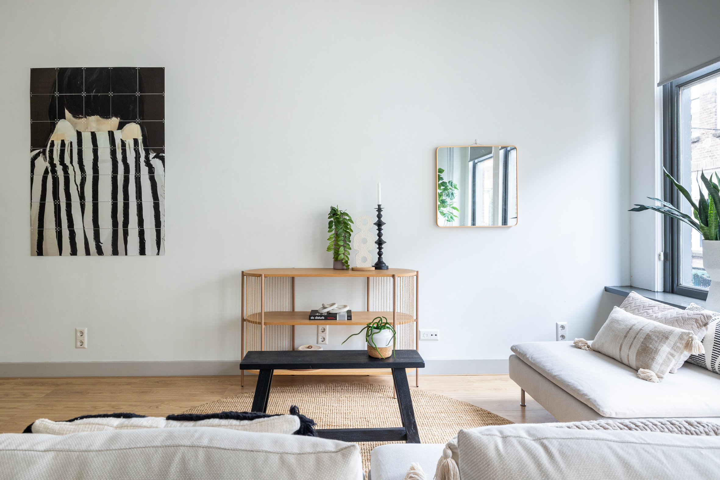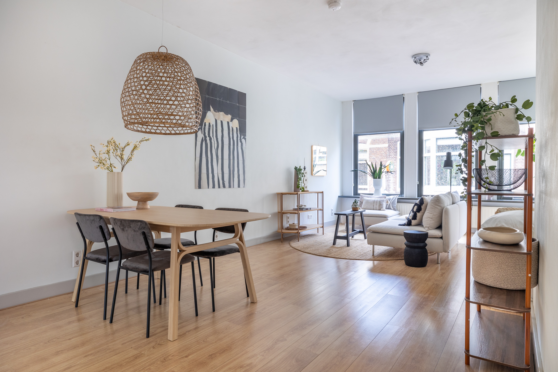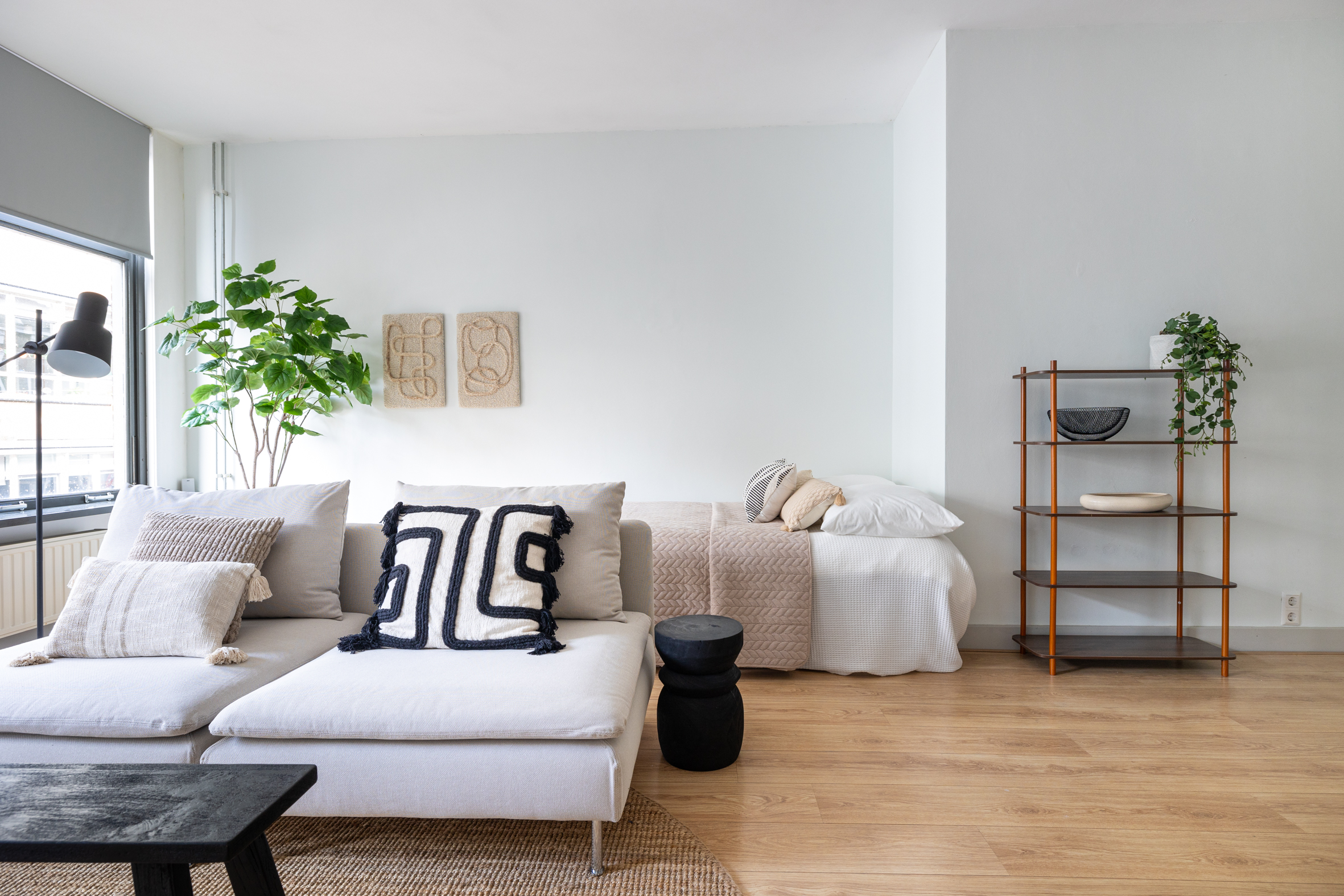 Bij binnenkomst op de eerste verdieping valt meteen de ruime woonkamer op, gelegen aan de voorzijde van de woning. De vele ramen zorgen voor een aangename lichtinval en bieden een leuk uitzicht op de levendige straat. De indeling van de woonkamer is flexibel; op de foto’s is ervoor gekozen het bed achter de bank te plaatsen, maar er zijn ook mogelijkheden om met roomdividers te werken. De lichte wanden en de houten vloer geven de ruimte een frisse en moderne uitstraling.
