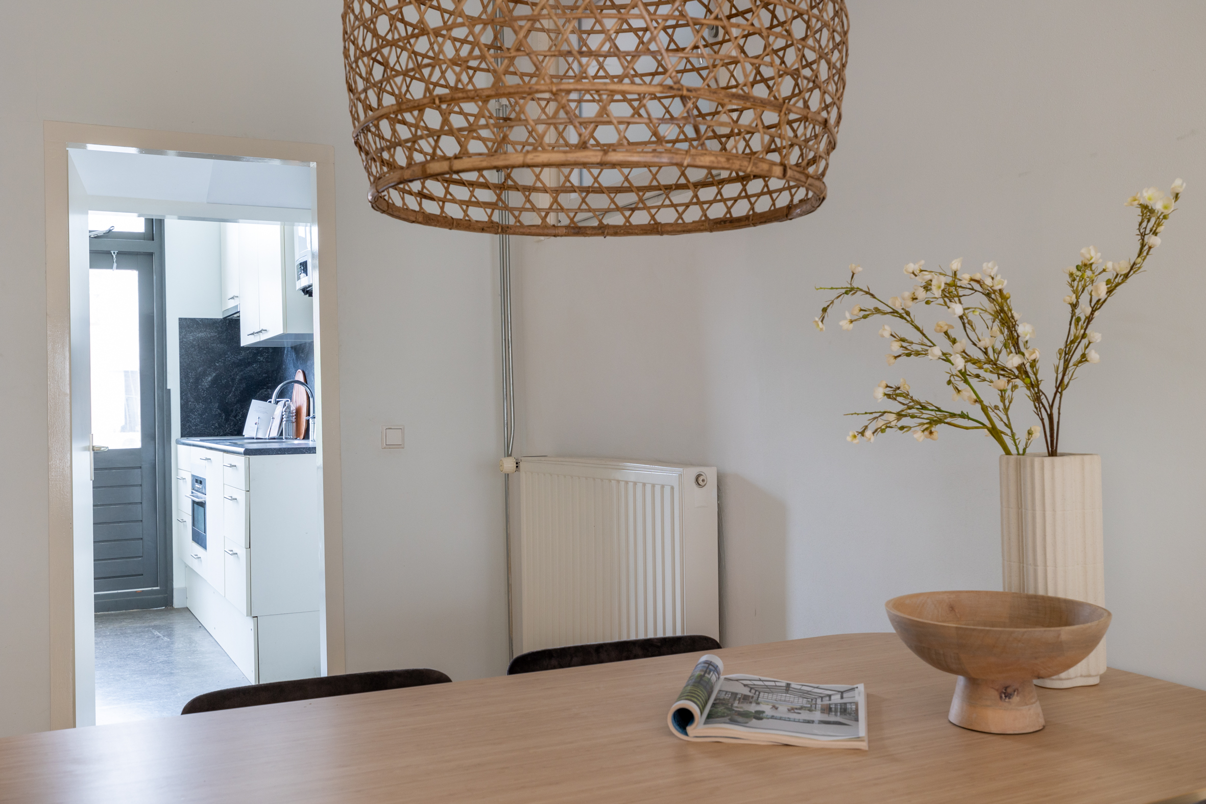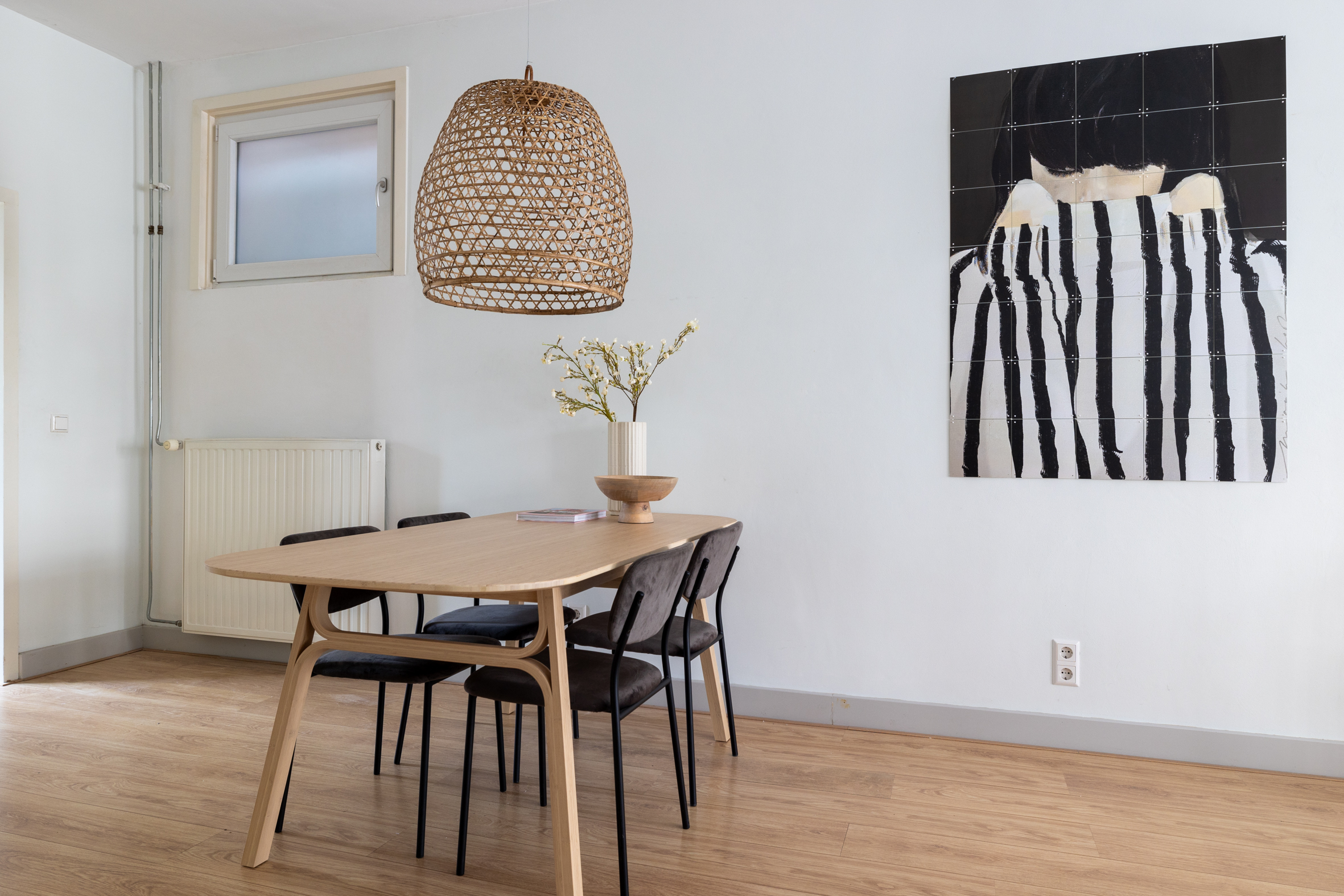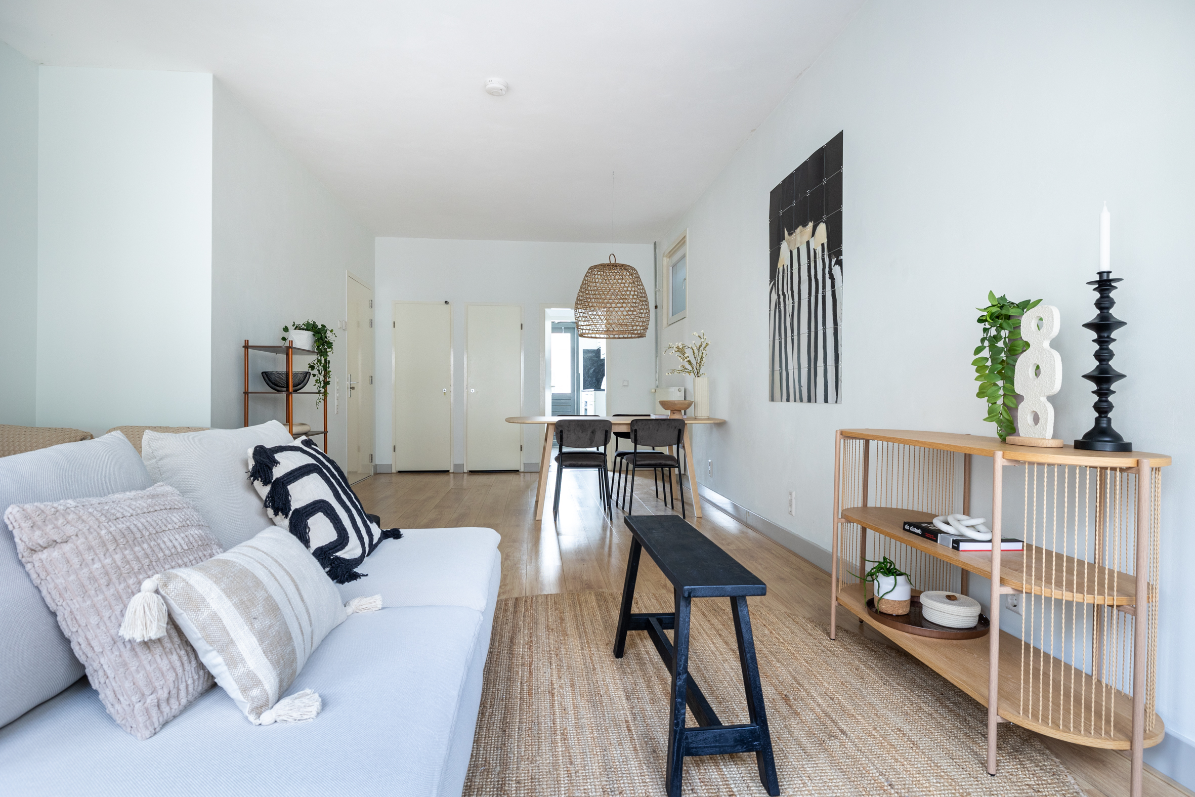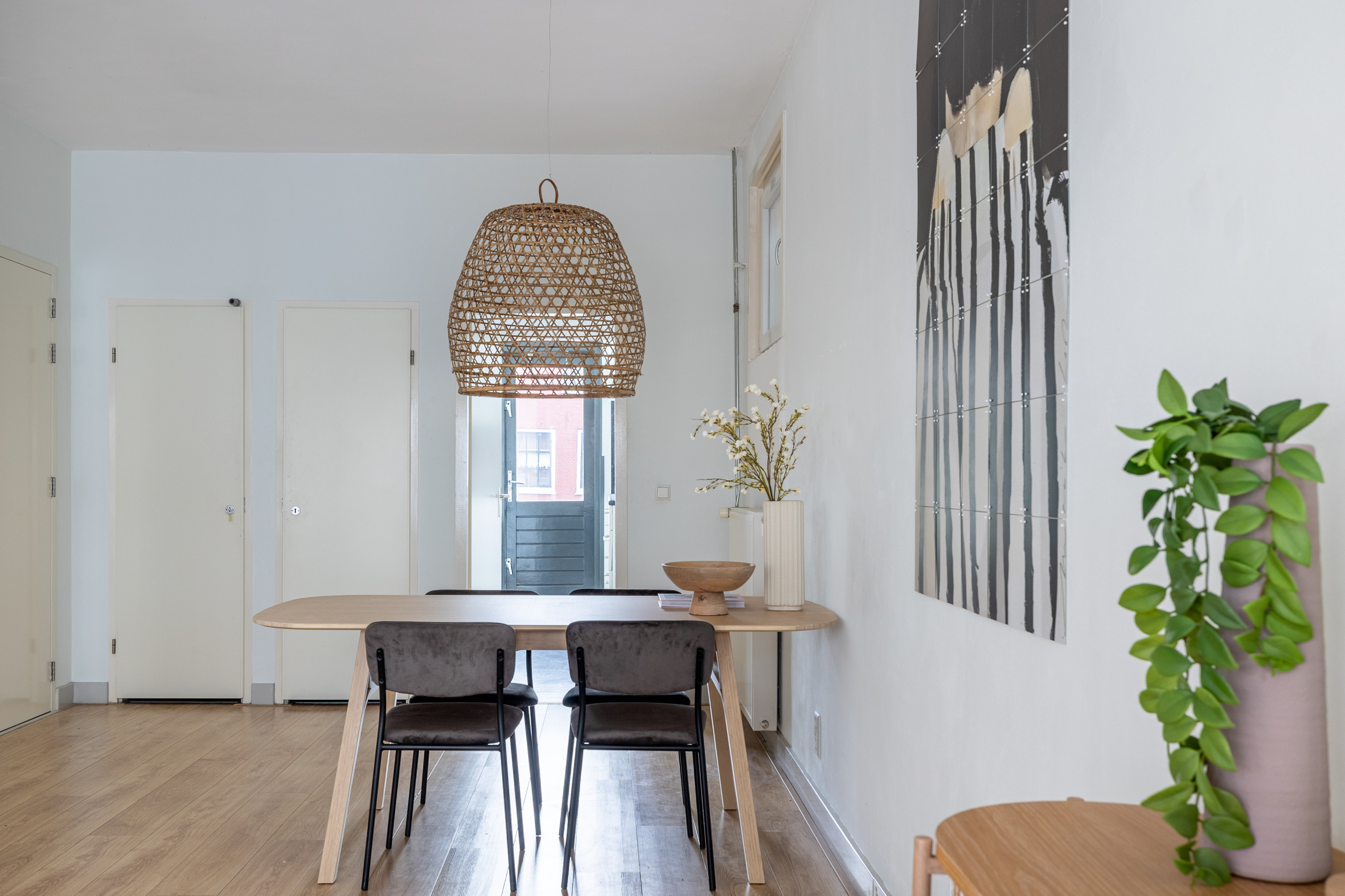 Bij binnenkomst op de eerste verdieping valt meteen de ruime woonkamer op, gelegen aan de voorzijde van de woning. De vele ramen zorgen voor een aangename lichtinval en bieden een leuk uitzicht op de levendige straat. De indeling van de woonkamer is flexibel; op de foto’s is ervoor gekozen het bed achter de bank te plaatsen, maar er zijn ook mogelijkheden om met roomdividers te werken. De lichte wanden en de houten vloer geven de ruimte een frisse en moderne uitstraling.