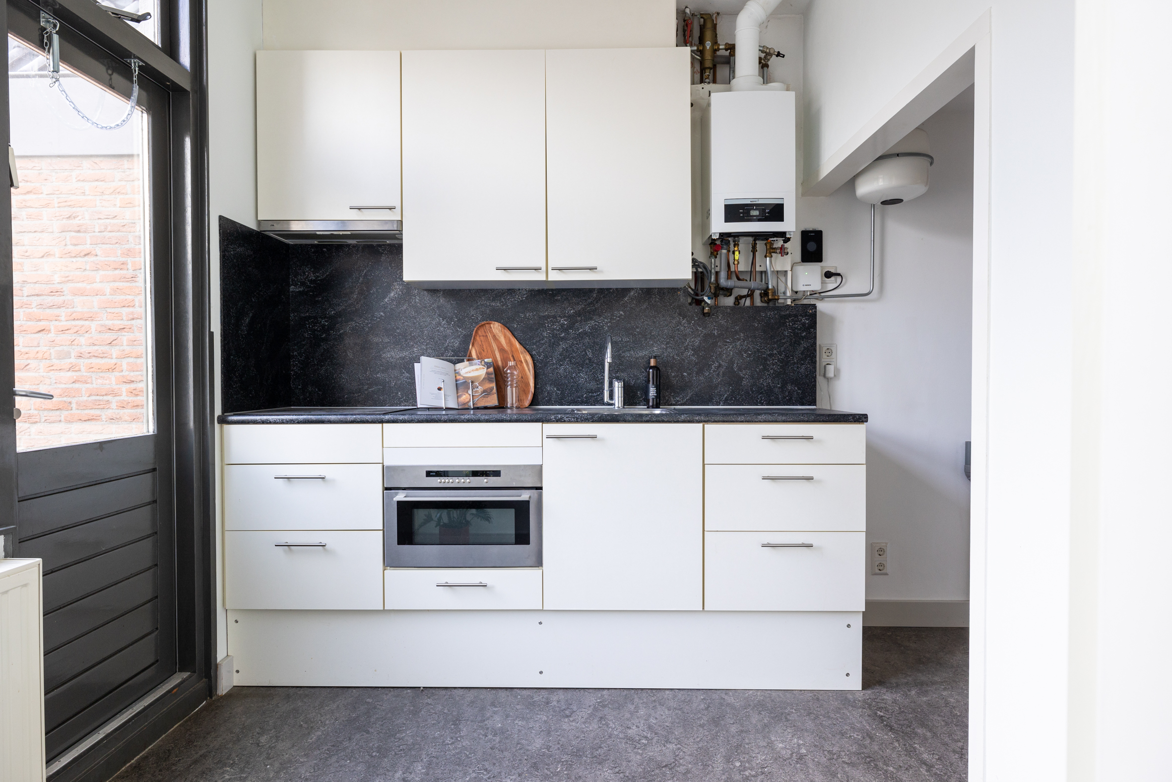 Aan de achterzijde bevindt zich de compacte keuken, efficiënt ingericht met diverse inbouwapparatuur.