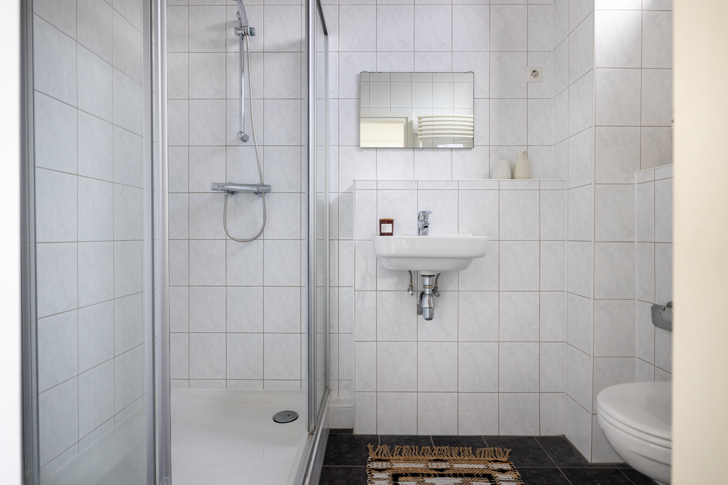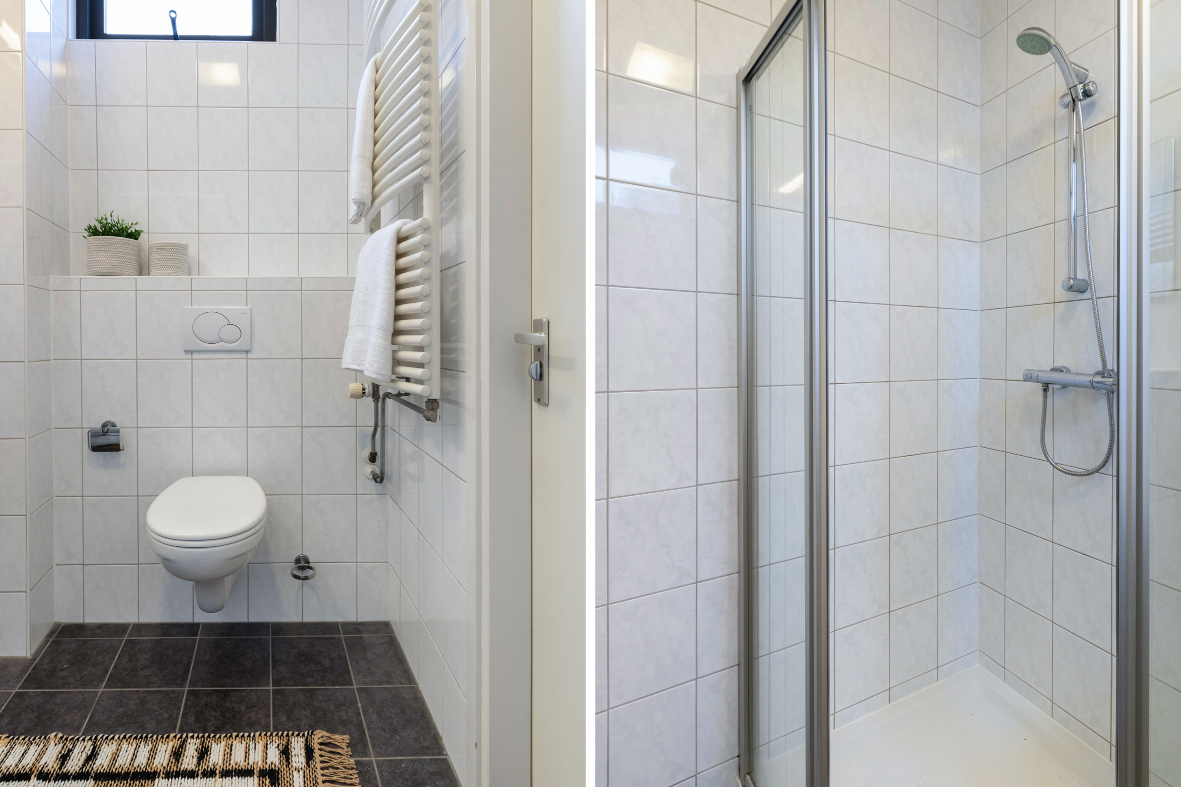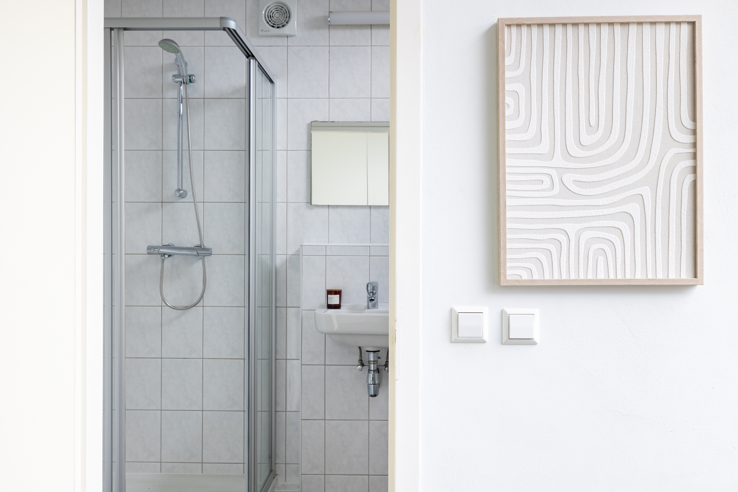 De badkamer is praktisch en voorzien van een inloopdouche, wastafel en toilet.