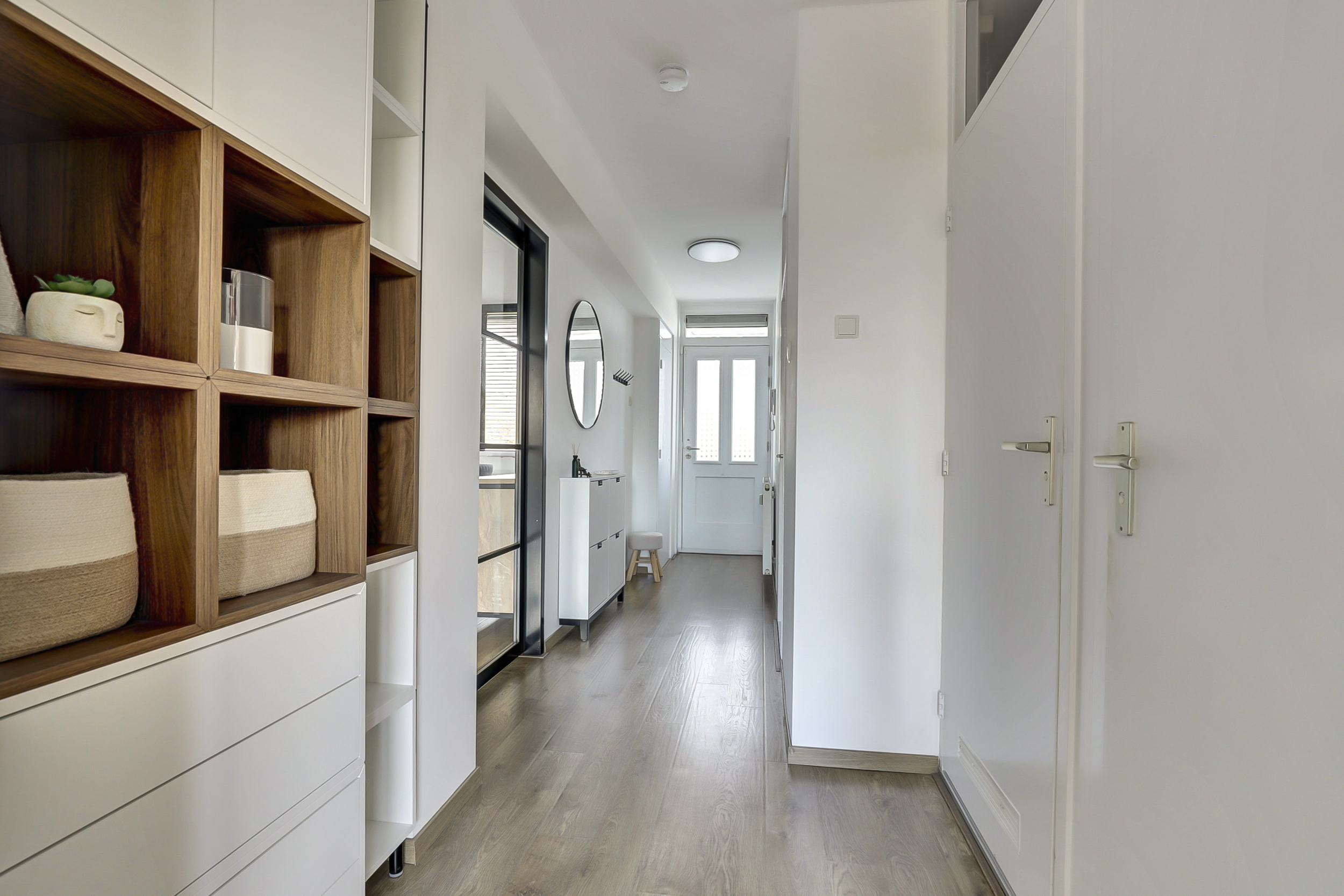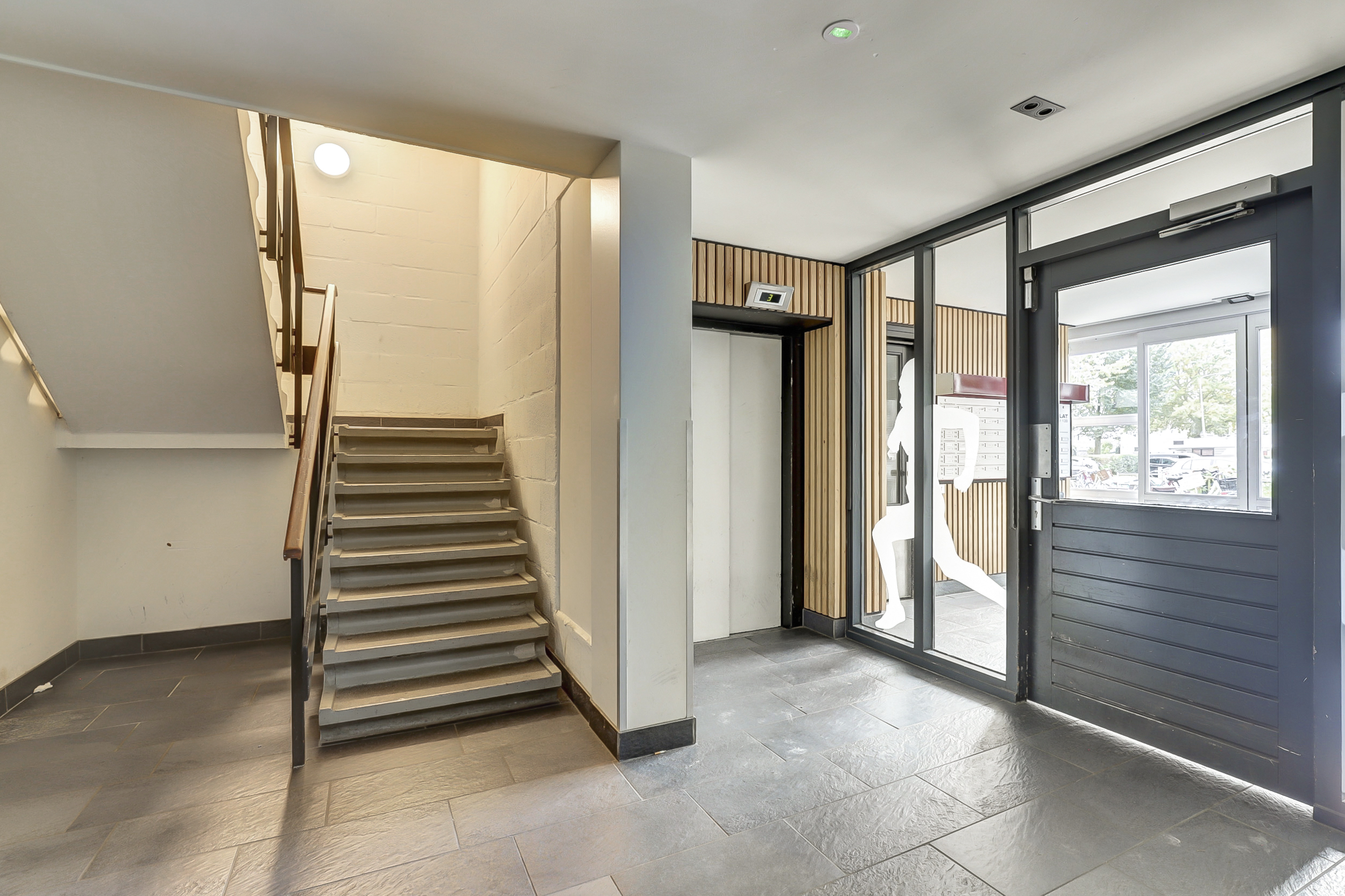 Bij aankomst treft u een nette entree met lift en trappenhuis. De gemeenschappelijke hal is modern afgewerkt met lichte wanden, natuurstenen vloer en houtaccenten, wat zorgt voor een warme uitstraling. Buiten is er veel groen, een speelveld en speeltoestellen — ideaal voor gezinnen of om rustig te ontspannen.