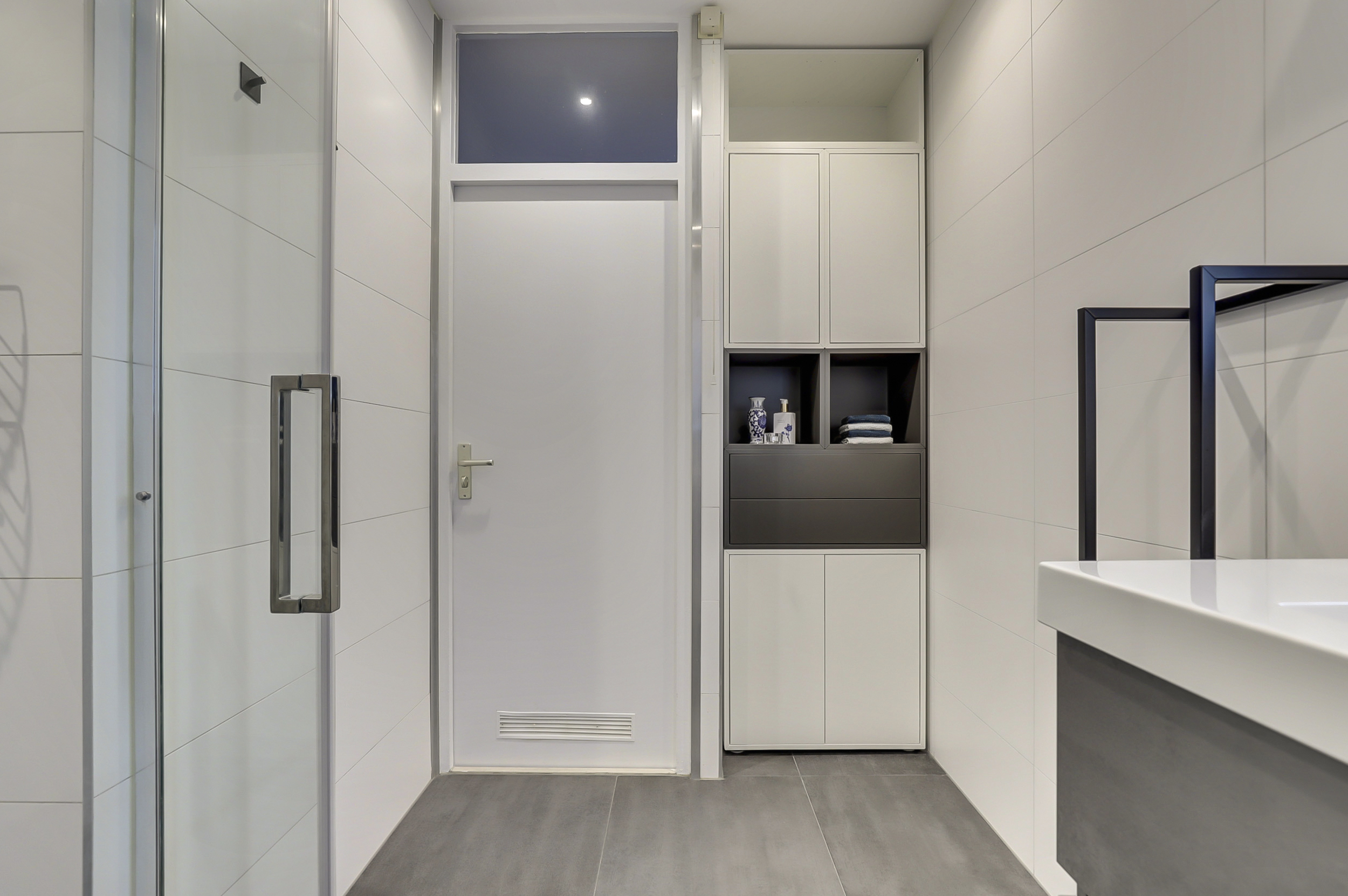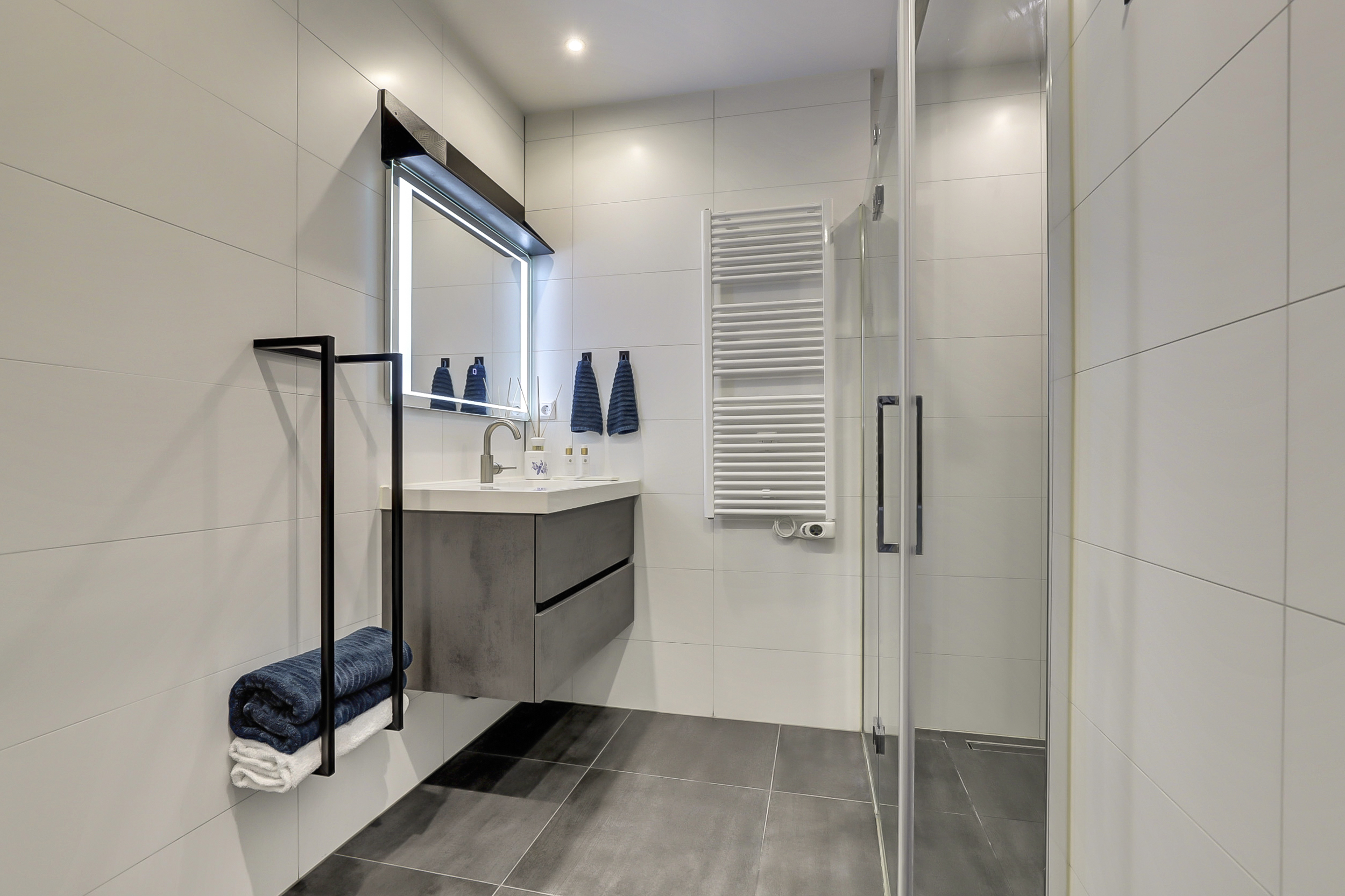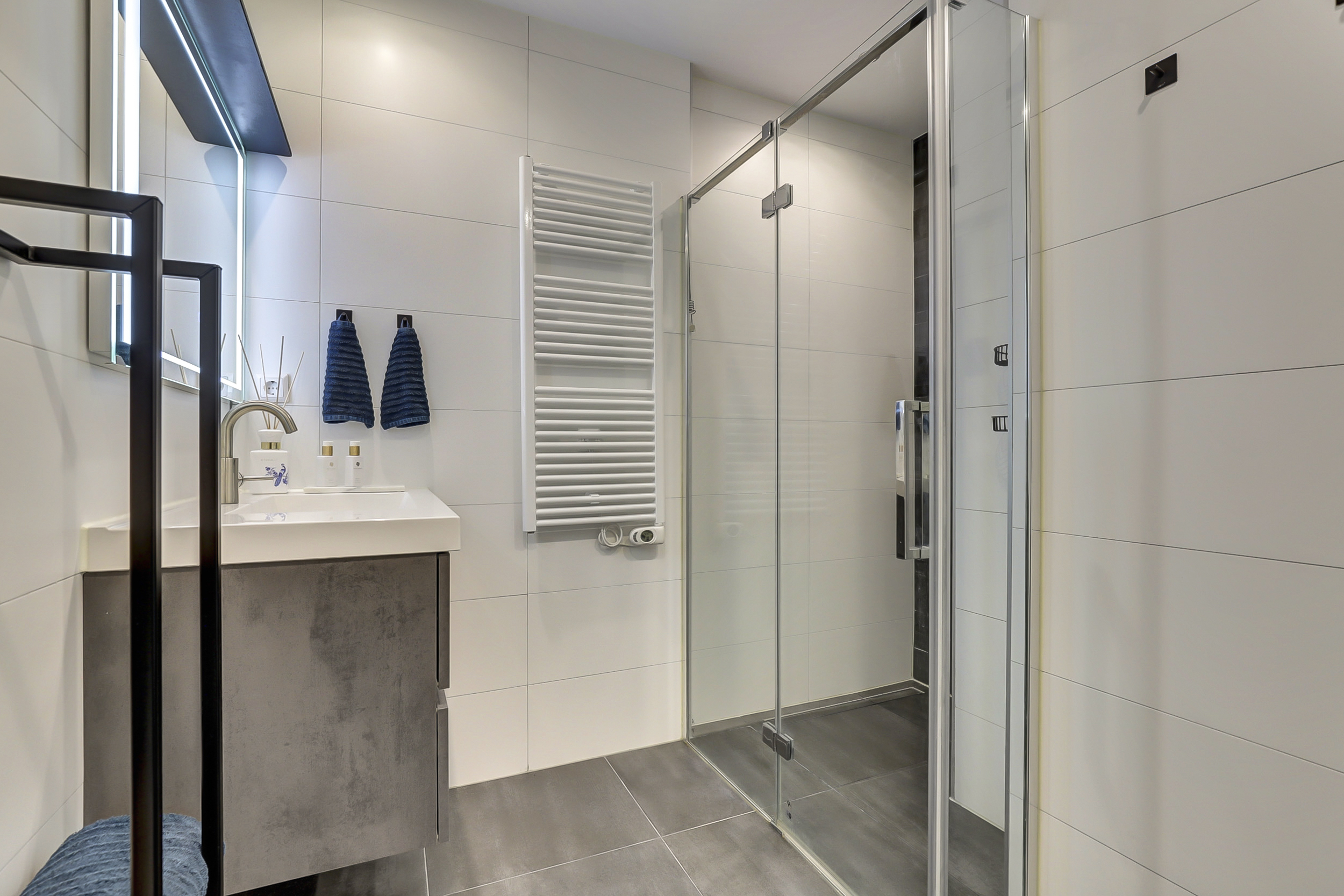 De badkamer is stijlvol gerenoveerd en voorzien van een ruime inloopdouche met glazen deur, modern wastafelmeubel en handdoekradiator. Het toilet is separaat en uitgevoerd in dezelfde frisse stijl. Dankzij de airconditioning is het ook tijdens warme zomers aangenaam wonen.