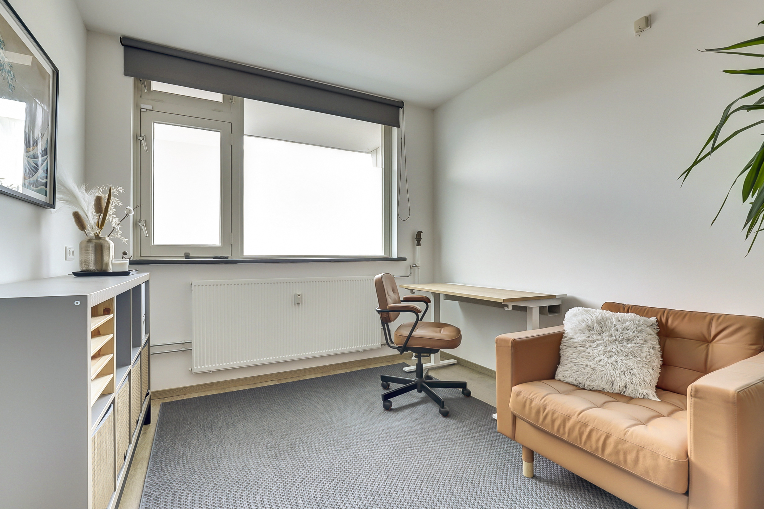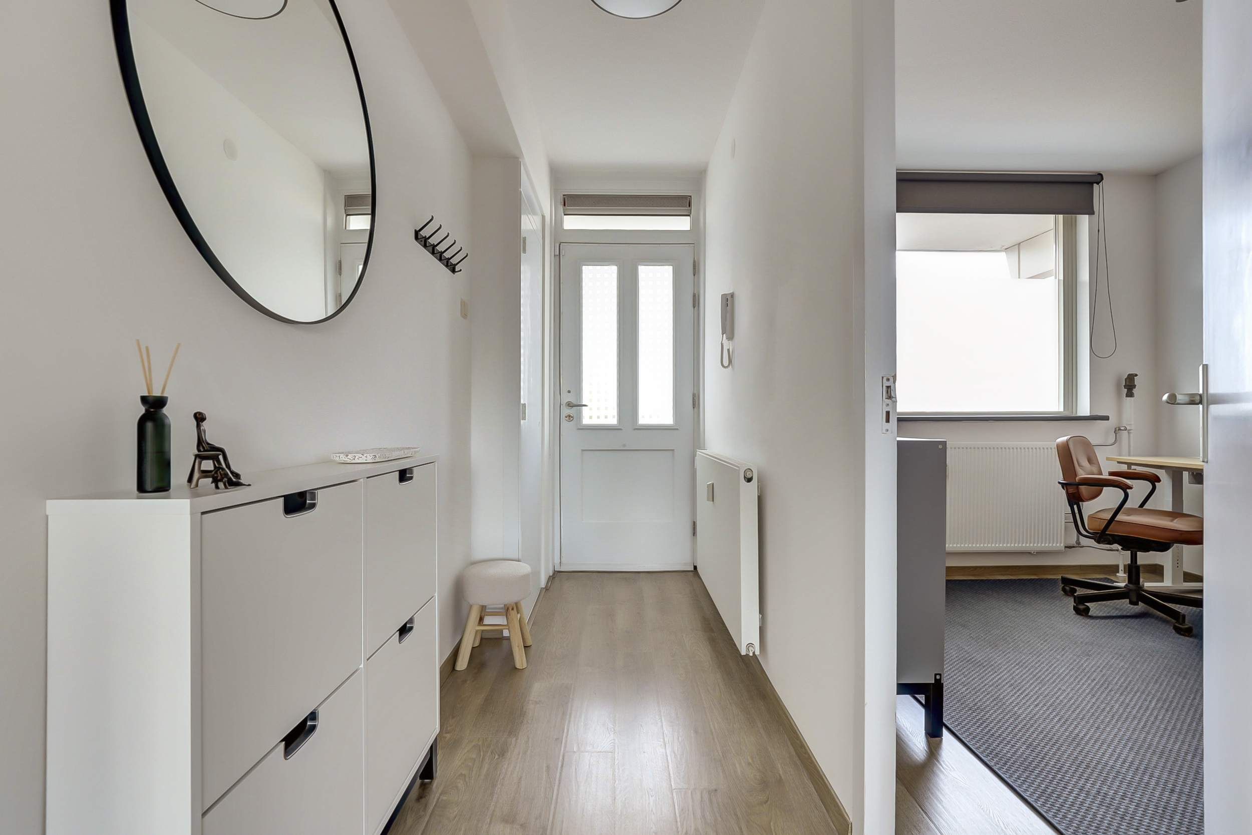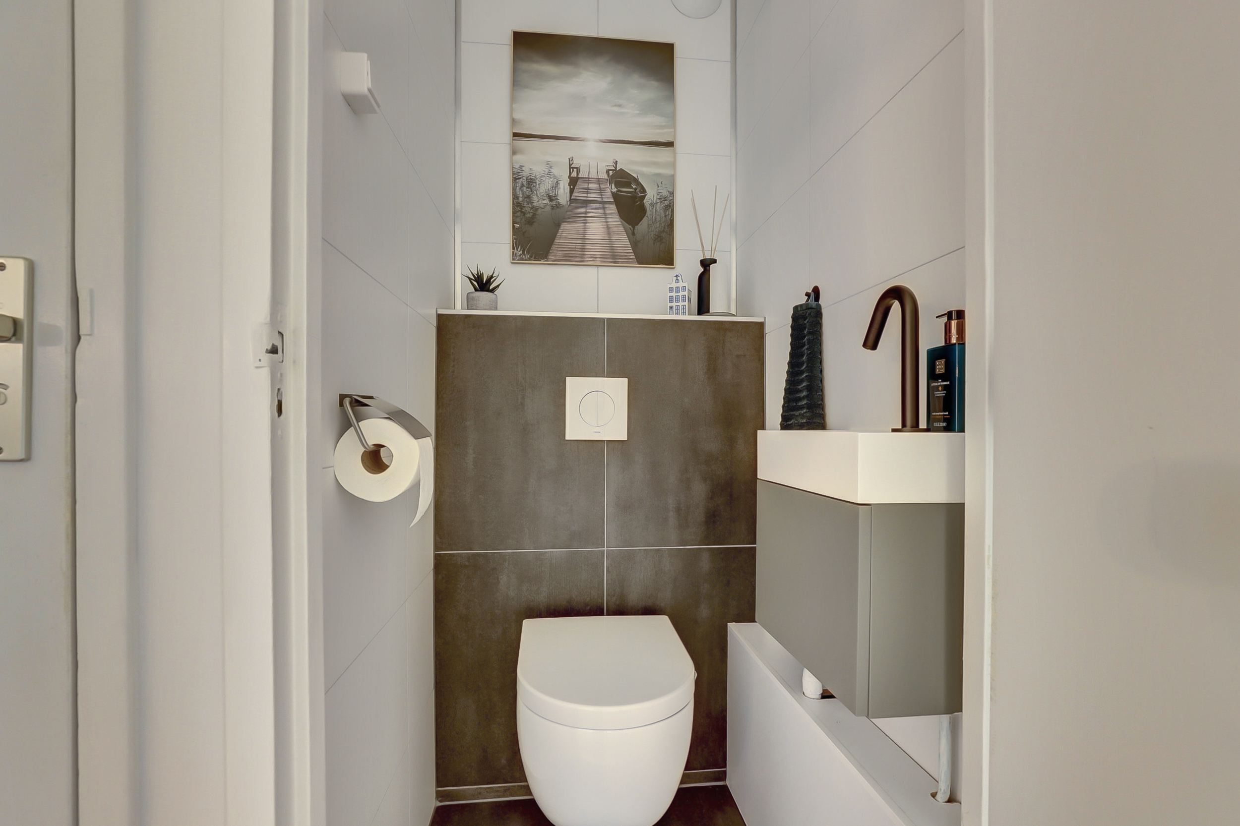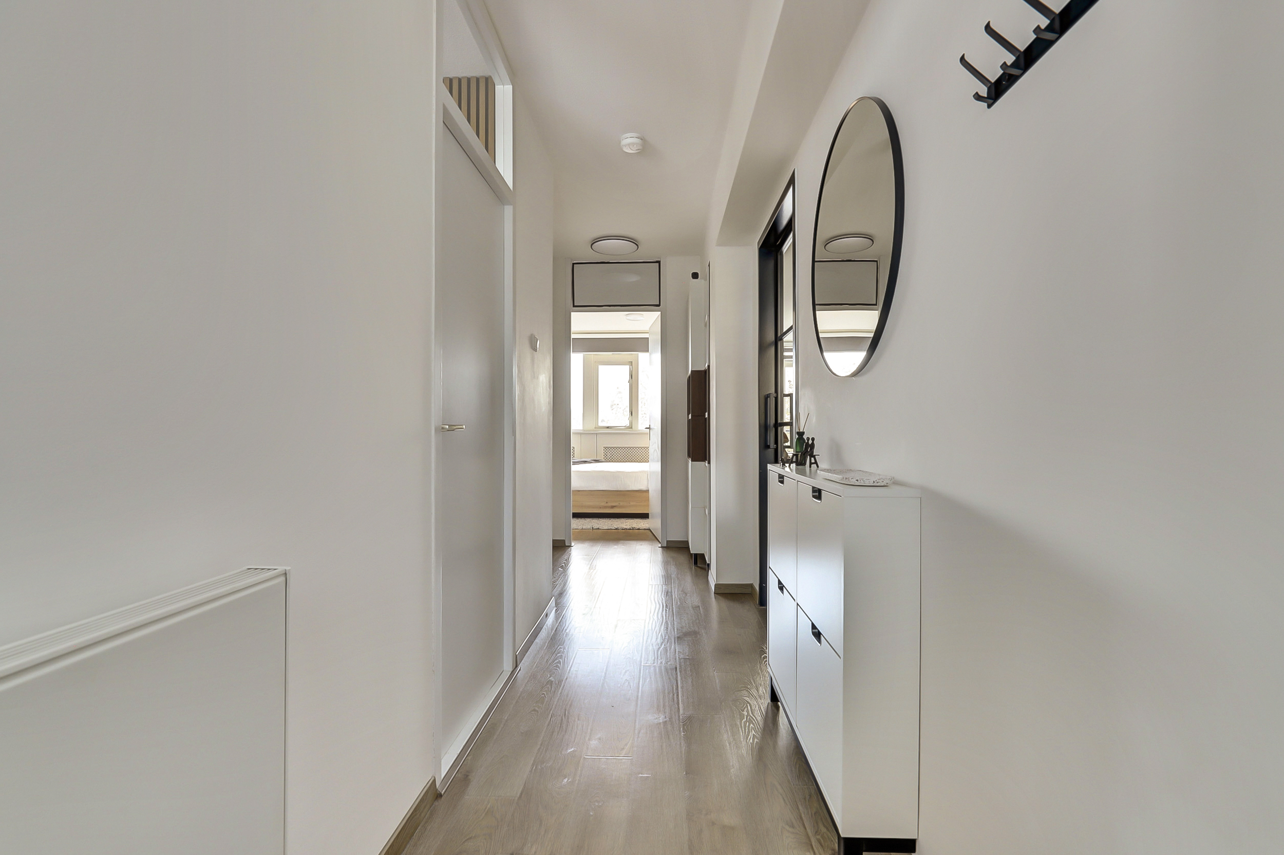 De badkamer is stijlvol gerenoveerd en voorzien van een ruime inloopdouche met glazen deur, modern wastafelmeubel en handdoekradiator. Het toilet is separaat en uitgevoerd in dezelfde frisse stijl. Dankzij de airconditioning is het ook tijdens warme zomers aangenaam wonen.