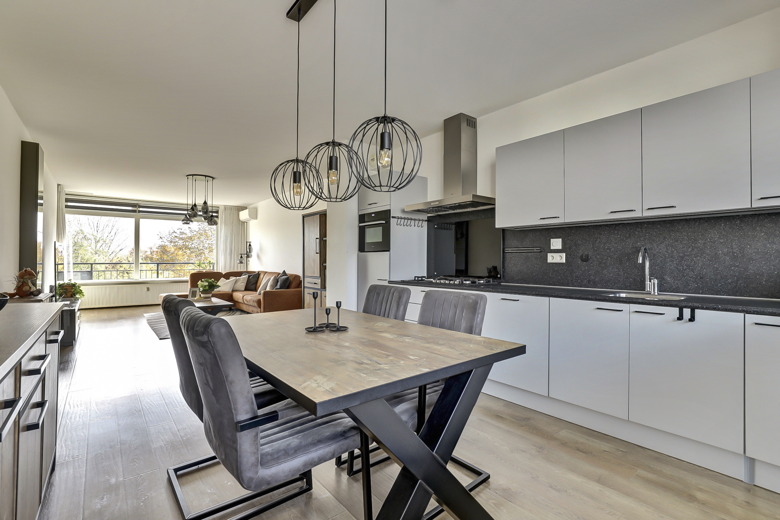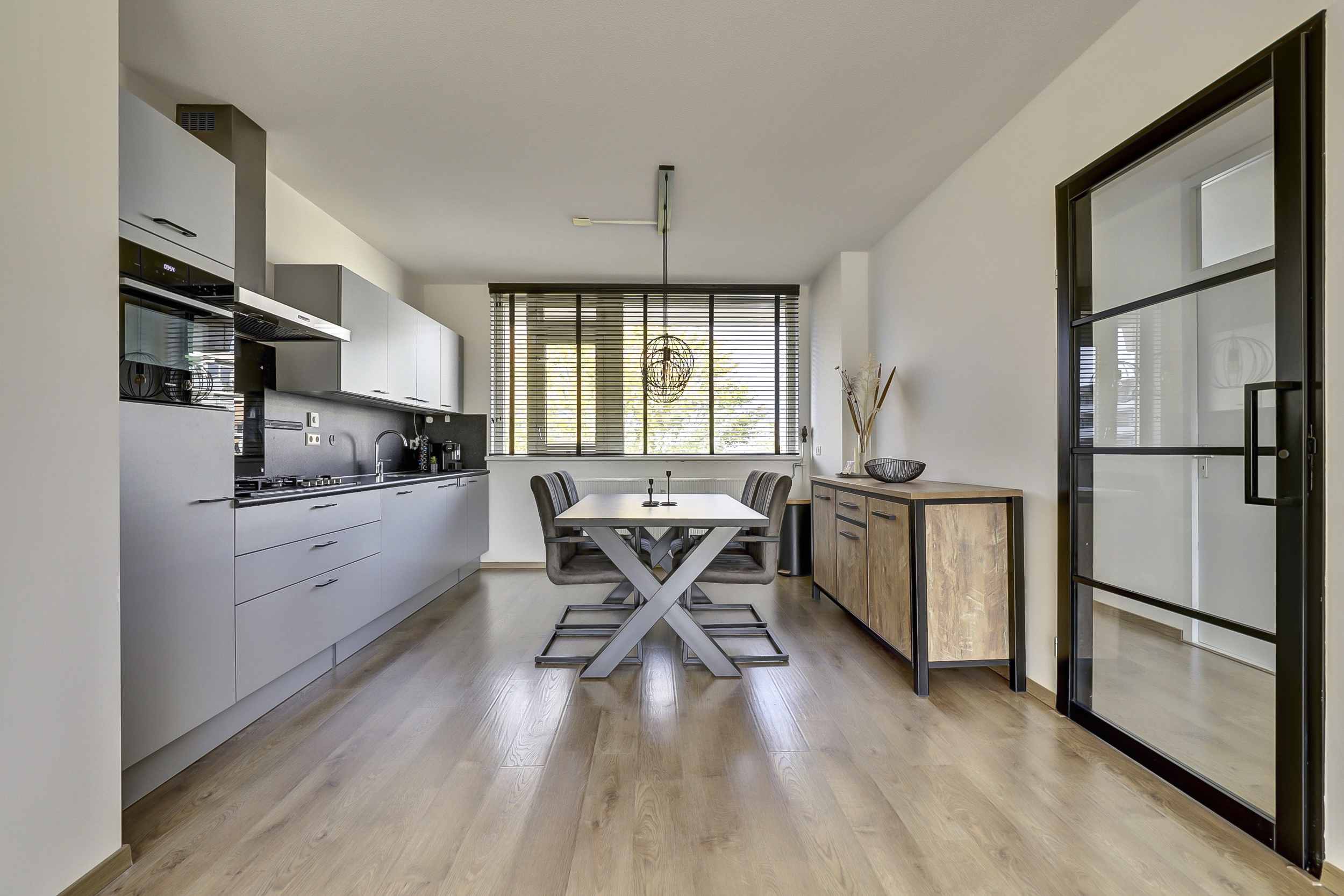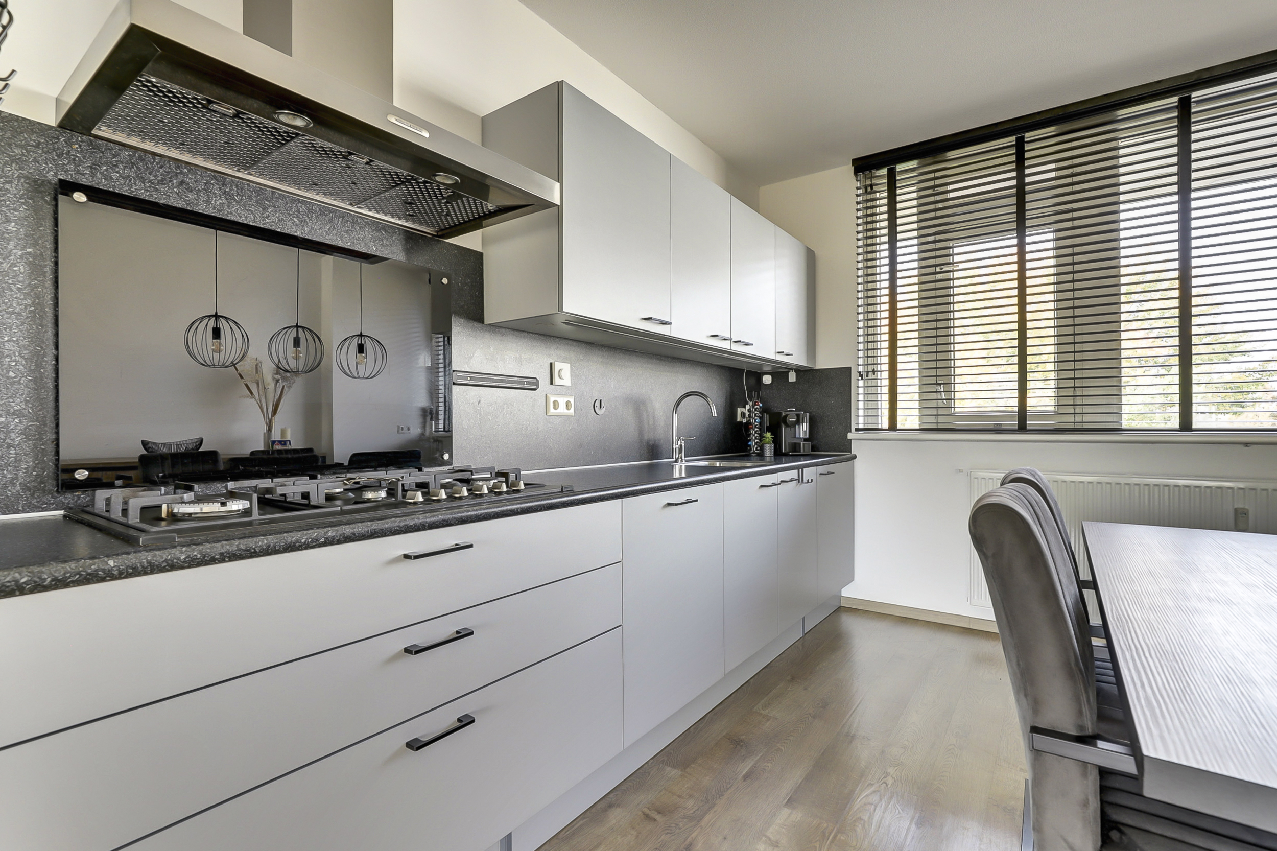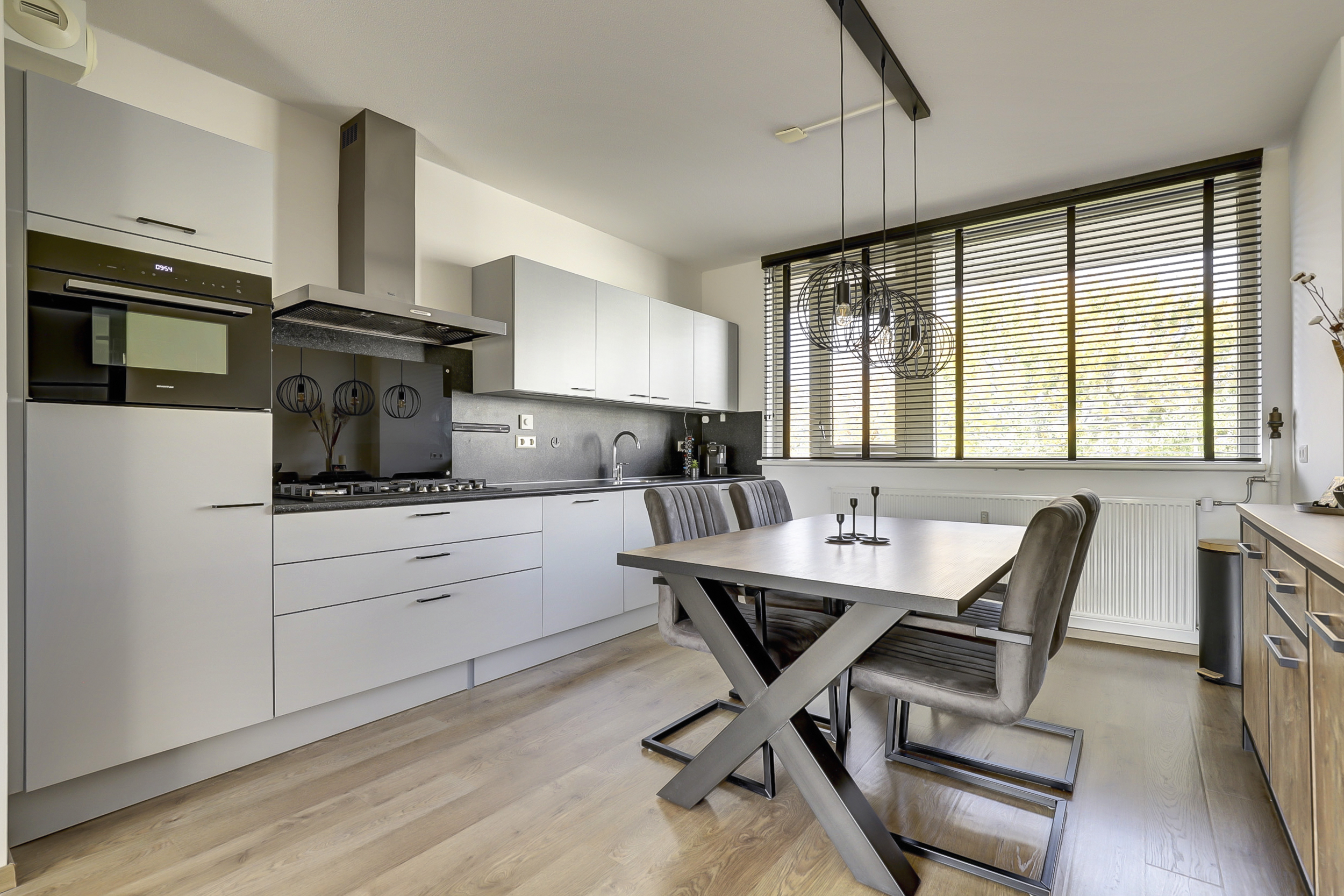 De open keuken heeft een eigentijdse uitstraling en is voorzien van diverse inbouwapparatuur, waaronder een gaskookplaat met afzuigkap, combi-oven/magnetron, koelkast en vaatwasser. De lichte grijstinten en het donkere werkblad geven de keuken een moderne look, en de eethoek bij het raam maakt dit een prettige leefruimte.