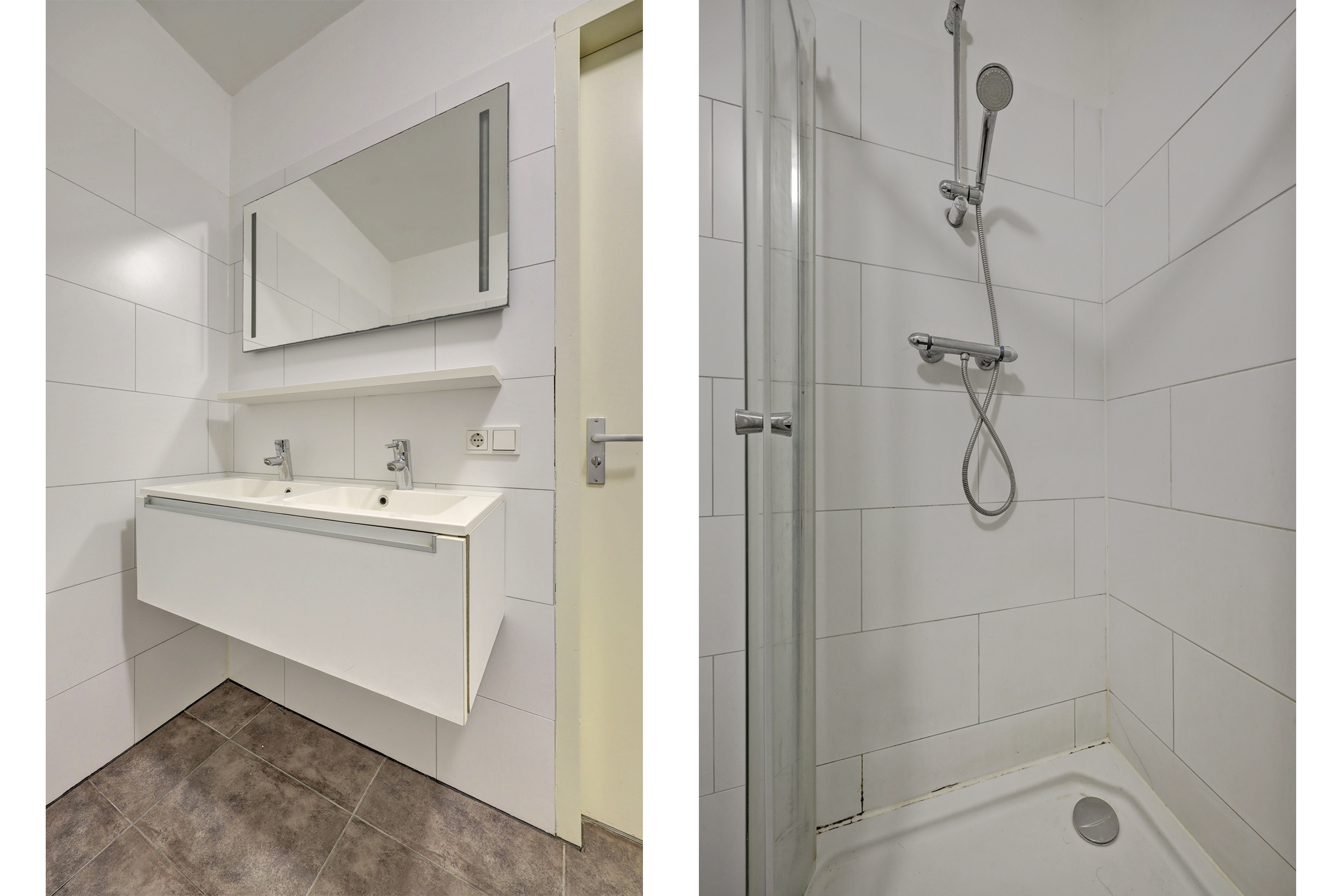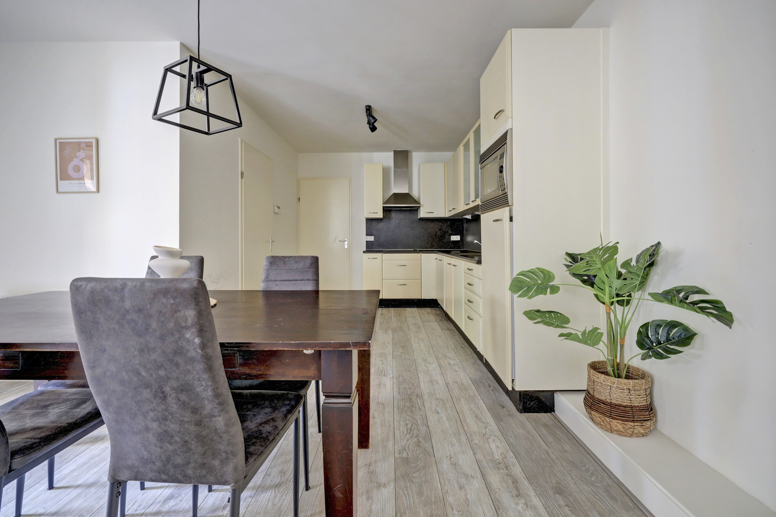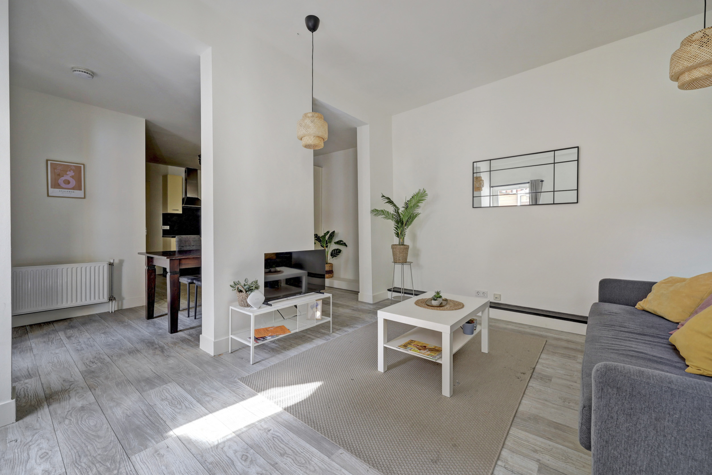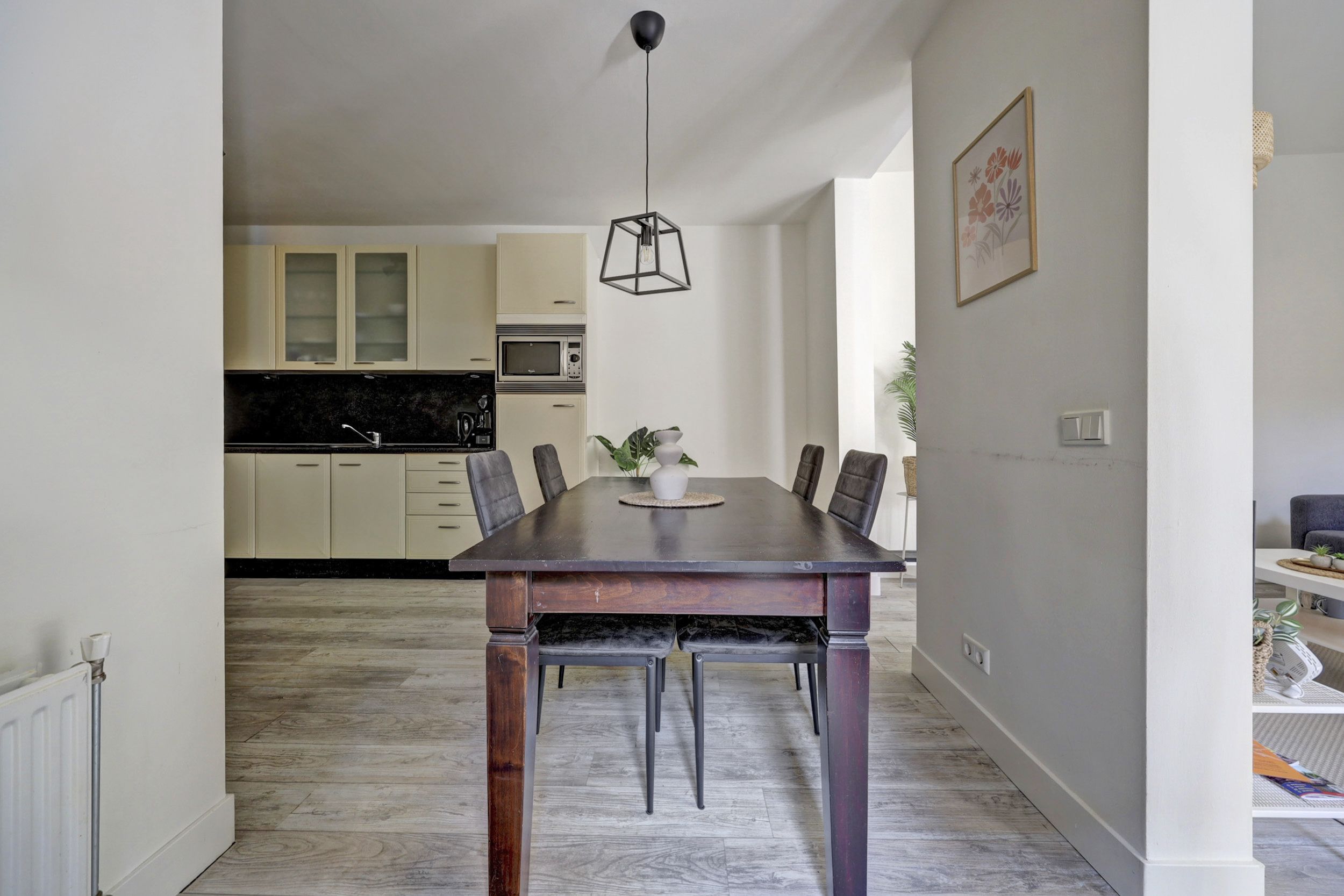 De woning beschikt over een praktische en speelse indeling. De ruime woonkamer van 28 vierkante meter is verbonden met de eetkamer door een luchtige scheidingsmuur, wat zorgt voor een open en gezellige sfeer. Hier geniet u van veel lichtinval dankzij de hoge ramen. De moderne keuken in L-opstelling is uitgerust met inbouwapparatuur en biedt voldoende werk- en opbergruimte. De slaapkamer is rustig gelegen en stijlvol afgewerkt, ideaal voor een goede nachtrust. De badkamer is modern en voorzien van een dubbele wastafel, een apart toilet en een eigentijdse douche.
