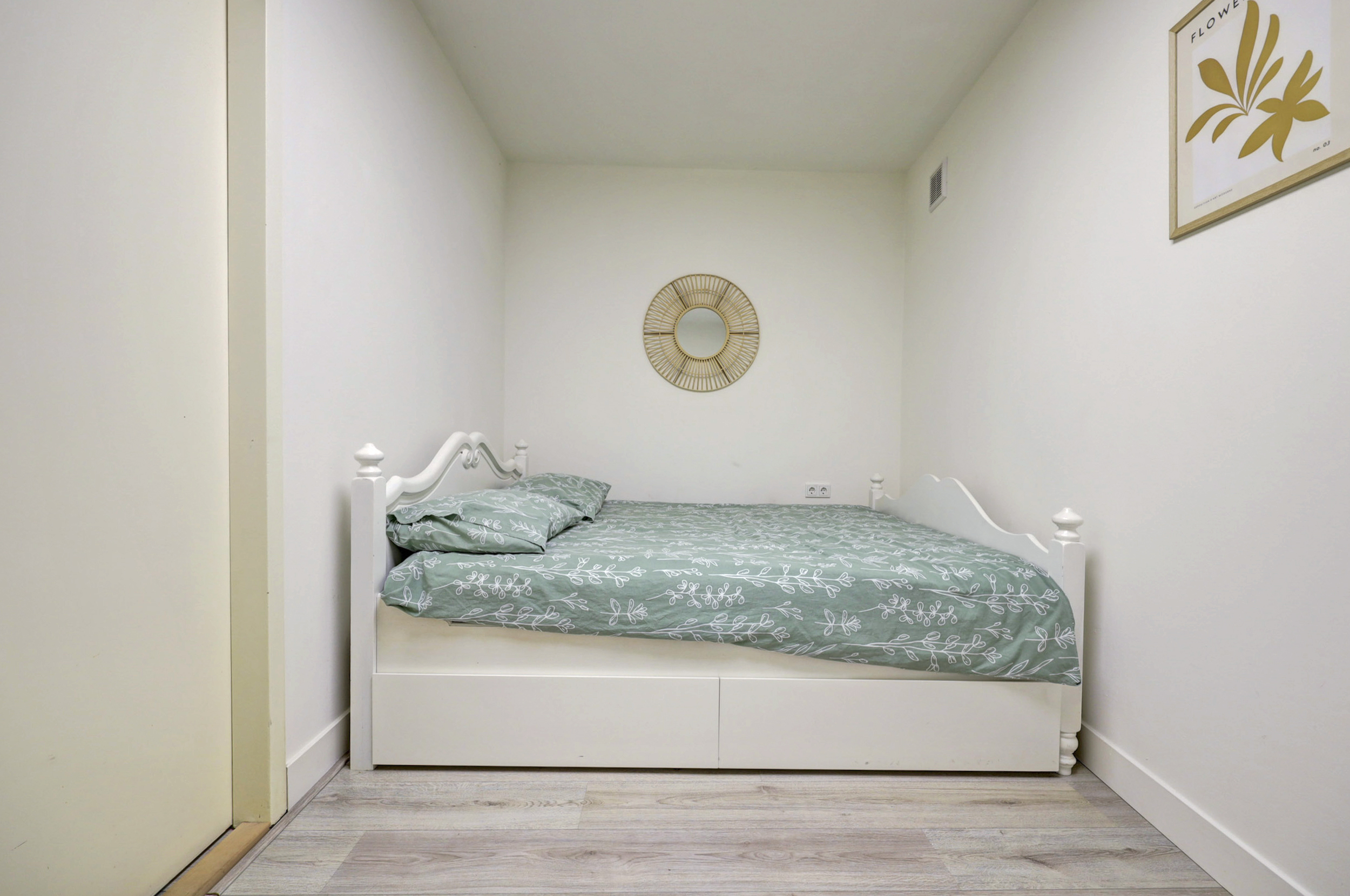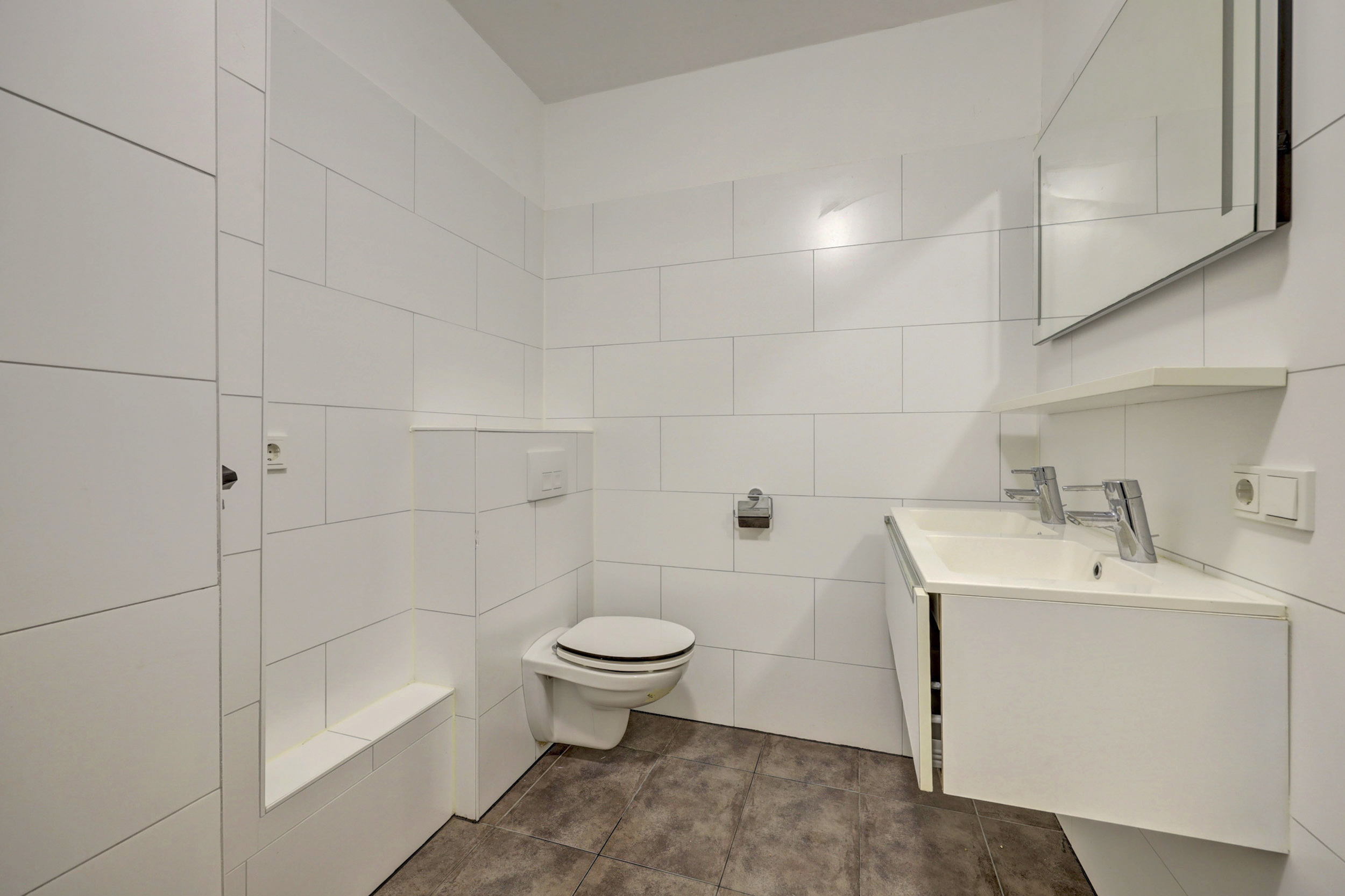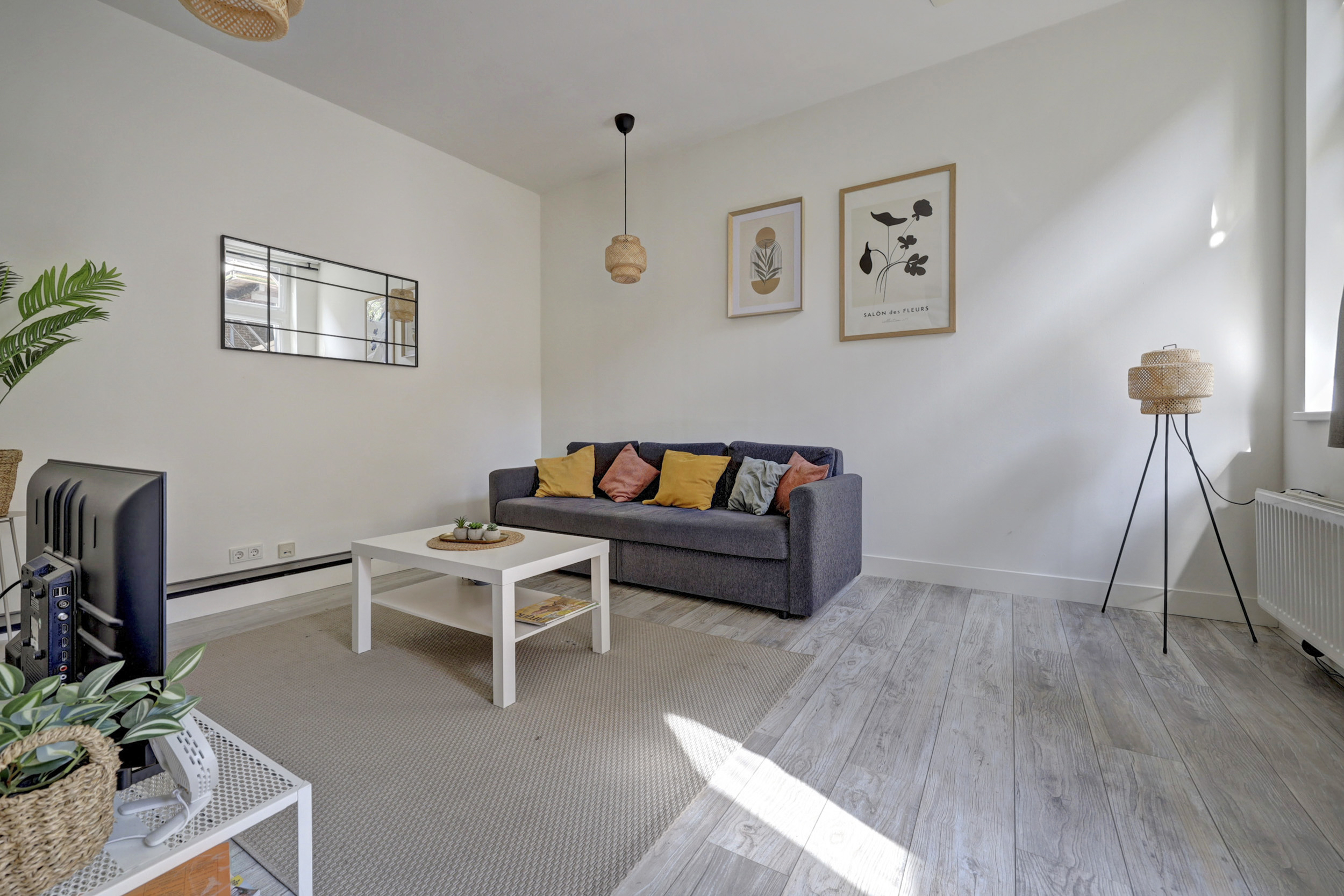 De woning beschikt over een praktische en speelse indeling. De ruime woonkamer van 28 vierkante meter is verbonden met de eetkamer door een luchtige scheidingsmuur, wat zorgt voor een open en gezellige sfeer. Hier geniet u van veel lichtinval dankzij de hoge ramen. De moderne keuken in L-opstelling is uitgerust met inbouwapparatuur en biedt voldoende werk- en opbergruimte. De slaapkamer is rustig gelegen en stijlvol afgewerkt, ideaal voor een goede nachtrust. De badkamer is modern en voorzien van een dubbele wastafel, een apart toilet en een eigentijdse douche.