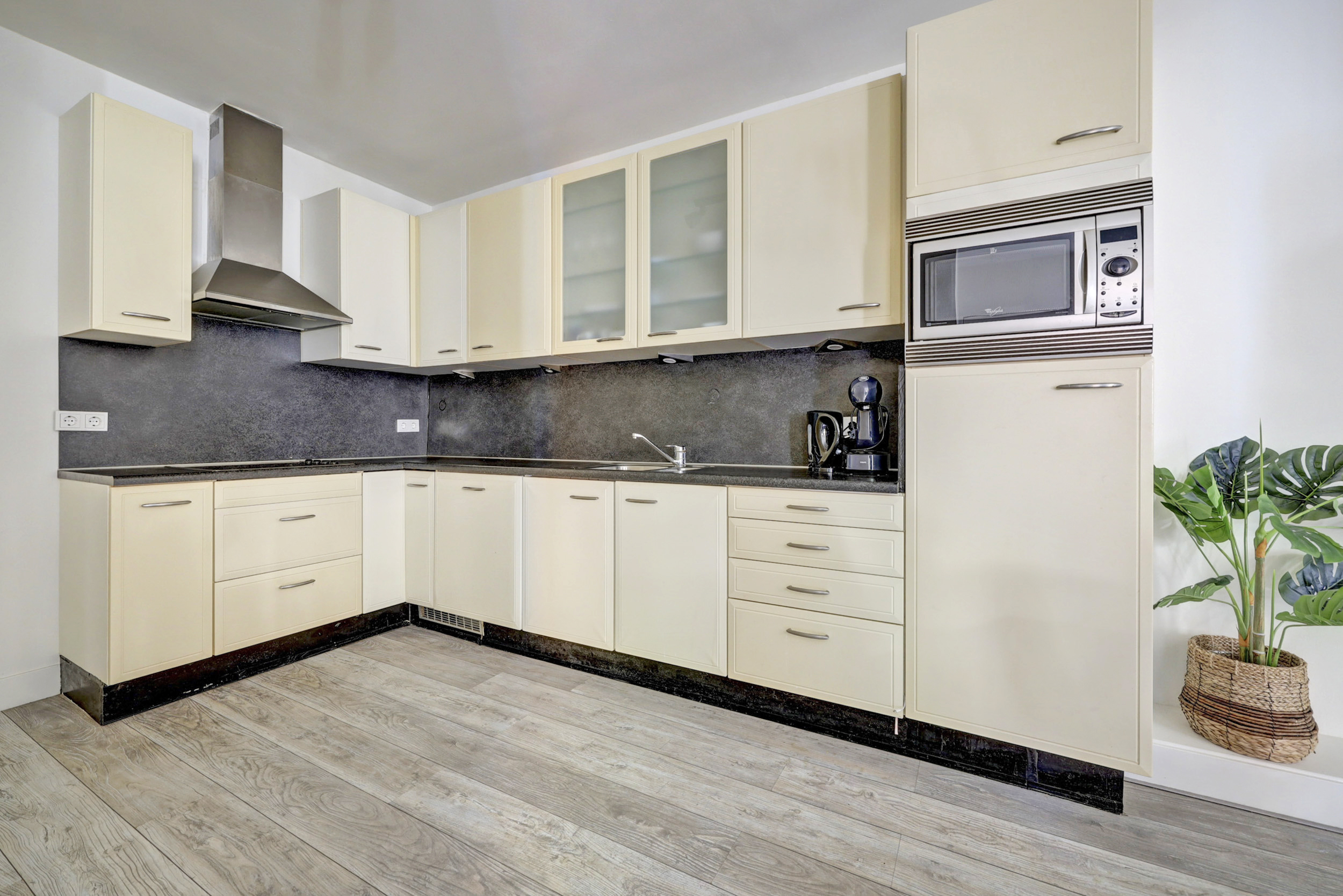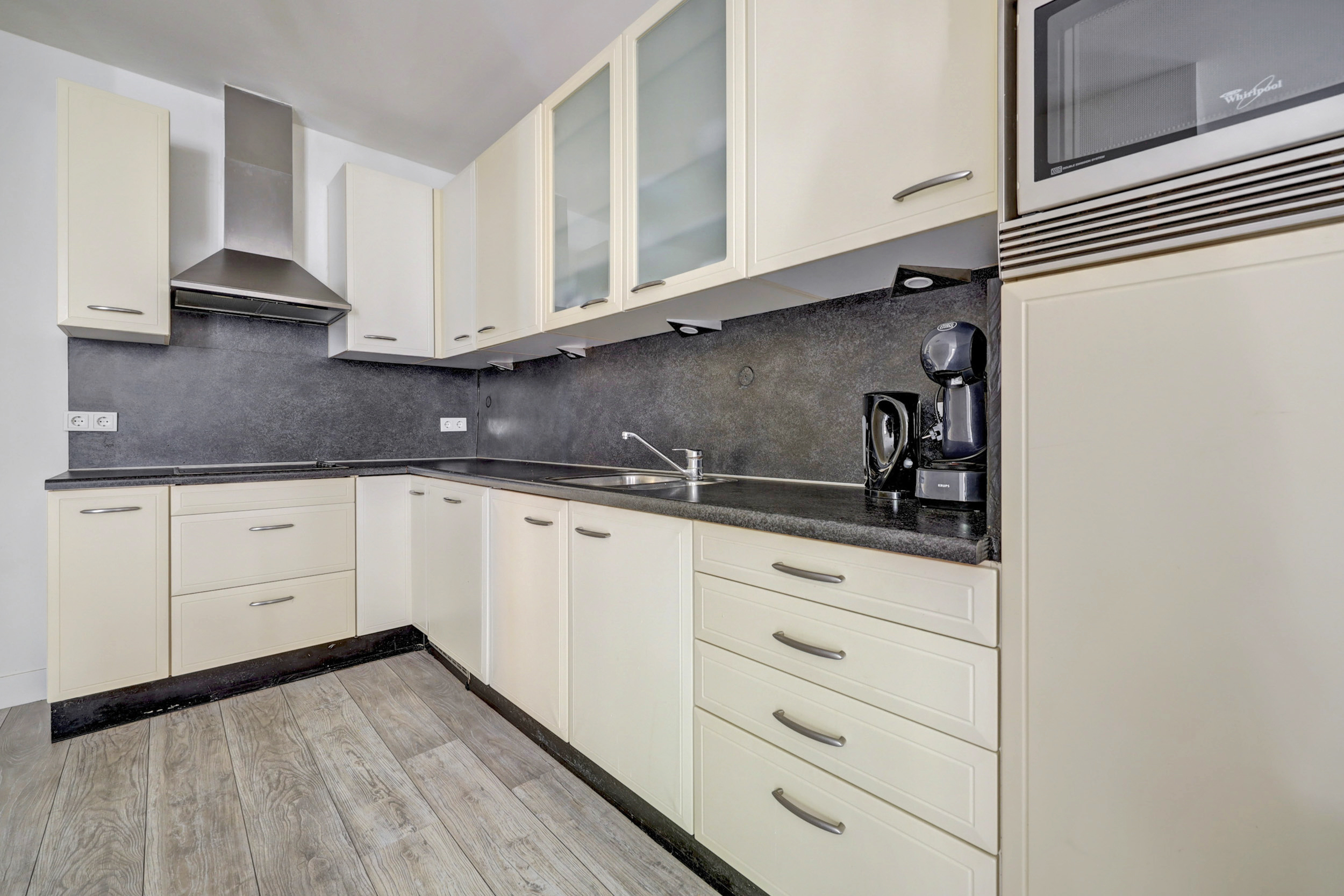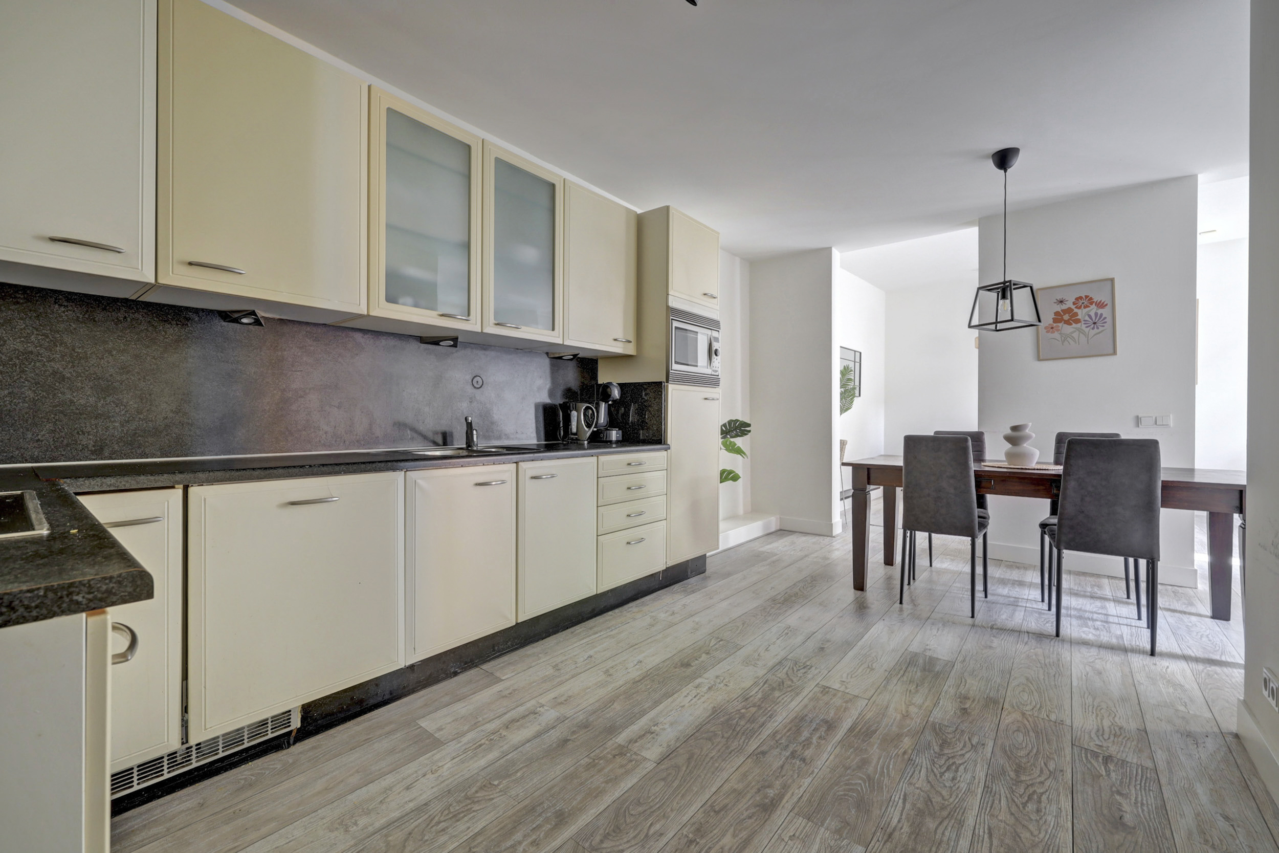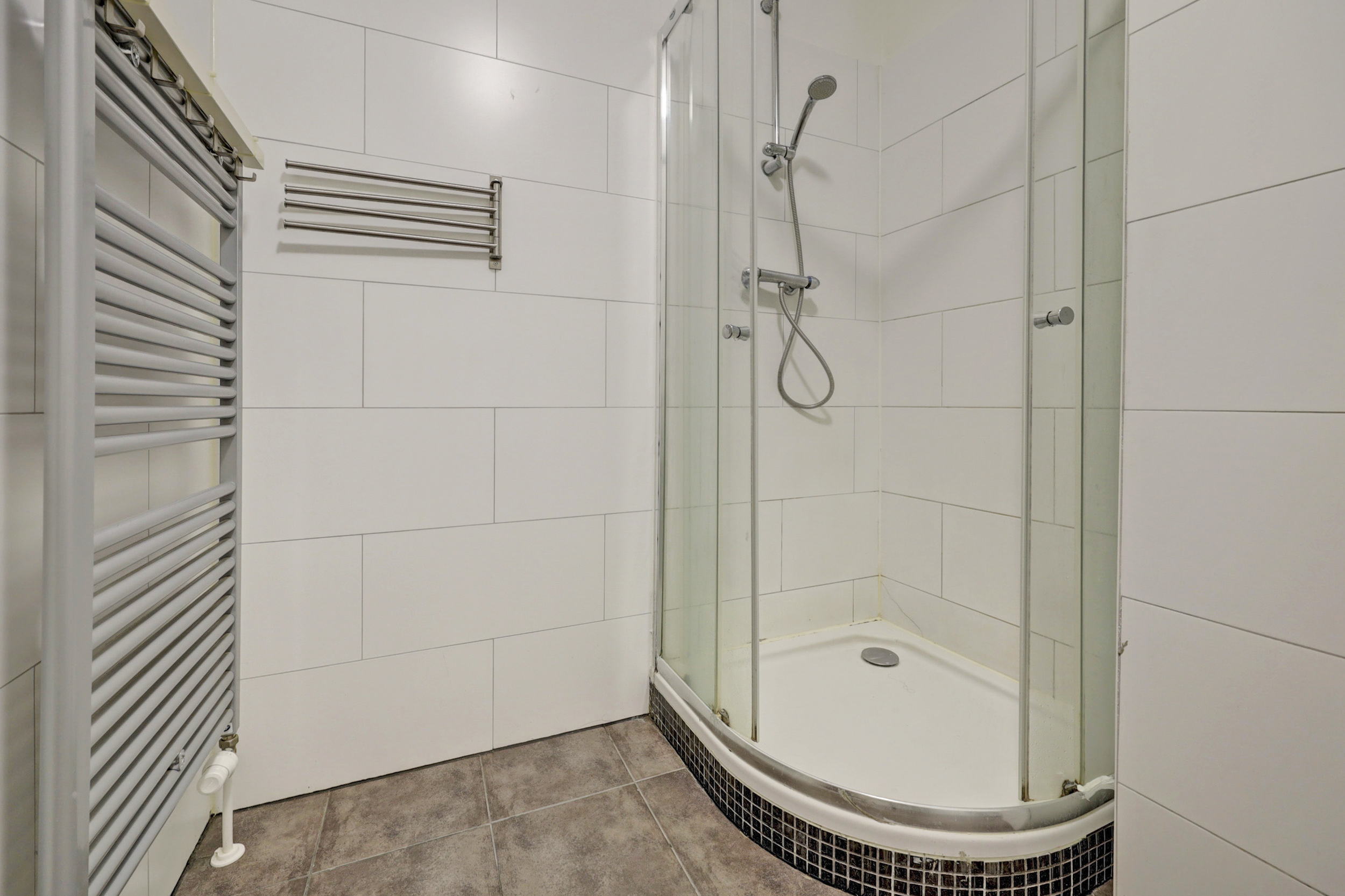 De woning beschikt over een praktische en speelse indeling. De ruime woonkamer van 28 vierkante meter is verbonden met de eetkamer door een luchtige scheidingsmuur, wat zorgt voor een open en gezellige sfeer. Hier geniet u van veel lichtinval dankzij de hoge ramen. De moderne keuken in L-opstelling is uitgerust met inbouwapparatuur en biedt voldoende werk- en opbergruimte. De slaapkamer is rustig gelegen en stijlvol afgewerkt, ideaal voor een goede nachtrust. De badkamer is modern en voorzien van een dubbele wastafel, een apart toilet en een eigentijdse douche.