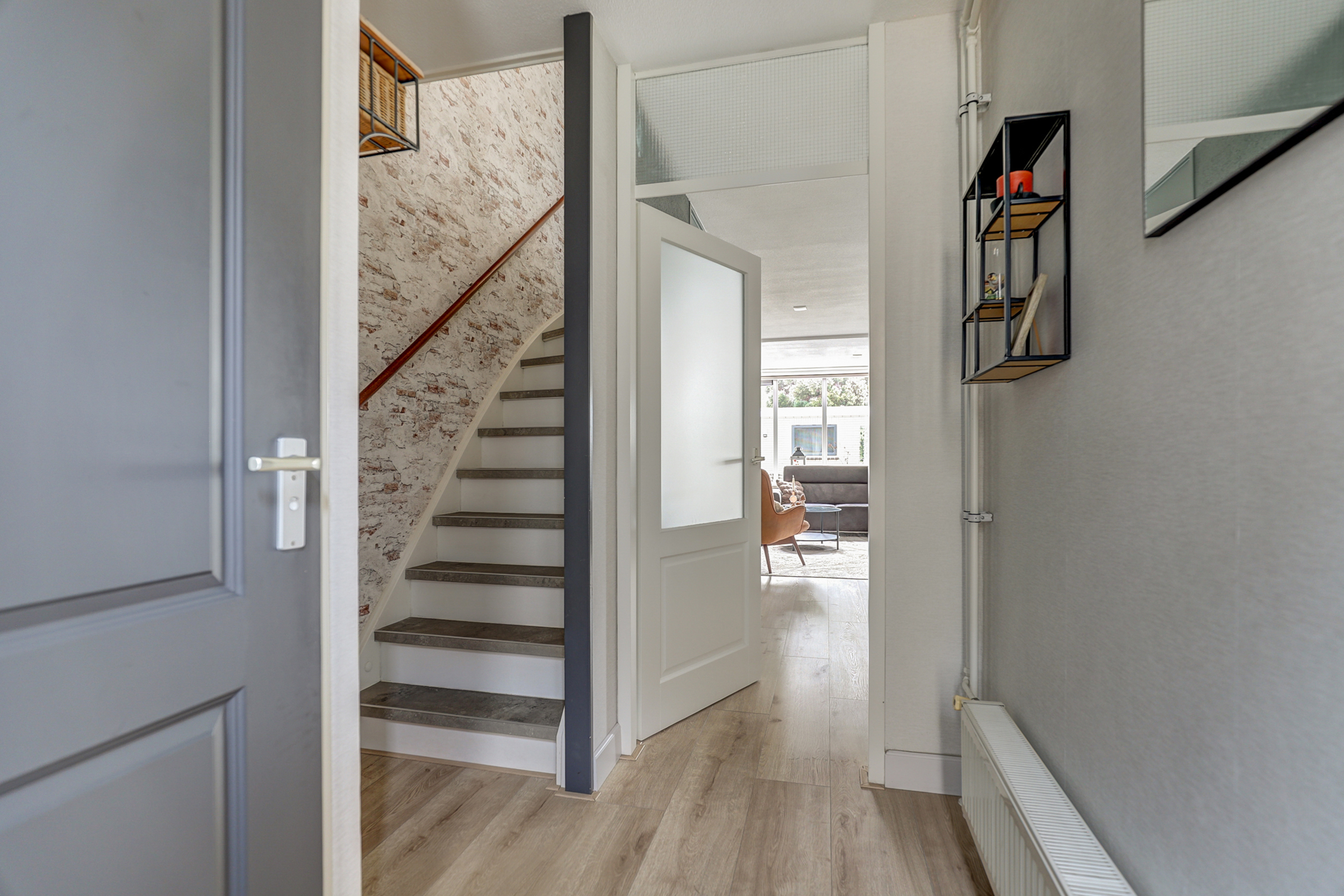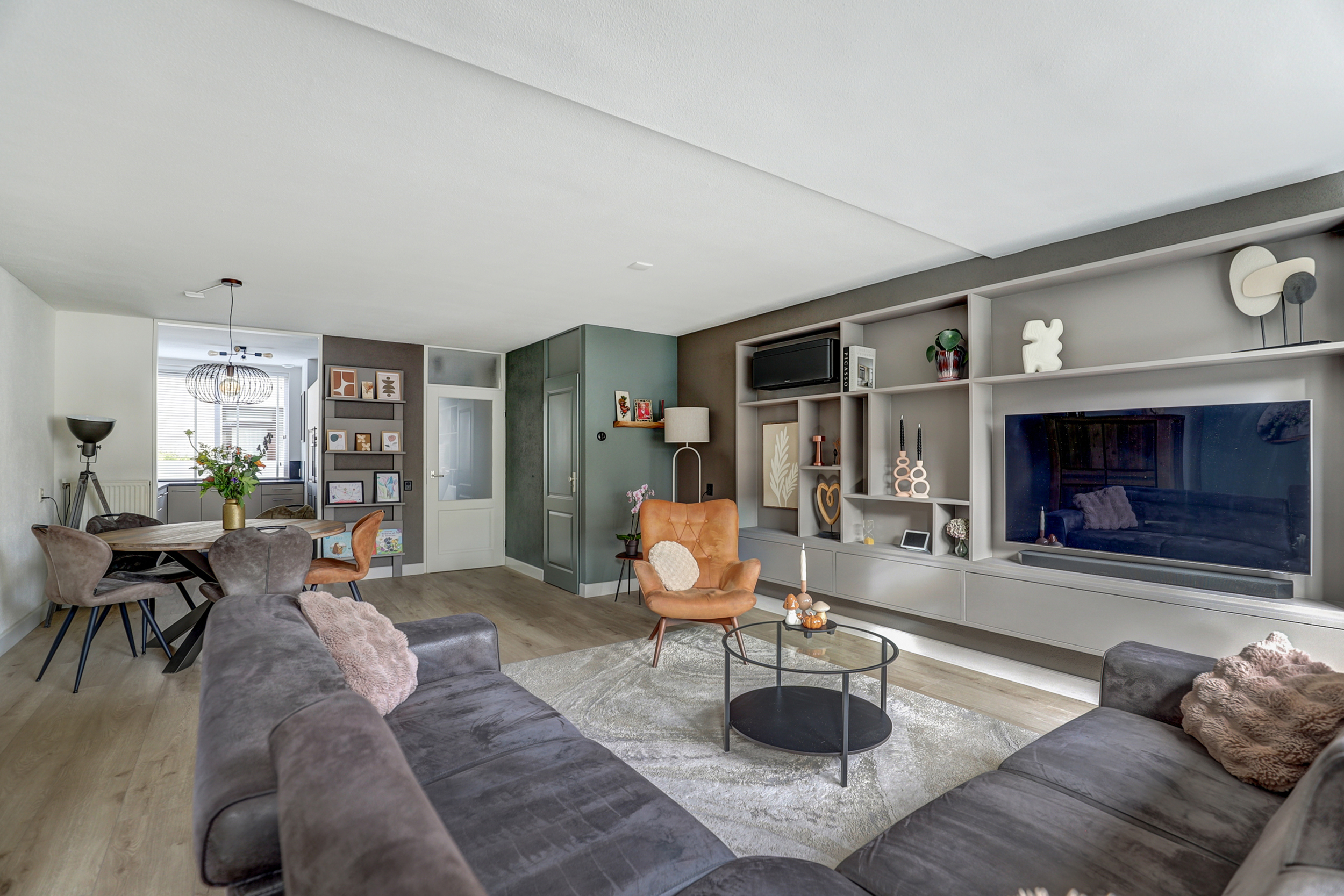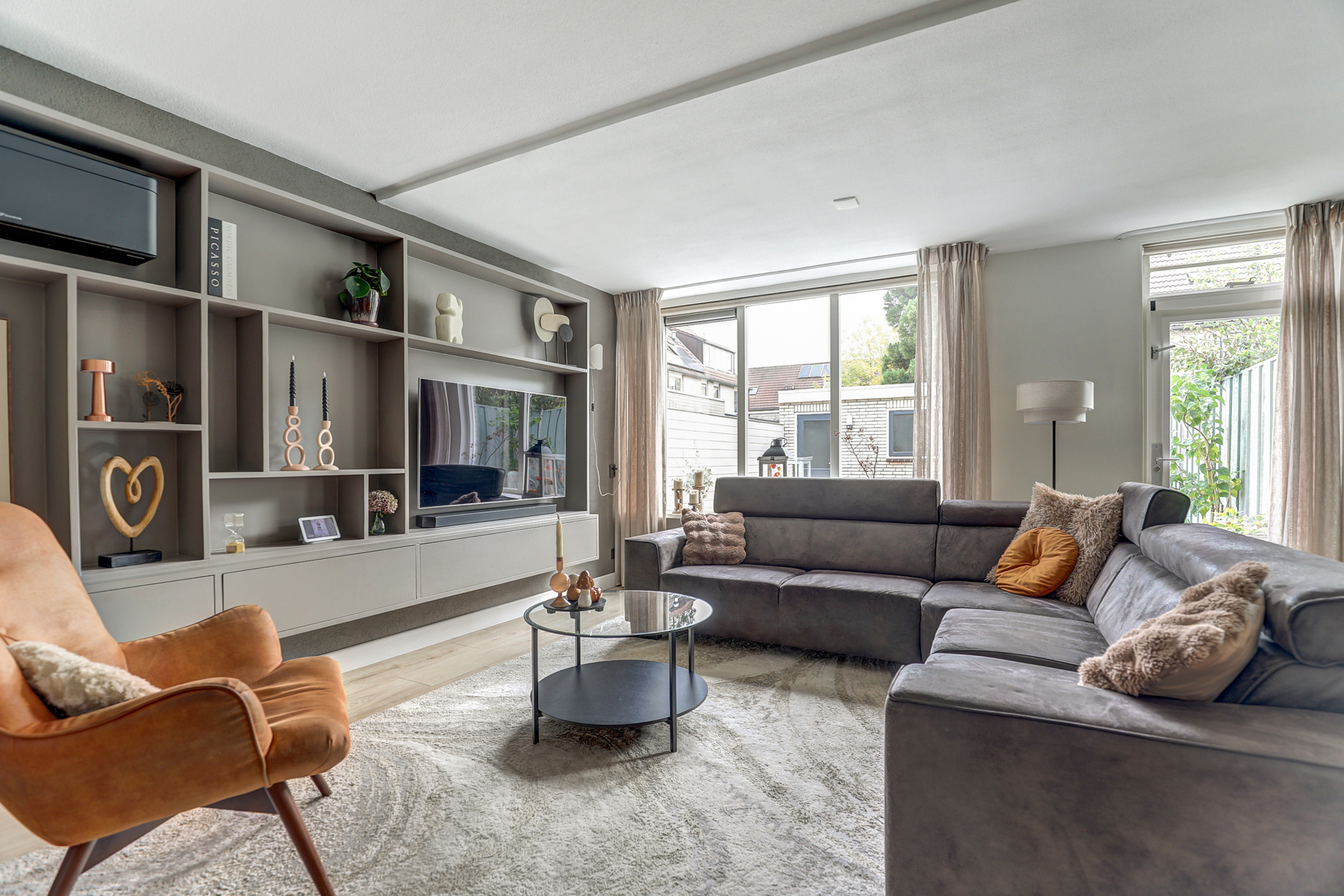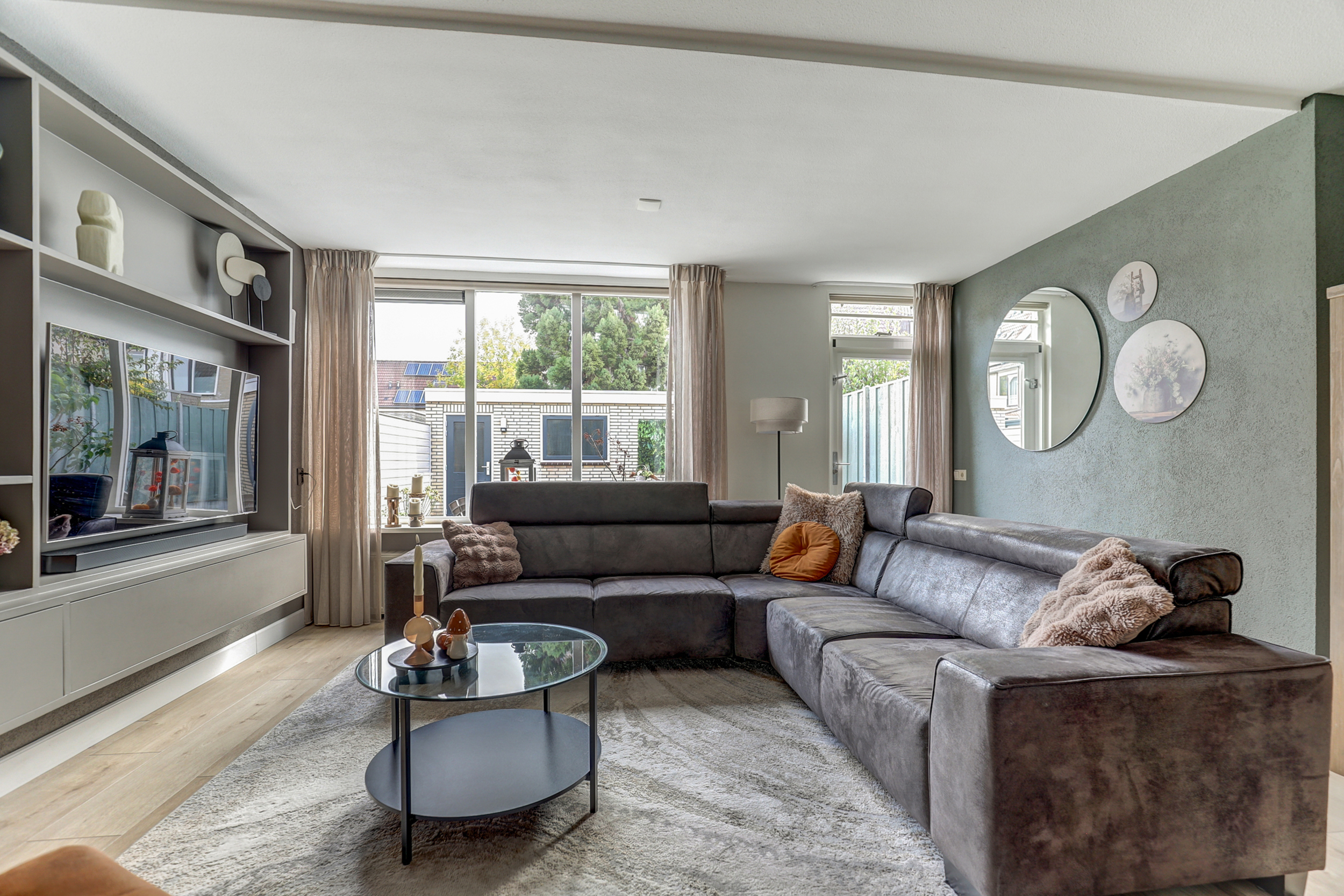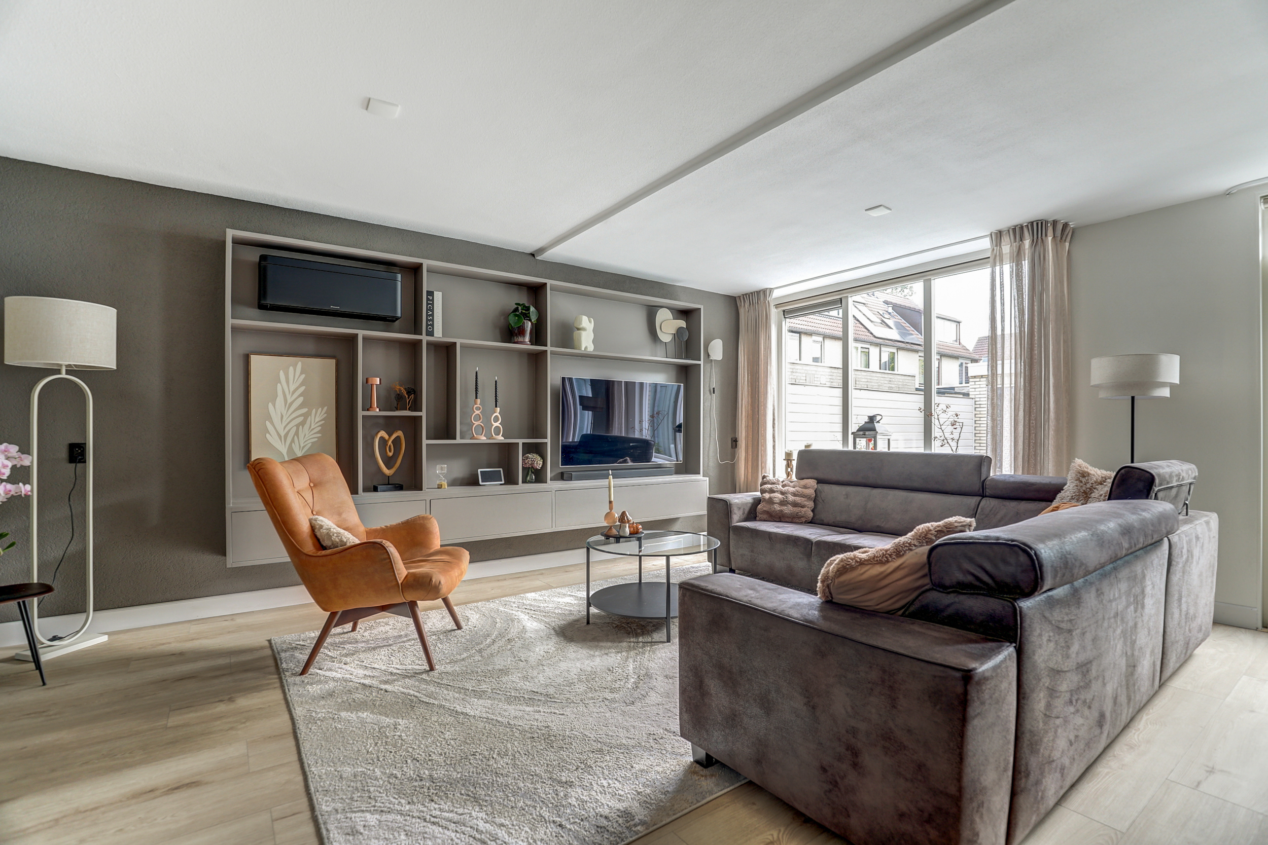 Entree, hal met meterkast, modern toilet en trapopgang naar de eerste verdieping. Via de hal komt u in de verrassend ruime woonkamer met een op maat gemaakt wandmeubel. De grote raampartijen richting de tuin en de strakke wandafwerking op de accentmuur zorgen voor een lichte, open uitstraling. De lichte laminaatvloer met houtnerf loopt drempelloos door, wat rust en eenheid geeft. De achtertuin is vanuit de woonkamer bereikbaar via een loopdeur.