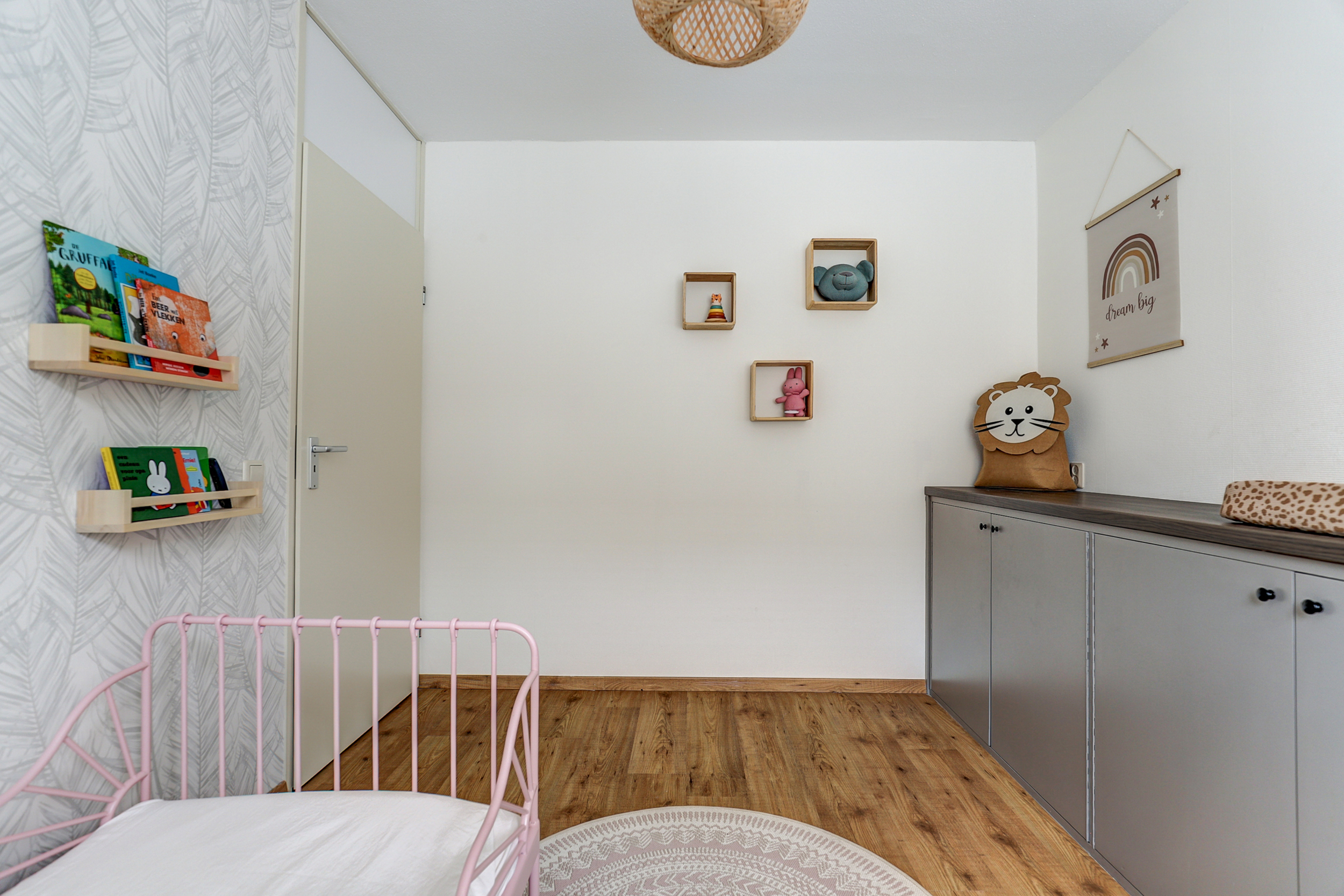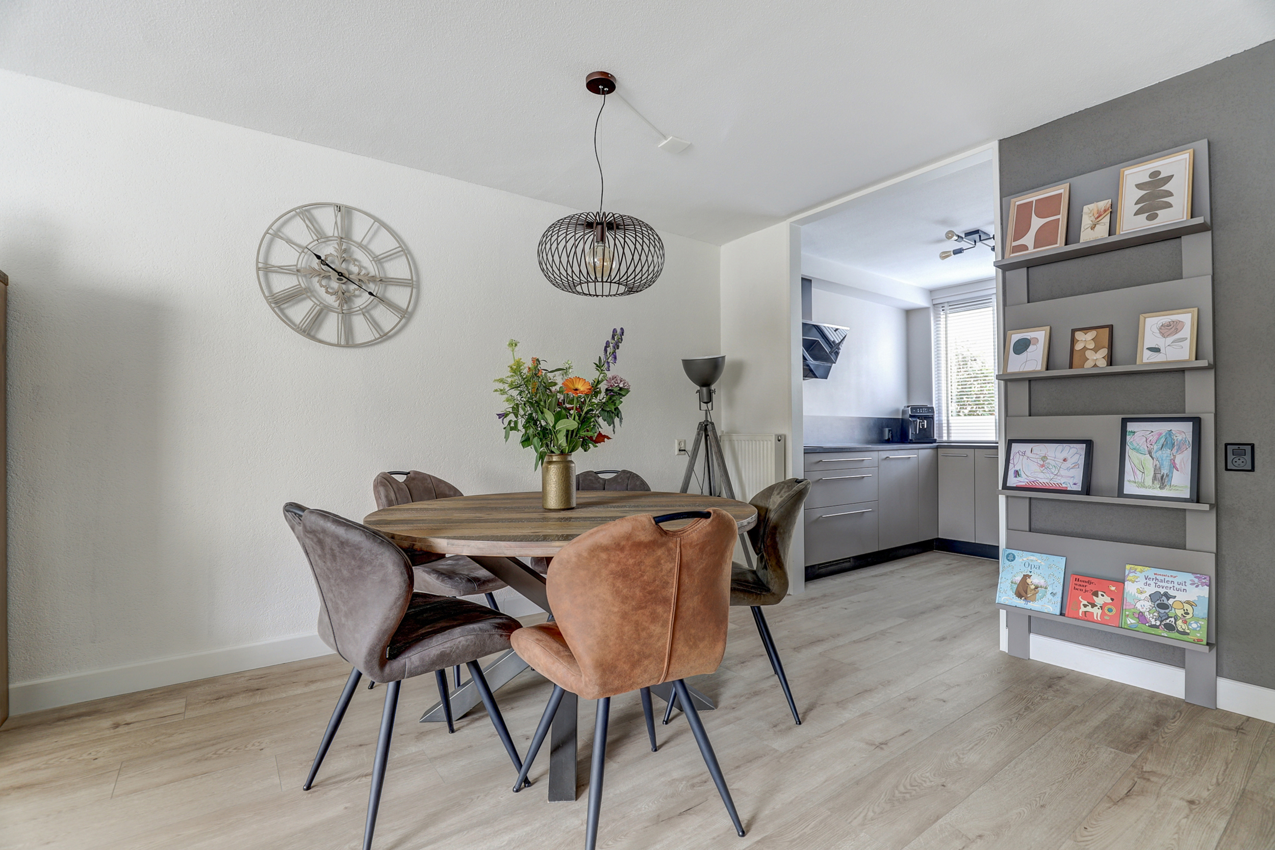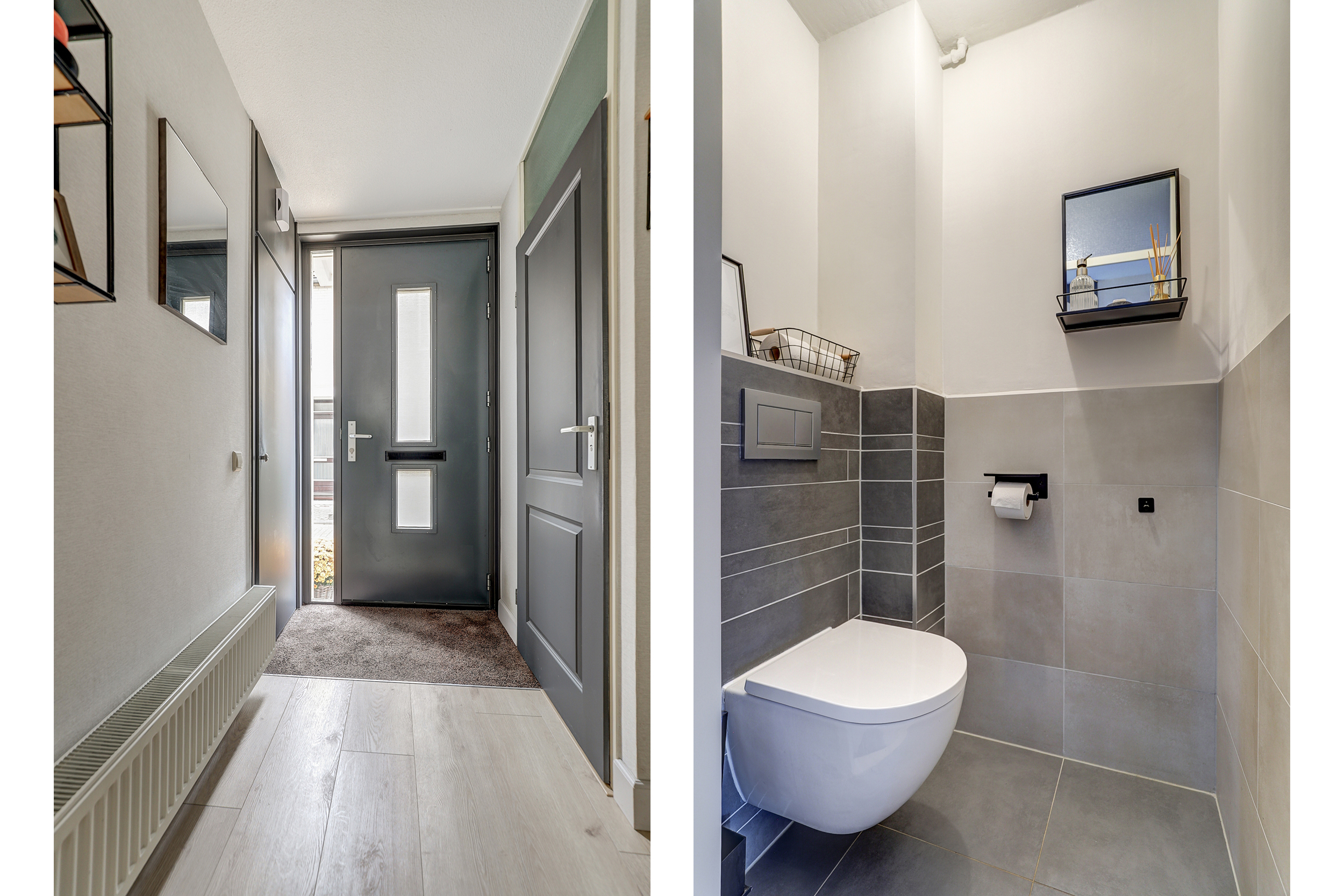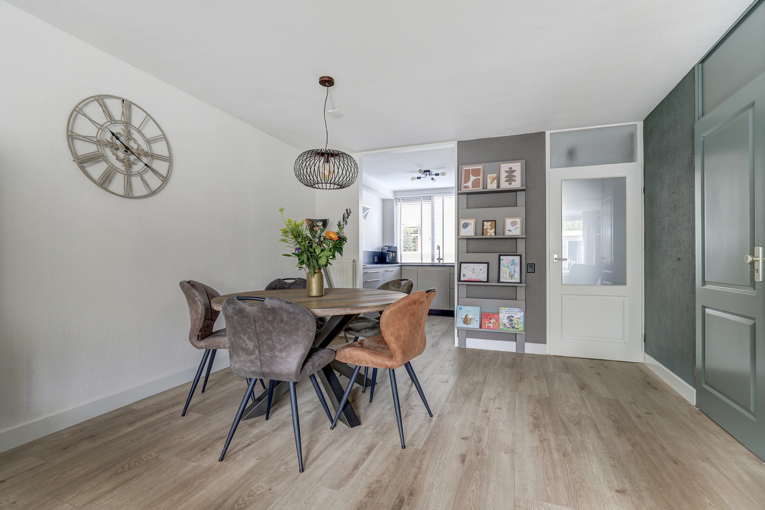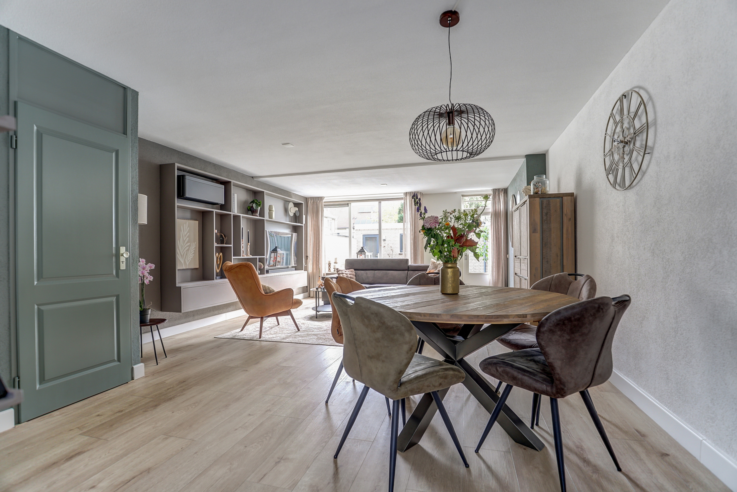 Entree, hal met meterkast, modern toilet en trapopgang naar de eerste verdieping. Via de hal komt u in de verrassend ruime woonkamer met een op maat gemaakt wandmeubel. De grote raampartijen richting de tuin en de strakke wandafwerking op de accentmuur zorgen voor een lichte, open uitstraling. De lichte laminaatvloer met houtnerf loopt drempelloos door, wat rust en eenheid geeft. De achtertuin is vanuit de woonkamer bereikbaar via een loopdeur.