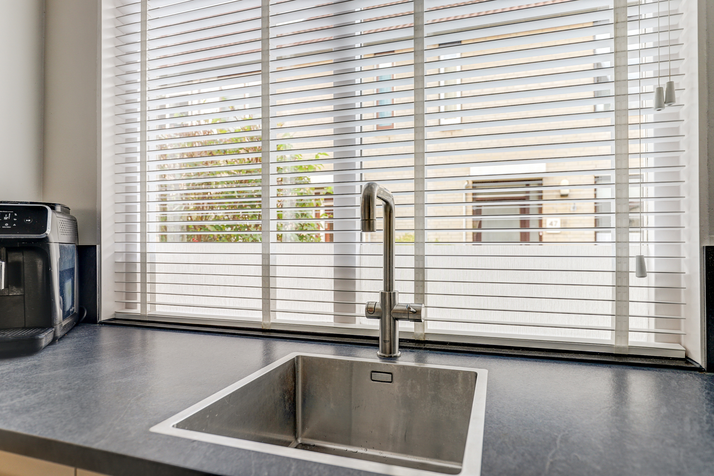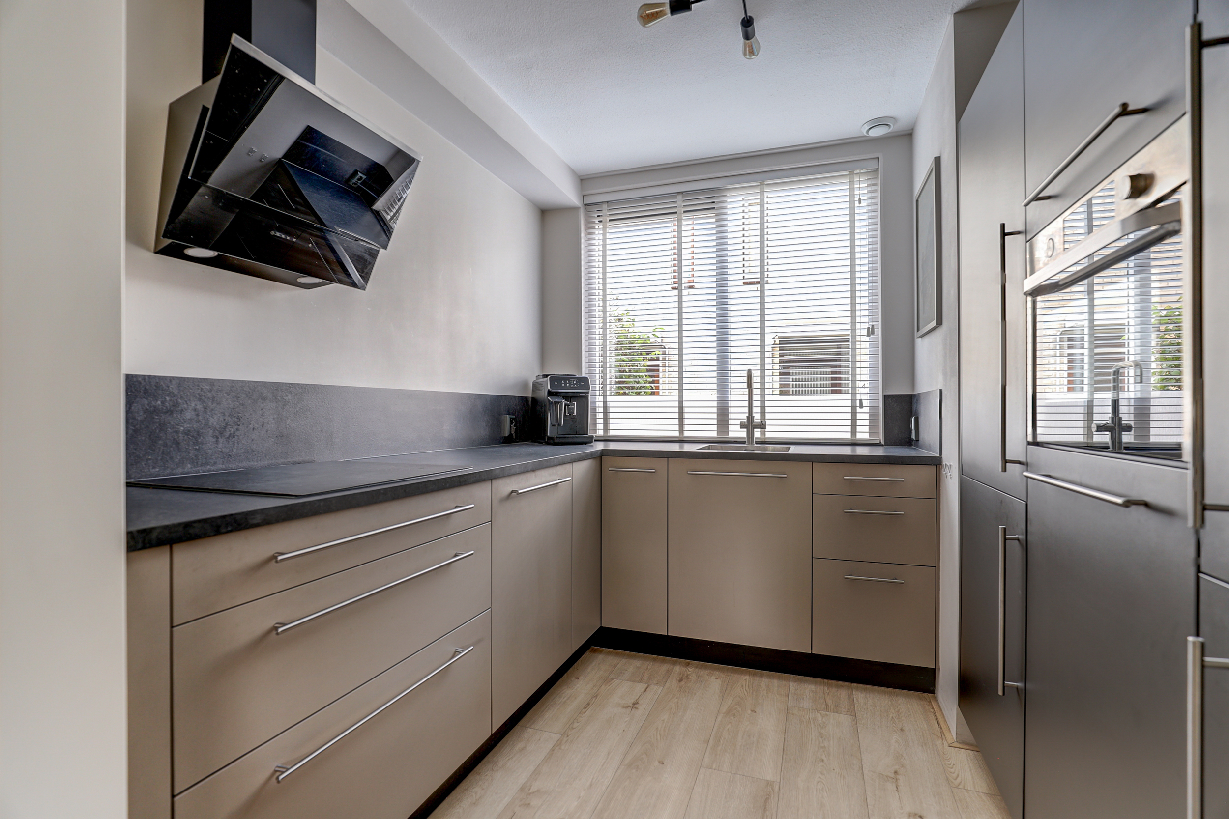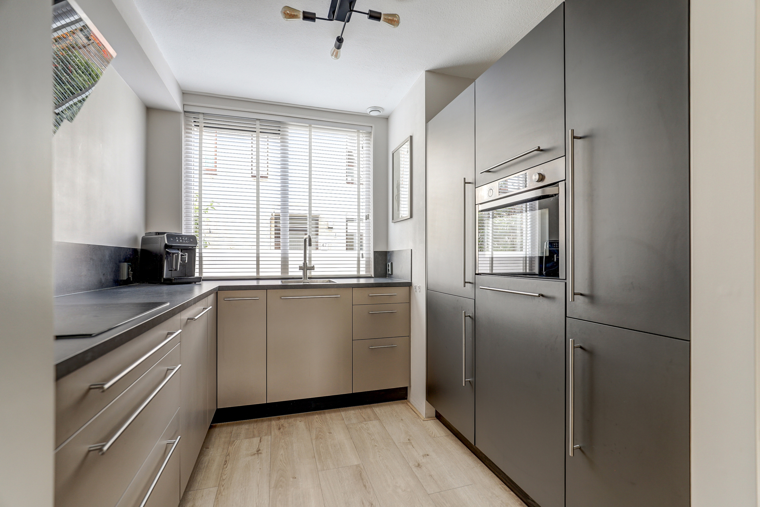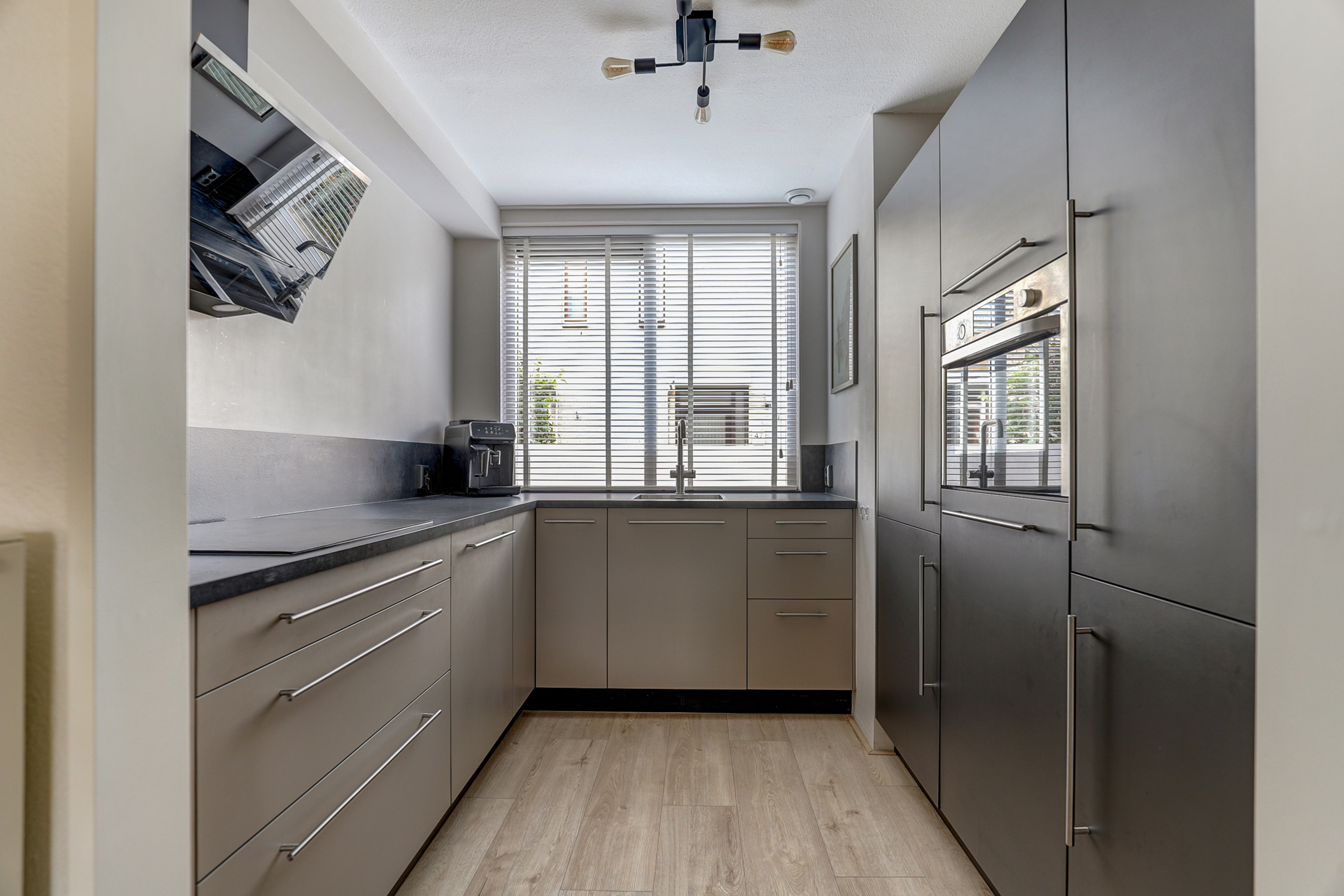 Aan de voorzijde ligt de U-vormige keuken met fronten voorzien van lange grepen en een donker werkblad. Onder het brede raam is de spoelunit gesitueerd, aan de rechterzijde bevindt zich een hoge kastenwand met onder andere een inbouw(combi)oven, een Grohe-heetwaterkraan en een koel-/vriesgedeelte. Verder is er een inductiekookplaat met schuin gemonteerde afzuigkap, een vaatwasser en veel bergruimte in brede laden. Tussen de keuken en de woonkamer is ruimte voor een grote eettafel. Onder de trap bevindt zich een handige bergkast.