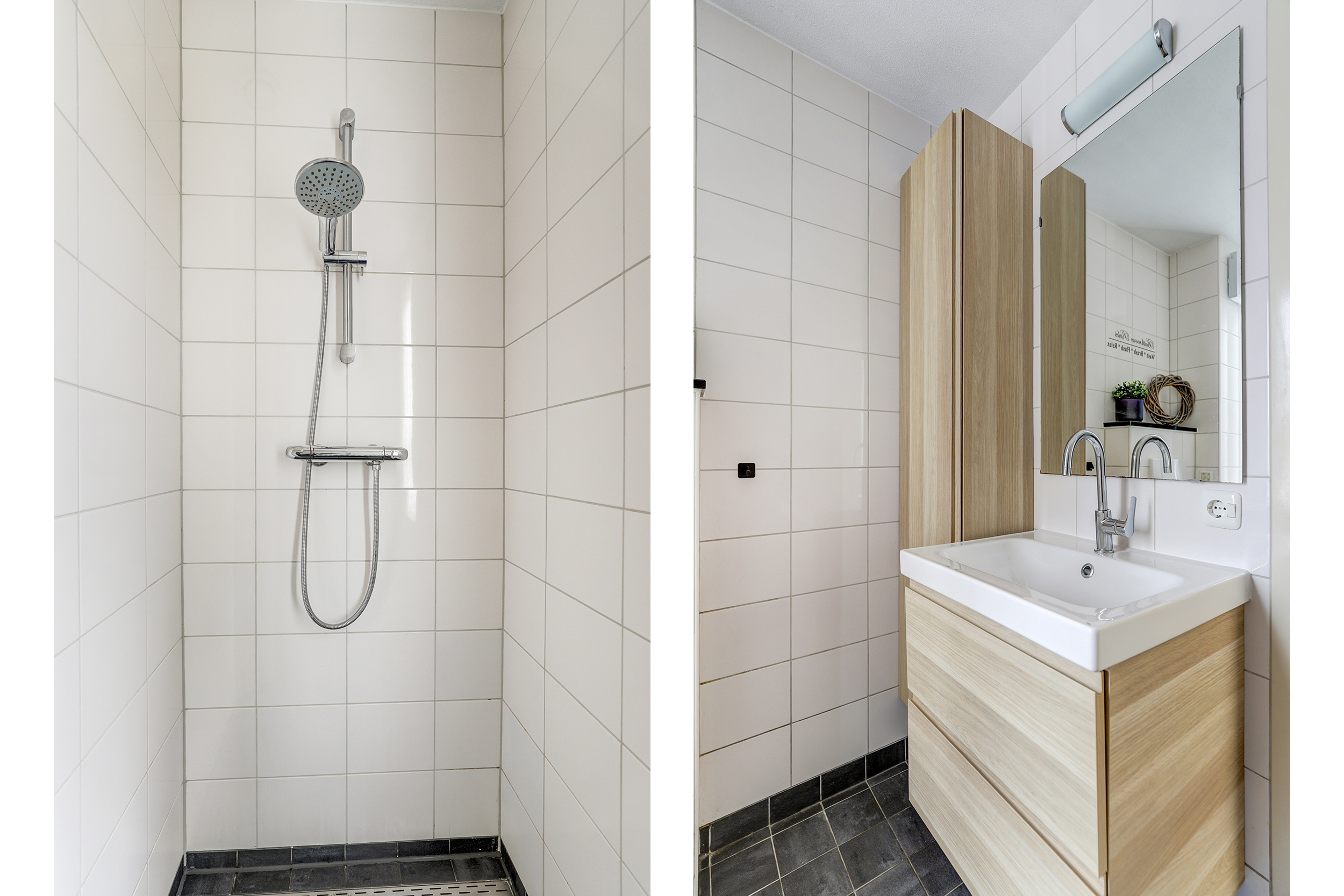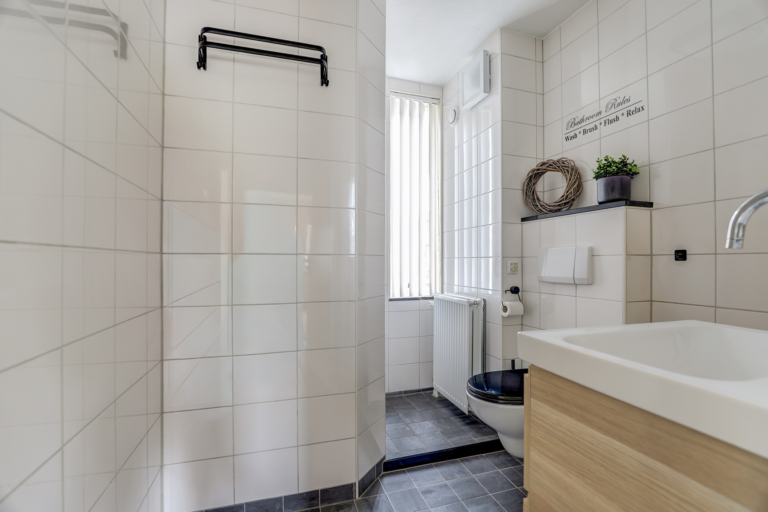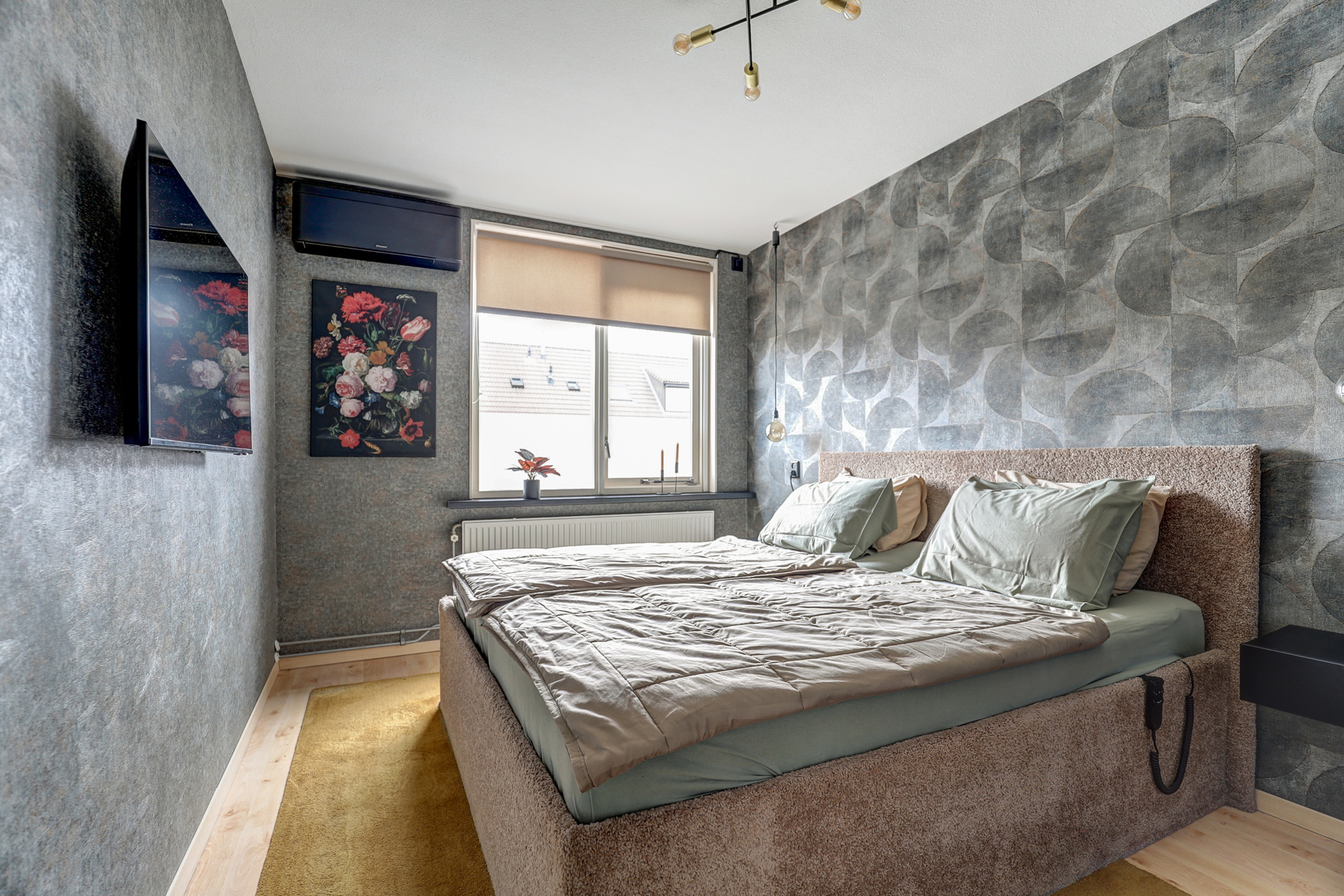 De eerste verdieping beschikt over drie ruime slaapkamers met rechte gevels: twee aan de achterzijde en één aan de voorzijde. De ouderslaapkamer is voorzien van airconditioning. Alle kamers zijn keurig afgewerkt in neutrale tinten en genieten, net als de begane grond, van veel natuurlijk licht. De badkamer is modern en tijdloos, met grote witte wandtegels, antraciet vloertegels en een luxe inloopdouche met thermostaatkraan. Daarnaast is er een stijlvol wastafelmeubel in houtdecor met brede lades, een hoge kolomkast en een vrijhangend toilet.