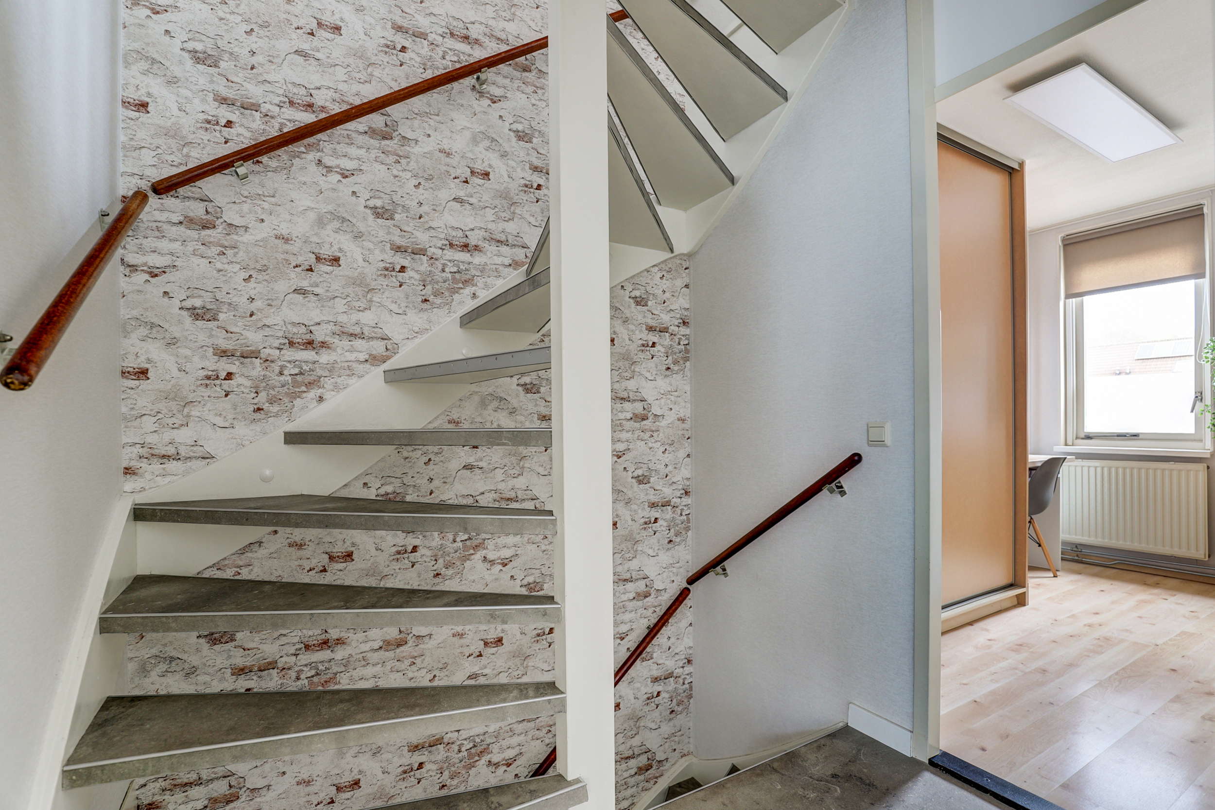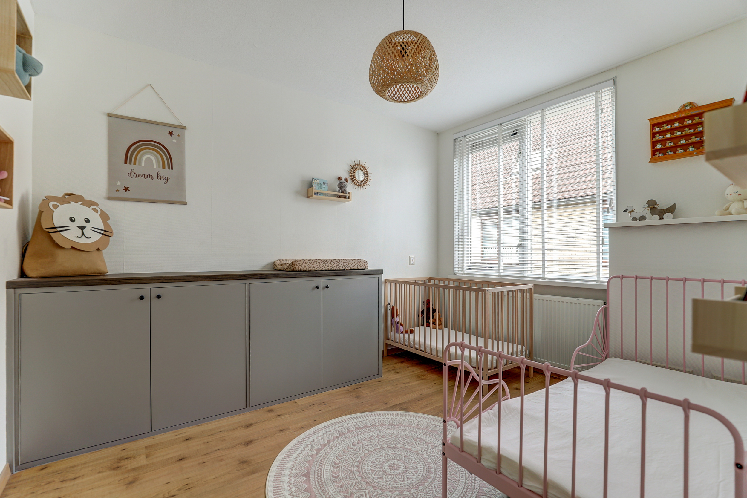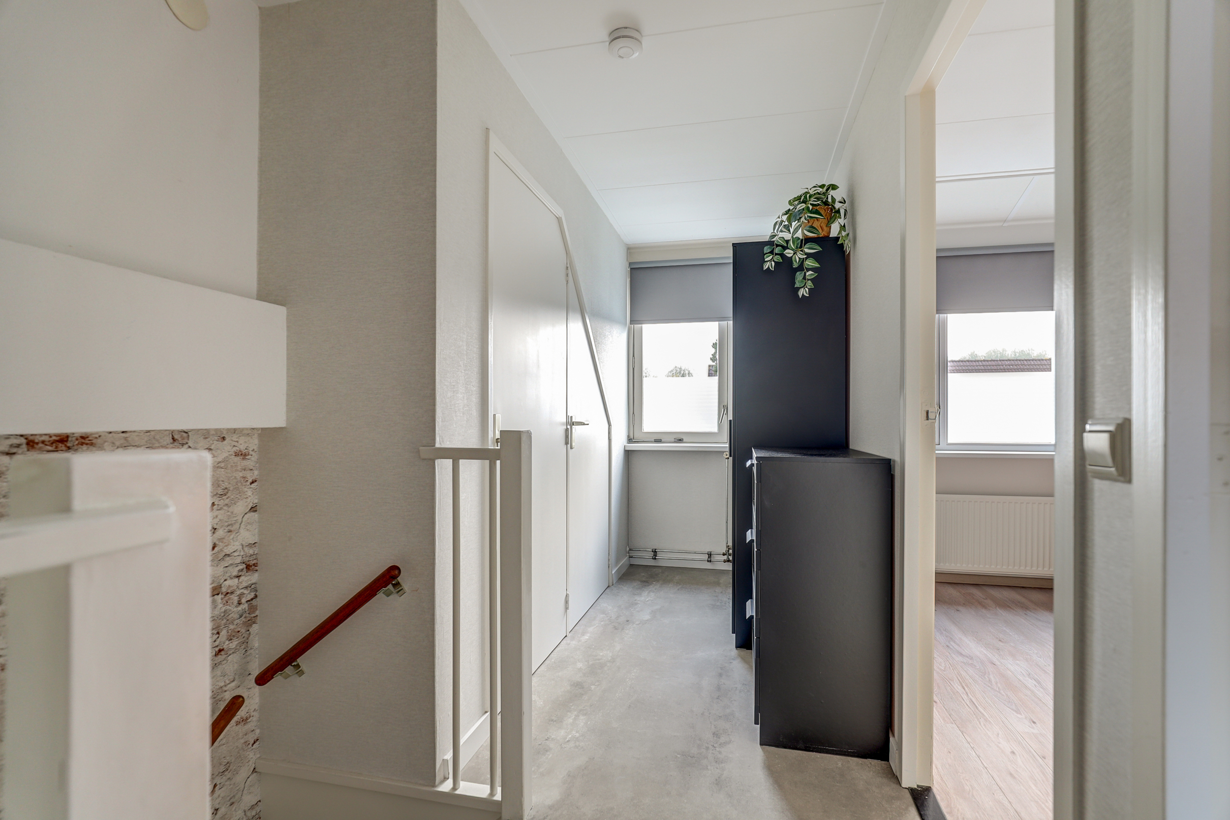 De eerste verdieping beschikt over drie ruime slaapkamers met rechte gevels: twee aan de achterzijde en één aan de voorzijde. De ouderslaapkamer is voorzien van airconditioning. Alle kamers zijn keurig afgewerkt in neutrale tinten en genieten, net als de begane grond, van veel natuurlijk licht. De badkamer is modern en tijdloos, met grote witte wandtegels, antraciet vloertegels en een luxe inloopdouche met thermostaatkraan. Daarnaast is er een stijlvol wastafelmeubel in houtdecor met brede lades, een hoge kolomkast en een vrijhangend toilet.