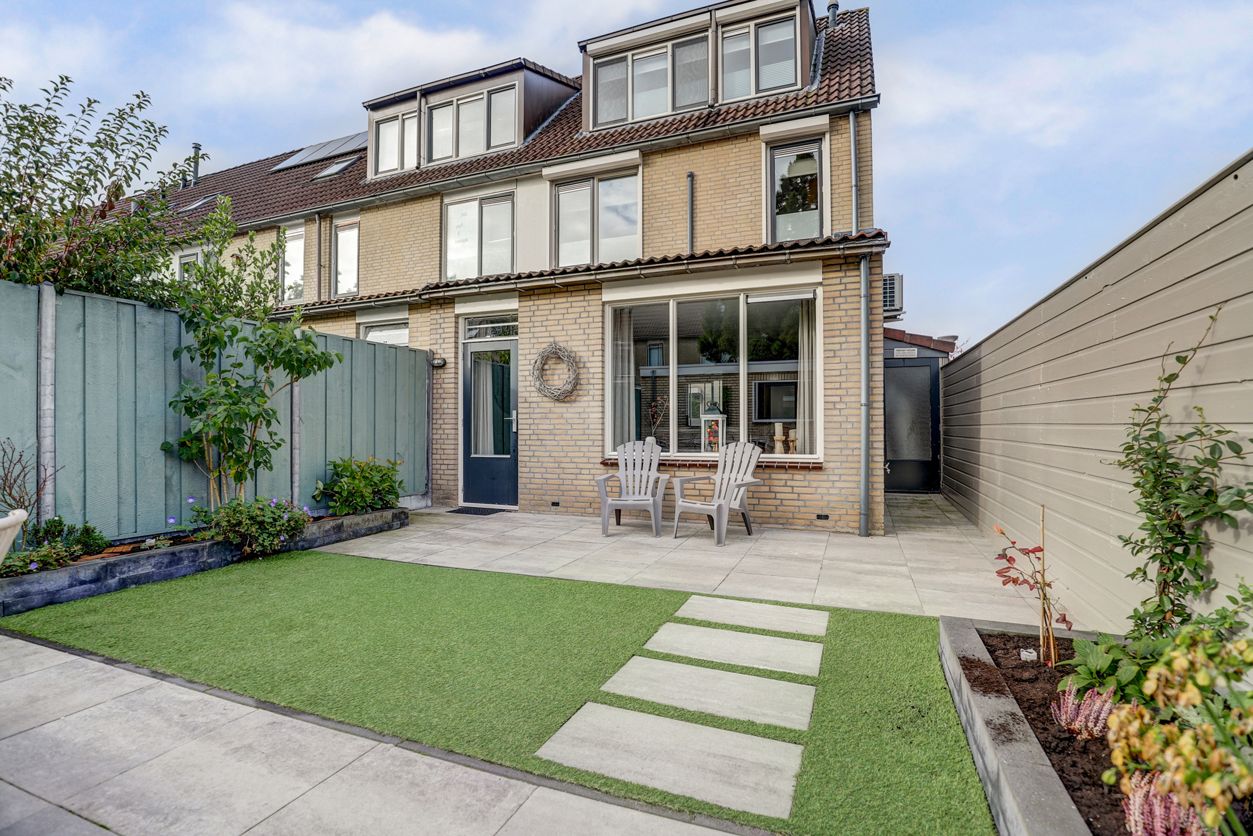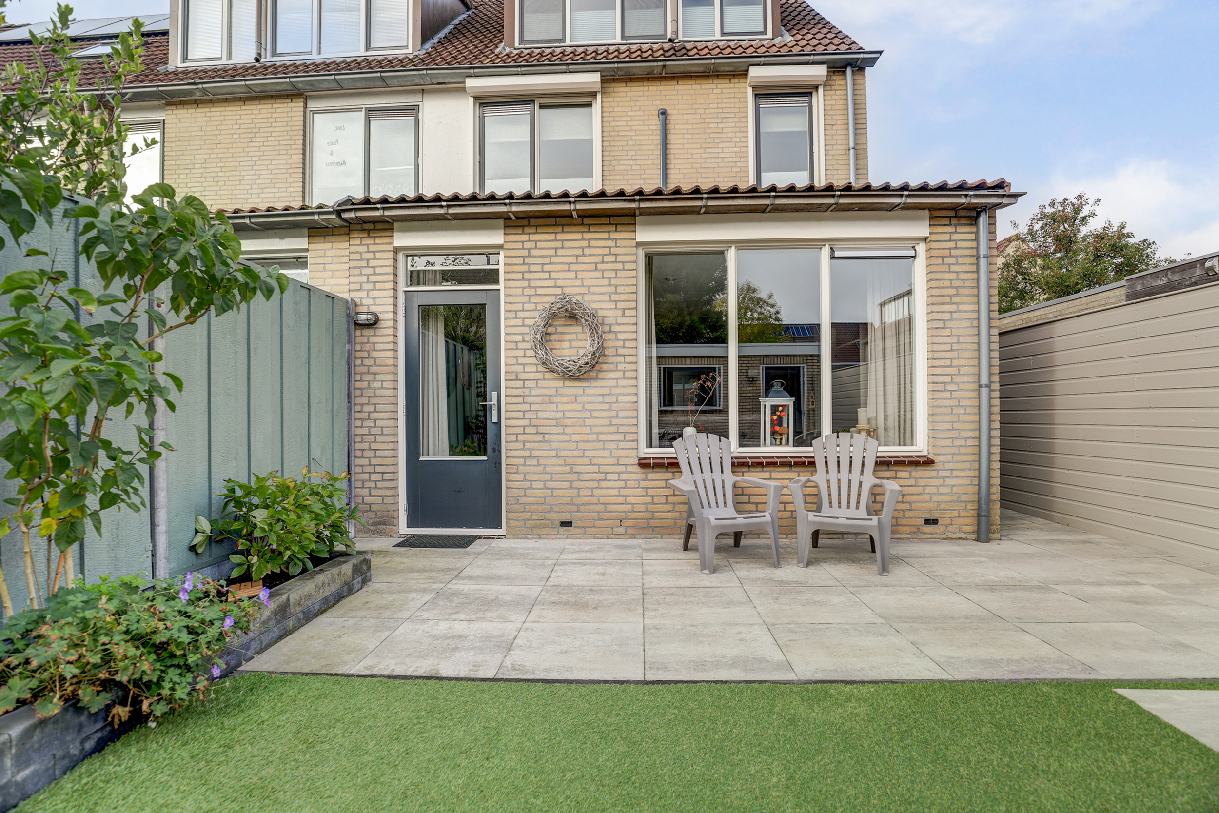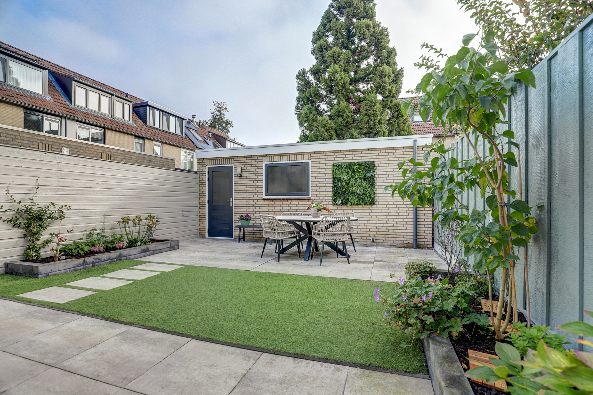 De achtertuin biedt veel privacy en is omsloten, onderhoudsarm en fraai aangelegd met grote terrastegels, een strook kunstgras en verhoogde plantenborders. De tuin is bereikbaar via een achterom aan de zijkant, wat extra praktisch is, zeker bij een hoekwoning. Achterin de tuin staat een uitgebouwde stenen berging over de volledige breedte, voorzien van een dubbele deur, ideaal voor een motor of bakfiets.
