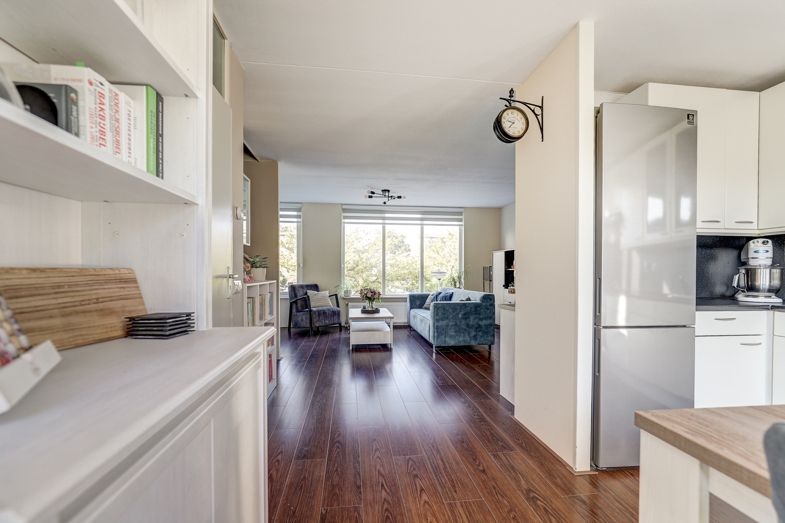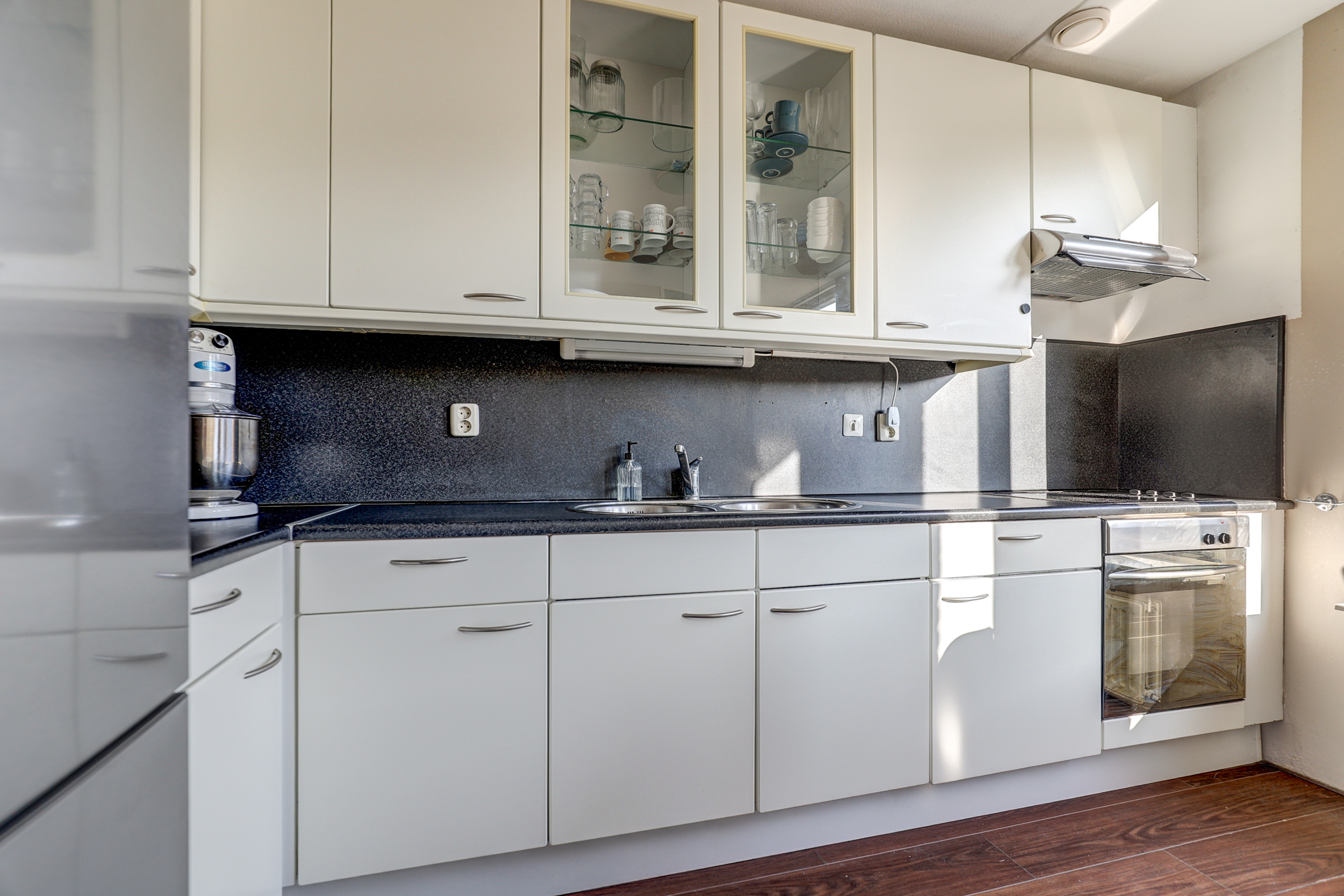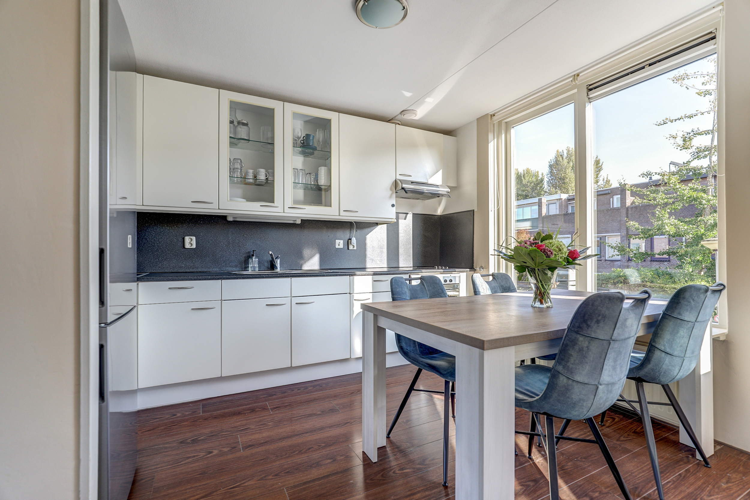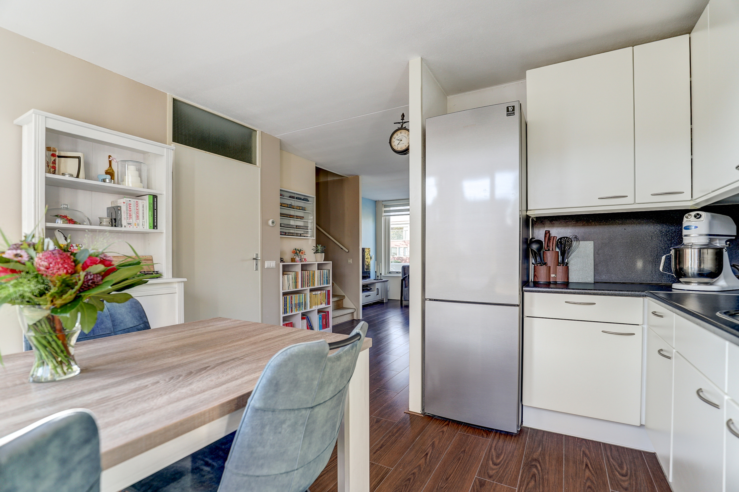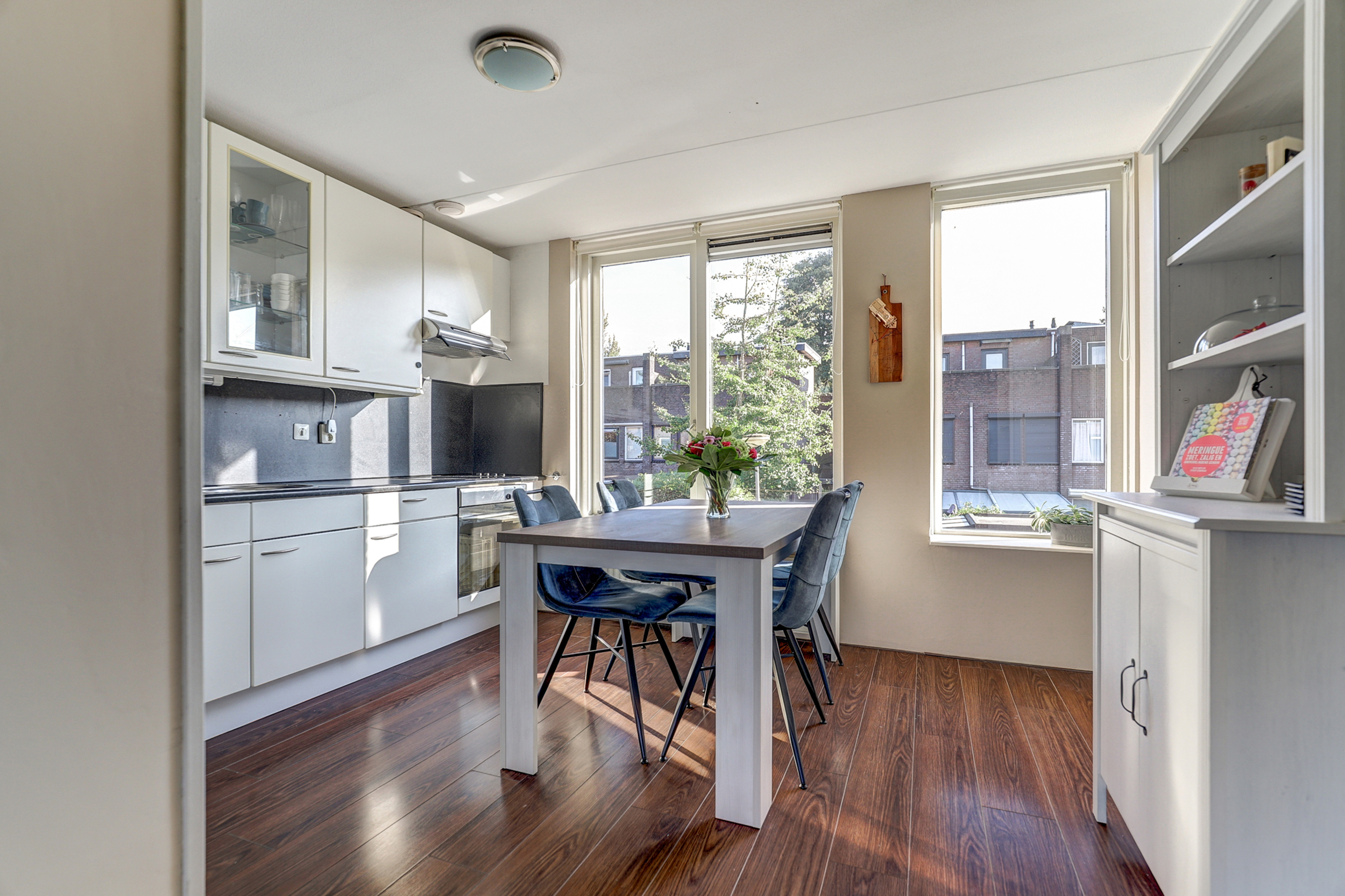 Via de overloop (met apart toilet) loop je door naar de ruime, lichte woonkamer met grote ramen aan de voorzijde. De open keuken aan de achterkant is van alle gemakken voorzien: veel kastruimte, een elektrische kookplaat, oven, afzuigkap, vaatwasser én koel/vriescombinatie. Een gezellige eethoek past hier makkelijk. Achter de keuken vind je een handige berging met de cv-ketel.