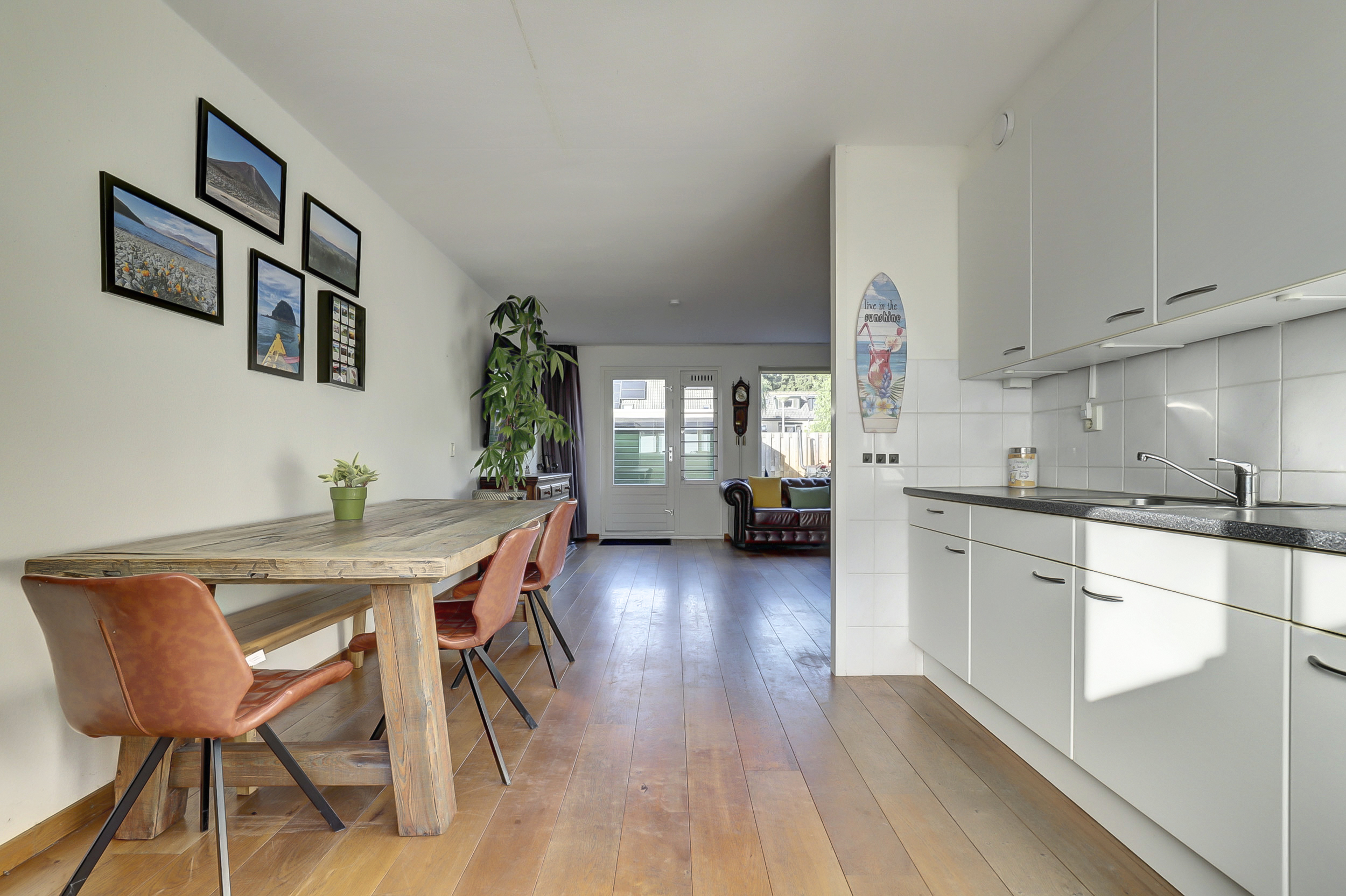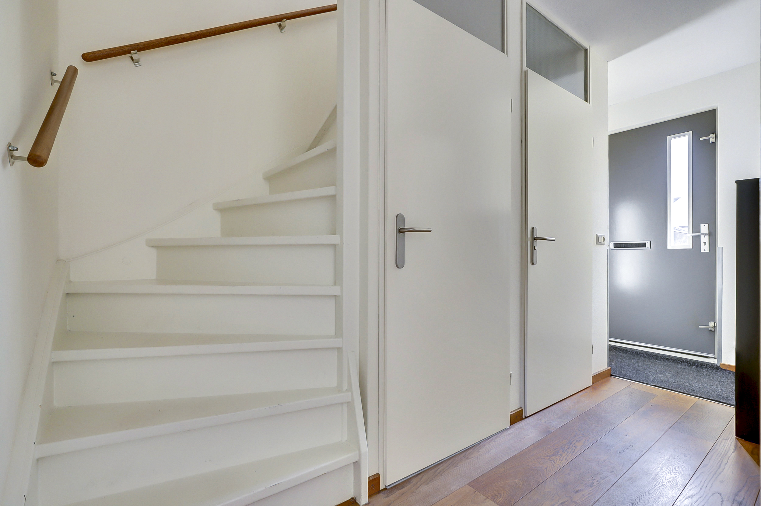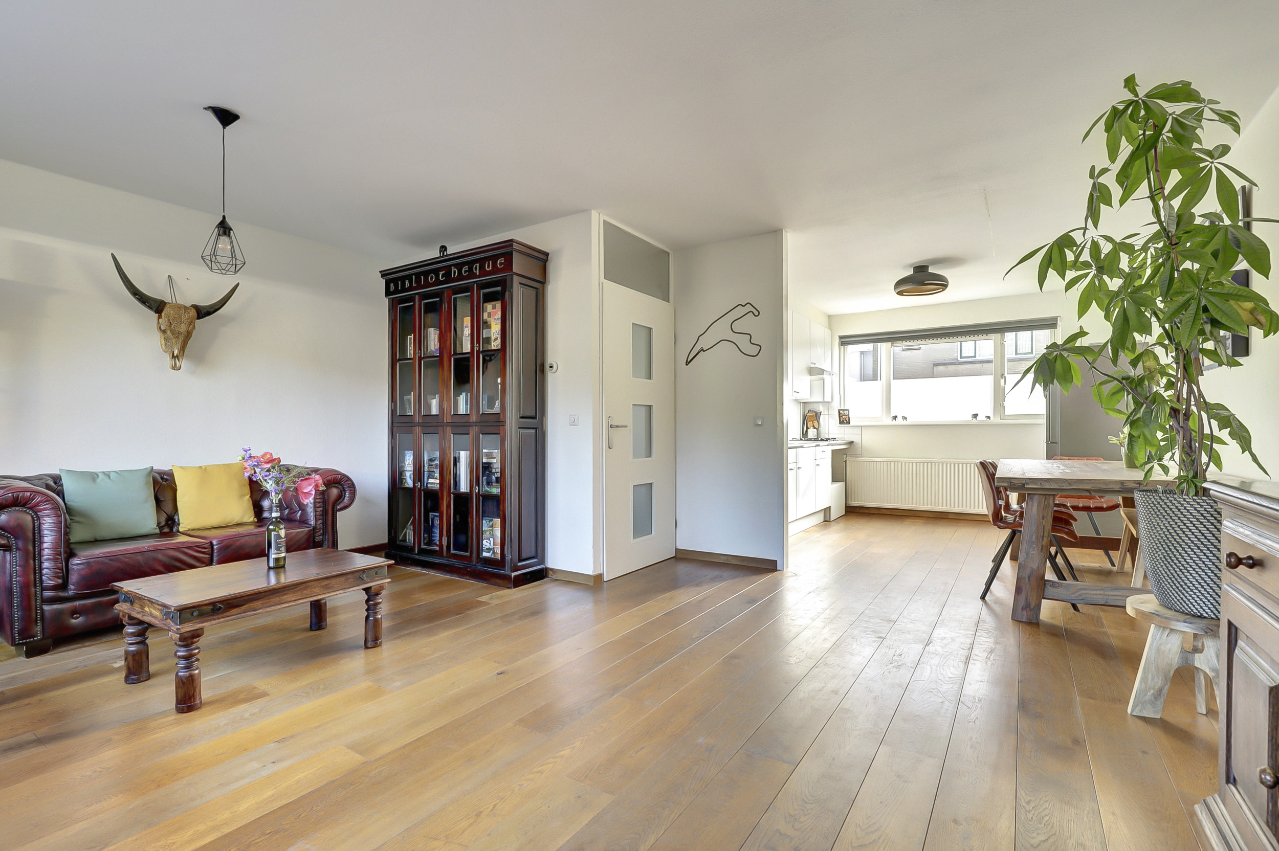 Bij binnenkomst tref je de entree met garderoberuimte en toegang tot het toilet. De open keuken aan de voorzijde van de woning is modern, licht en voorzien van veel werkruimte, ideaal voor kookliefhebbers. Vanuit de keuken kijk je uit over de straat, terwijl de ruime woonkamer zich aan de achterzijde uitstrekt over de volle breedte van de woning. Grote ramen zorgen hier voor veel natuurlijk lichtinval en een fijn uitzicht op de tuin. De warme houten vloer loopt door over de gehele begane grond en geeft het geheel een sfeervolle uitstraling.