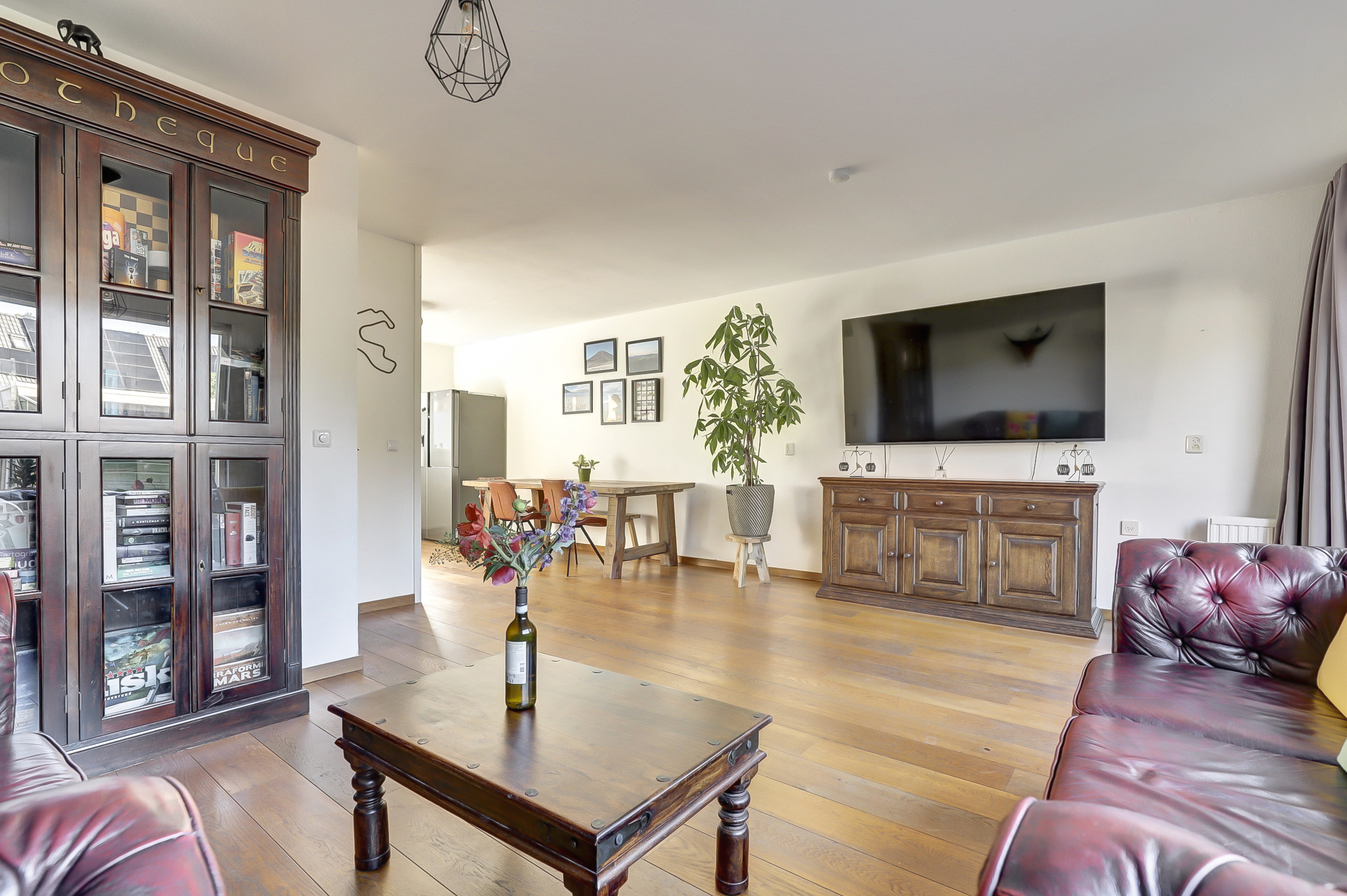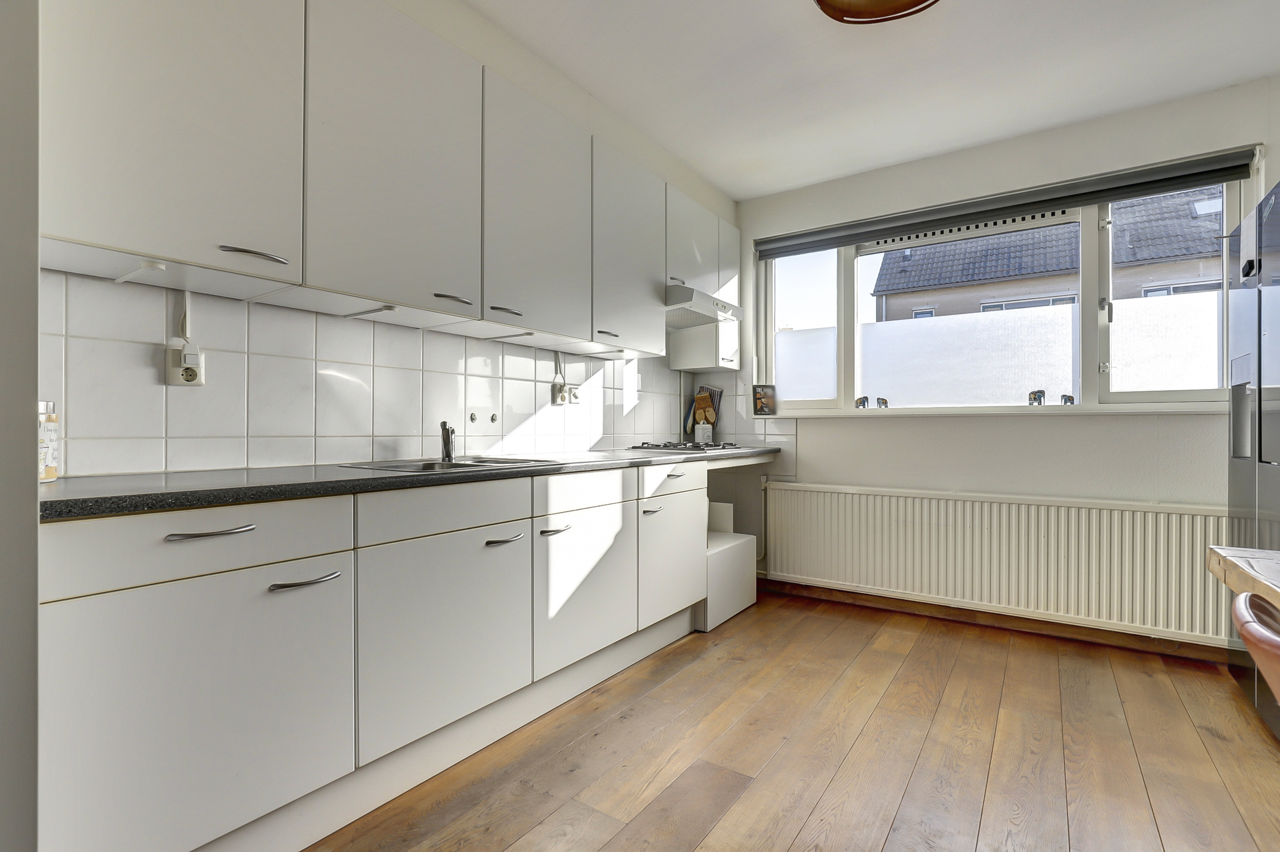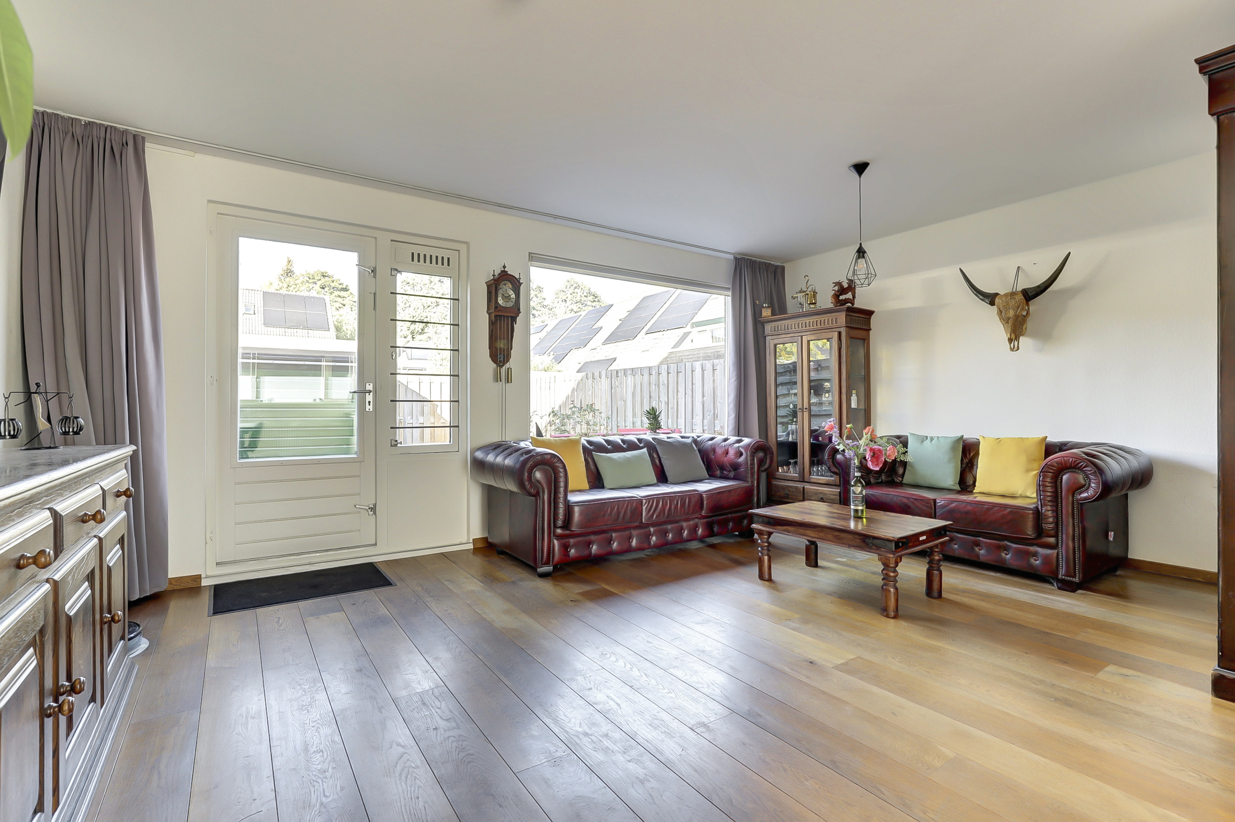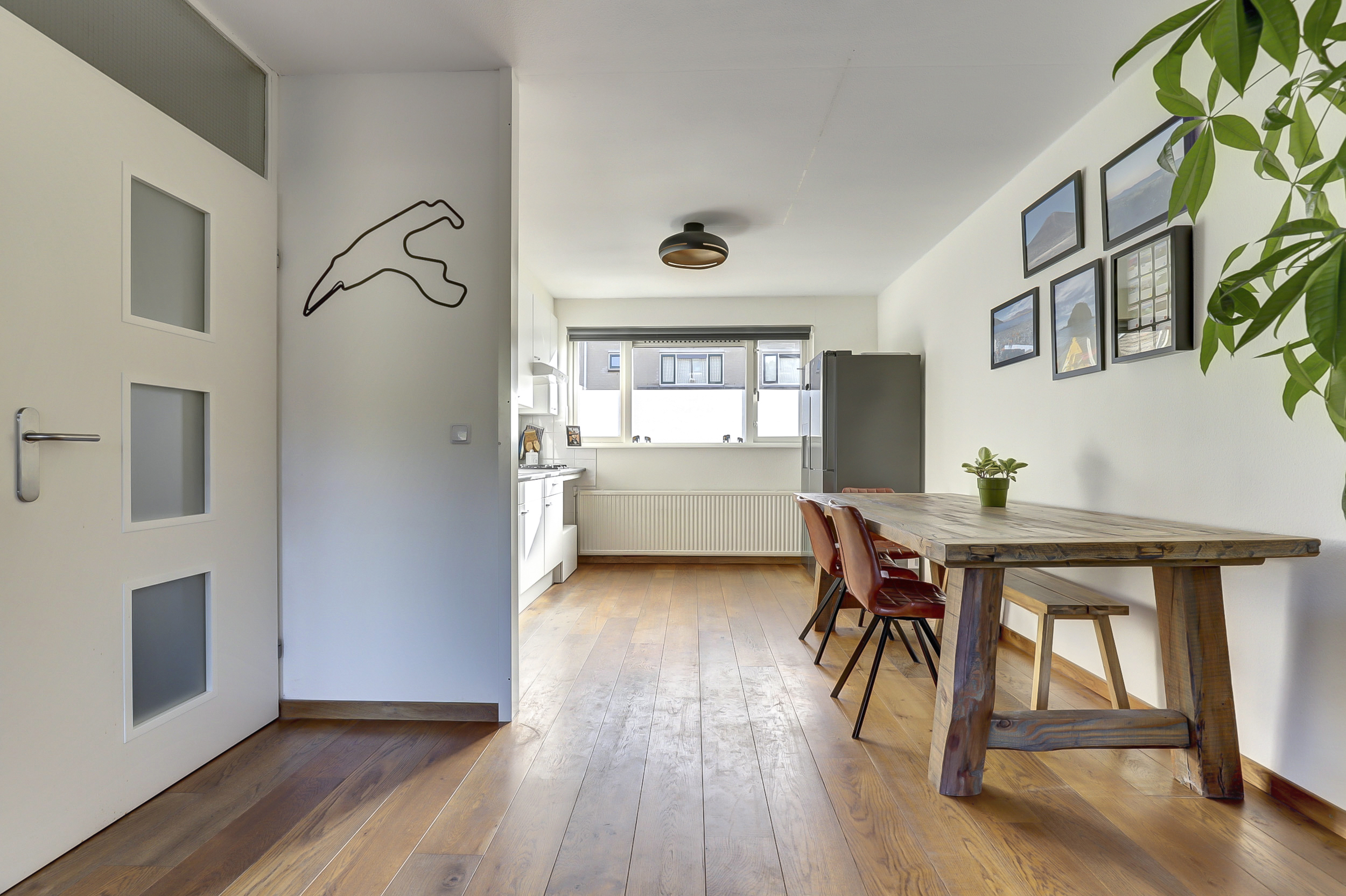 Bij binnenkomst tref je de entree met garderoberuimte en toegang tot het toilet. De open keuken aan de voorzijde van de woning is modern, licht en voorzien van veel werkruimte, ideaal voor kookliefhebbers. Vanuit de keuken kijk je uit over de straat, terwijl de ruime woonkamer zich aan de achterzijde uitstrekt over de volle breedte van de woning. Grote ramen zorgen hier voor veel natuurlijk lichtinval en een fijn uitzicht op de tuin. De warme houten vloer loopt door over de gehele begane grond en geeft het geheel een sfeervolle uitstraling.