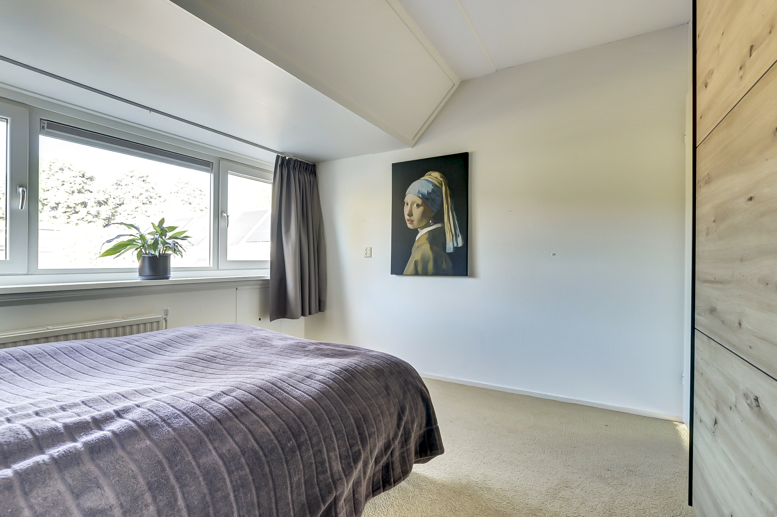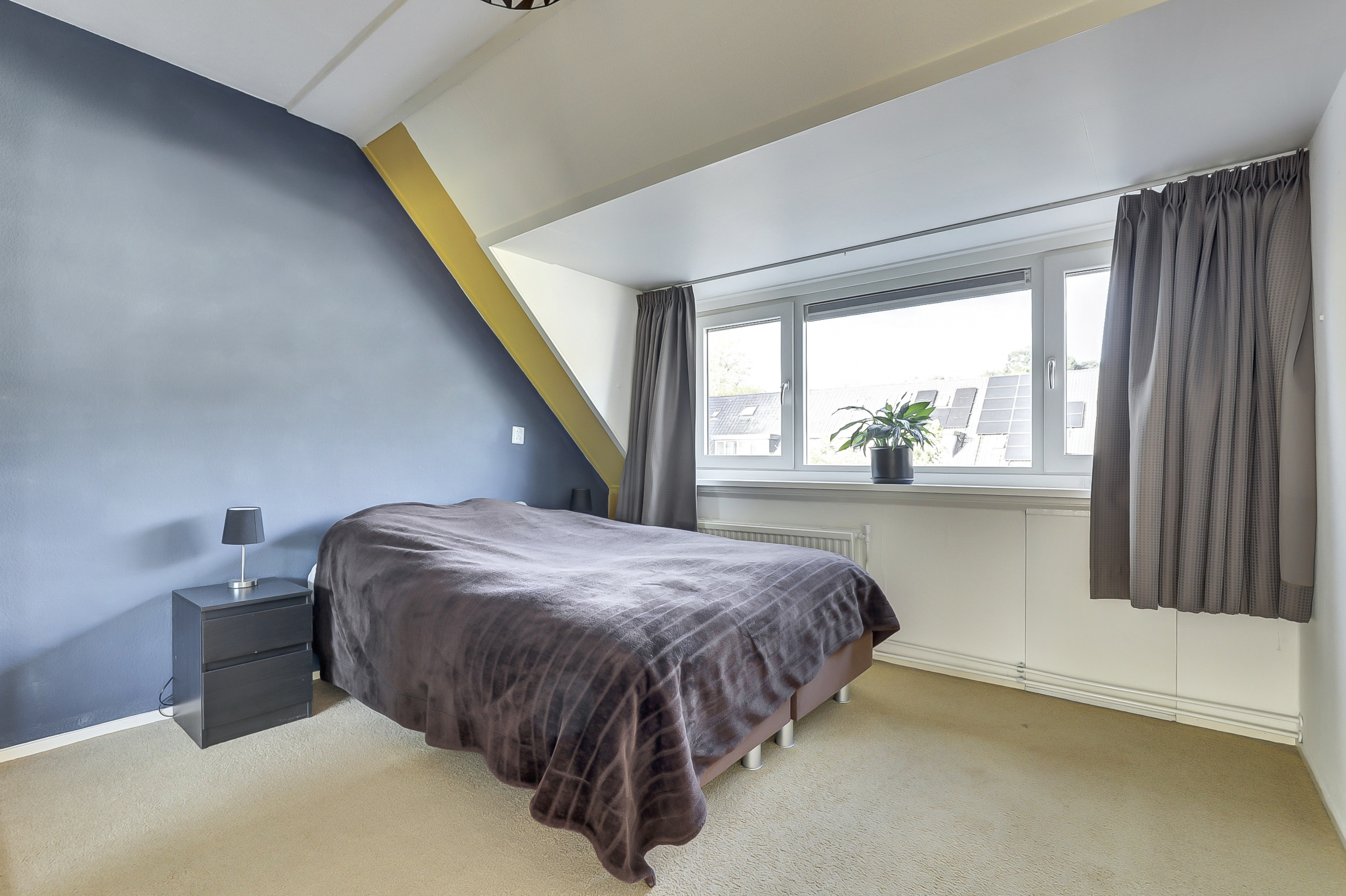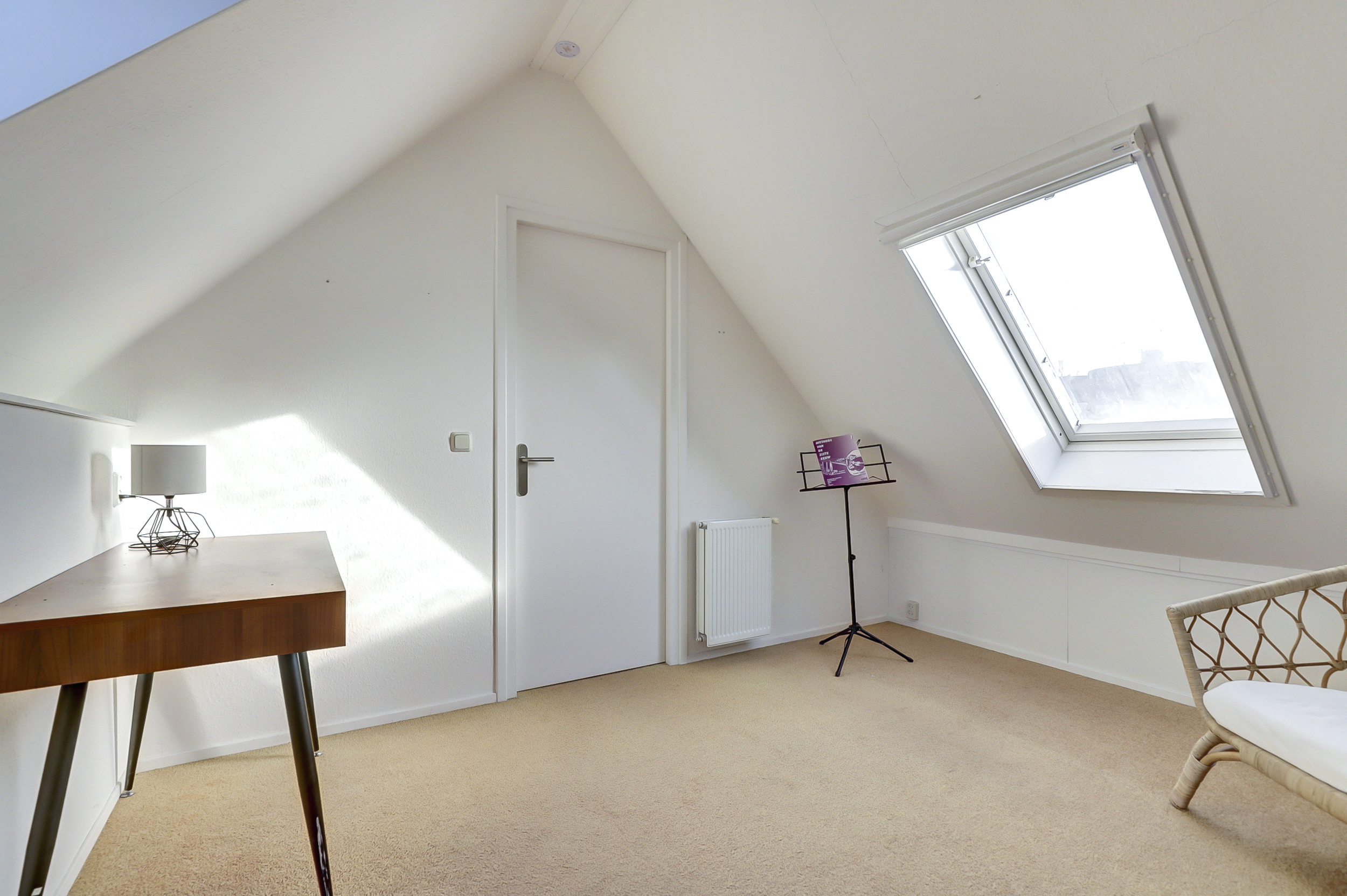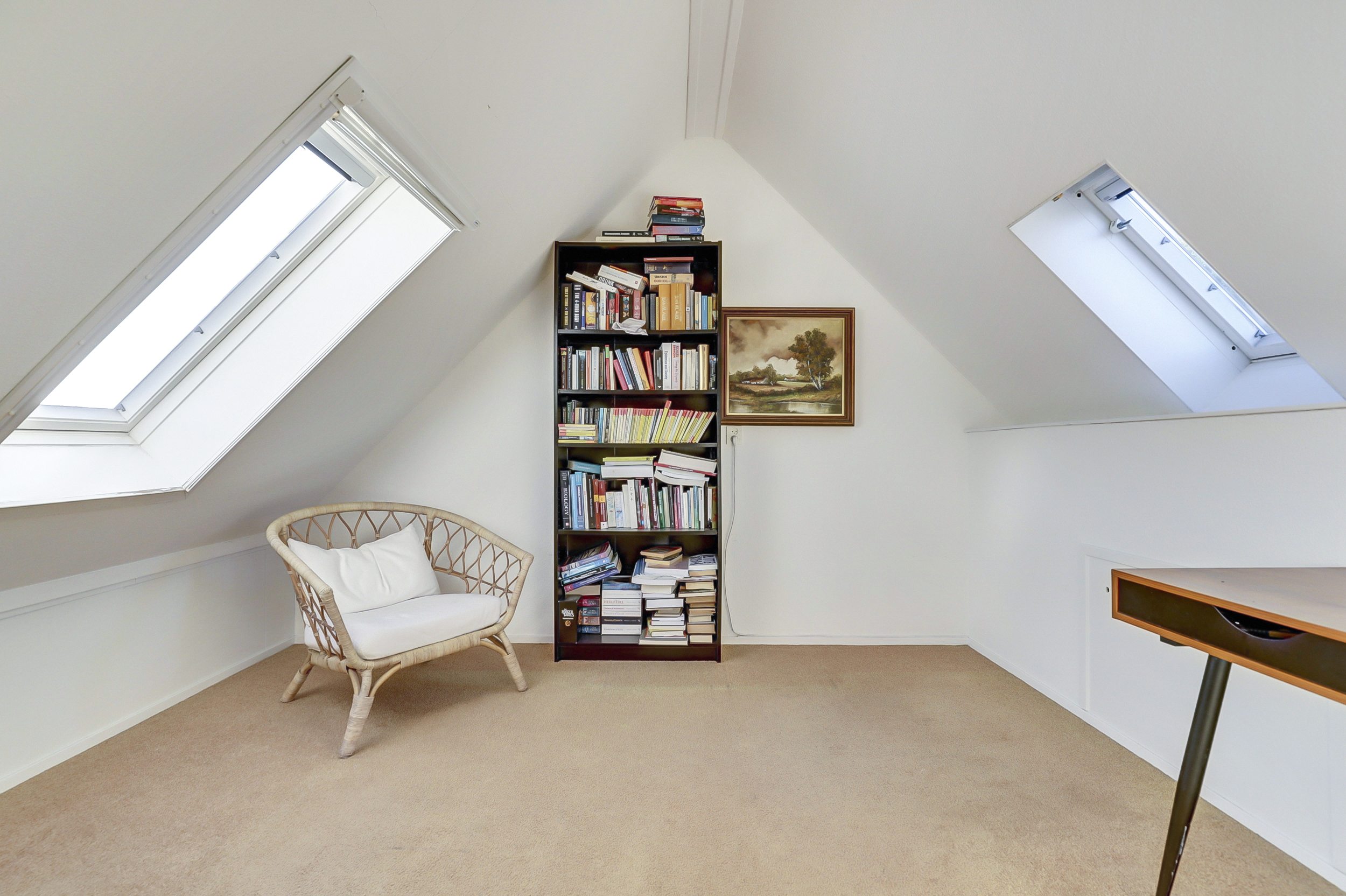 De zolderverdieping biedt een royale vierde slaapkamer. Via de overloop is er toegang tot de wasruimte en de slaapkamer. Dankzij de aanwezige dakramen valt er veel daglicht binnen, waardoor de ruimte veelzijdig te gebruiken is, bijvoorbeeld als master bedroom, werkkamer of hobbyruimte. Het tapijt geeft de verdieping een warme uitstraling.
