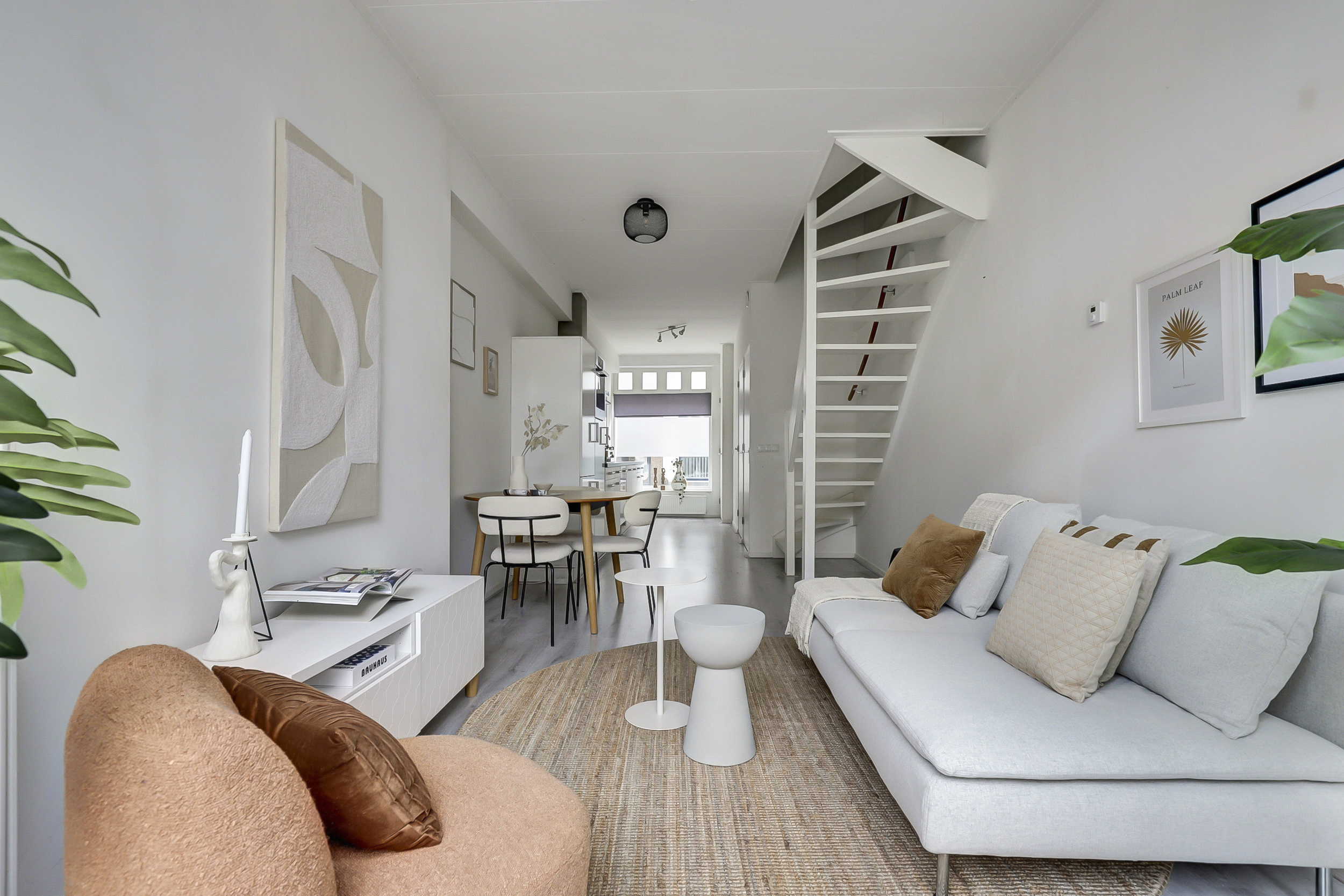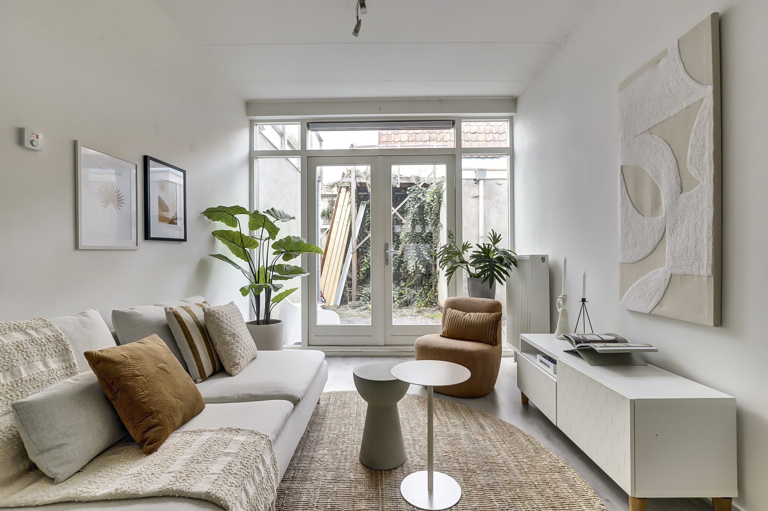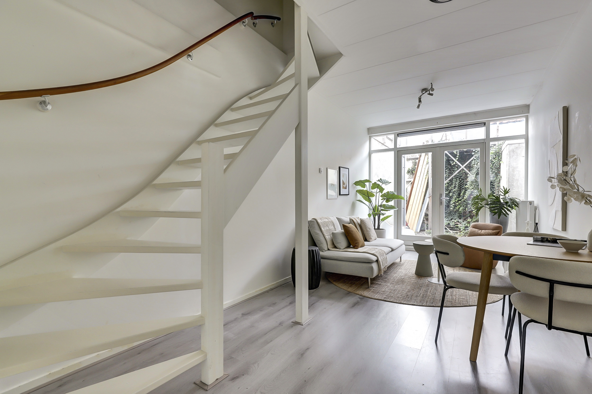 De woonkamer, gelegen aan de achterzijde van de woning, biedt middels openslaande deuren toegang tot de stadstuin. Vanuit de woonkamer leidt een vaste trap naar de eerste verdieping. De gehele begane grond is voorzien van een laminaatvloer en strak afgewerkte wanden en plafonds.