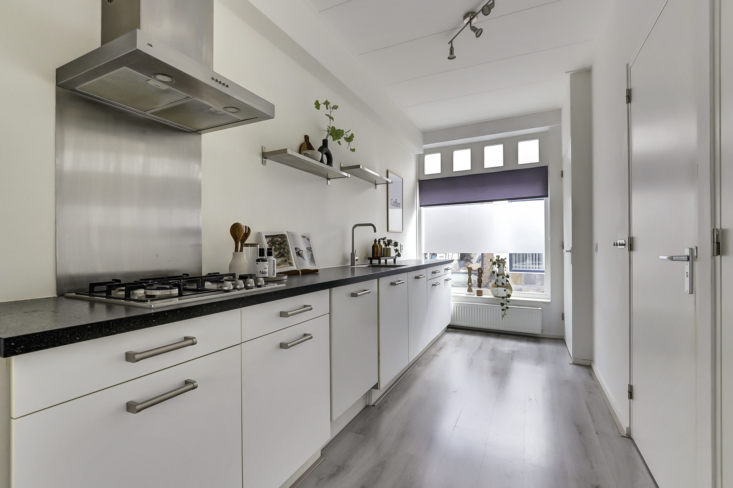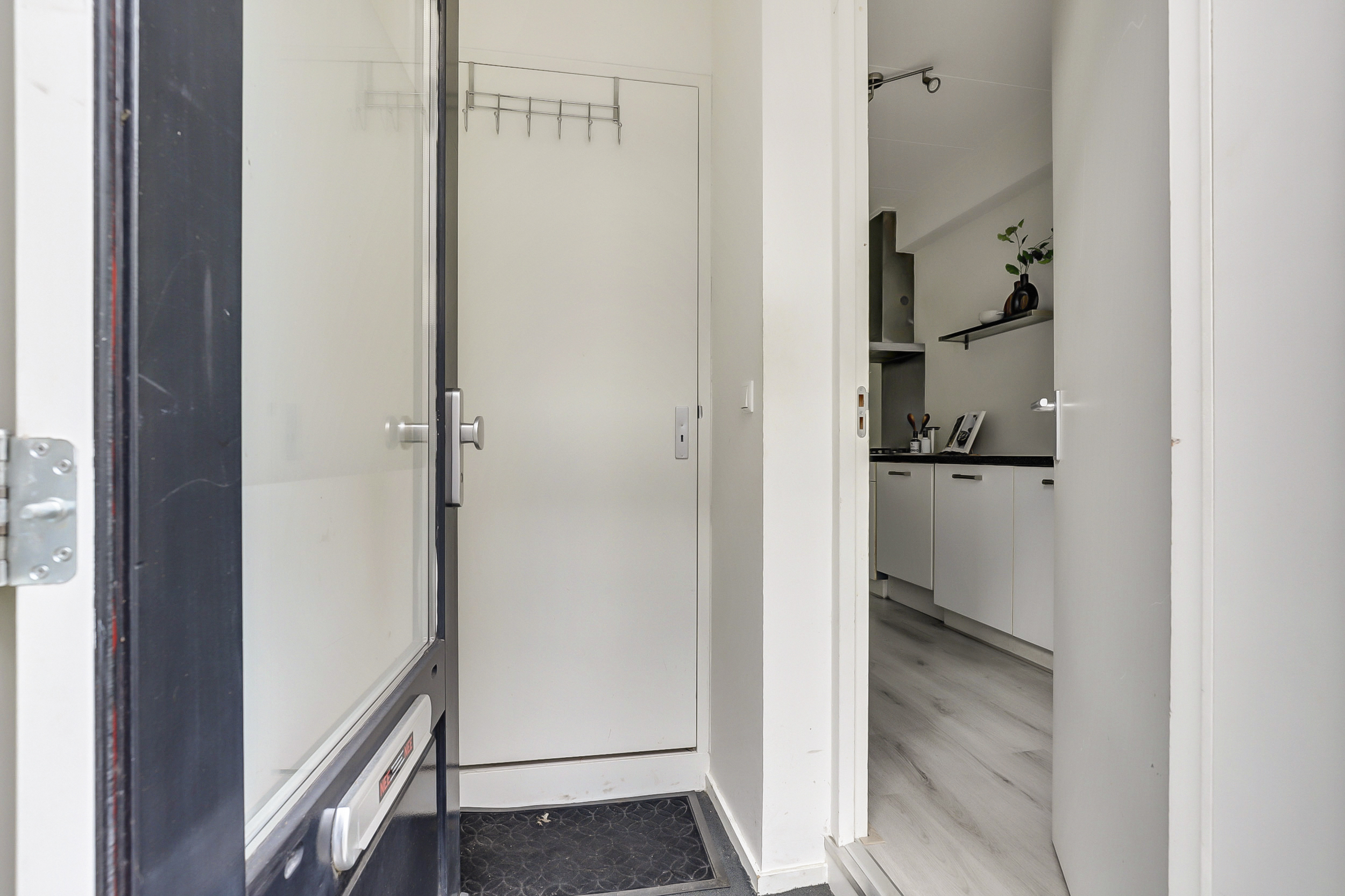 Entree met meterkast (4 groepen en 2 aardlek schakelaars) en directe toegang tot de ruime, lichte keuken, voorzien van een inductiekookplaat,