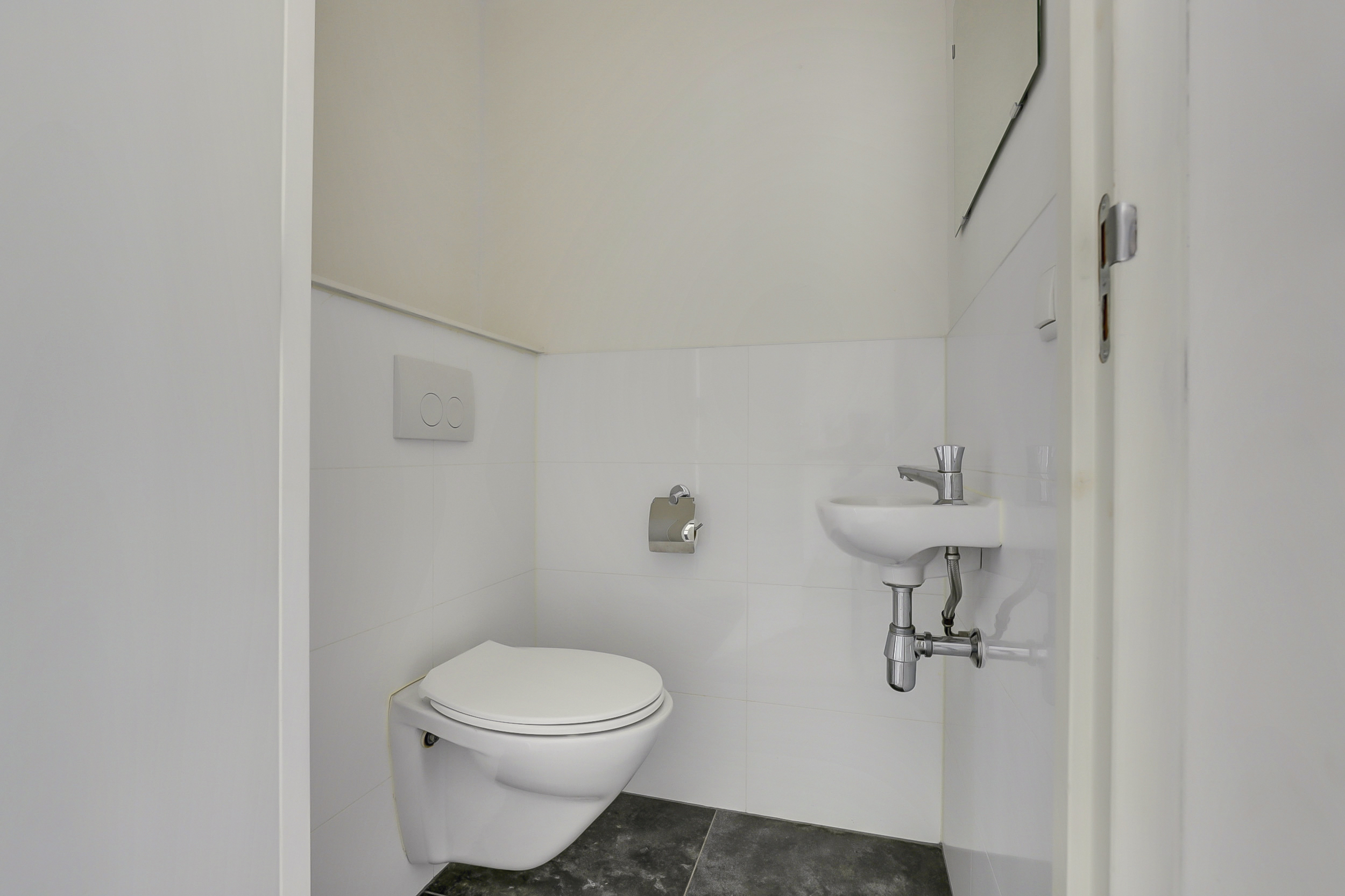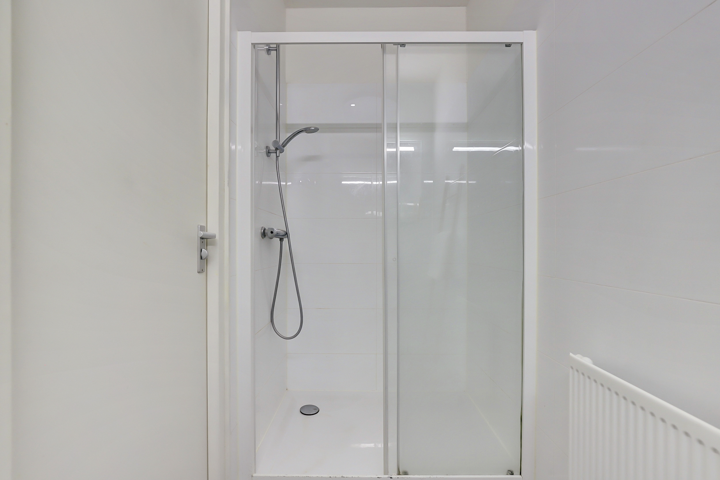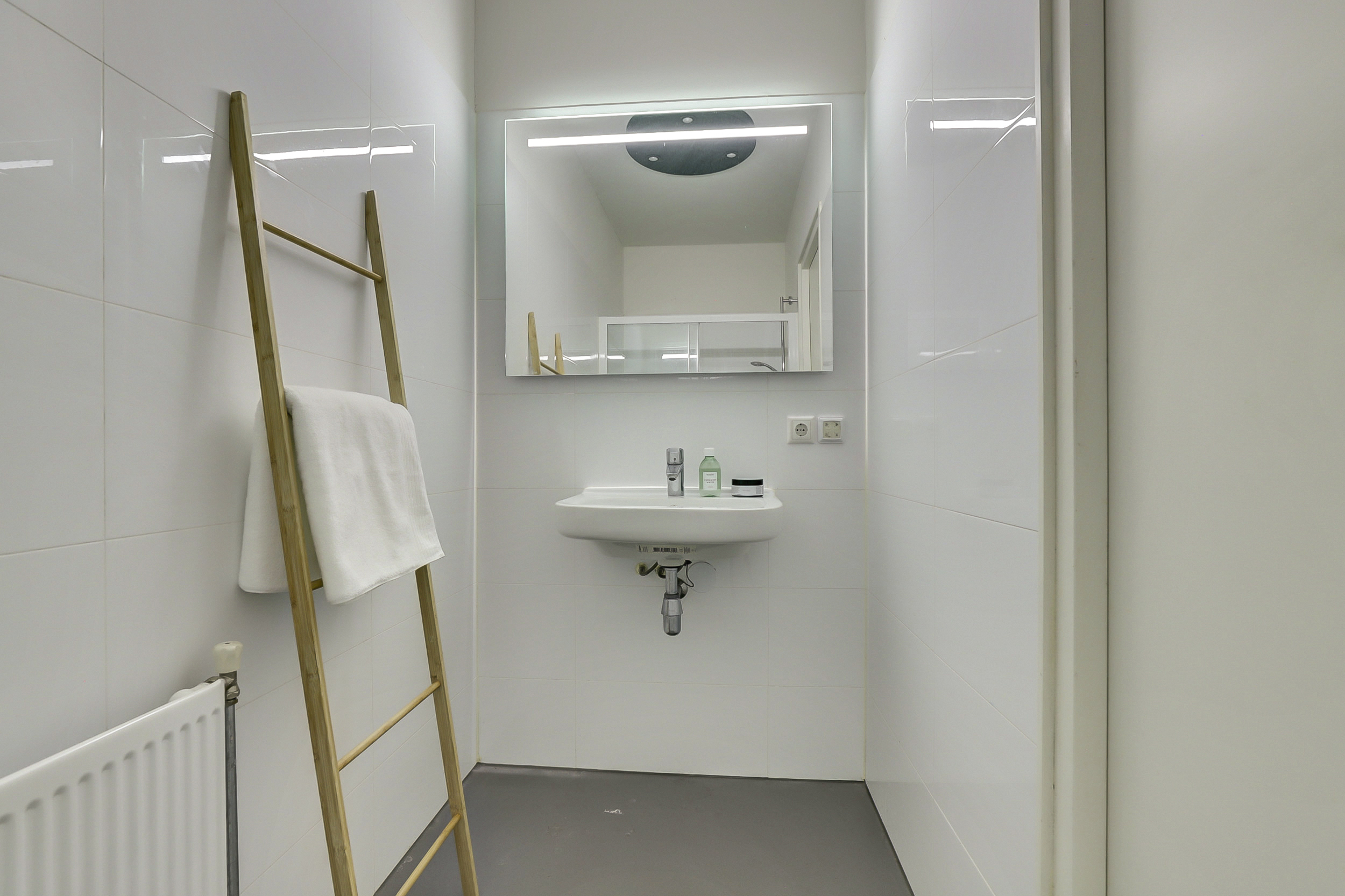 De centraal gelegen badkamer is volledig betegeld en voorzien van een douchecabine, wastafel en spiegel met verlichting. Dankzij de lichte afwerking oogt de badkamer ruim en aangenaam.