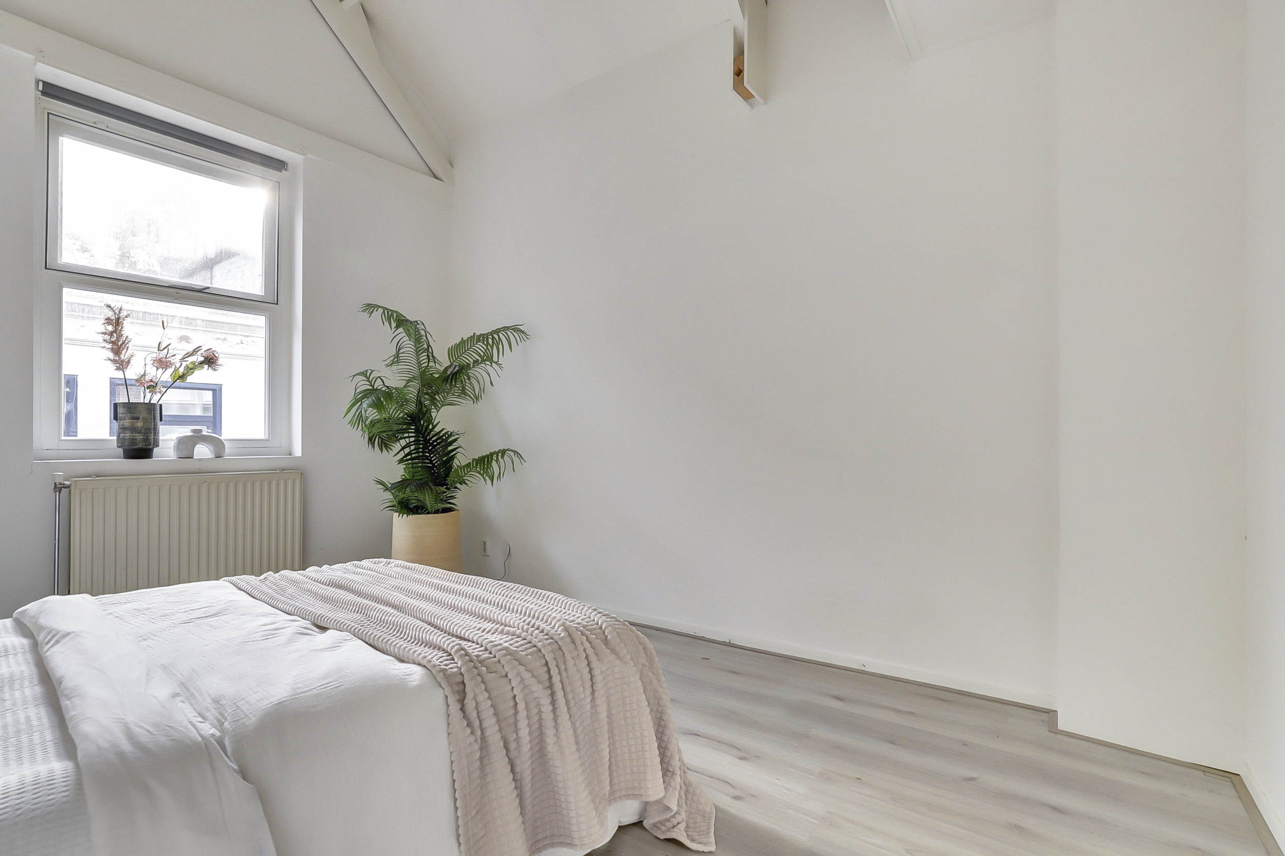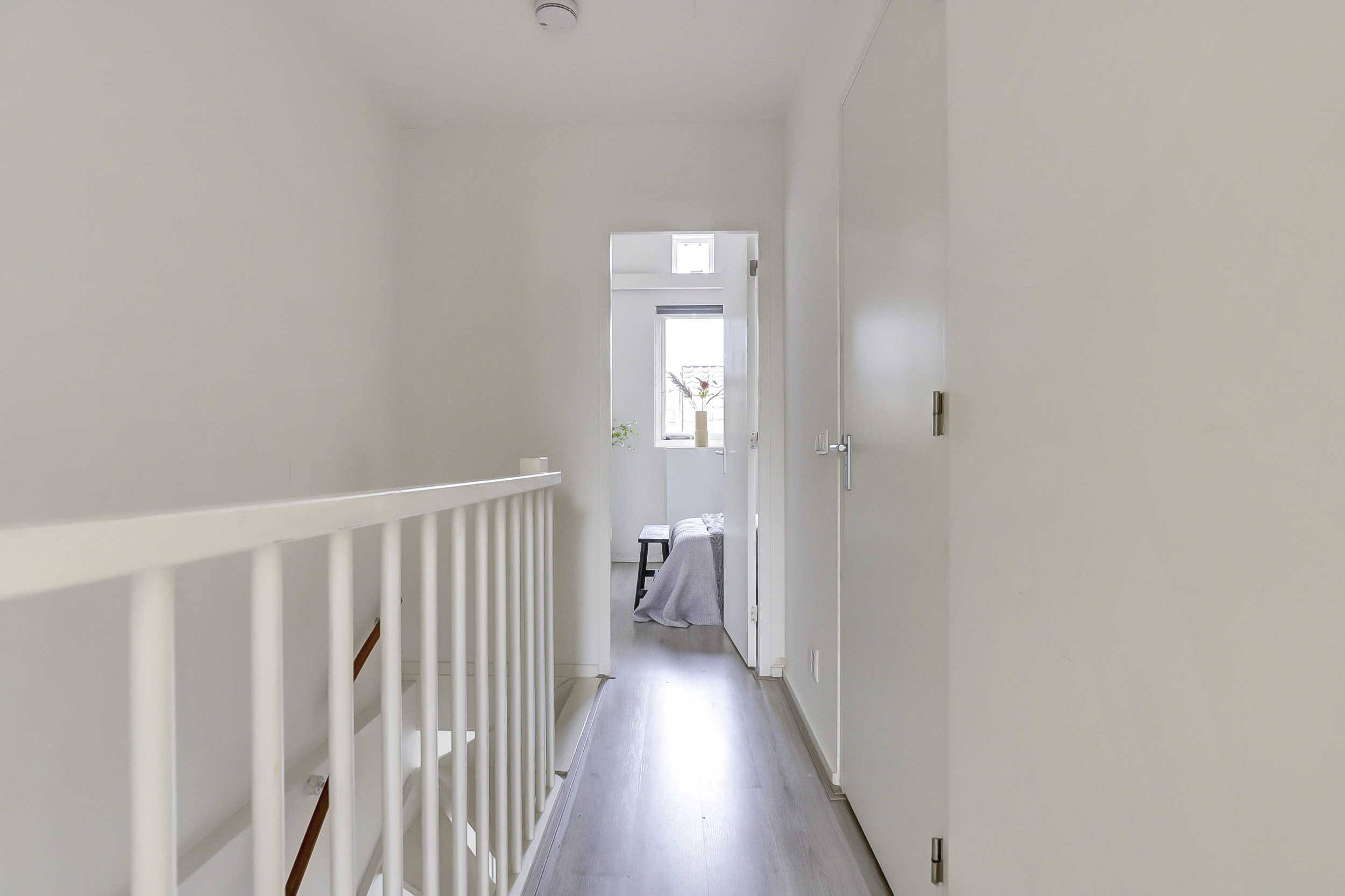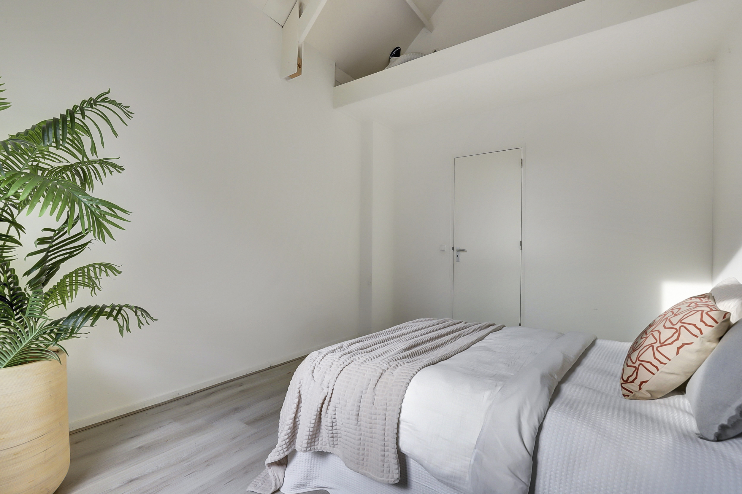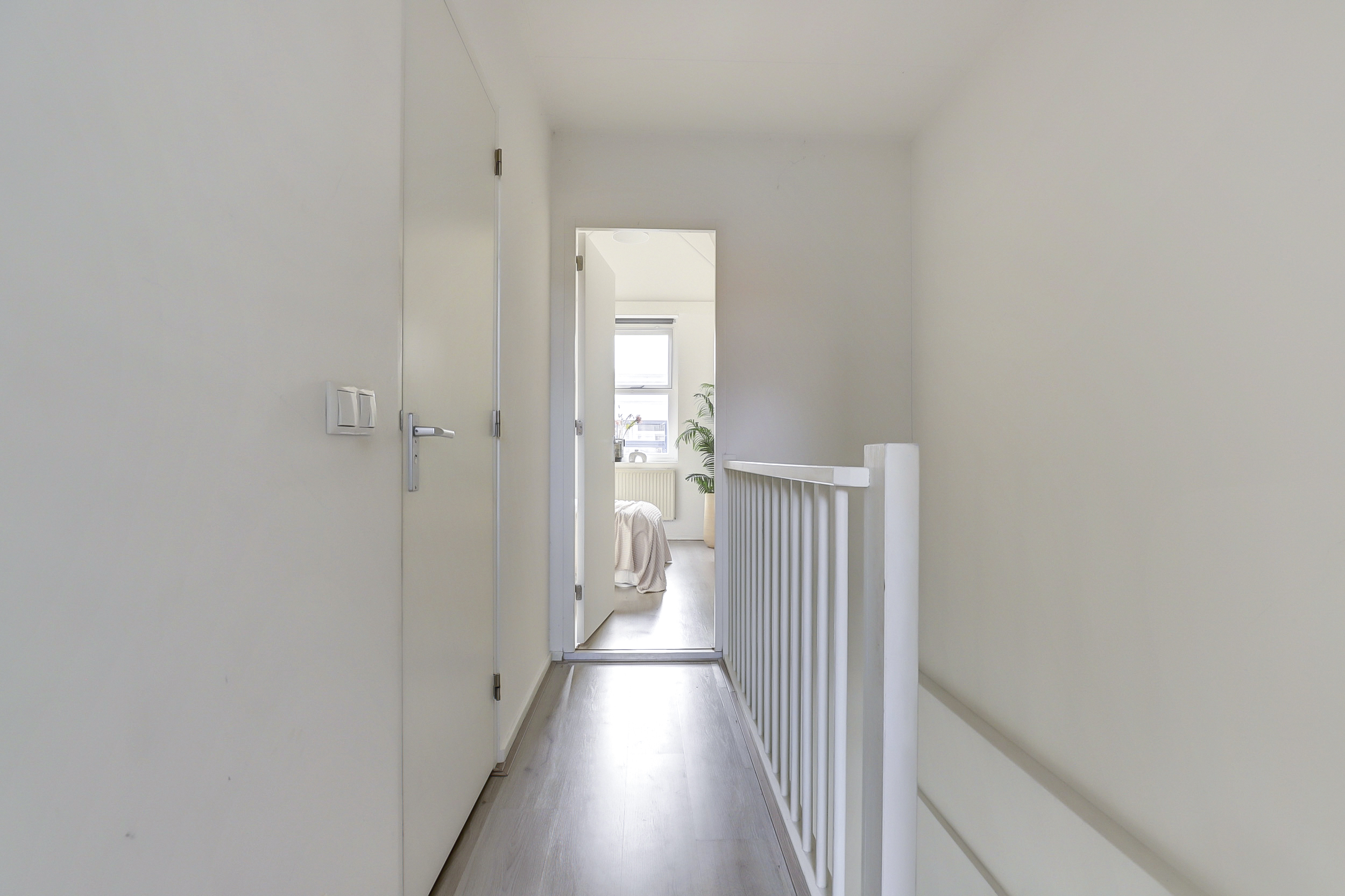 Vanaf de overloop is er toegang tot de twee slaapkamers, gelegen aan de voor- en achterzijde van de woning. Beide kamers profiteren van een mooie hoogte en zijn afgewerkt met een lichte laminaatvloer en strakke wand- en plafondafwerking, wat zorgt voor een frisse en ruimtelijke uitstraling. Vanuit de slaapkamer aan de voorzijde van de woning is er toegang tot de vliering hier bevindt zich tevens de opstelplaats van de CV-ketel.