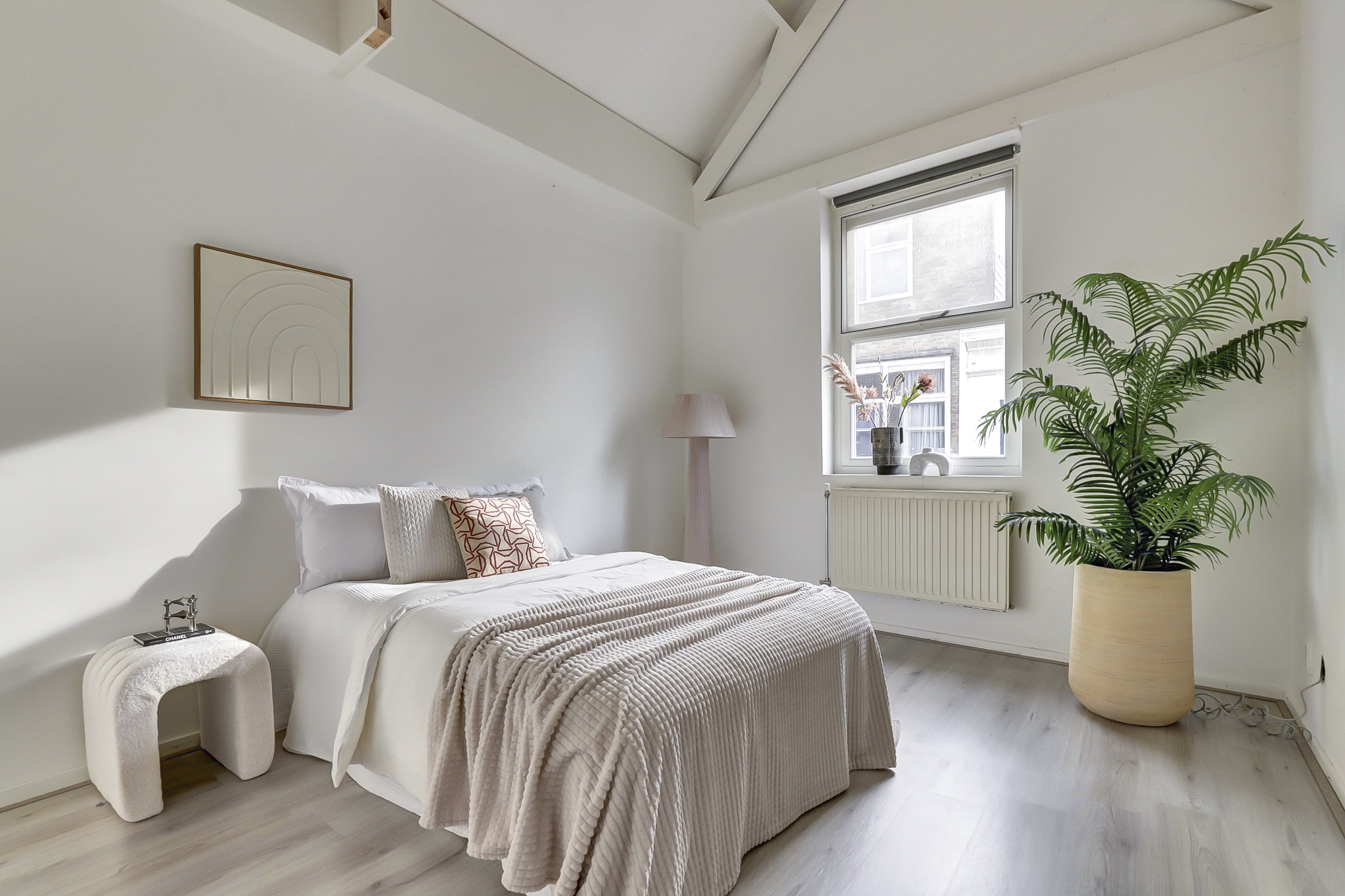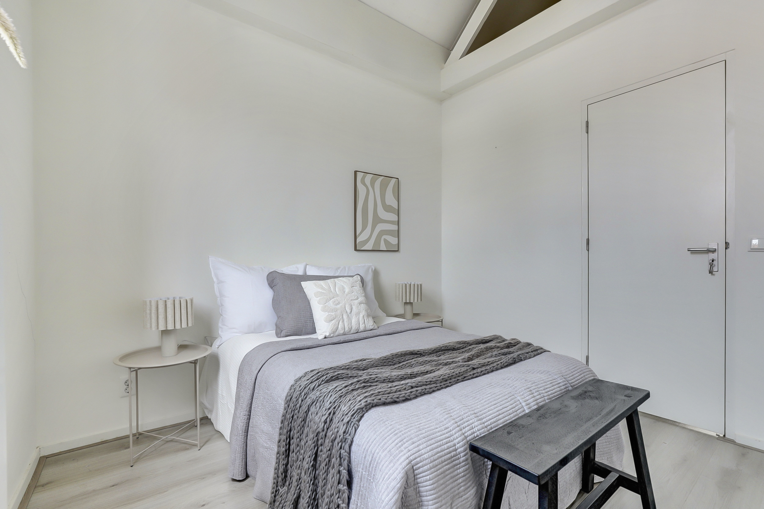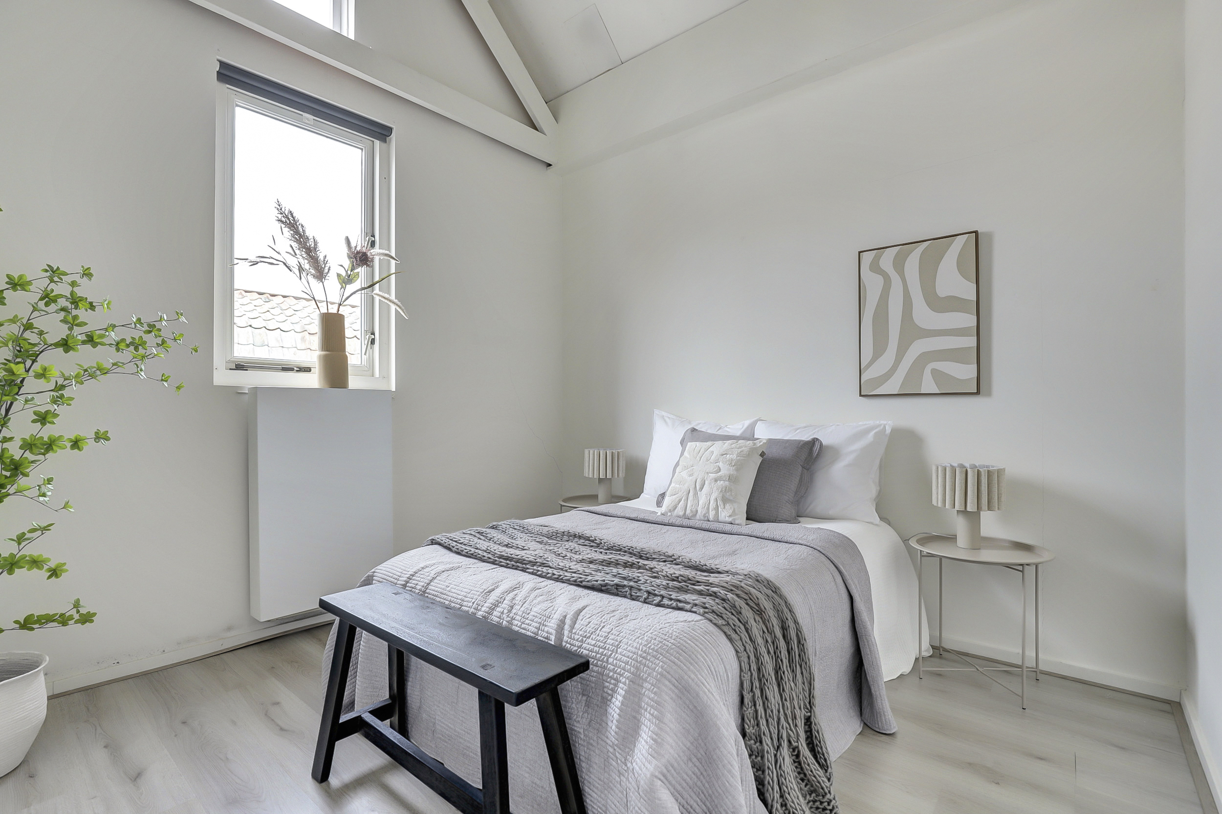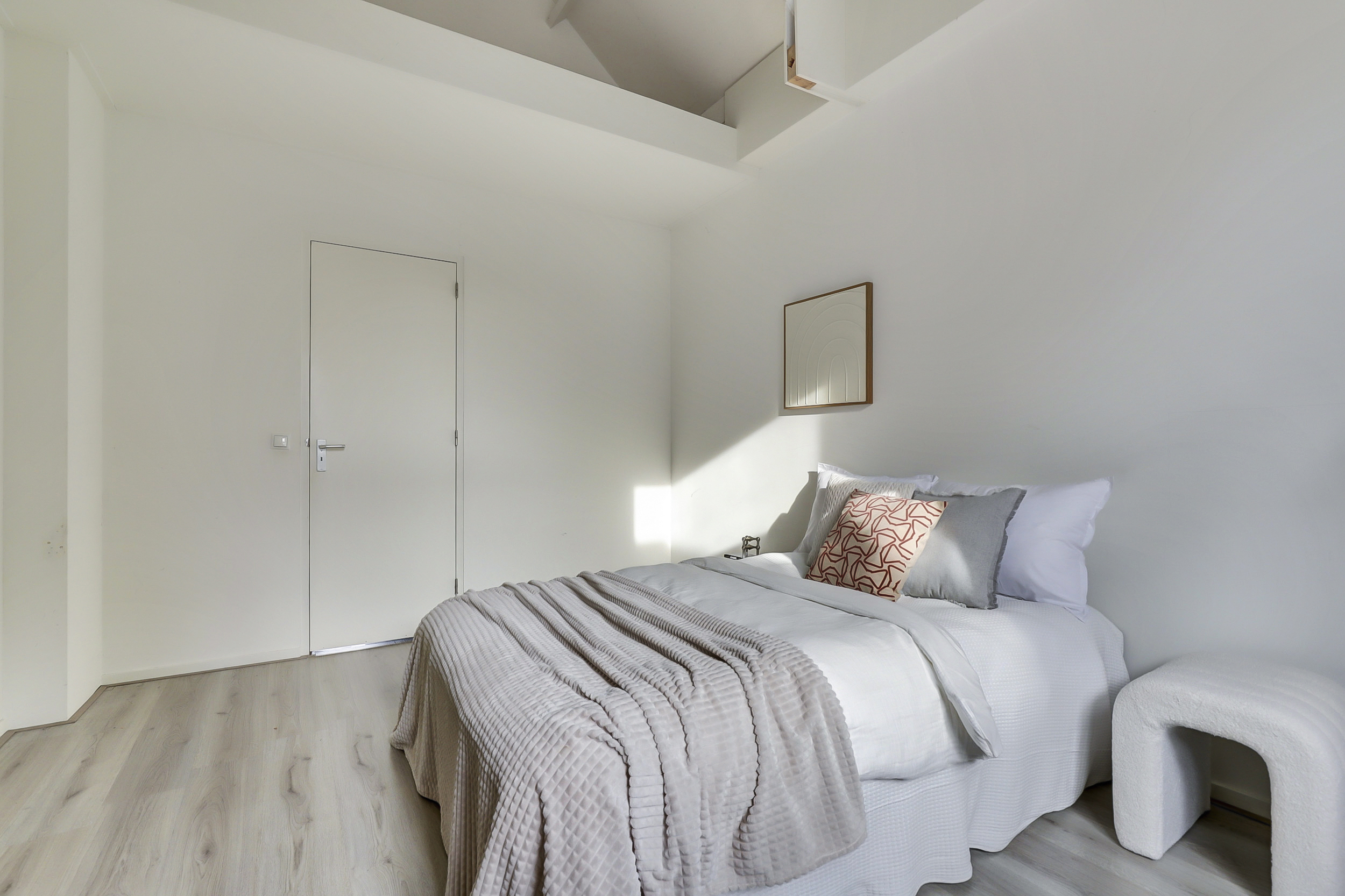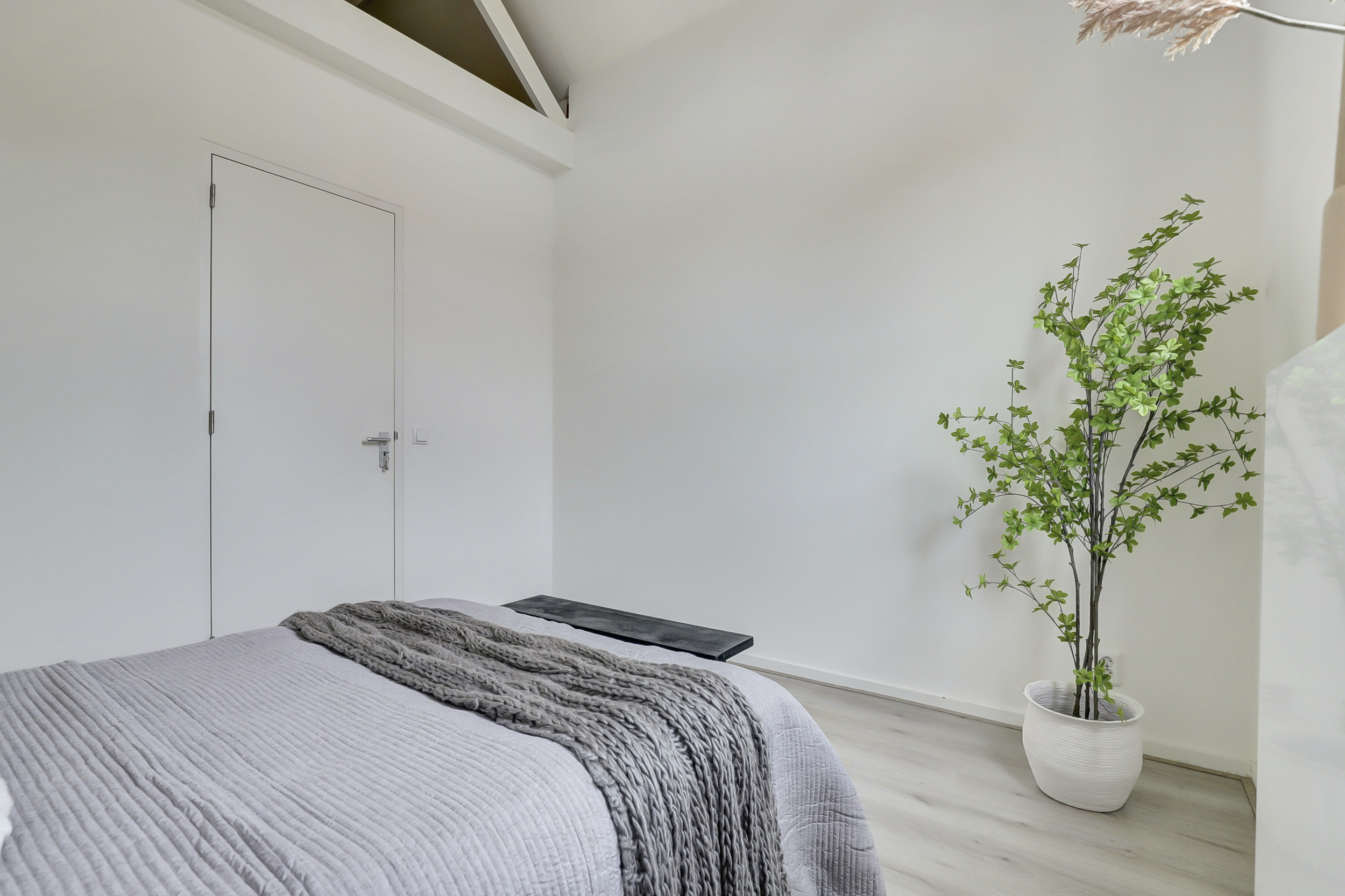 Vanaf de overloop is er toegang tot de twee slaapkamers, gelegen aan de voor- en achterzijde van de woning. Beide kamers profiteren van een mooie hoogte en zijn afgewerkt met een lichte laminaatvloer en strakke wand- en plafondafwerking, wat zorgt voor een frisse en ruimtelijke uitstraling. Vanuit de slaapkamer aan de voorzijde van de woning is er toegang tot de vliering hier bevindt zich tevens de opstelplaats van de CV-ketel.
