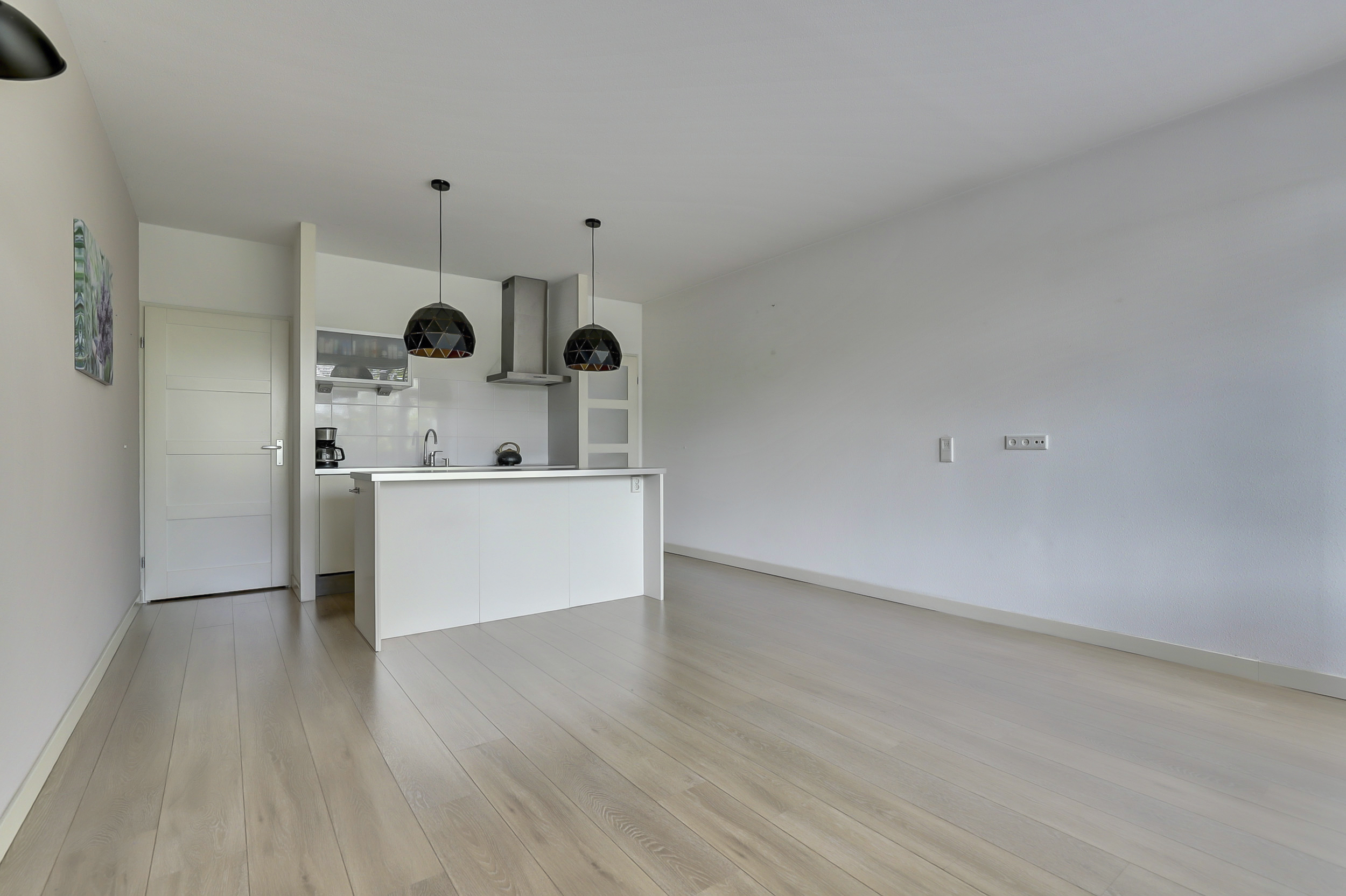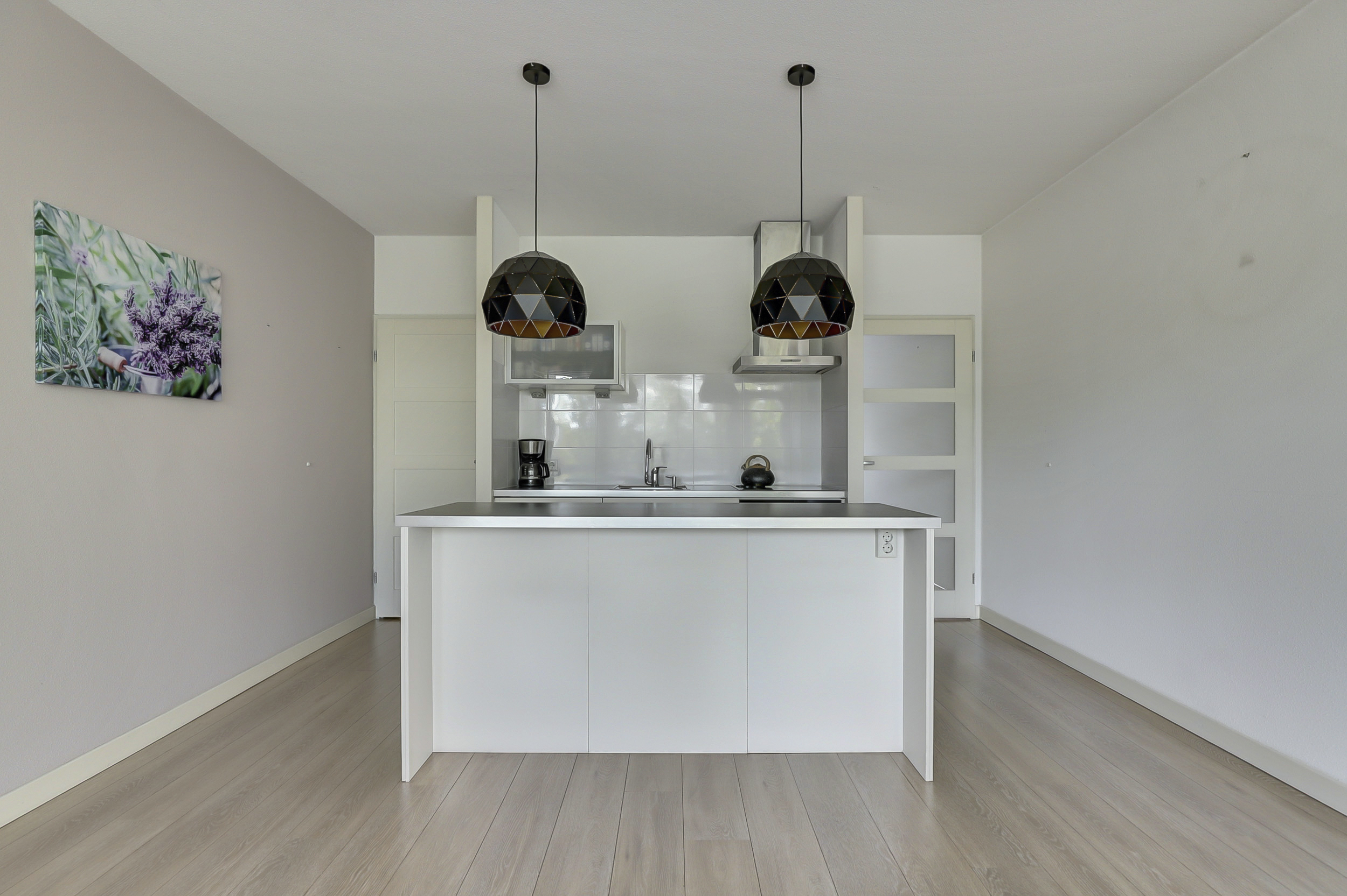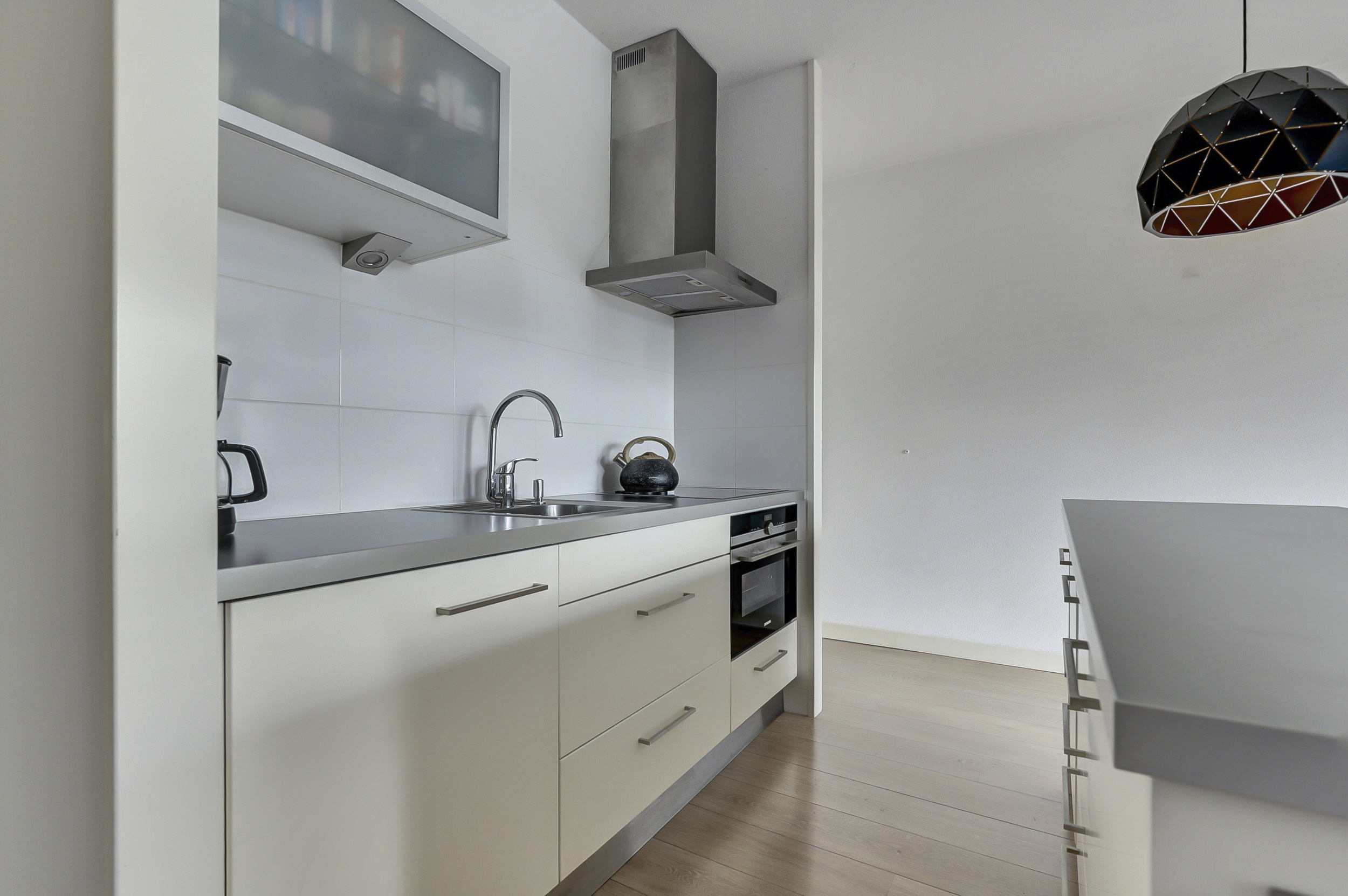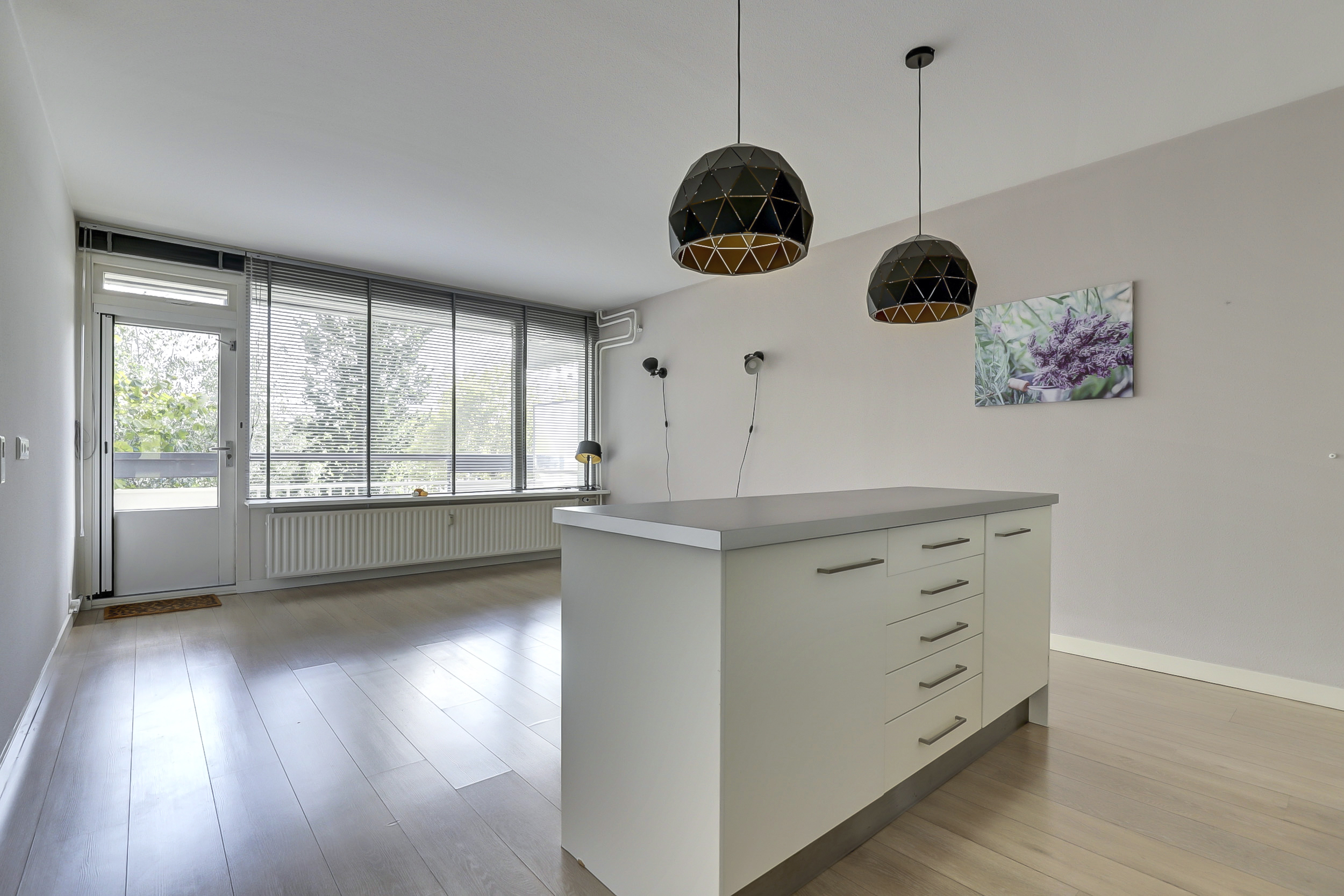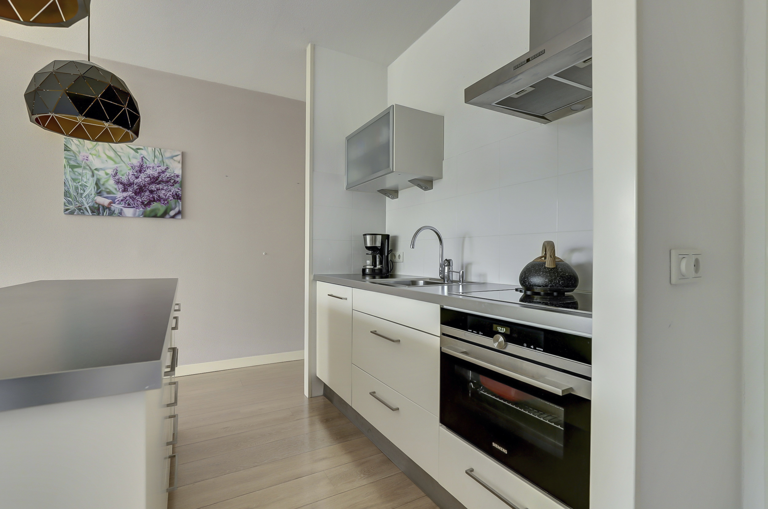 Als je doorloopt, kom je in de verrassend lichte woonkamer met grote raampartijen en een deur naar het balkon. De open keuken vormt een mooi geheel met de living en is uitgerust met een praktisch kookeiland, perfect om aan te eten of borrelen. Je vindt hier een inductiekookplaat, afzuigkap, combi-oven, vaatwasser en een koel-/vriescombinatie.
