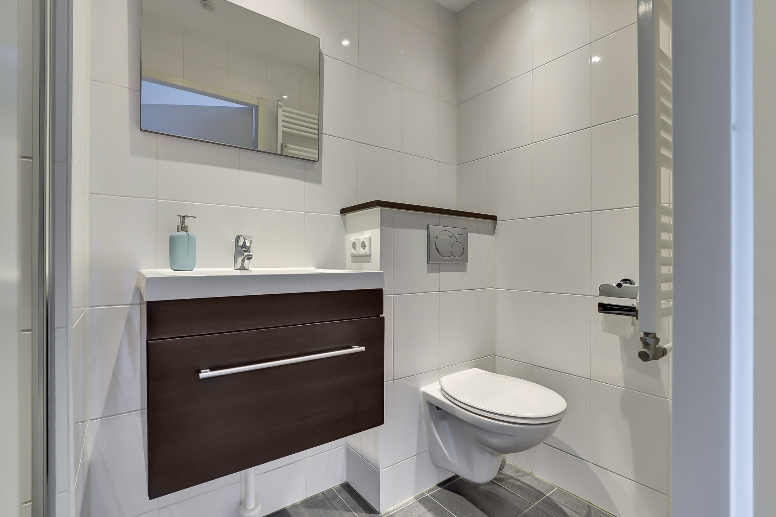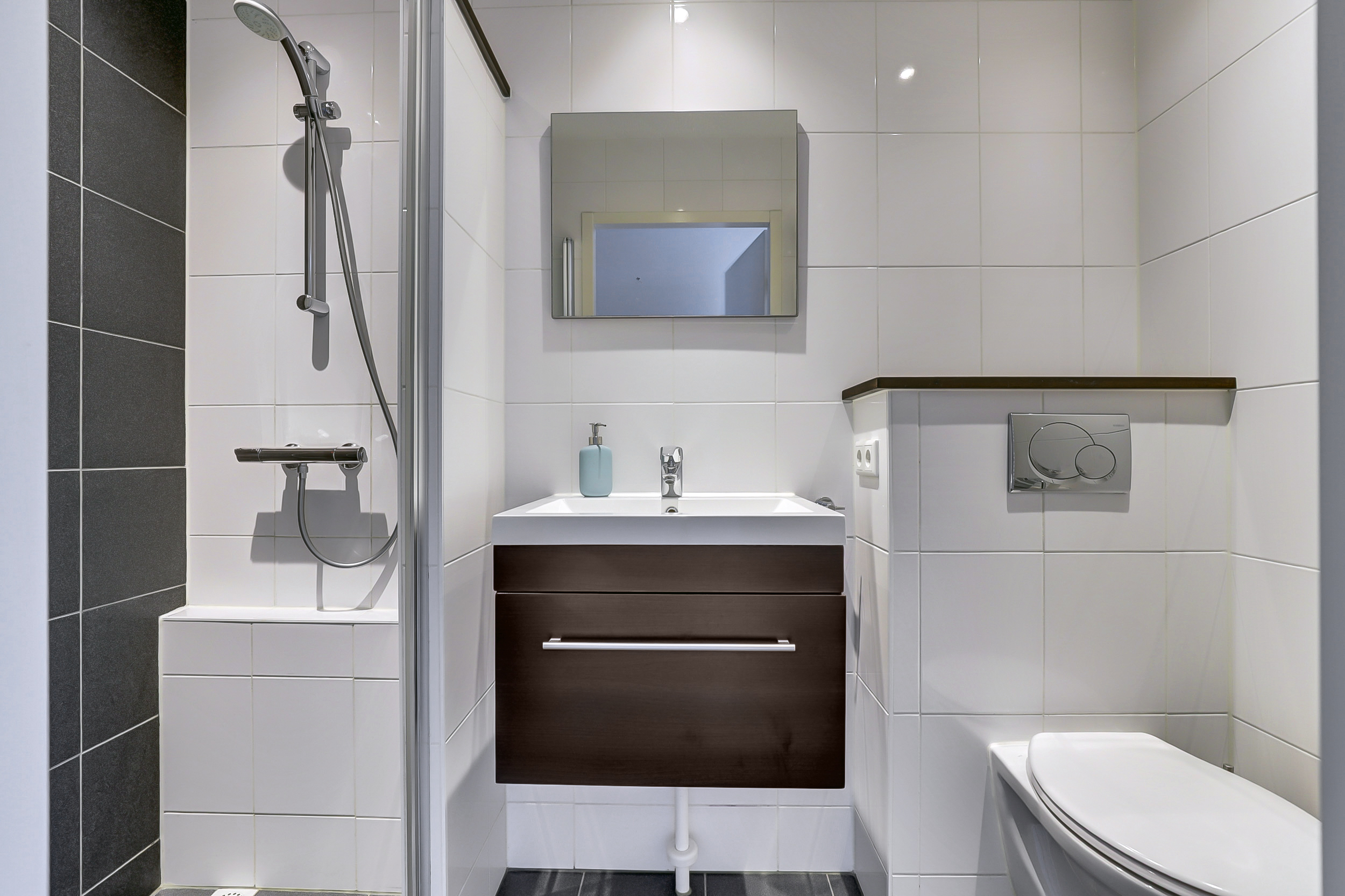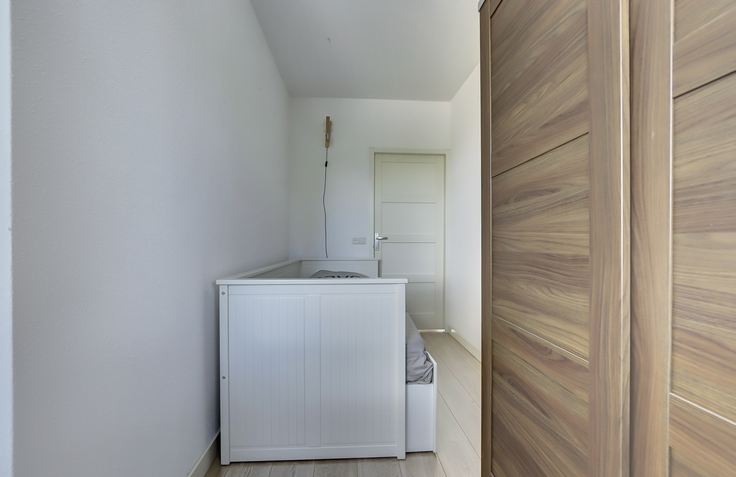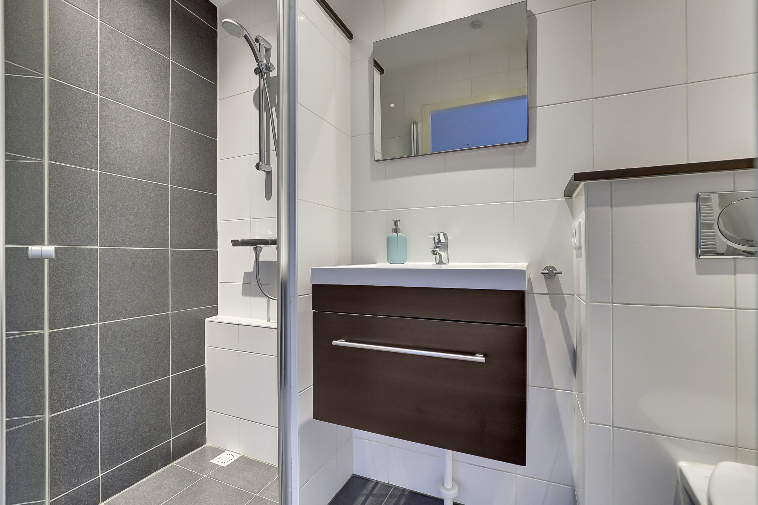 Rechts vind je de moderne badkamer, uitgerust met een inloopdouche, wastafelmeubel en toilet. Aan de galerijkant ligt de slaapkamer, praktisch in te delen en met voldoende ruimte voor een groot bed en kast.
