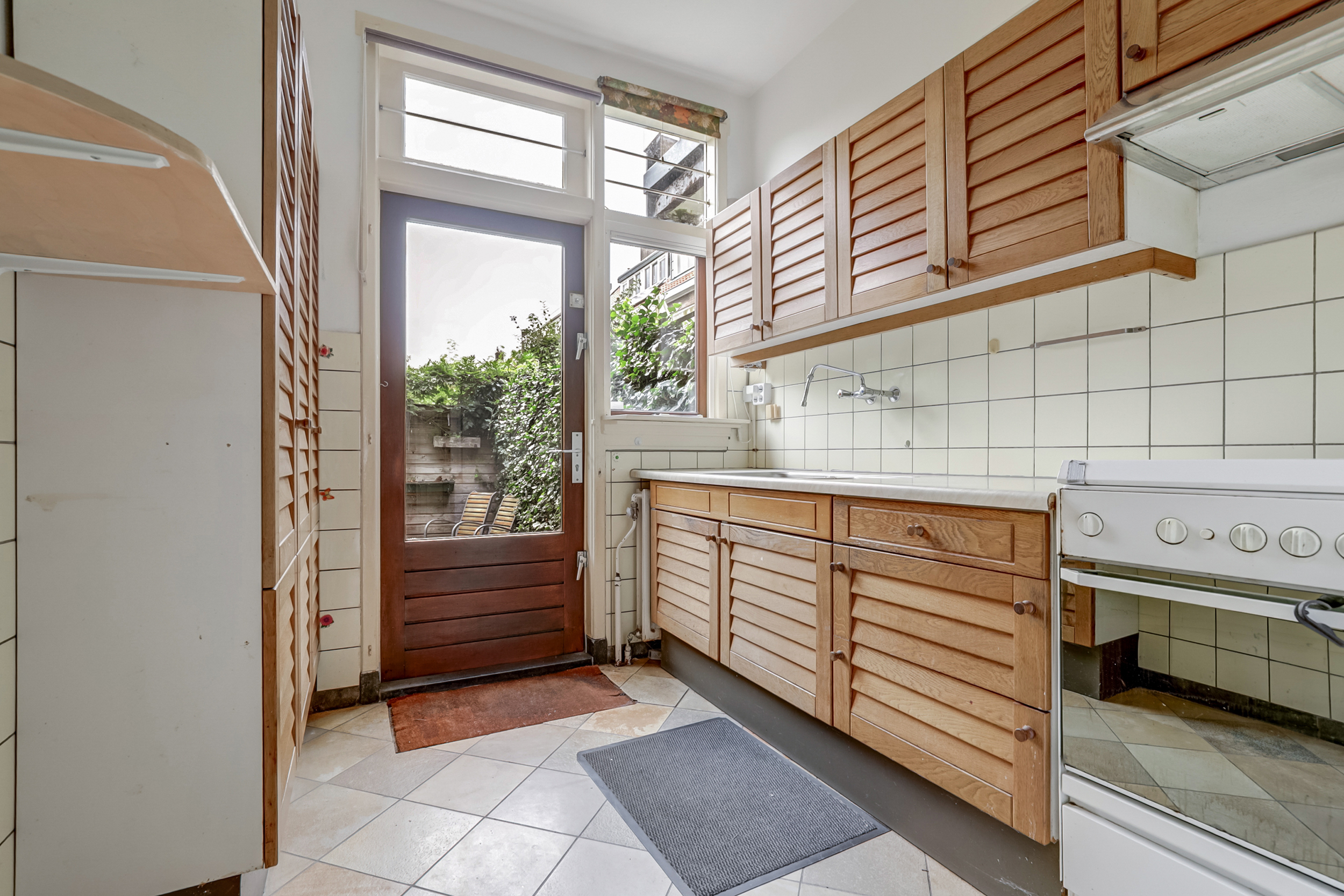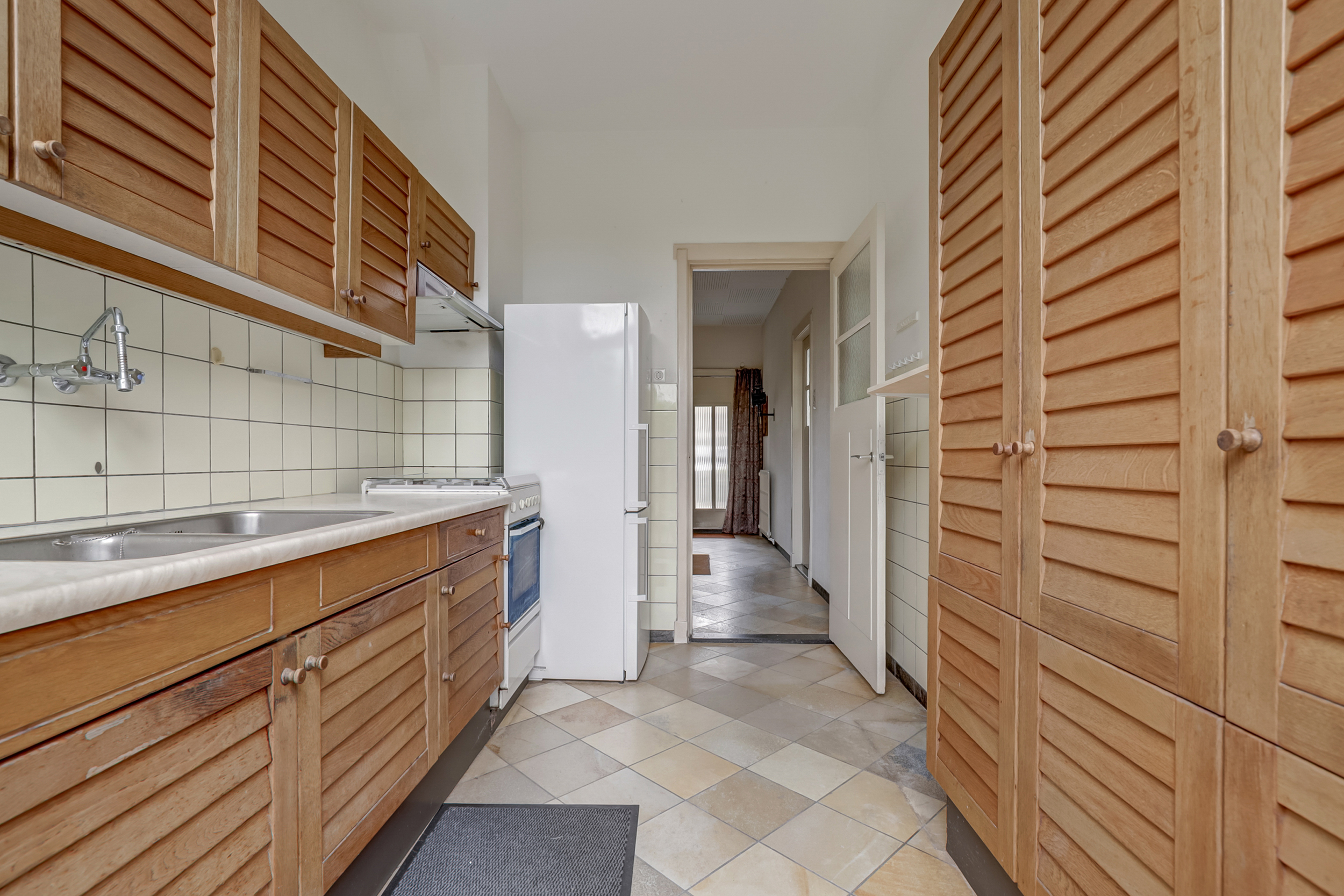 De gesloten keuken aan de achterzijde van de woning is eenvoudig uitgevoerd, heeft vaste kasten, een natuurstenen vloer en een deur naar de tuin.