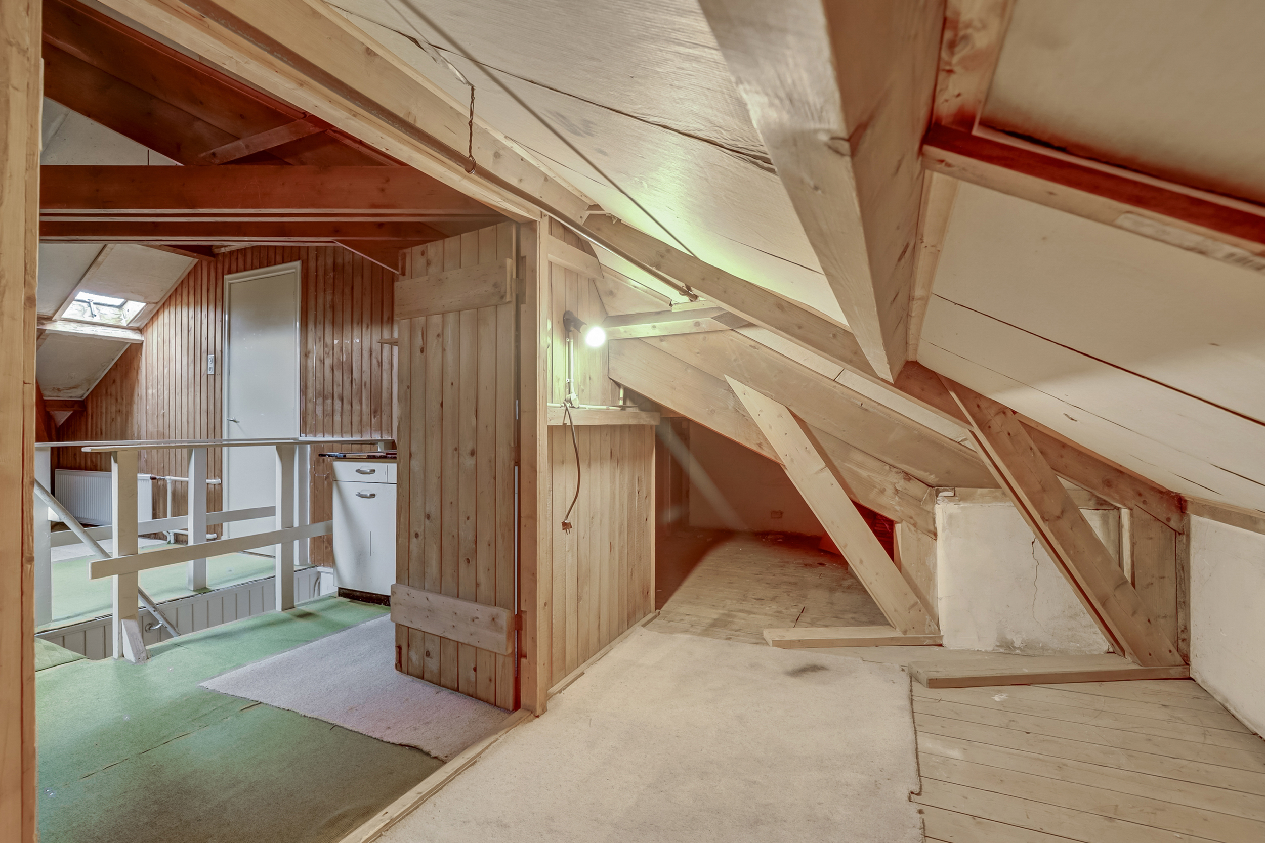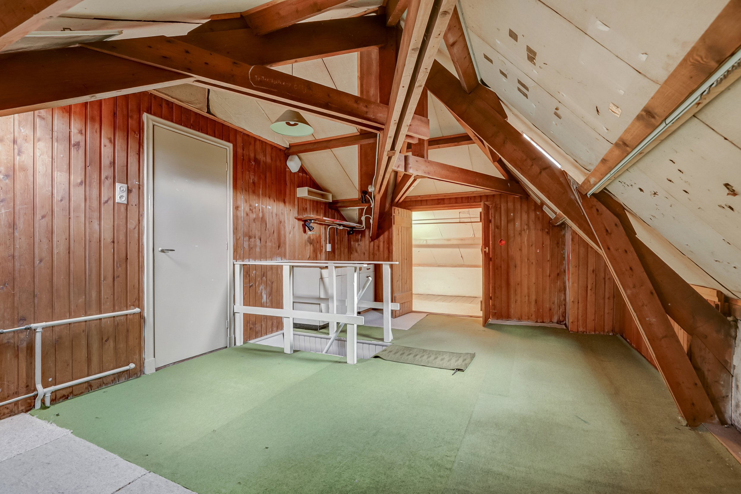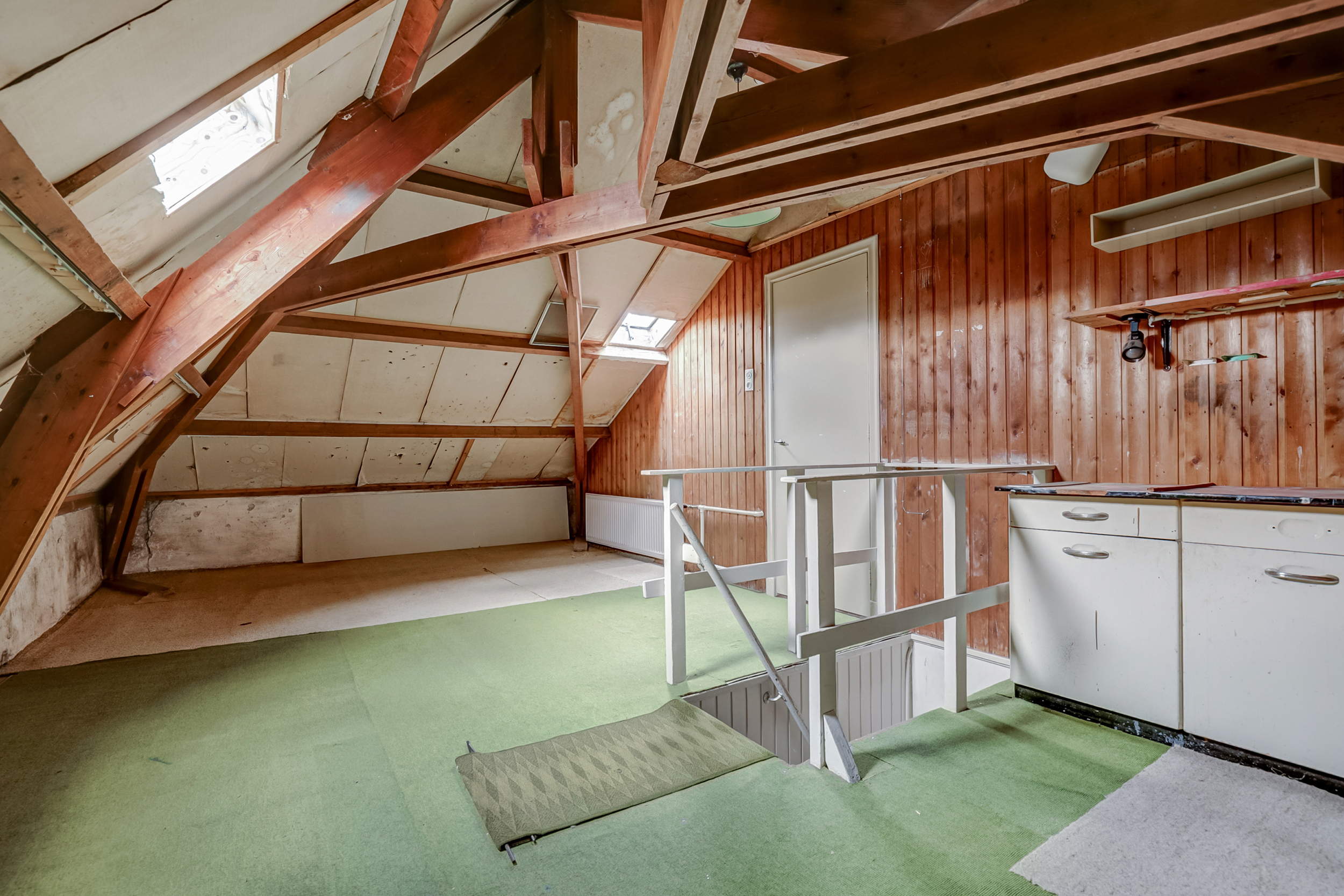 Een rechte vaste trap brengt je op de tweede etage. Hier bevinden zich een royale voorzolder/overloop met de originele balkenconstructie in het zicht (perfect als werk- of hobbyruimte) en de vierde slaapkamer met dakkapel. Achter de knieschotten is veel bergruimte aanwezig. Deze etage is door de plaatsing van scheidingsmuren vrij in te delen.