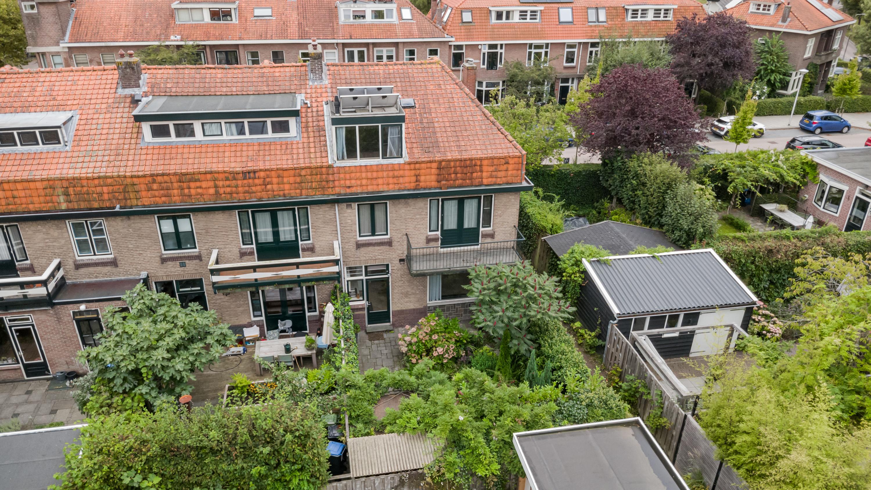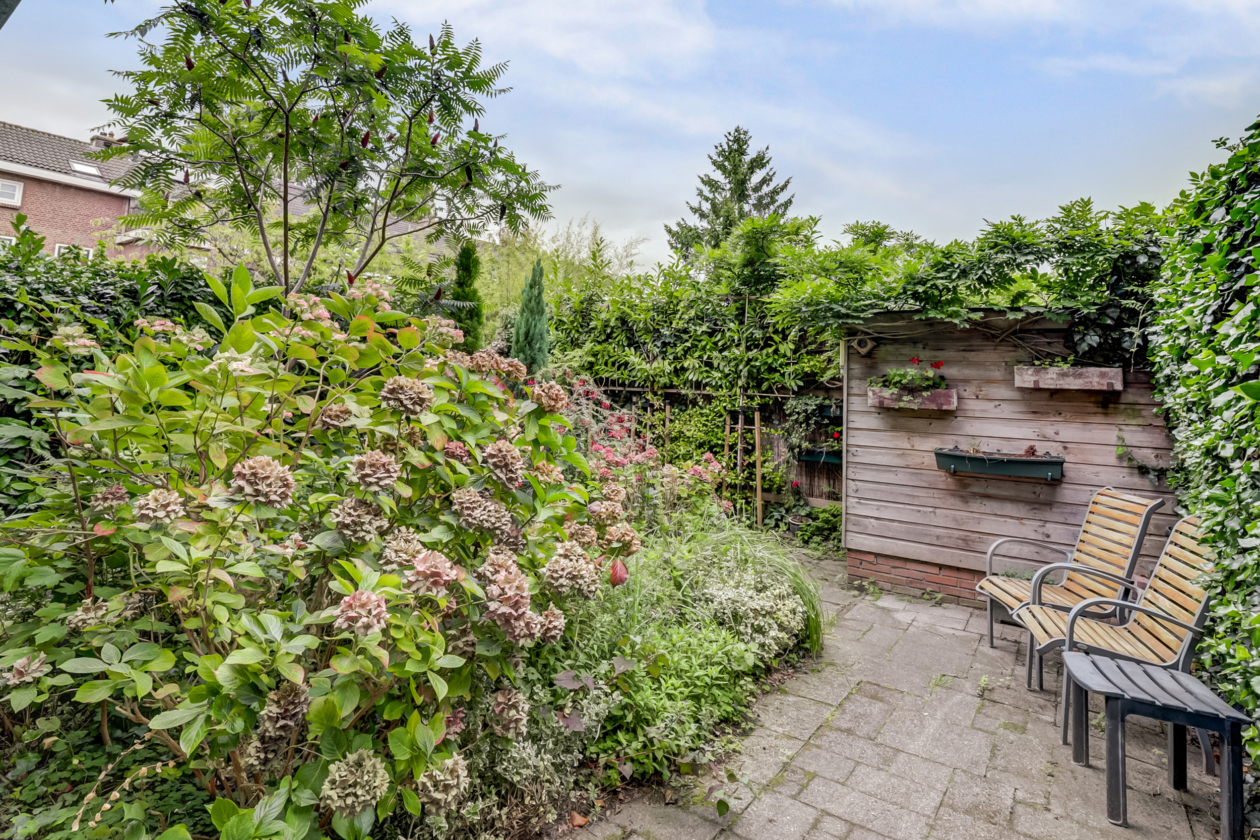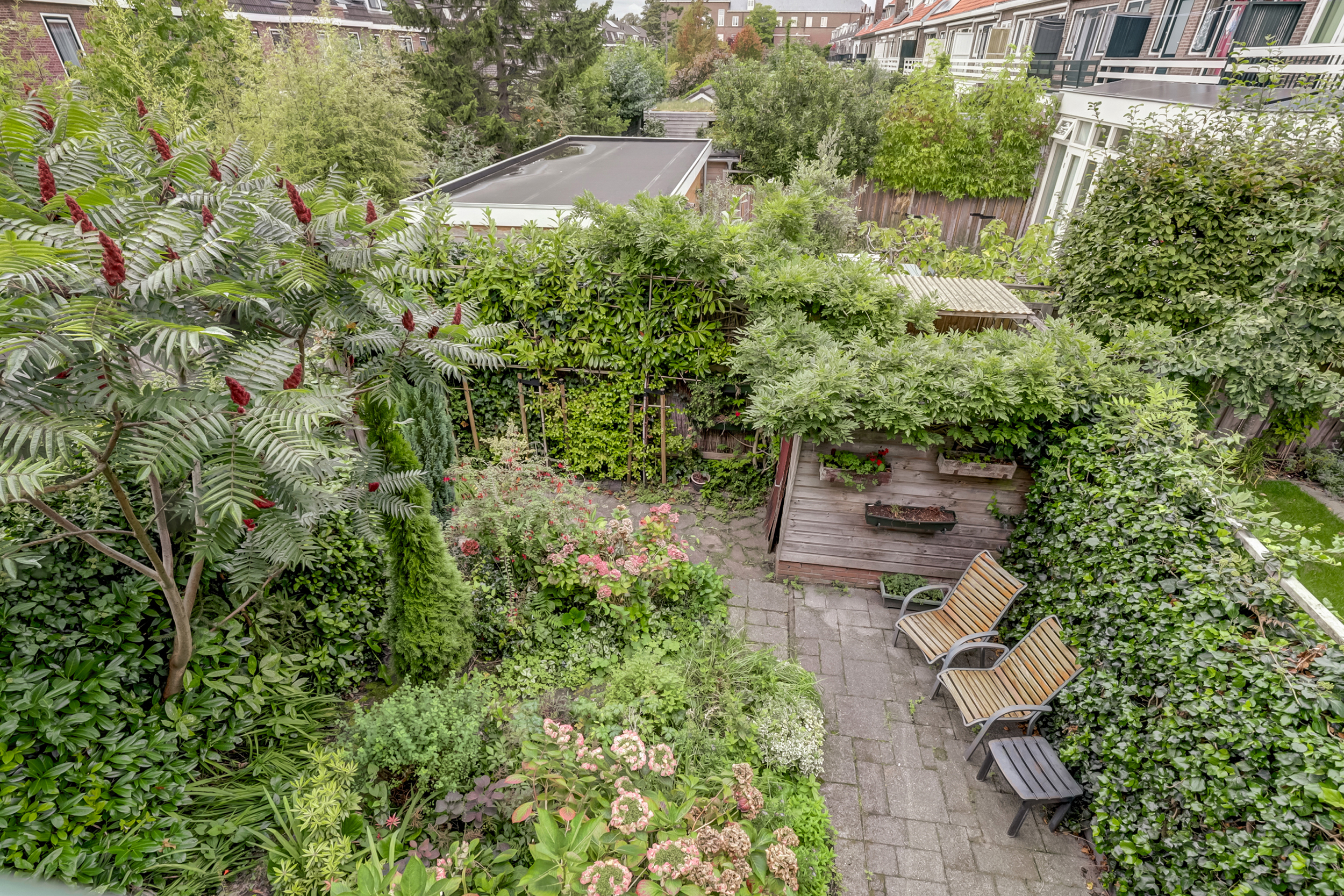 Achter de woning ligt een groene, sfeervolle tuin van 55 m2 met gevarieerde beplanting, sierbestrating en veel privacy. Dankzij de hoekligging is er een praktische achterom naar de Zoutmanstraat. Aan de achterzijde van de tuin staat een houten berging voor fietsen en bijvoorbeeld tuingereedschap. De tuin ligt op het noorden, waardoor er ook op warme dagen beschutte plekjes te vinden zijn, maar waar je gedurende de dag ook zeker een plek kan vinden in de zon. Met geringe ingrepen zijn er meerdere zitplekken of een gezellige loungehoek te creëren in de tuin. Aan de straatzijde van de woning bevindt zich de voortuin van 17 m2, die middels een groenstrook aan de zijkant van het huis is verbonden met de achtertuin.
