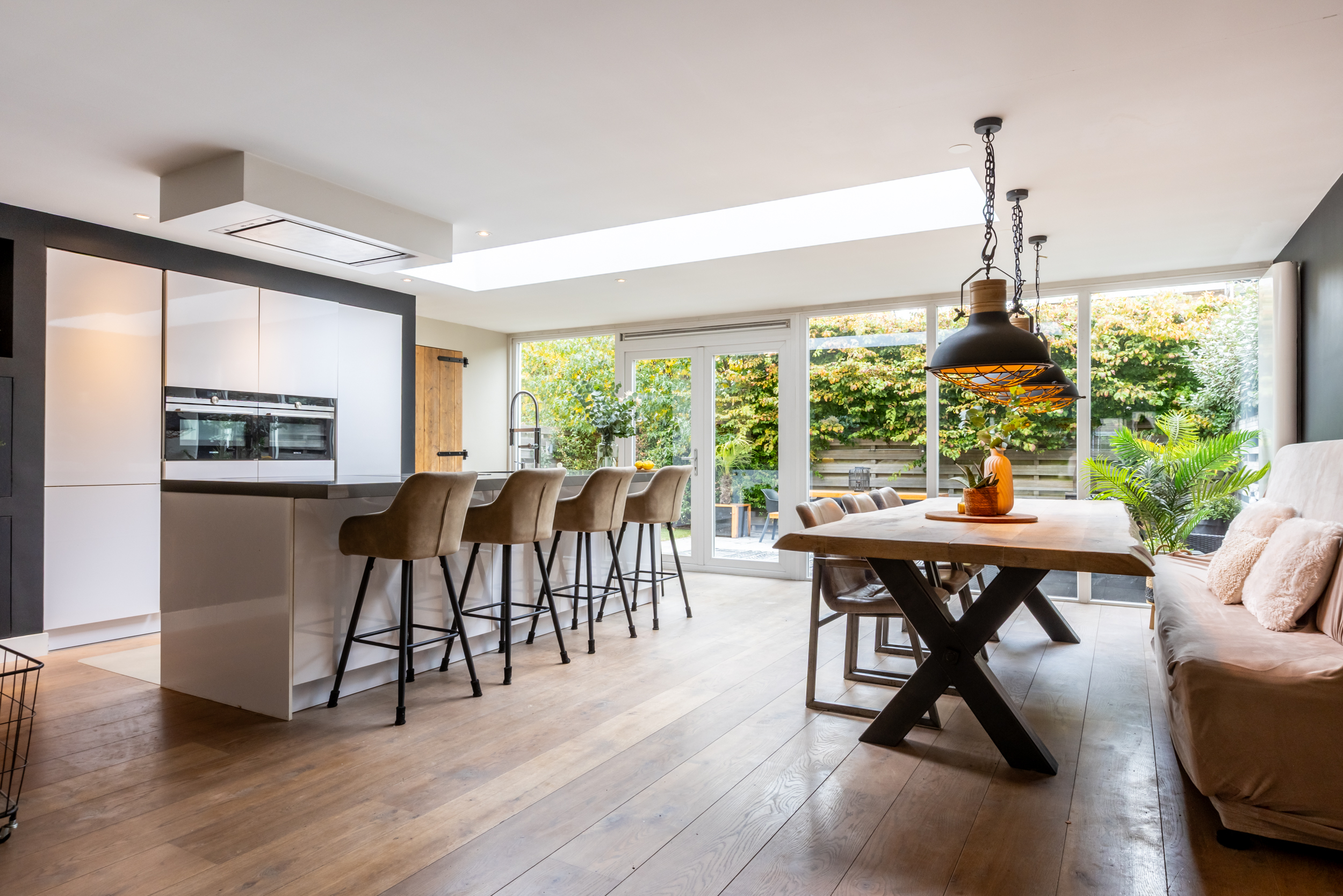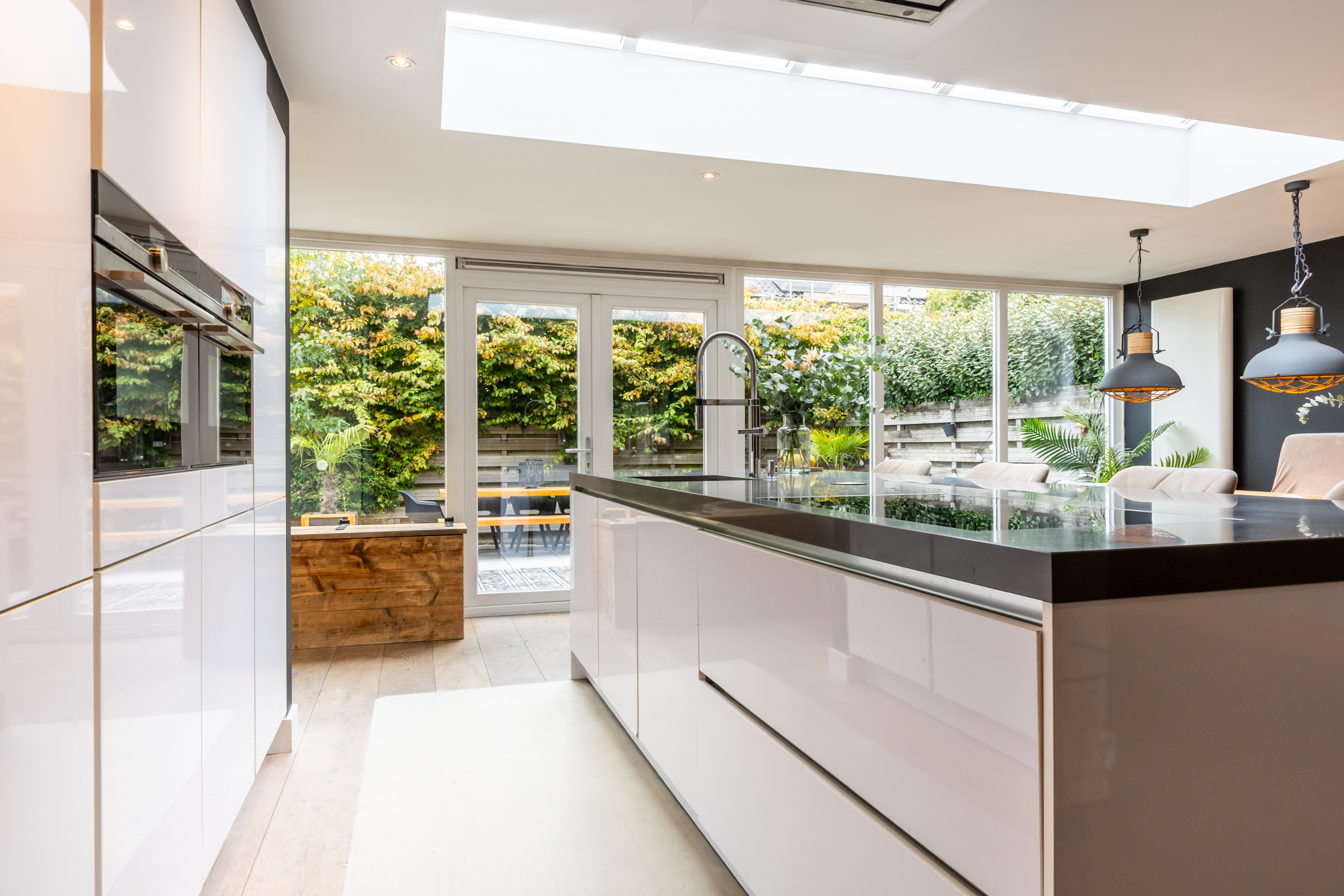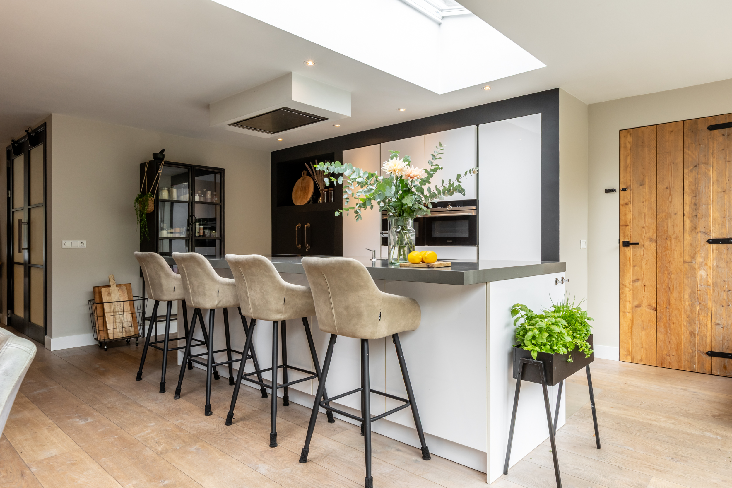 Riante, lichte woonkamer met gashaard (2016), airco, inbouwspots en openslaande deuren naar het terras aan de voorzijde. De in 2016 gerealiseerde luxe woonkeuken met aanbouw is een echte eyecatcher: grote glazen pui, lichtstraat, openslaande deuren naar de tuin en een royaal kook-/spoeleiland met Siemens-inductieplaat (5-pits), vaatwasser, composiet werkblad, close-in boiler en volop kastruimte. Daarnaast een kastenwand met onder andere koelkast, vriezer, combi-oven/magnetron, oven/stoomoven en barista-hoek.